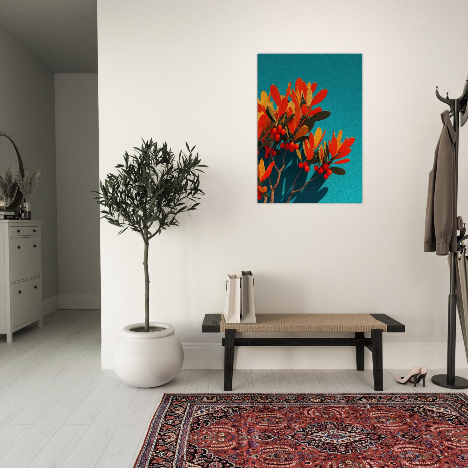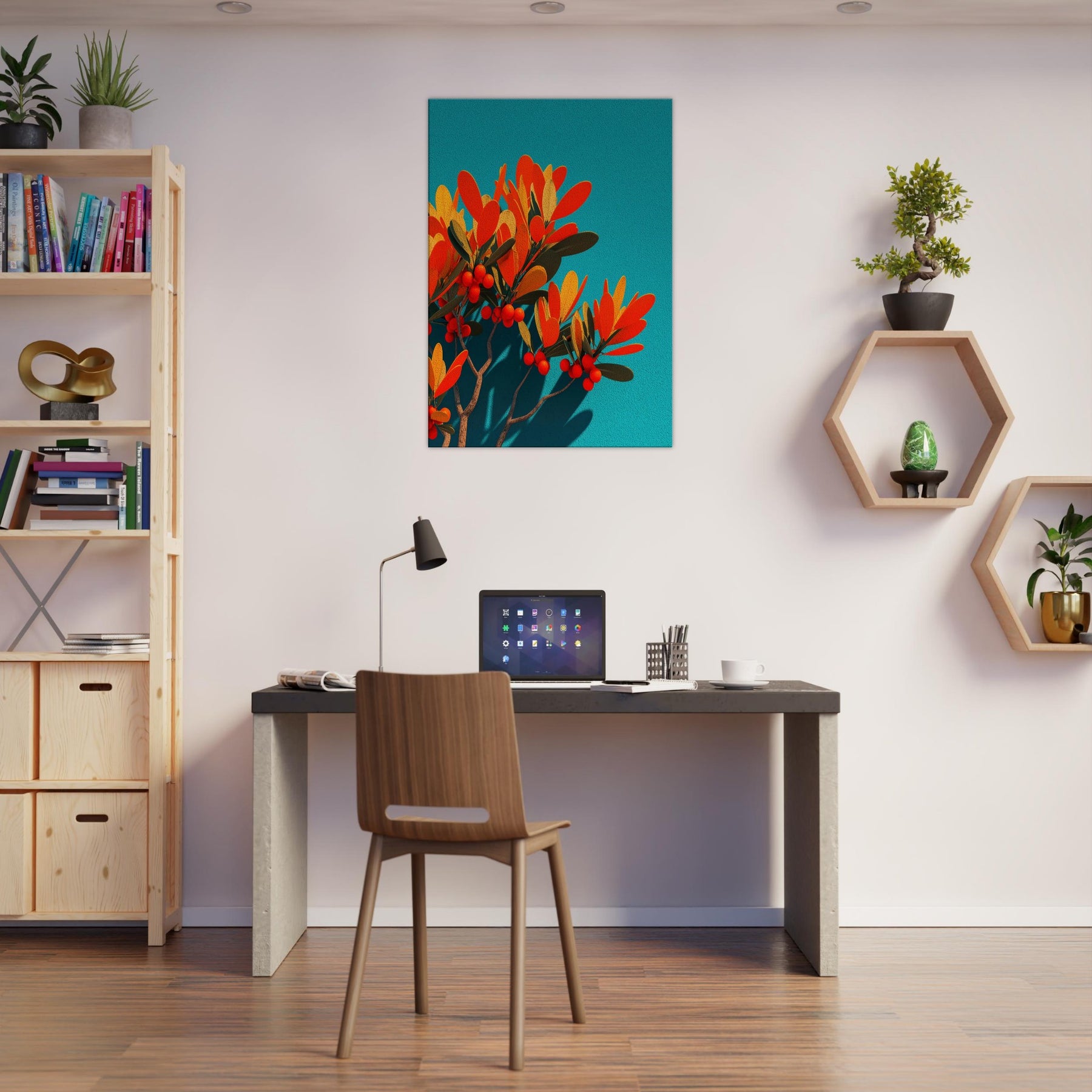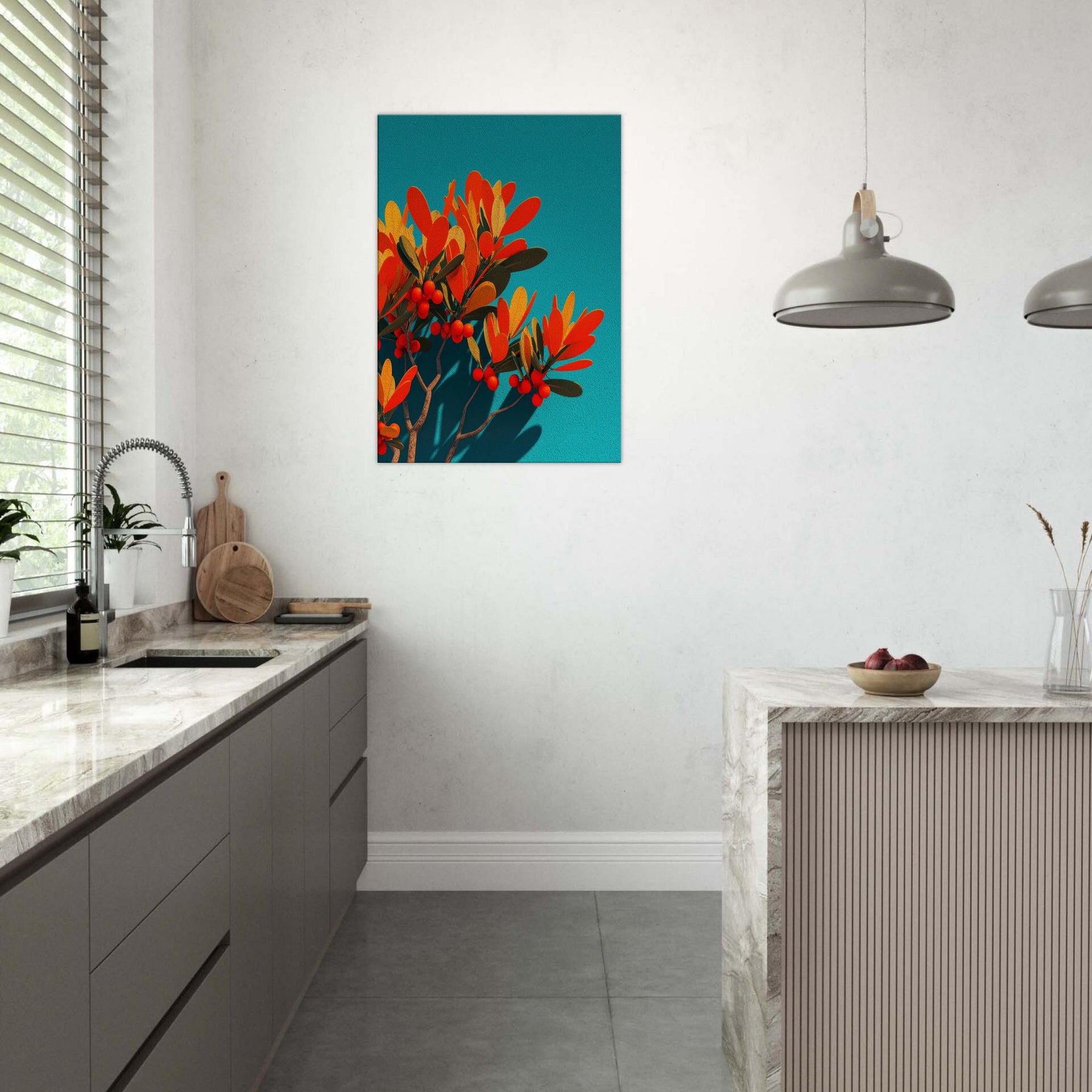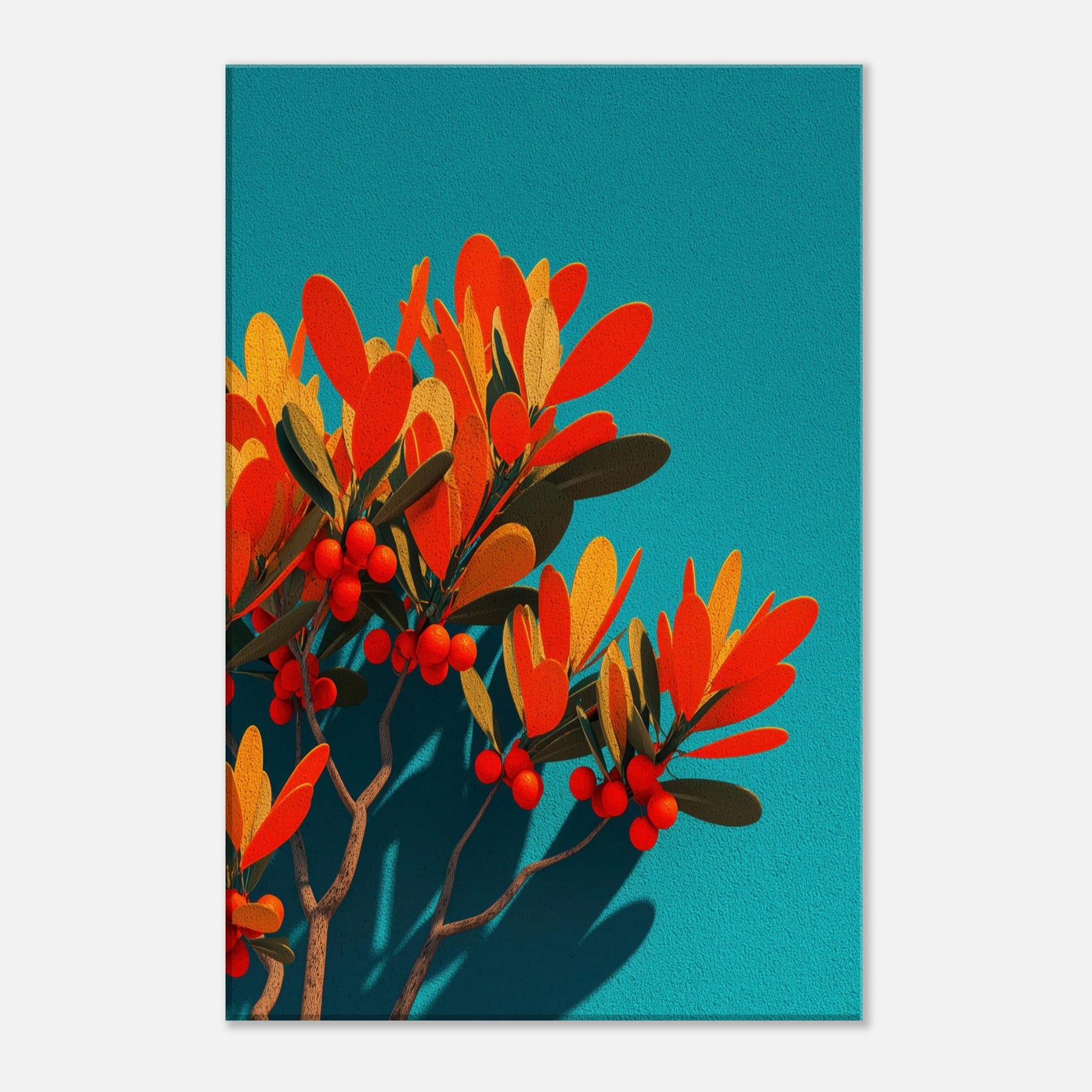 Like a sunlit grove caught in mid bloom, this abstract olive branch unfurls against a vivid teal field. The warm oranges and soft golds pulse with life, while slender leaves and scarlet berries hint at quiet abundance. The piece invites a calm, breath like rhythm into the room, turning a wall into a window of Mediterranean light. In a modern living space, it anchors color and texture without shouting, while the Primary Subject olive branch offers a timeless reference to nature’s resilience and grace.