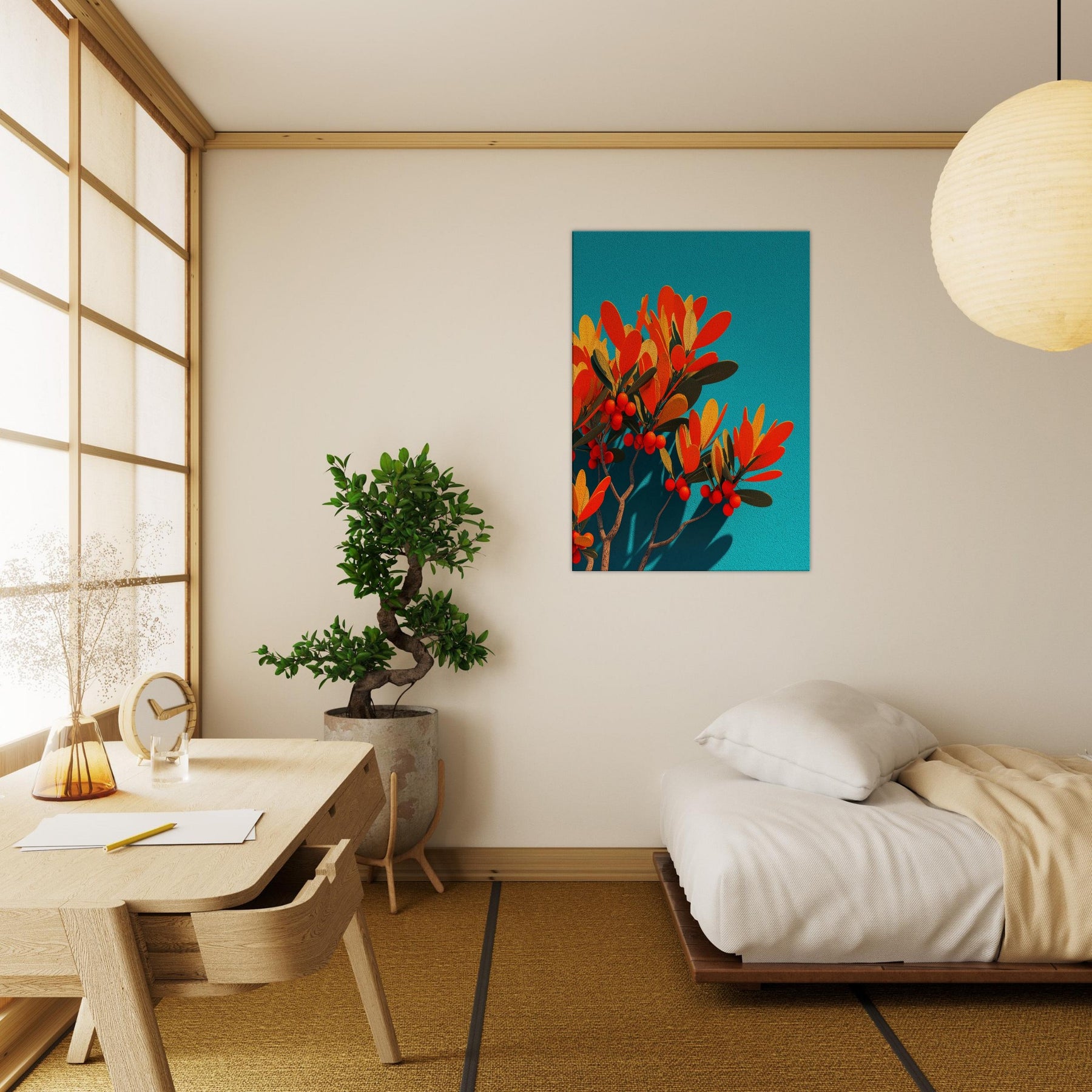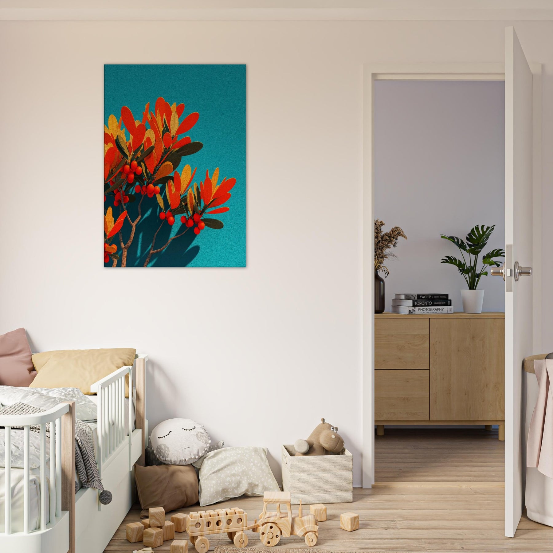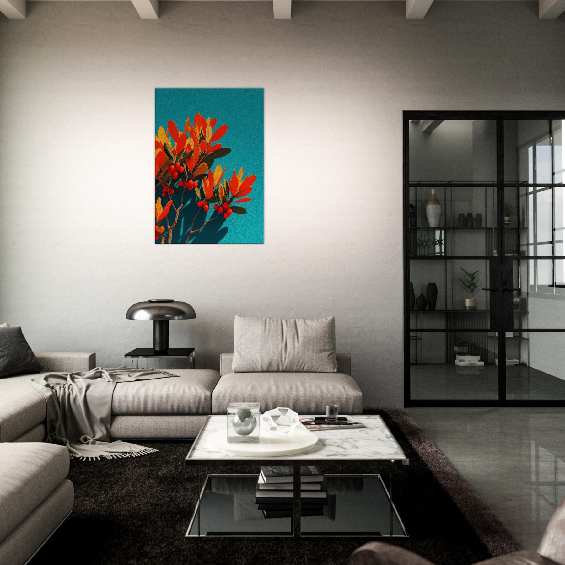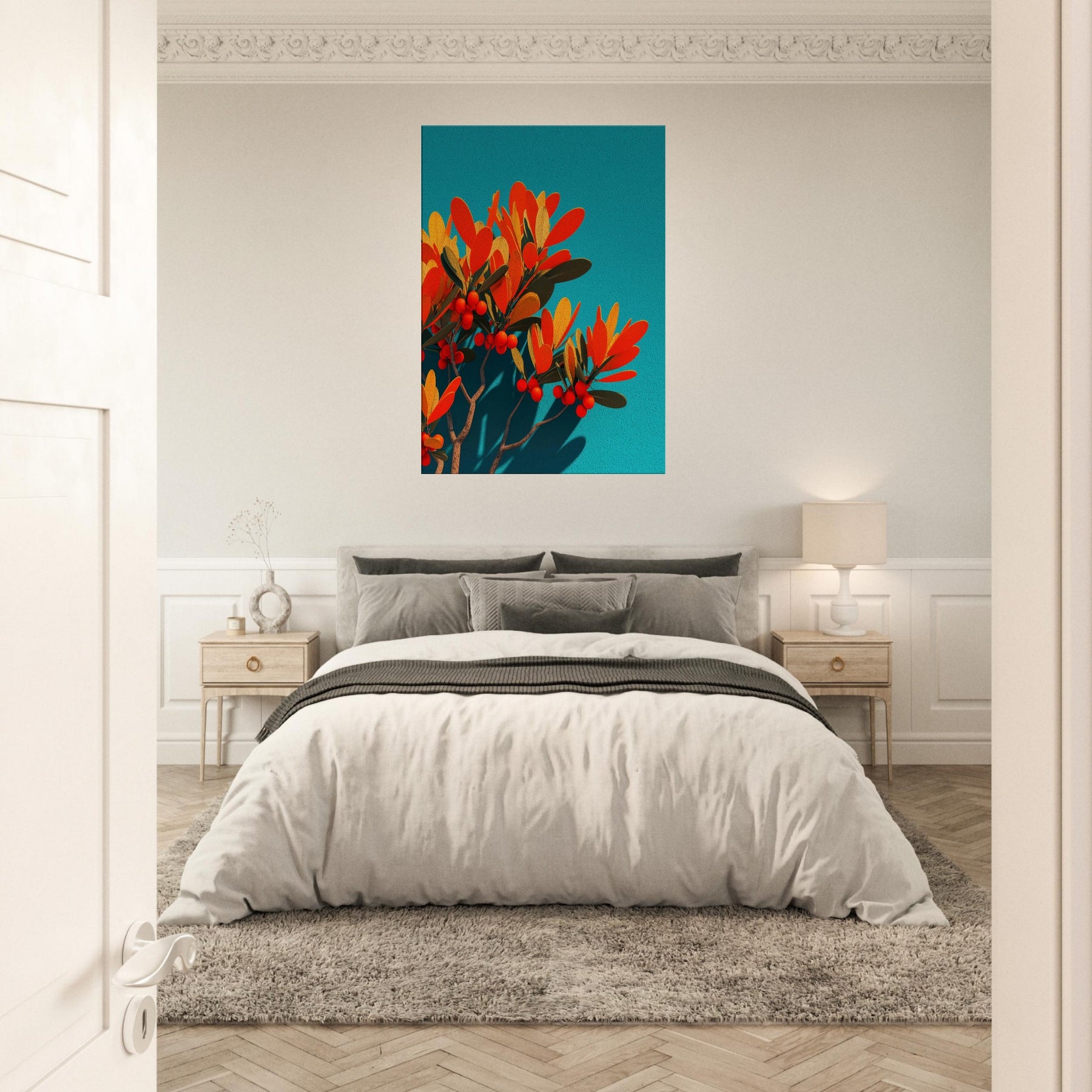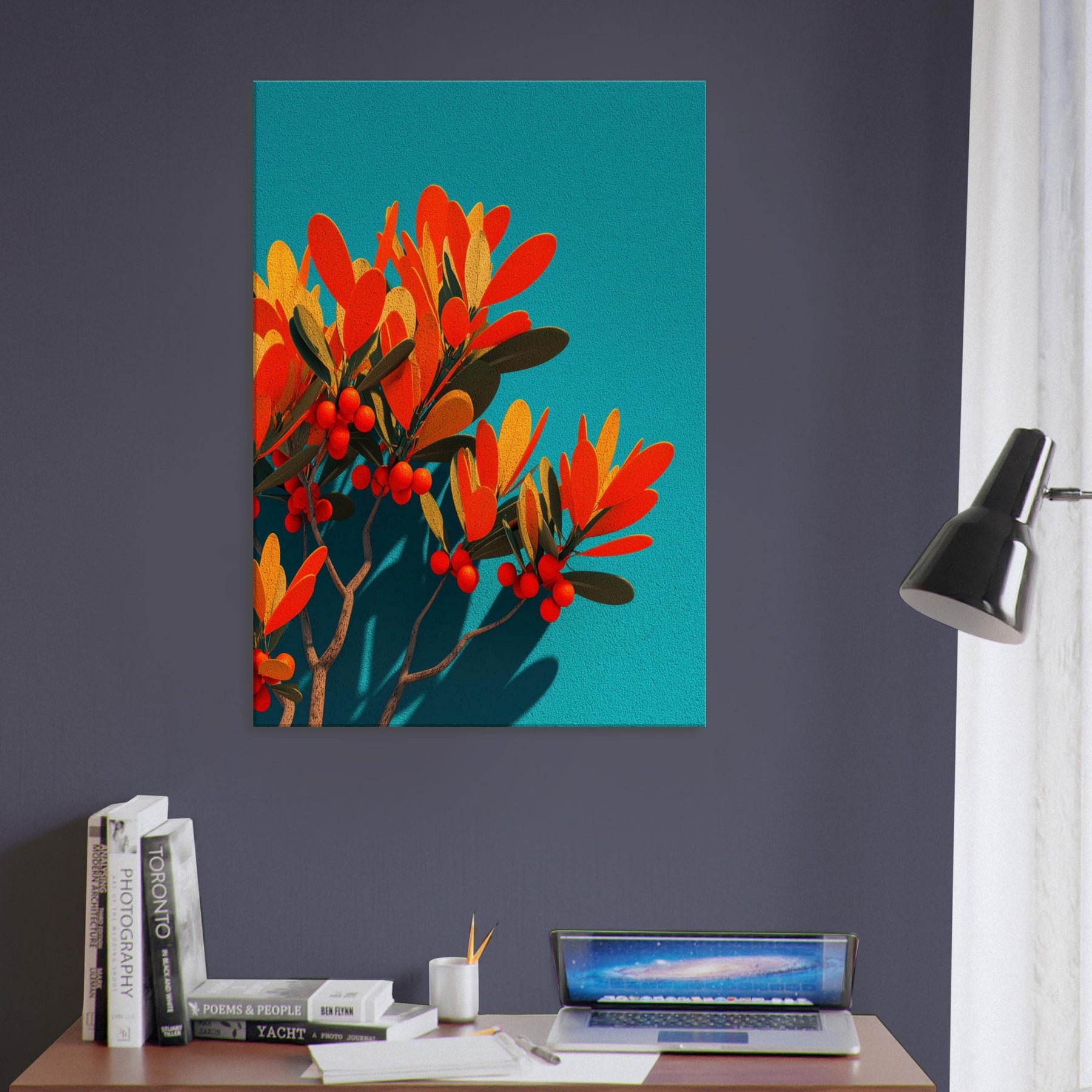 Like a sunlit grove caught in mid bloom, this abstract olive branch unfurls against a vivid teal field. The warm oranges and soft golds pulse with life, while slender leaves and scarlet berries hint at quiet abundance. The piece invites a calm, breath like rhythm into the room, turning a wall into a window of Mediterranean light. In a modern living space, it anchors color and texture without shouting, while the Primary Subject olive branch offers a timeless reference to nature’s resilience and grace.