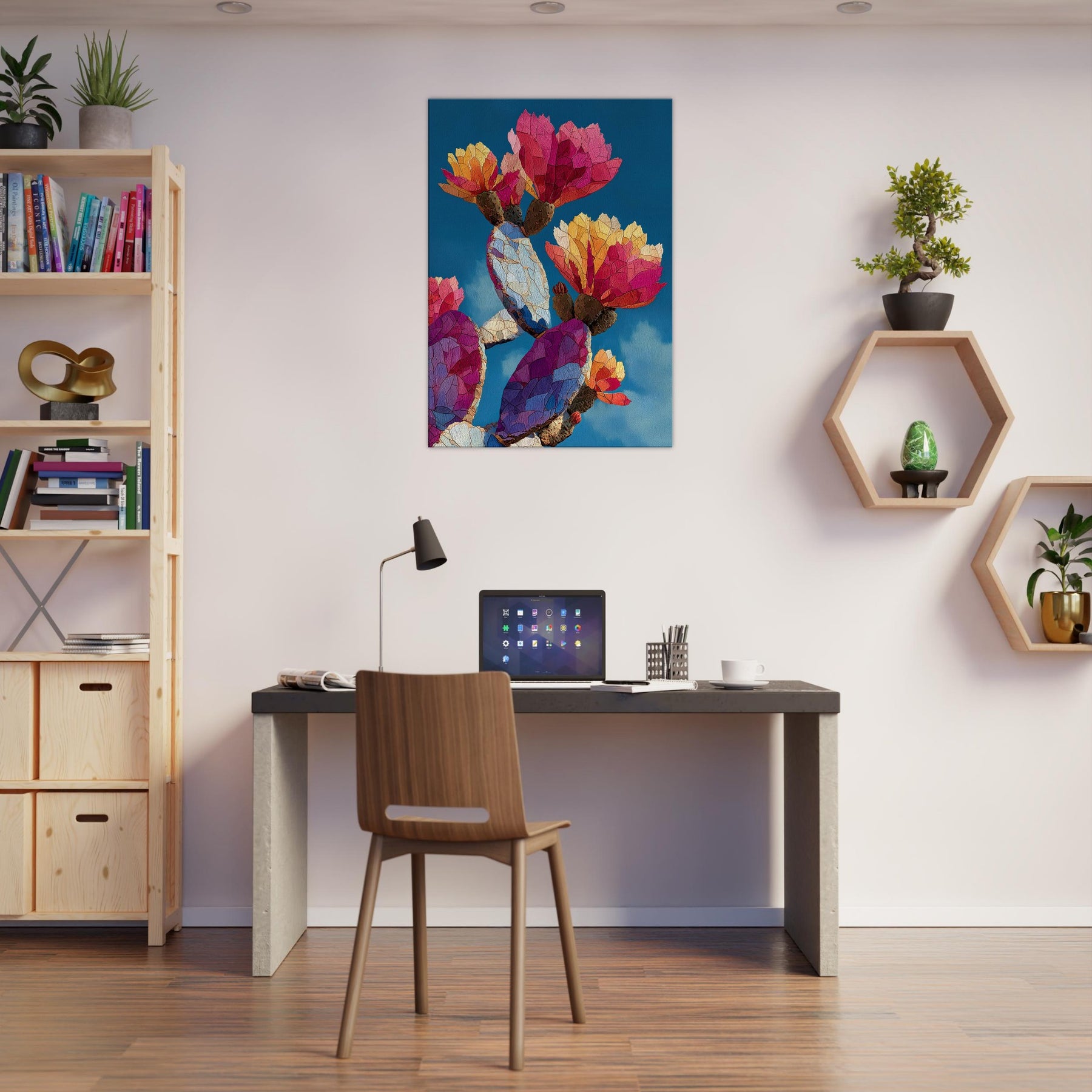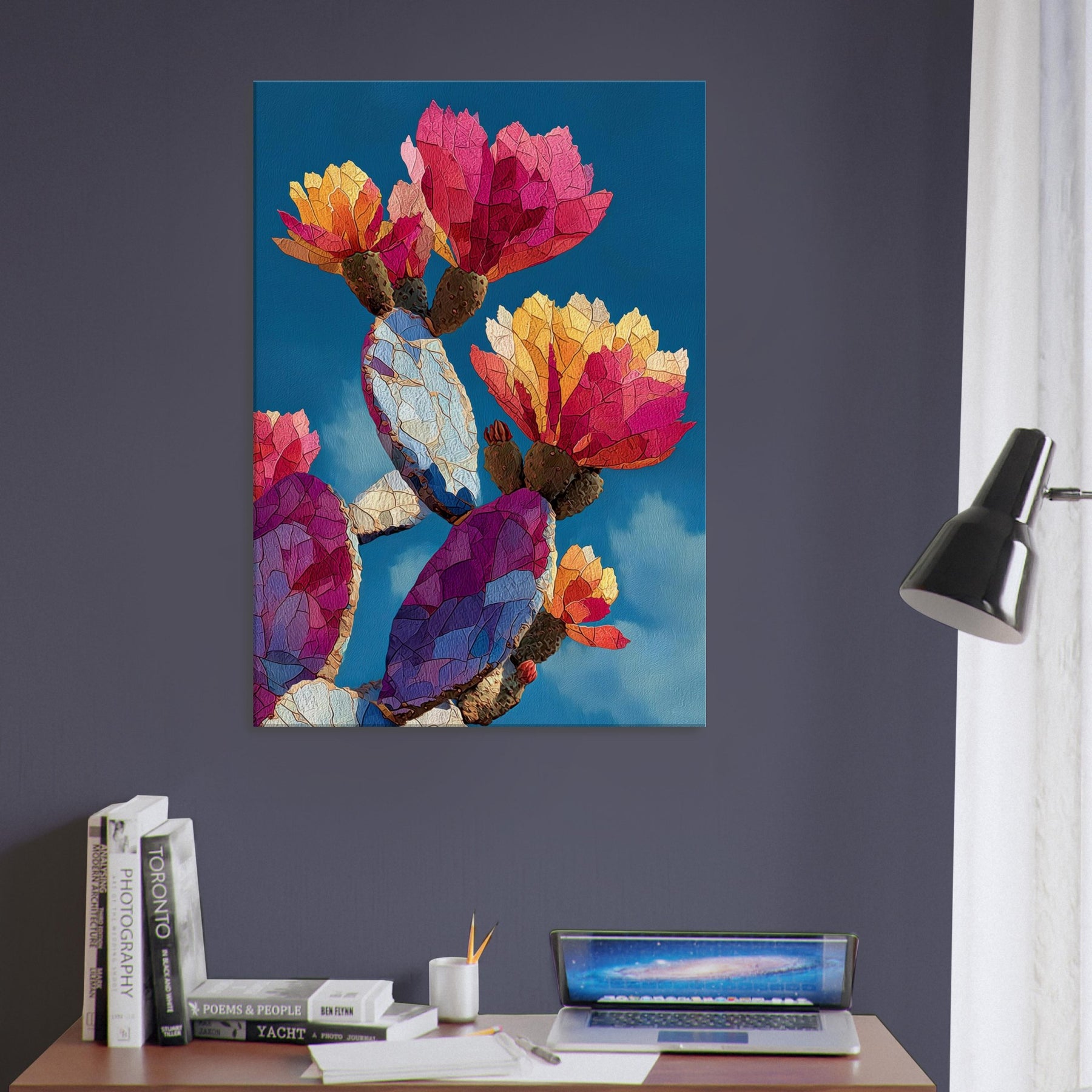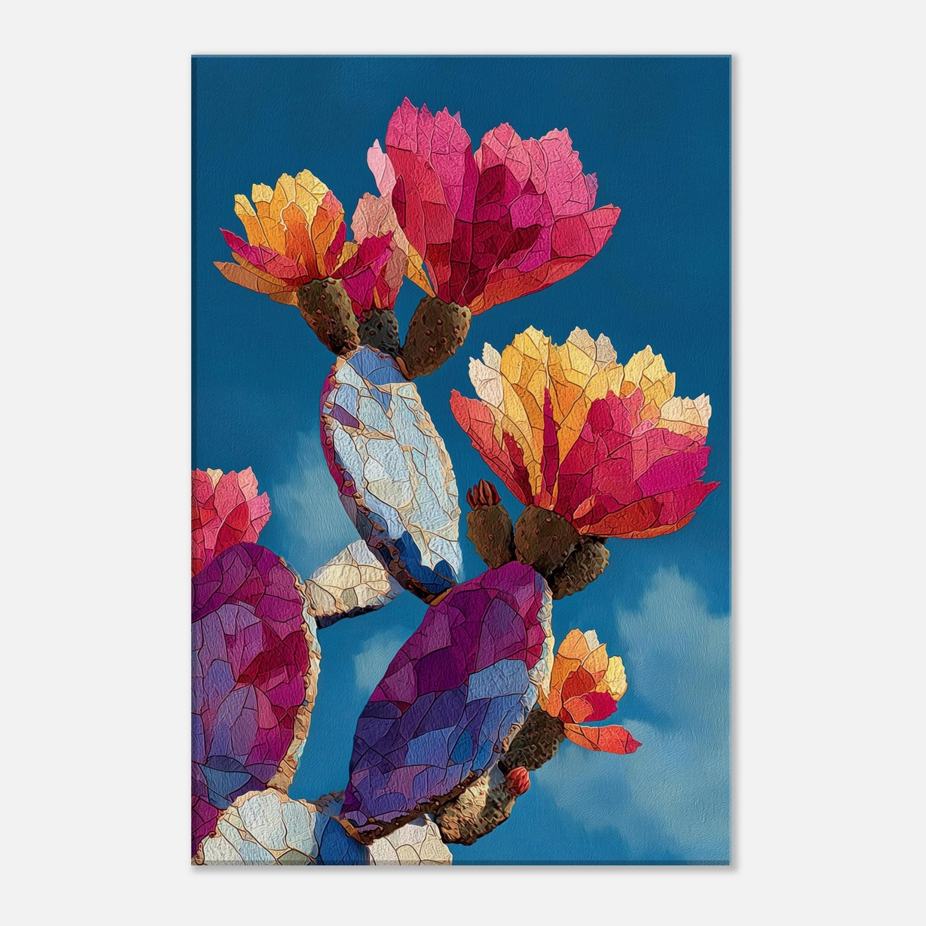 An exuberant study in color and form, this cactus inspired piece unfolds across the canvas like a desert dawn. The abstract shapes ripple with warm magentas, ambers, and blues, evoking sunlit petals and resilient growth. Hang it where light catches its prismatic facets to transform walls into living air and mood calm, curious, and inviting. The cactus becomes a modern emblem of endurance and wonder, balancing intimacy and drama in any lounge, study, or entry.