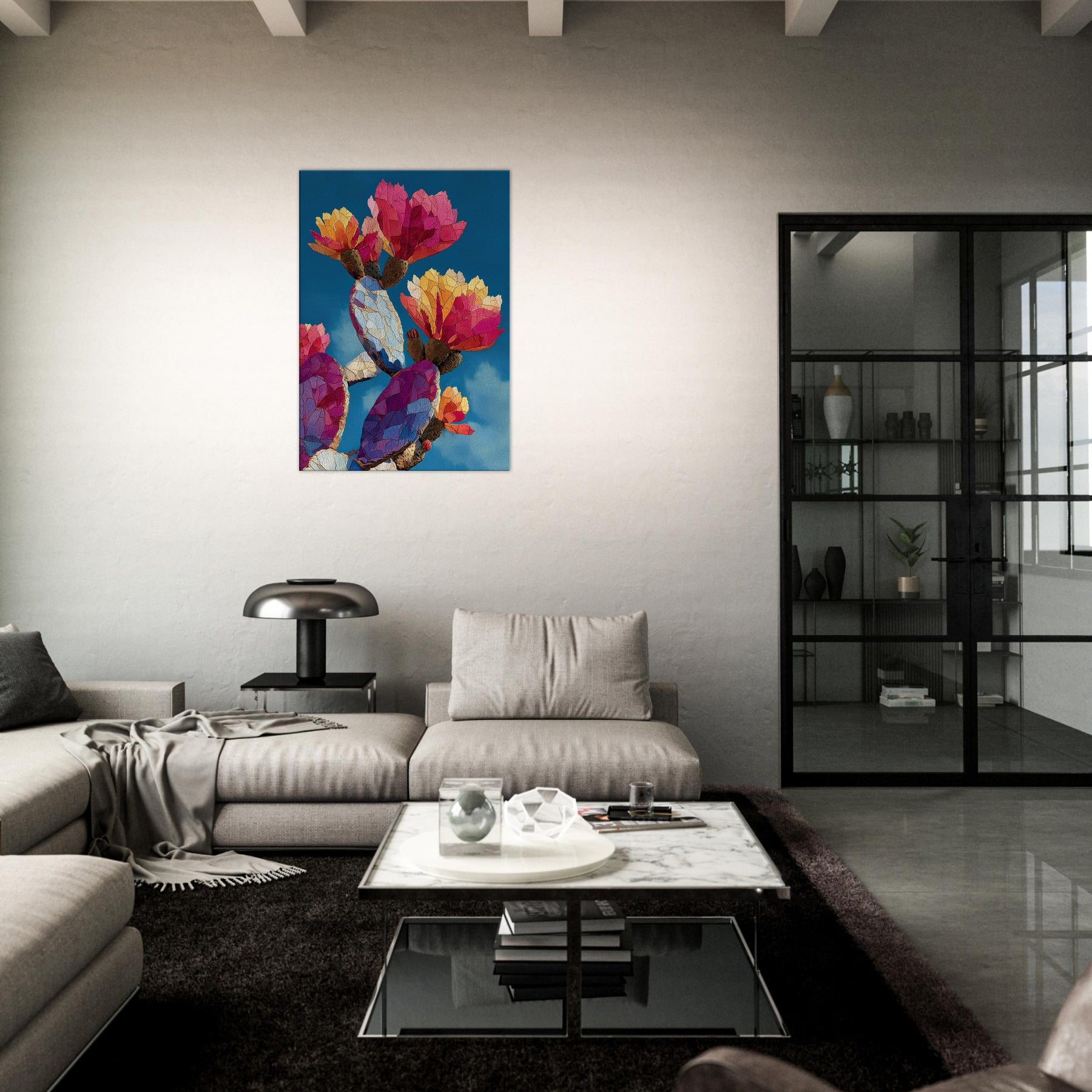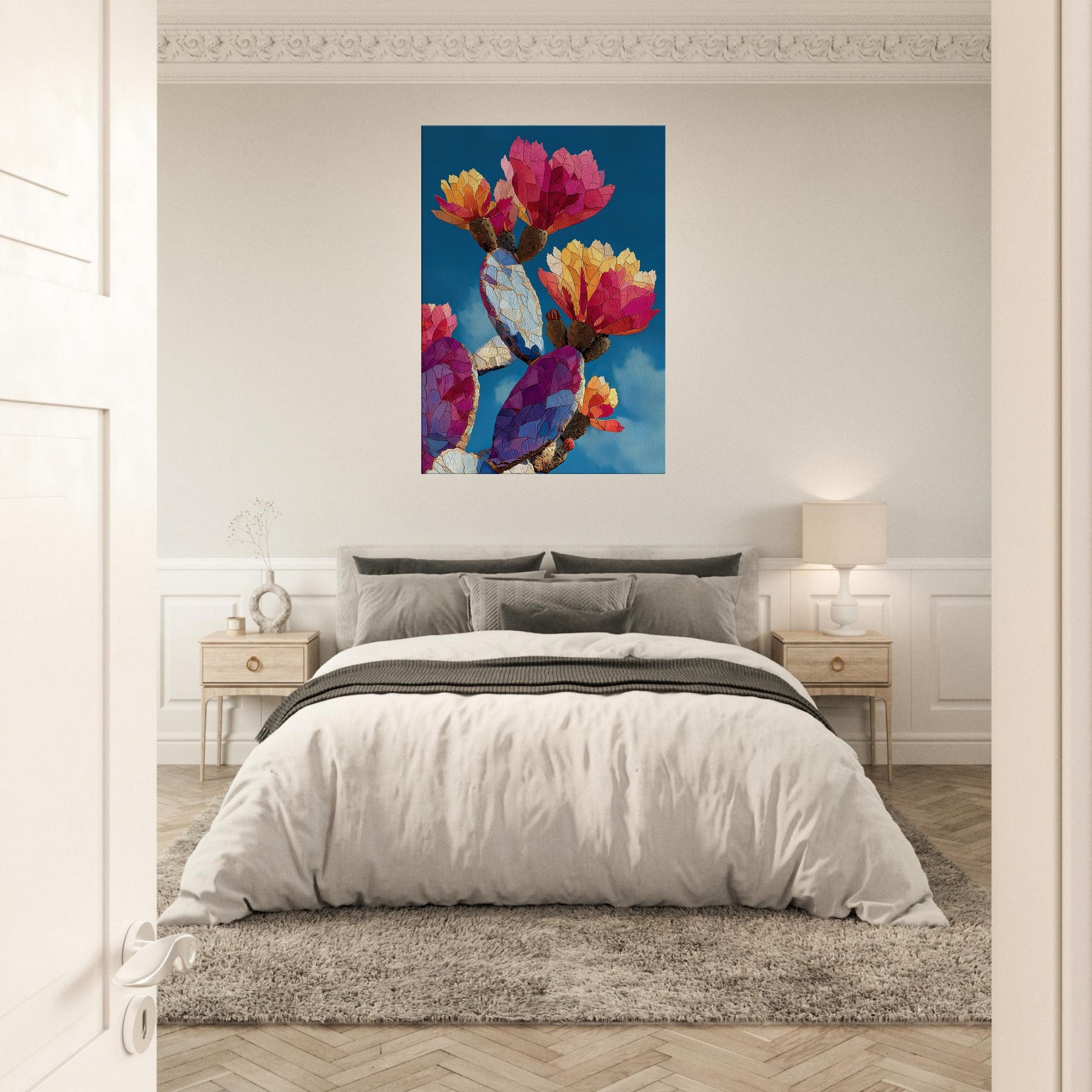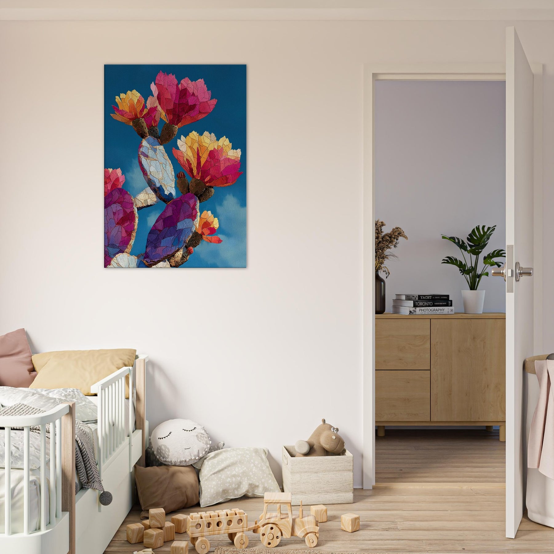 An exuberant study in color and form, this cactus inspired piece unfolds across the canvas like a desert dawn. The abstract shapes ripple with warm magentas, ambers, and blues, evoking sunlit petals and resilient growth. Hang it where light catches its prismatic facets to transform walls into living air and mood calm, curious, and inviting. The cactus becomes a modern emblem of endurance and wonder, balancing intimacy and drama in any lounge, study, or entry.