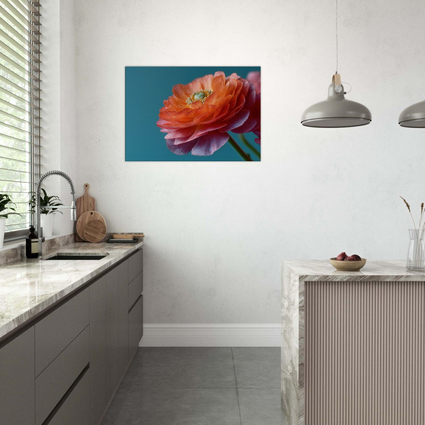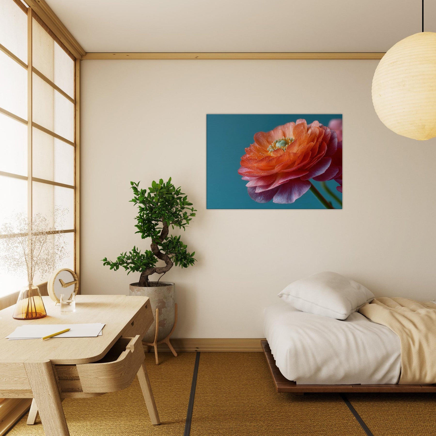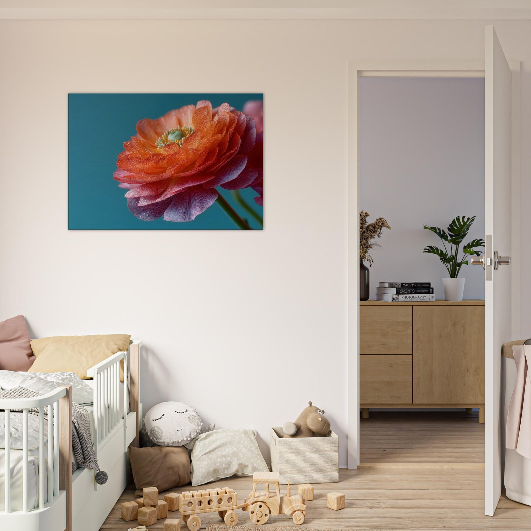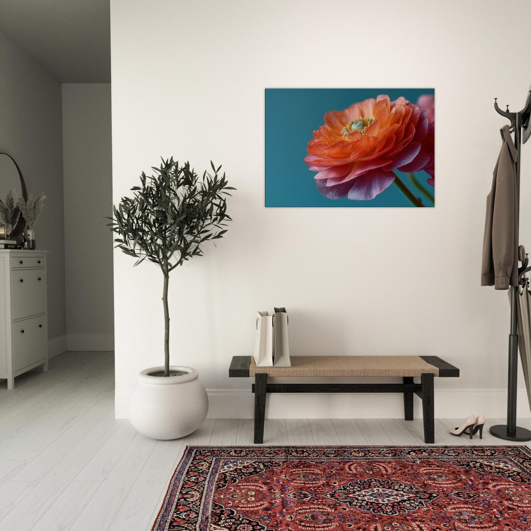 An immersion in color and light, this piece dissolves form into petals of heat and velvet. The Ranunculus unfurls across a cool teal field, inviting a quiet gaze that travels from the soft edges to the bright heart. The abstract treatment captures motion and scent, turning a garden bloom into a modern, luminous presence. Ideal for a living room or study, it lends warmth, texture, and an airy elegance that elevates everyday rooms into a sanctuary of color.