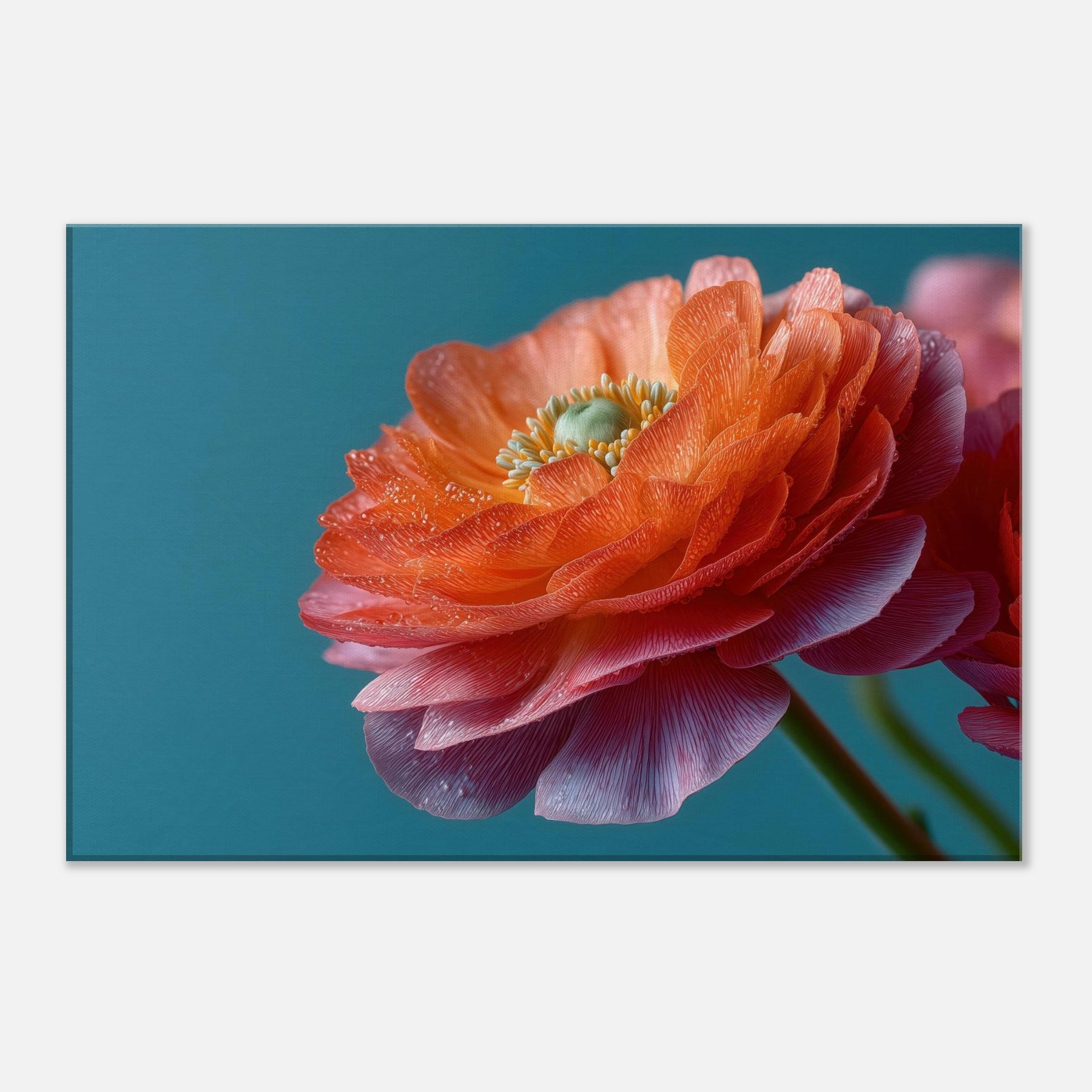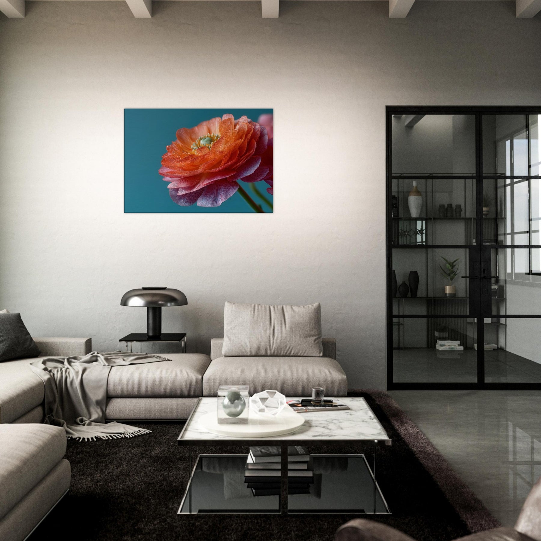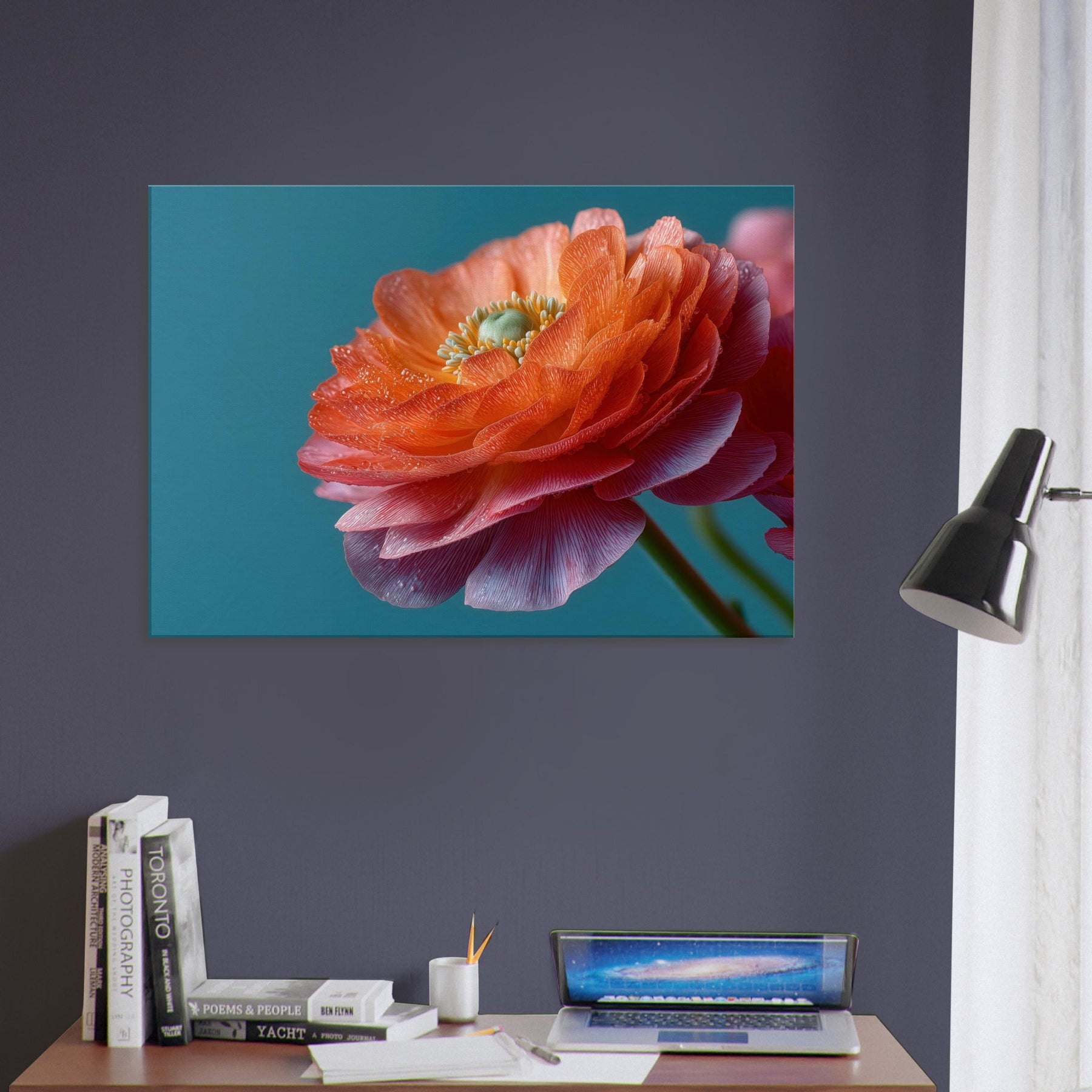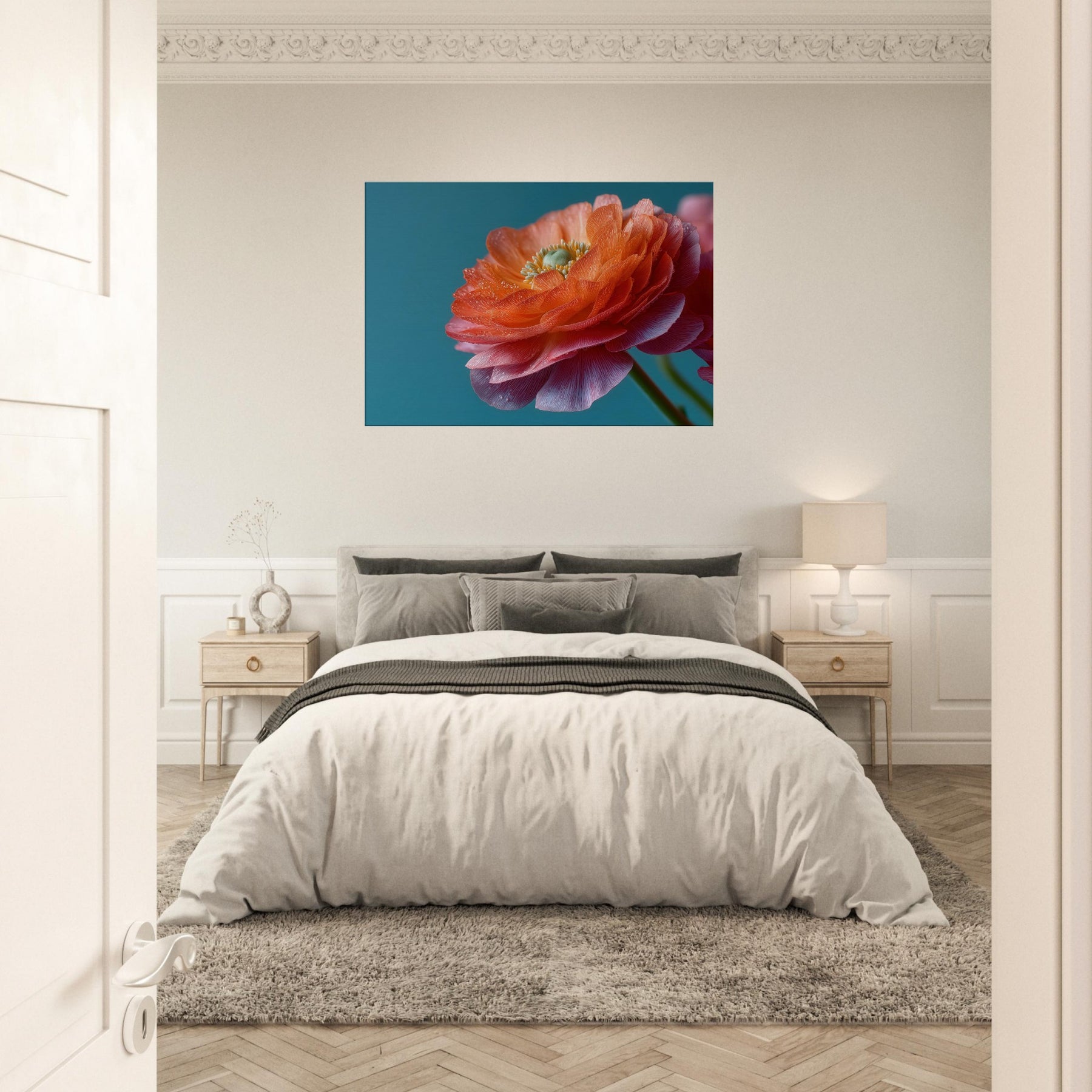 An immersion in color and light, this piece dissolves form into petals of heat and velvet. The Ranunculus unfurls across a cool teal field, inviting a quiet gaze that travels from the soft edges to the bright heart. The abstract treatment captures motion and scent, turning a garden bloom into a modern, luminous presence. Ideal for a living room or study, it lends warmth, texture, and an airy elegance that elevates everyday rooms into a sanctuary of color.