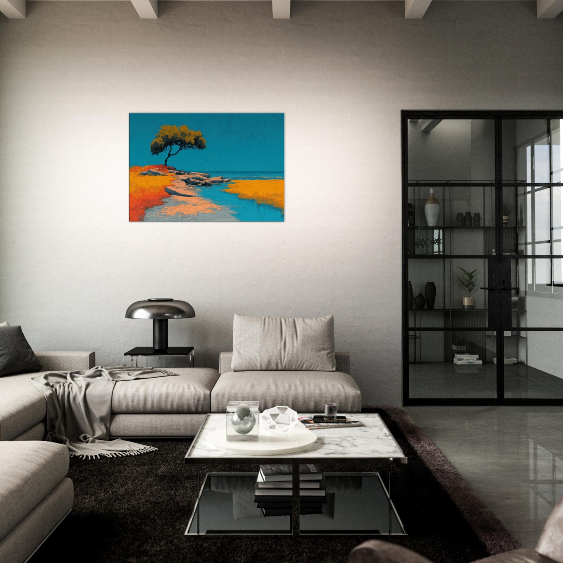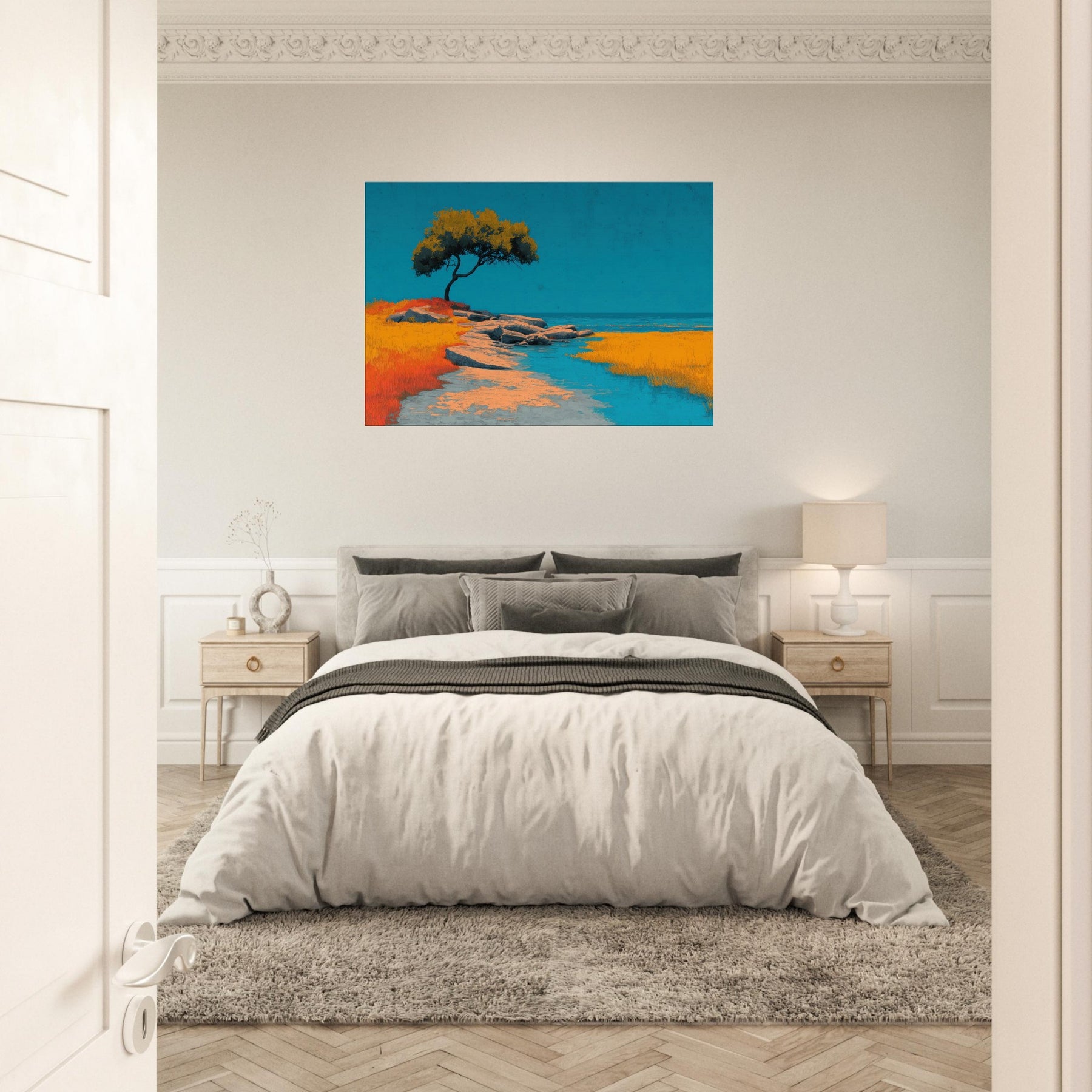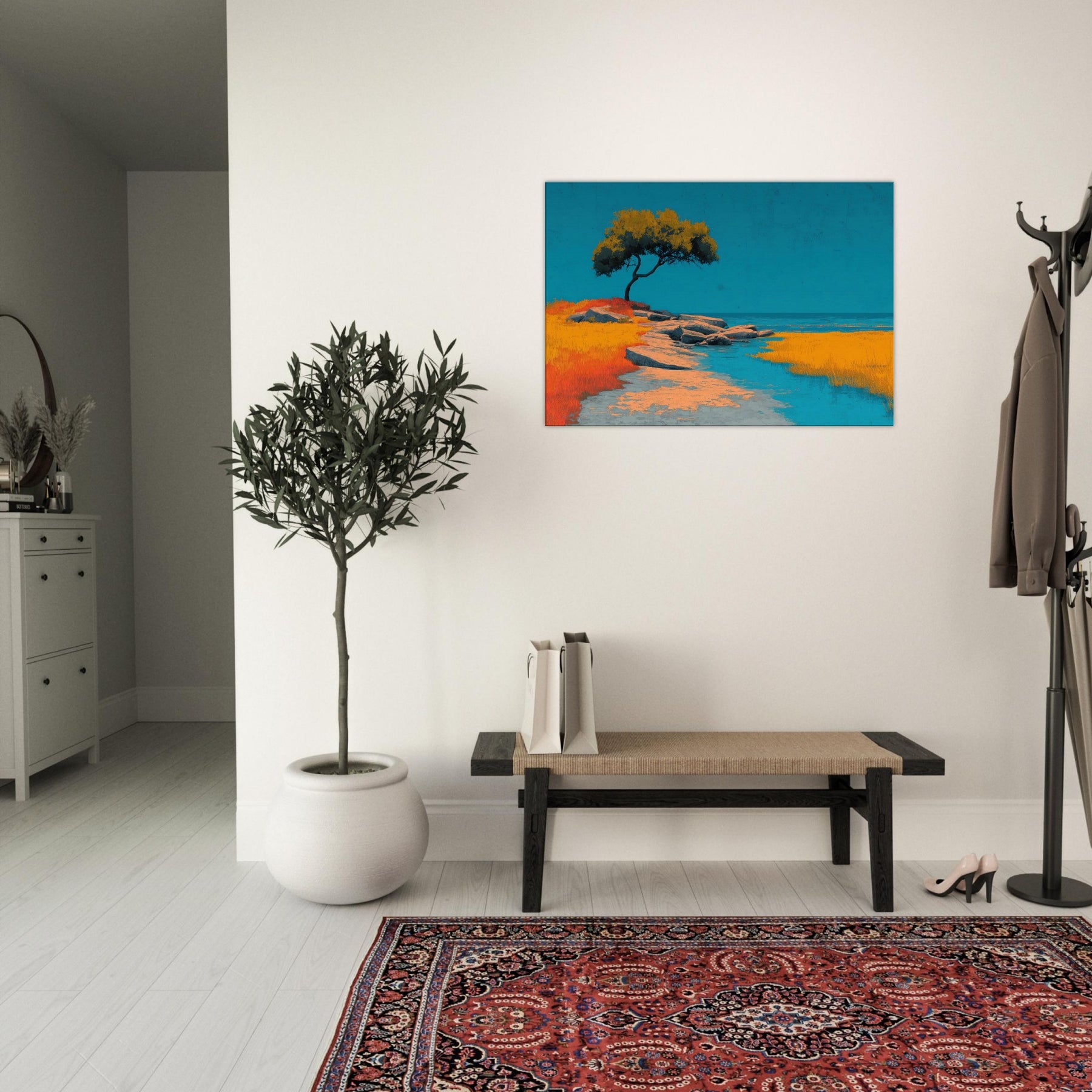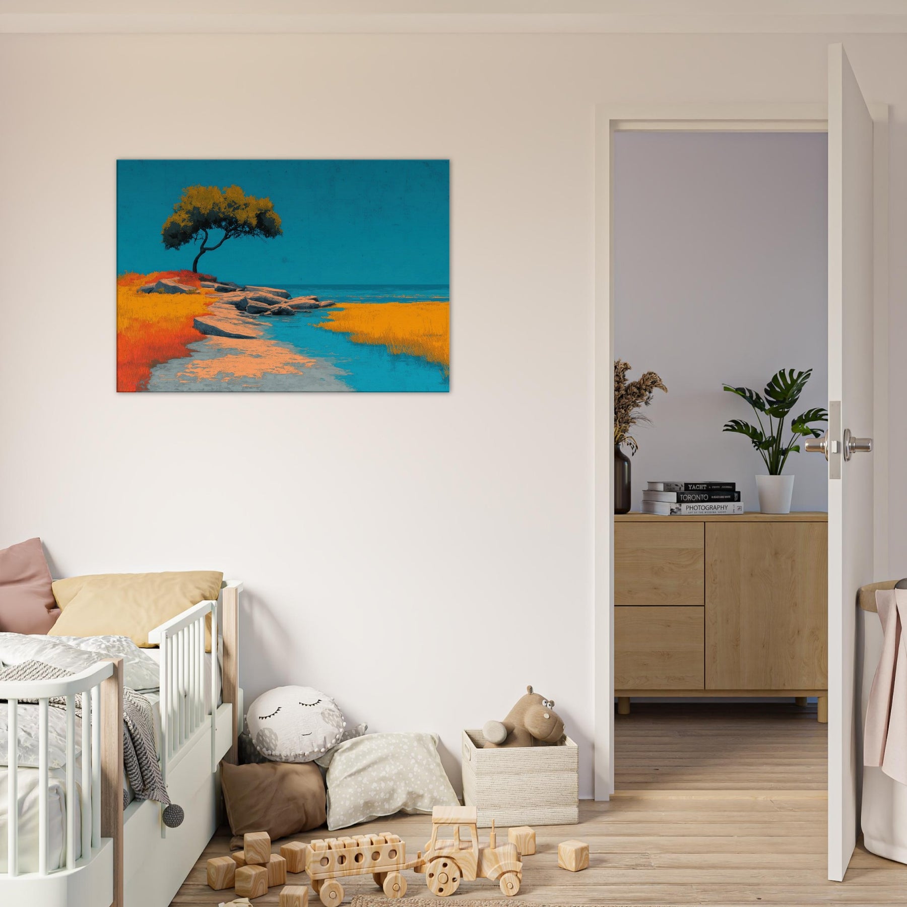 An ocean breath of color greets the room: a solitary Beach scene rendered in waves of teal, sun kissed grasses, and a windswept tree. The composition invites the eye to wander from the rocky shore to the distant horizon, where water and sky kiss in a quiet, electric blue. Its bold warmth warms furniture and cushions, while the cool blues anchor the space. Perfect for a living room or bedroom, this piece infuses calm, curiosity, and a touch of coastal mystery.