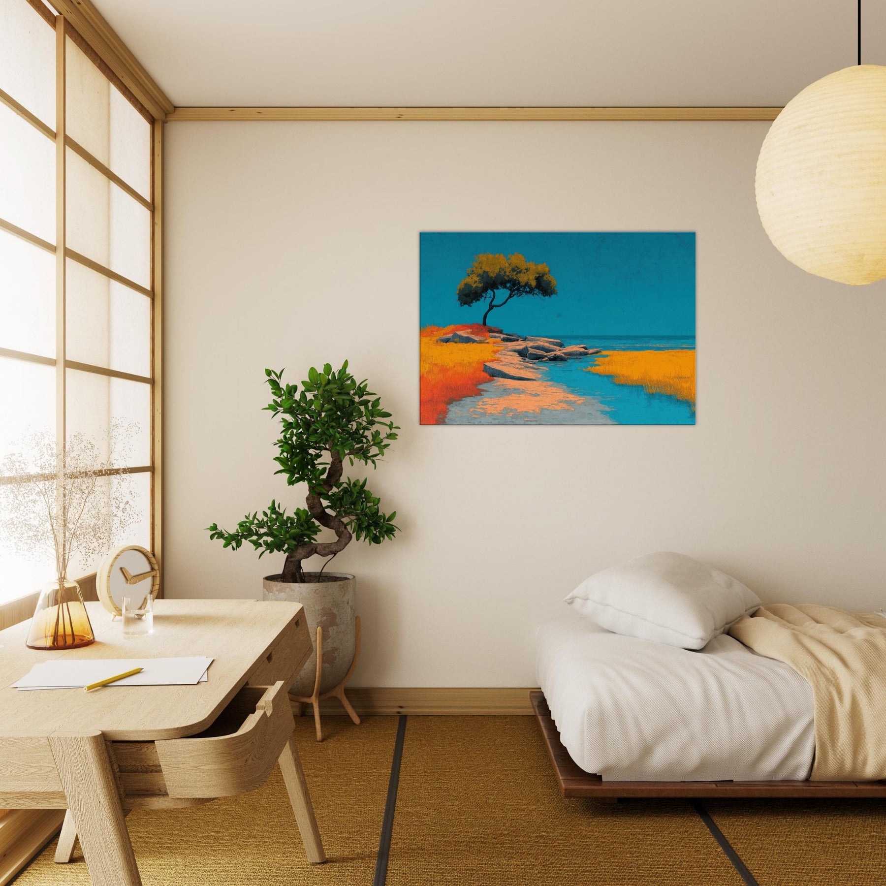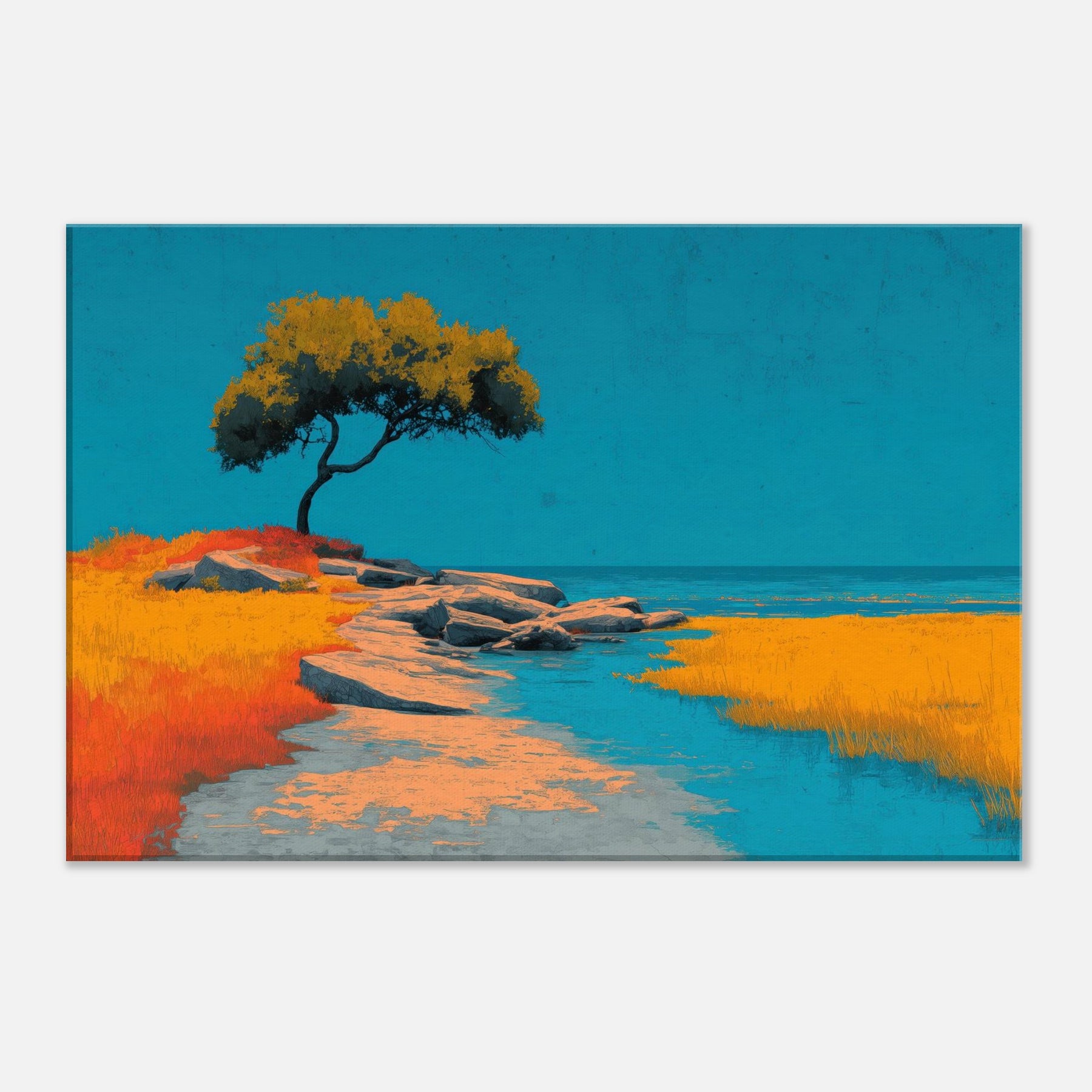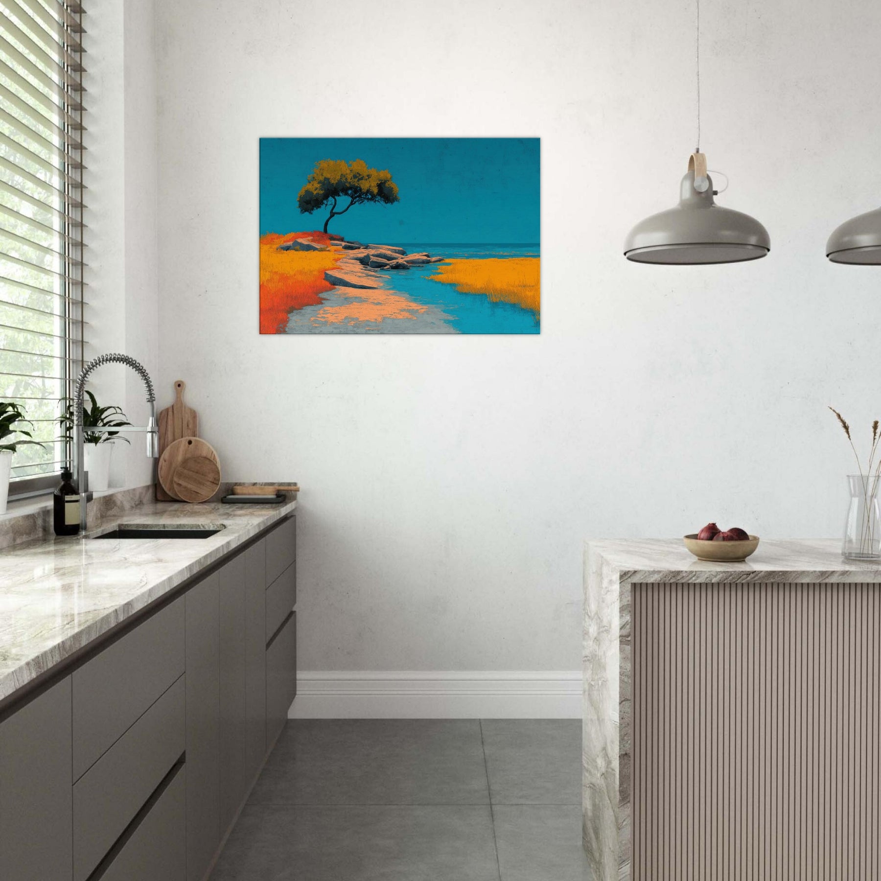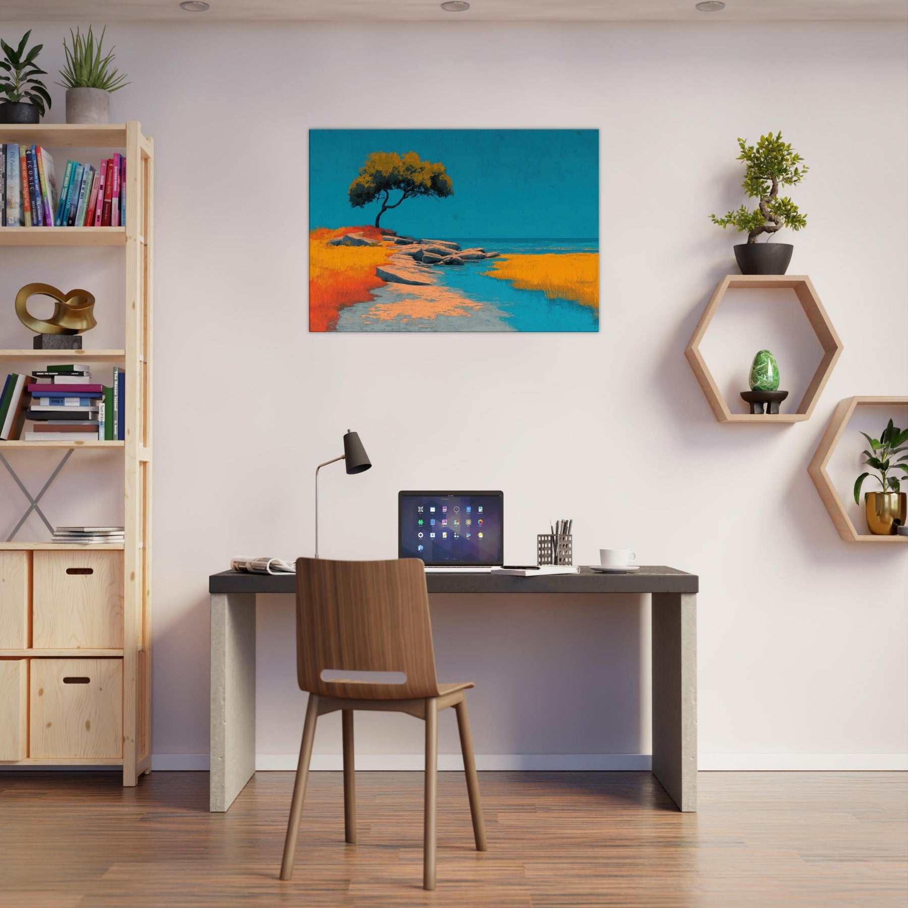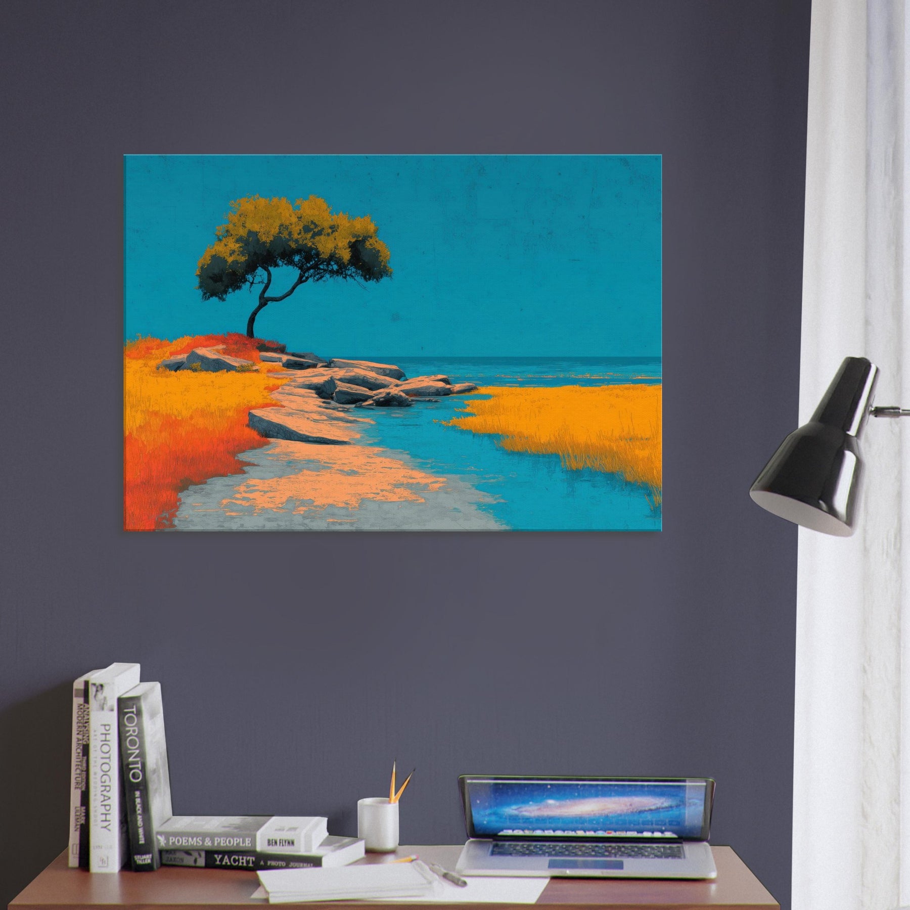 An ocean breath of color greets the room: a solitary Beach scene rendered in waves of teal, sun kissed grasses, and a windswept tree. The composition invites the eye to wander from the rocky shore to the distant horizon, where water and sky kiss in a quiet, electric blue. Its bold warmth warms furniture and cushions, while the cool blues anchor the space. Perfect for a living room or bedroom, this piece infuses calm, curiosity, and a touch of coastal mystery.