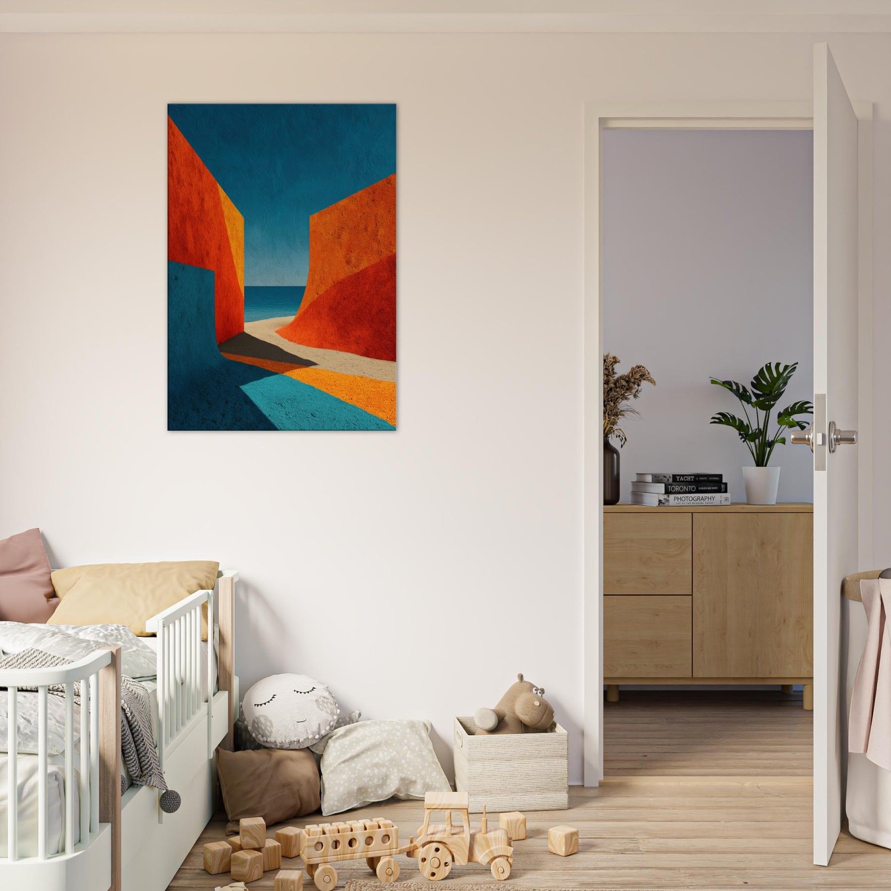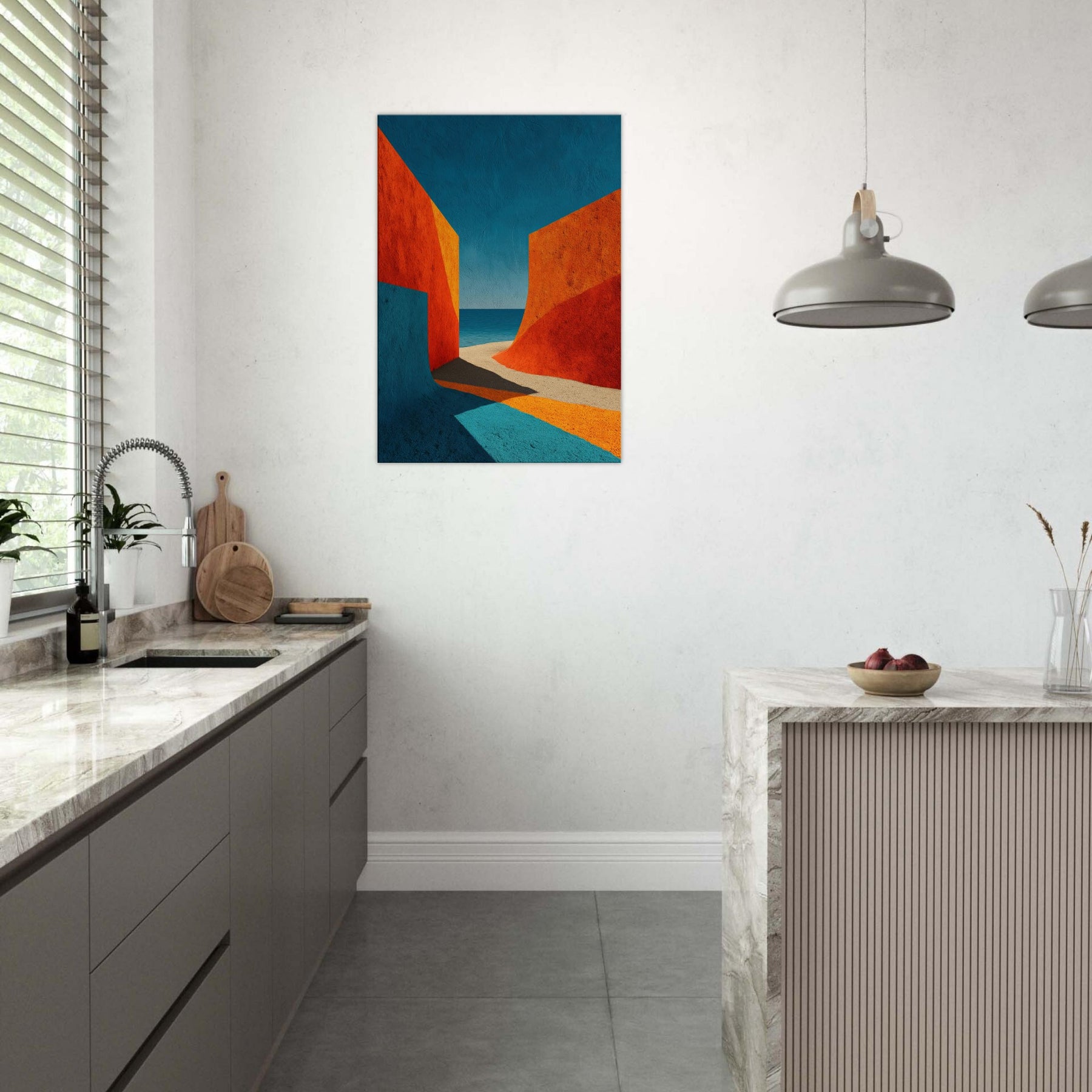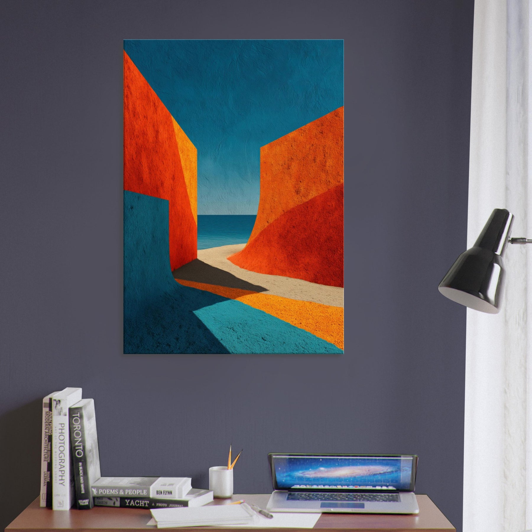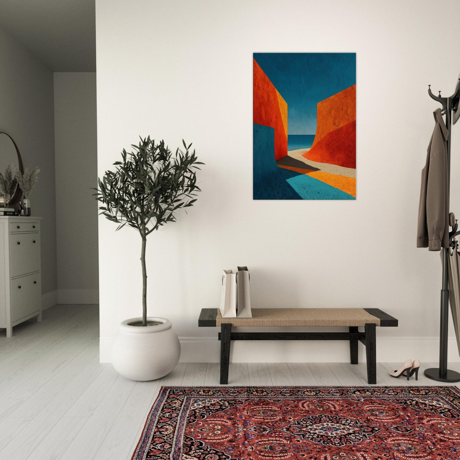 Let the Beach emerge from a quiet passage of color in this abstract study of light and shoreline. The bold, sun warmed walls cradle the sea blue opening, inviting a slow inhale as if stepping toward the water’s edge. Rich oranges, cool cobalt, and sandy neutrals mingle to create a mood of sun soaked calm that elevates any living space. Perfect for a living room or pairing with natural textures, it conjures memory and invitation in equal measure.