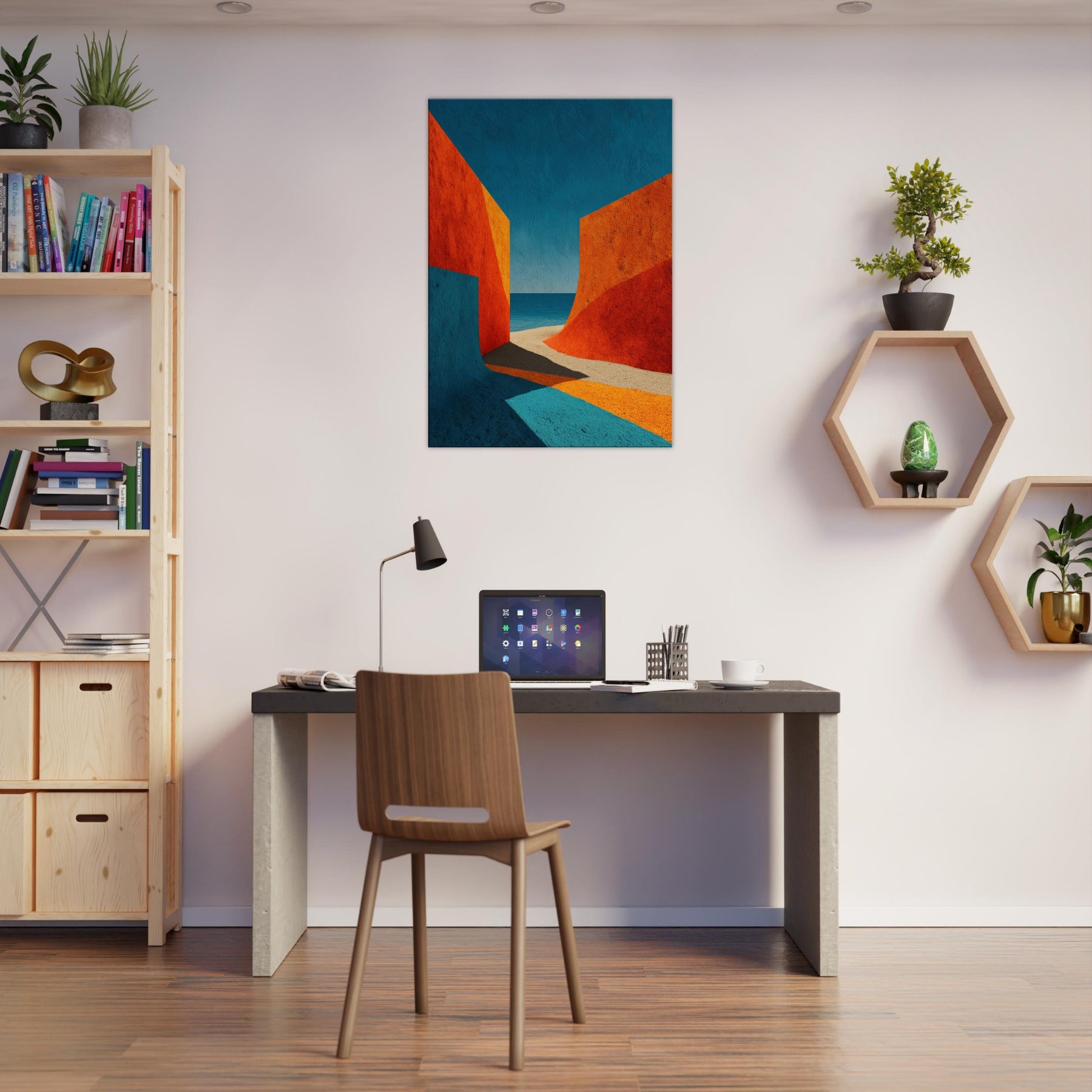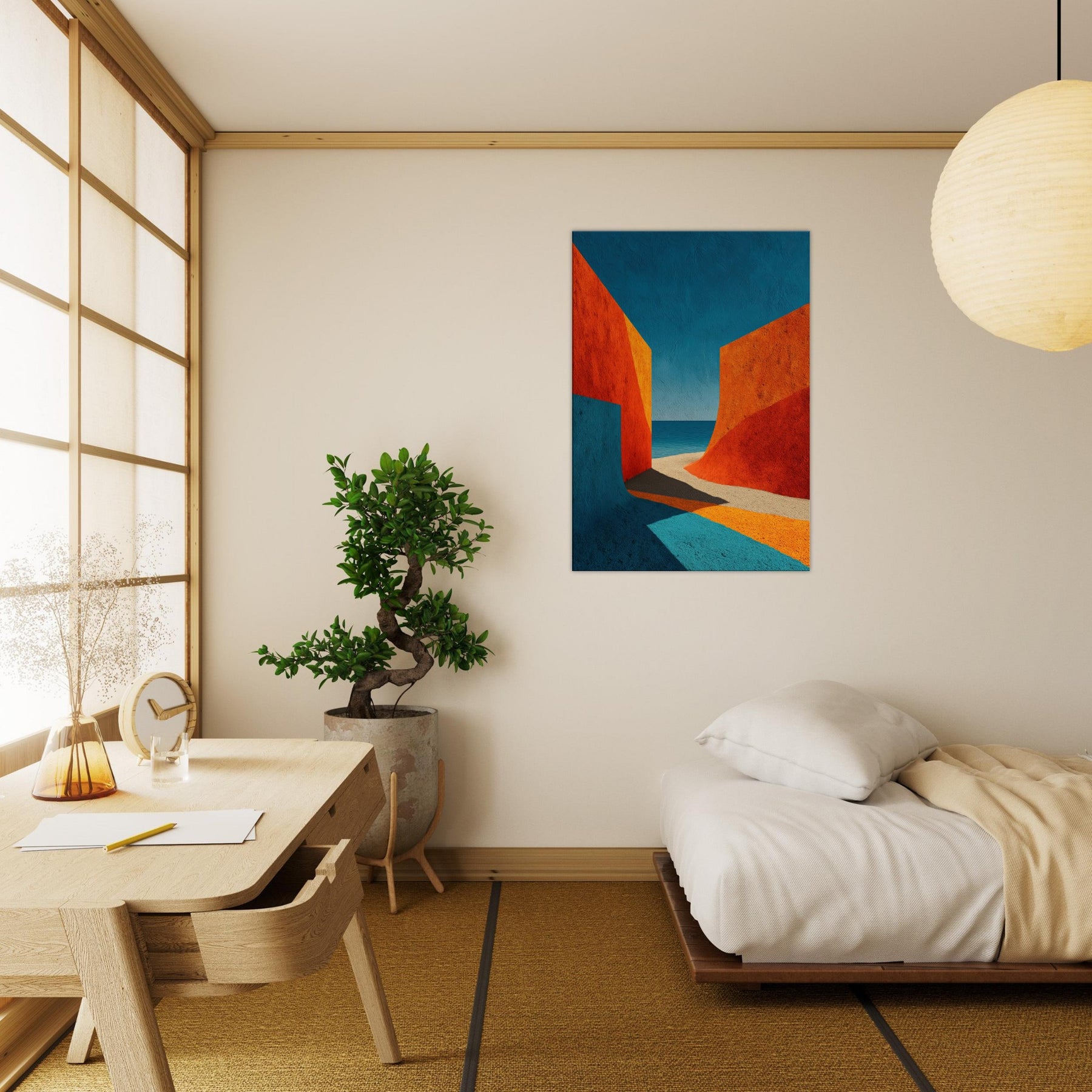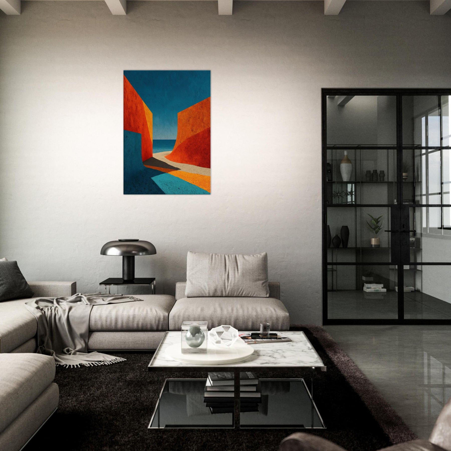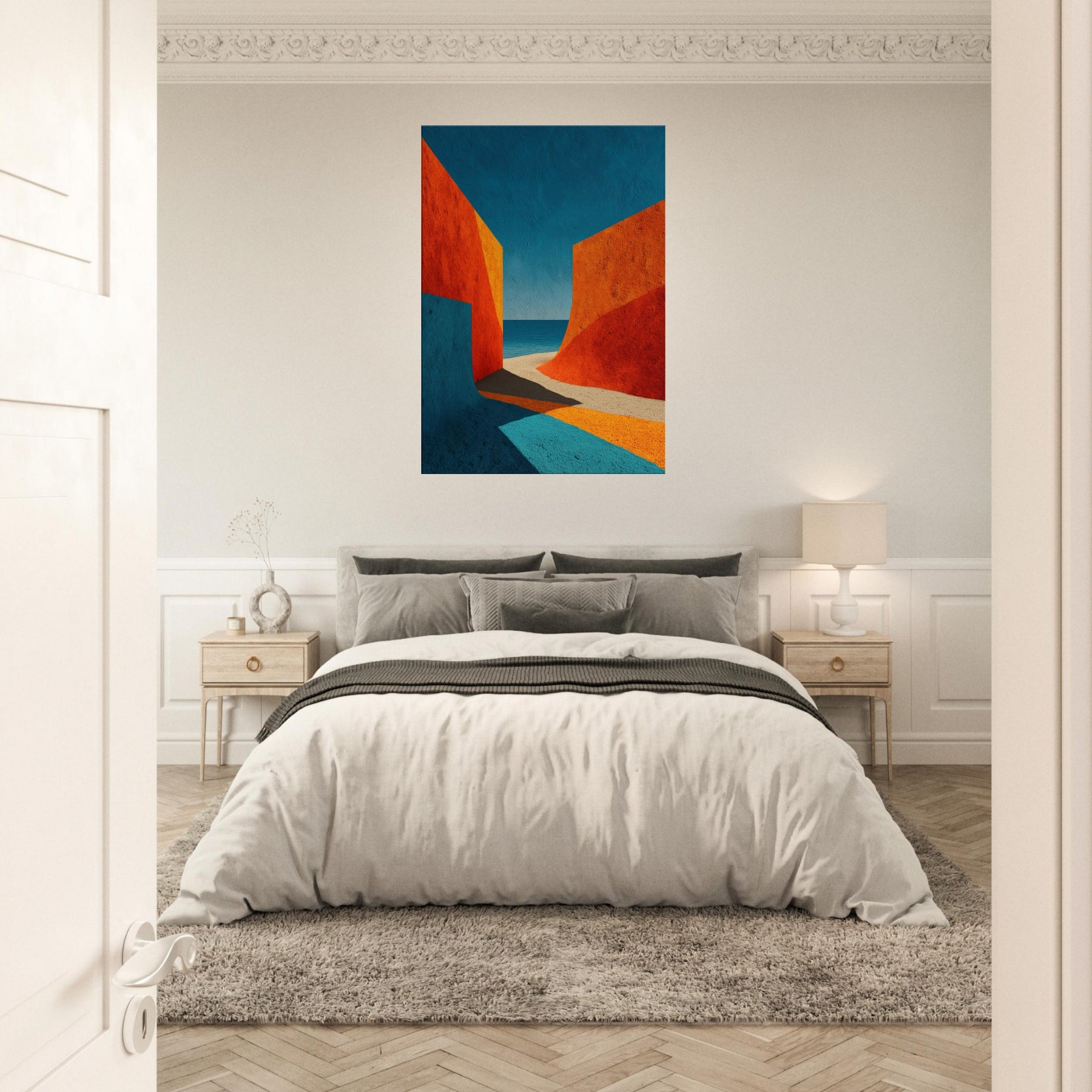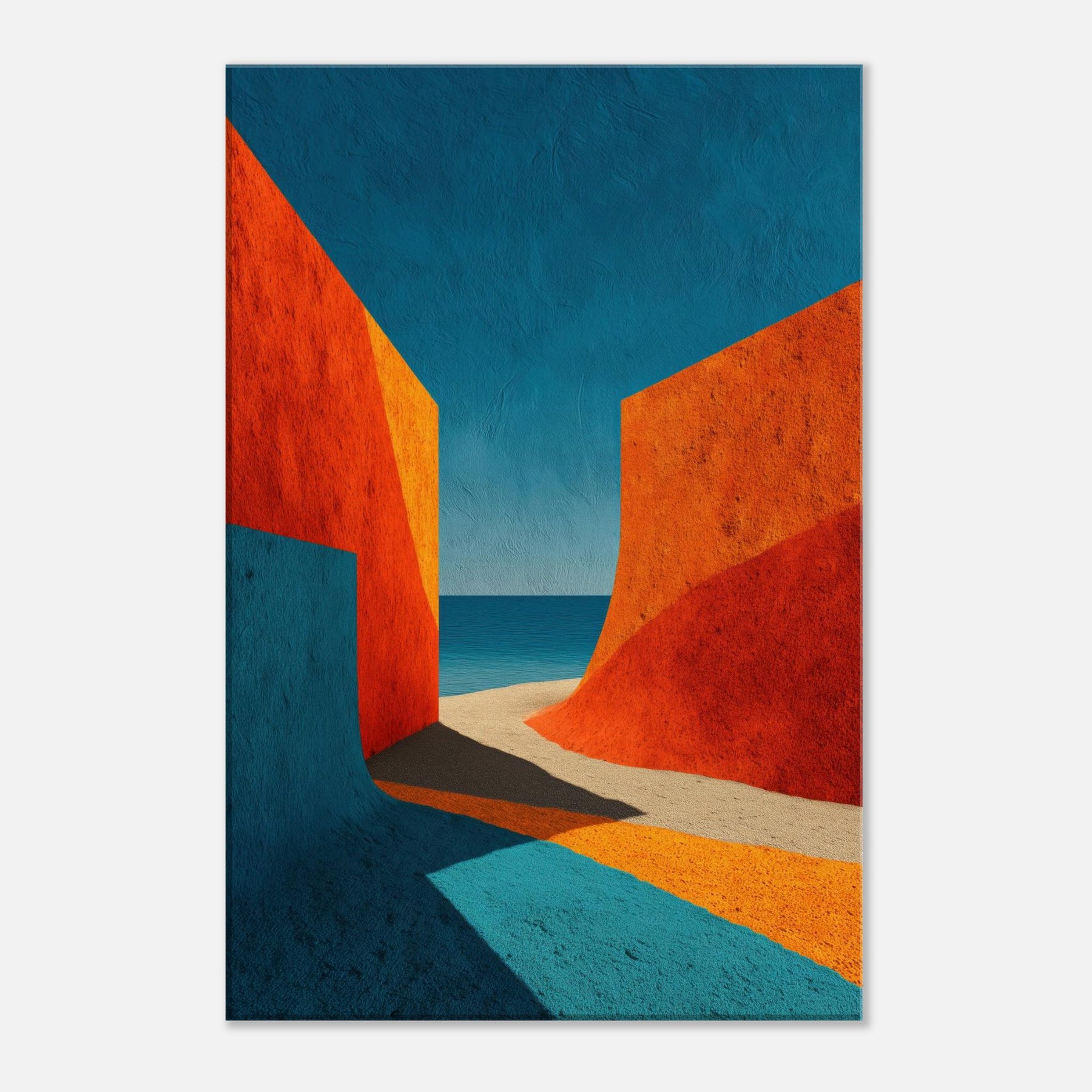 Let the Beach emerge from a quiet passage of color in this abstract study of light and shoreline. The bold, sun warmed walls cradle the sea blue opening, inviting a slow inhale as if stepping toward the water’s edge. Rich oranges, cool cobalt, and sandy neutrals mingle to create a mood of sun soaked calm that elevates any living space. Perfect for a living room or pairing with natural textures, it conjures memory and invitation in equal measure.