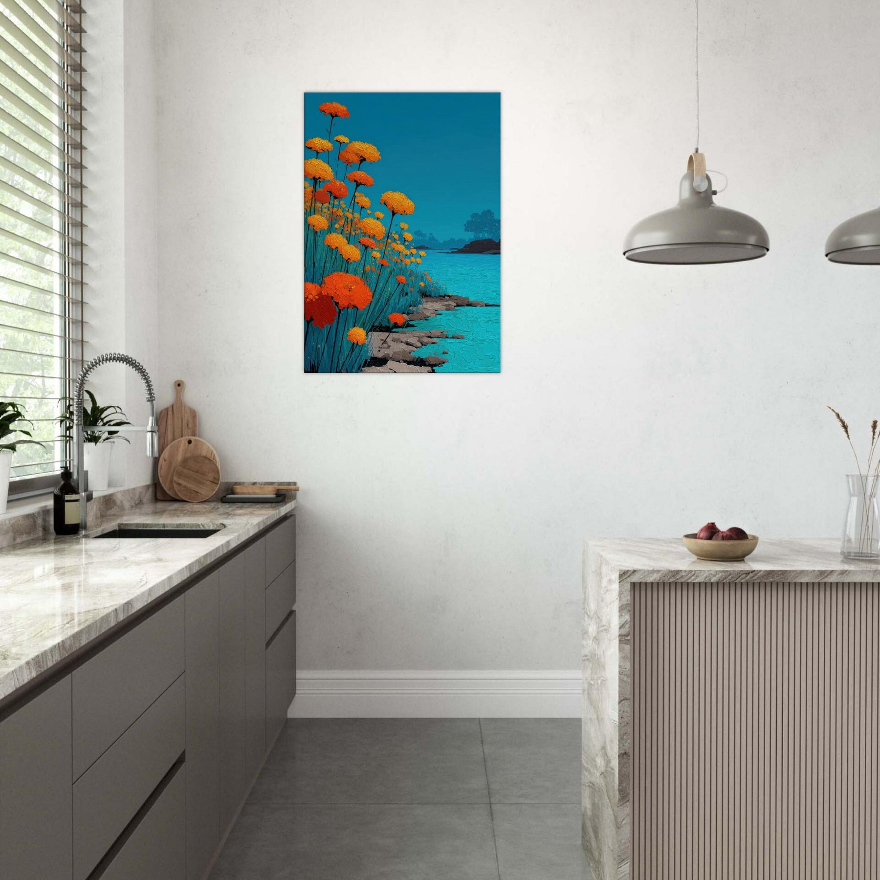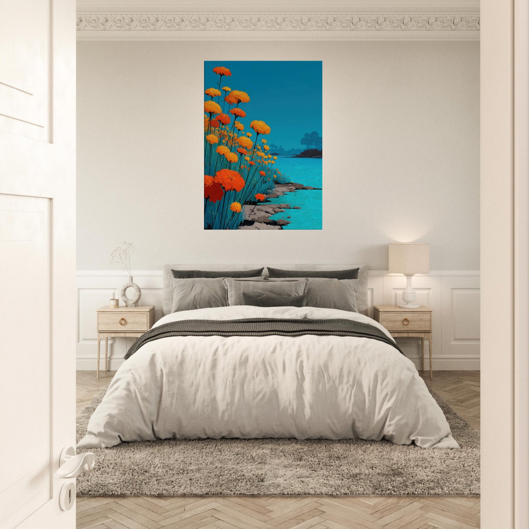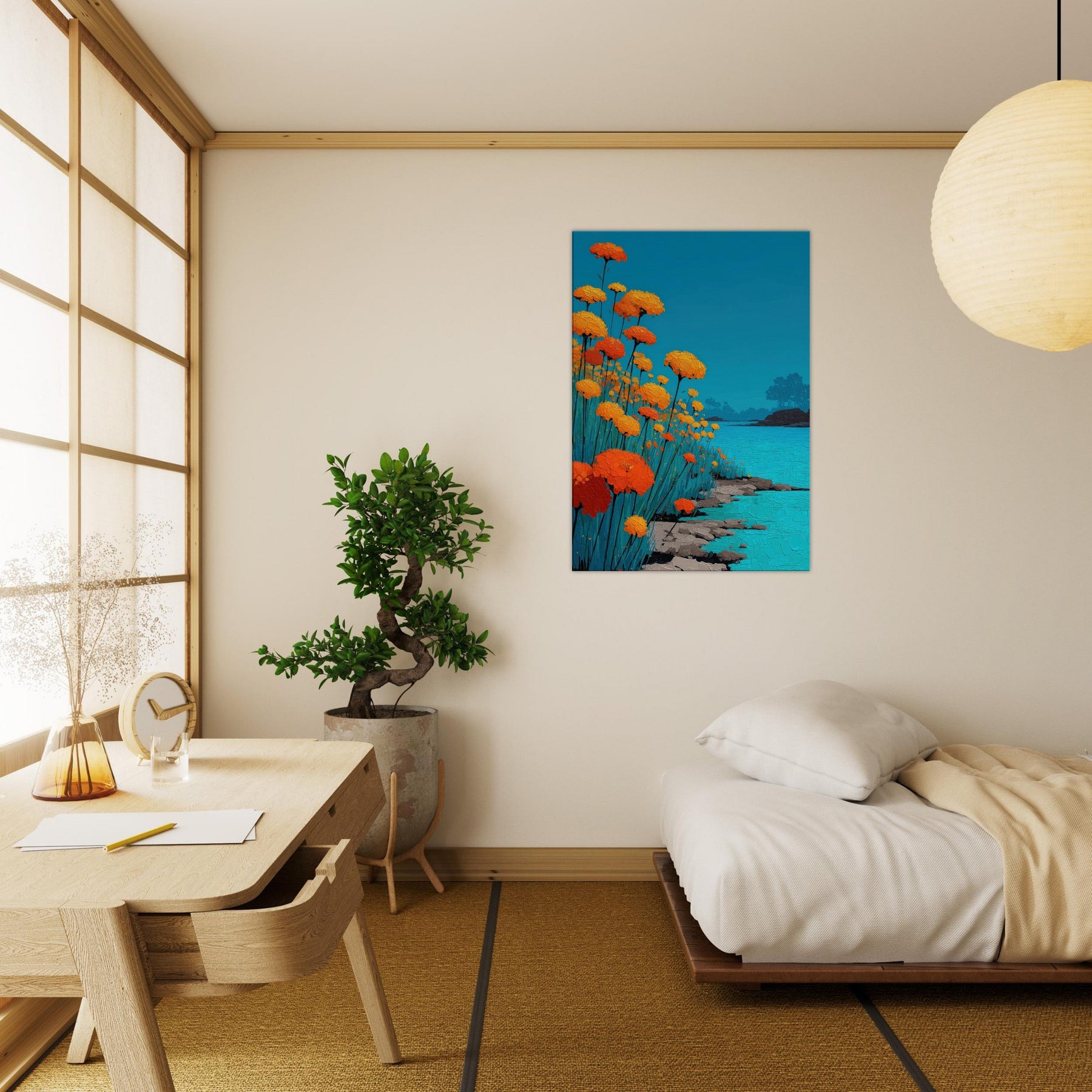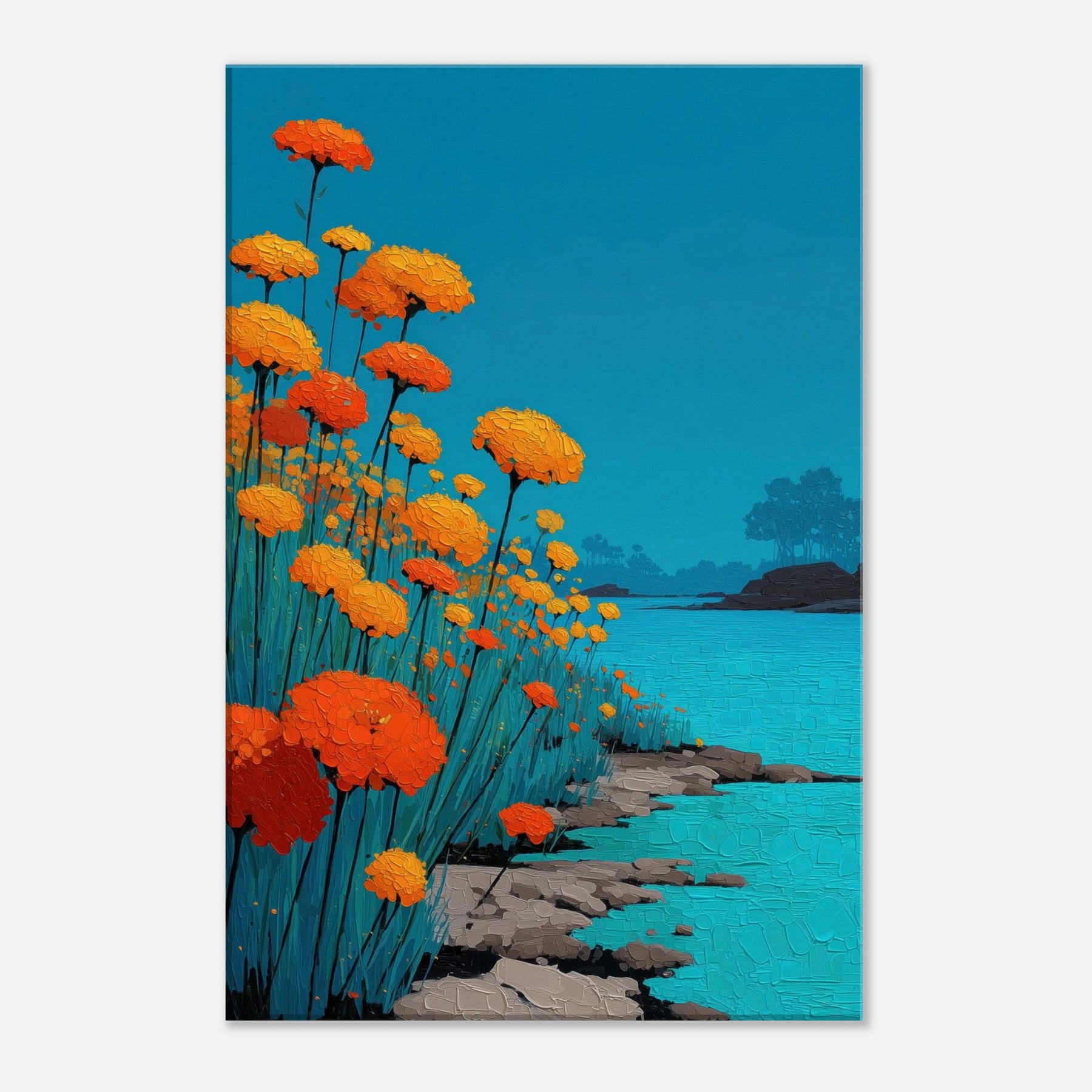 Let a Flower Field pour into your room: a chorus of orange blooms raised against a sky of clear blue, their petals rendered in tactile, sunlit relief. The scene hums with warmth and movement heat on the skin, a gentle rustle of stems, the whisper of water along a quiet shore. In living spaces, this piece offers a tranquil glow and expansive depth, turning walls into a window of outdoor calm, inviting reflection and conversation.