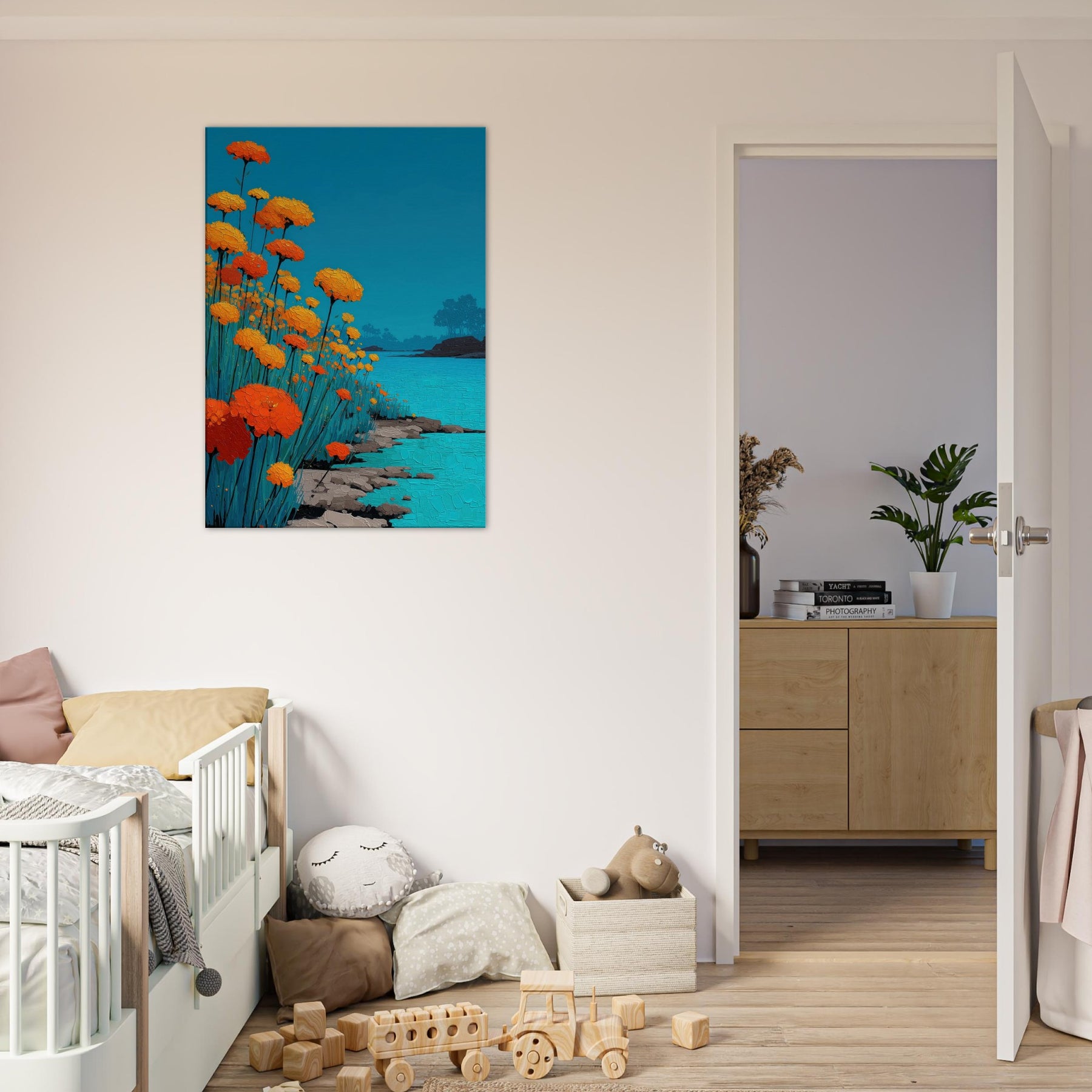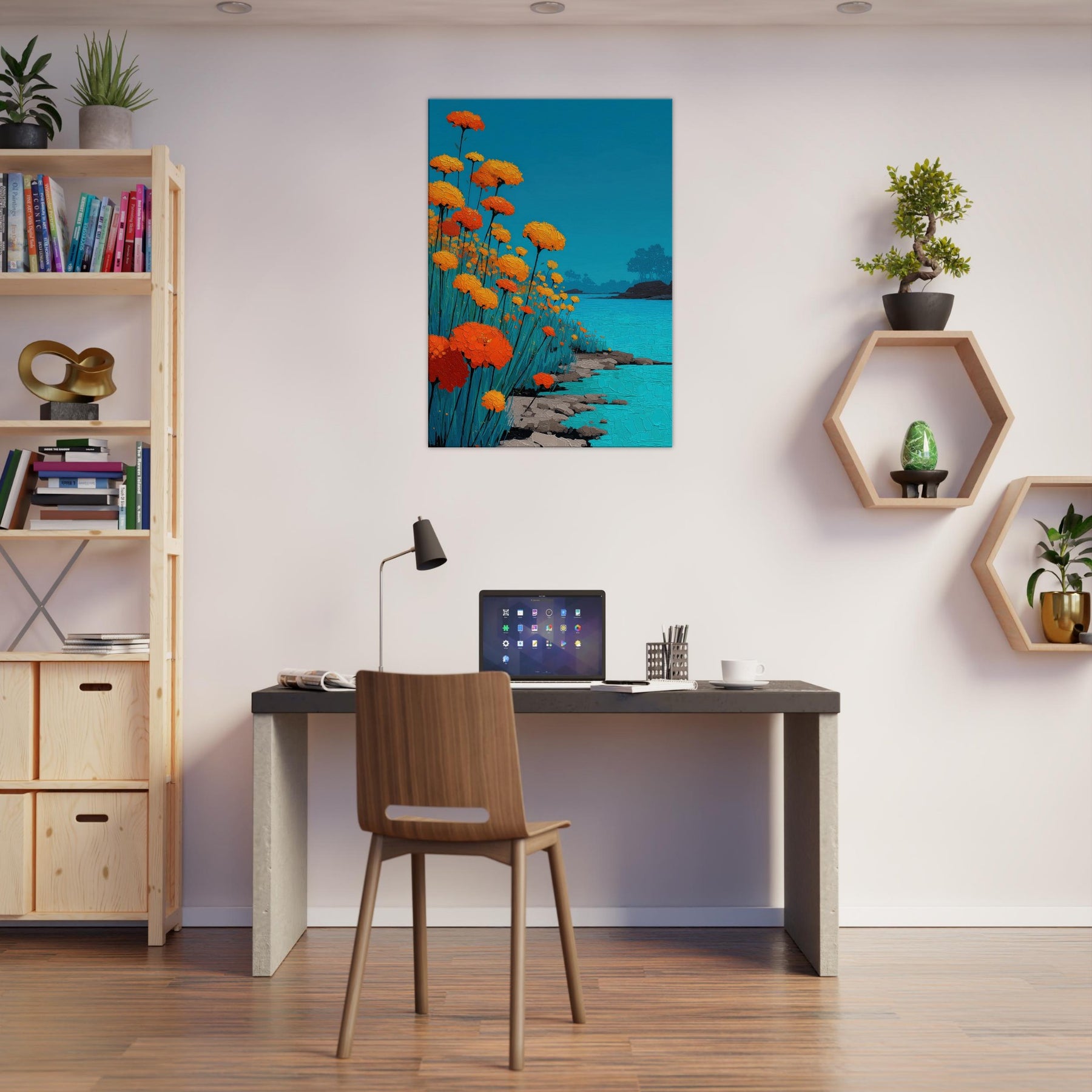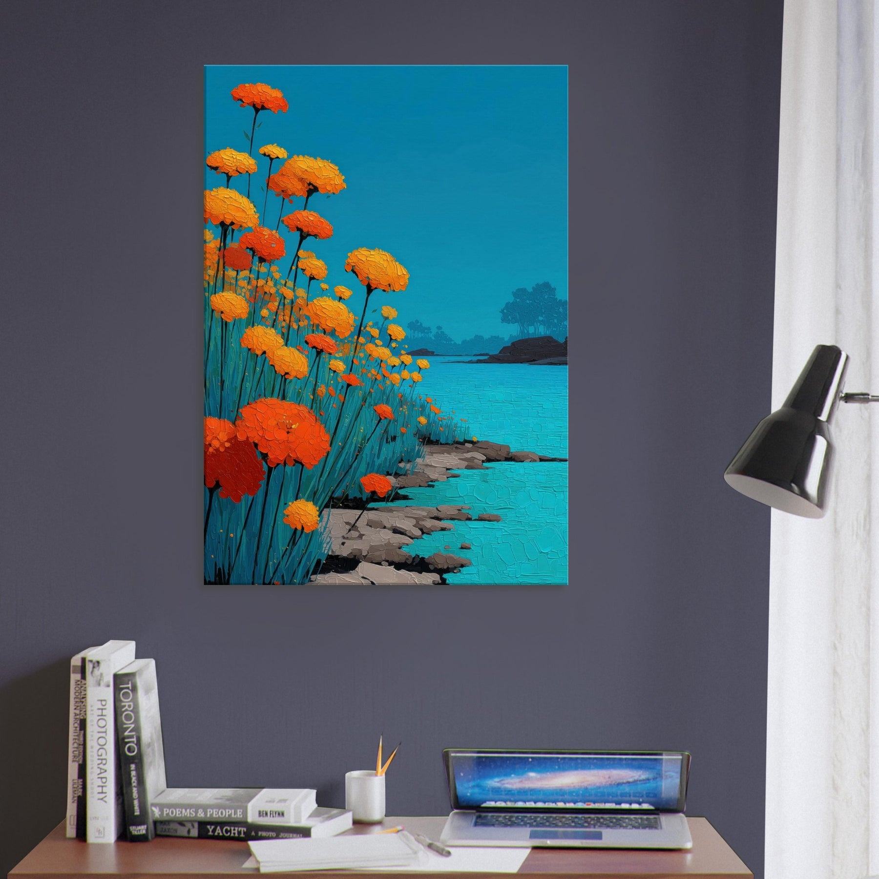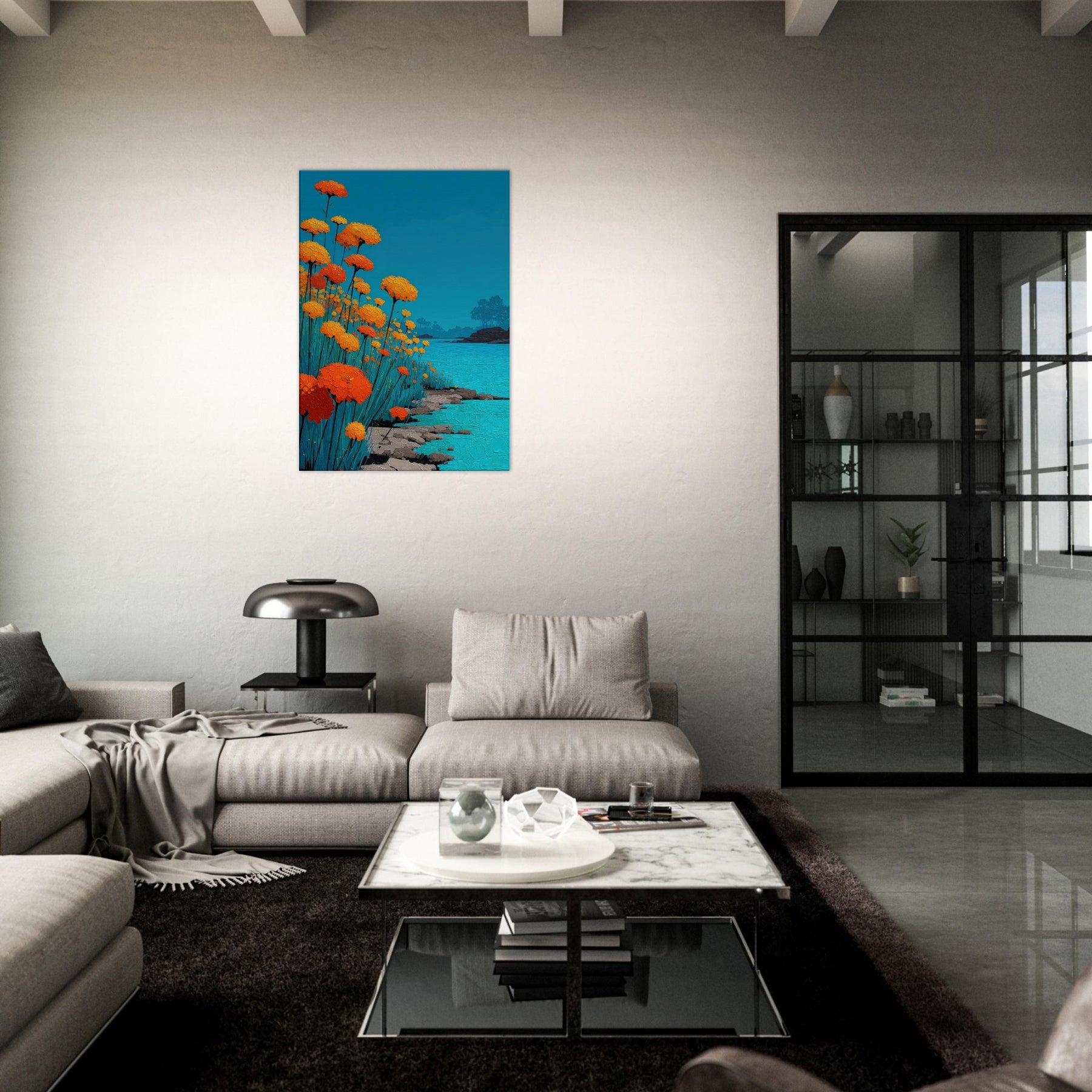 Let a Flower Field pour into your room: a chorus of orange blooms raised against a sky of clear blue, their petals rendered in tactile, sunlit relief. The scene hums with warmth and movement heat on the skin, a gentle rustle of stems, the whisper of water along a quiet shore. In living spaces, this piece offers a tranquil glow and expansive depth, turning walls into a window of outdoor calm, inviting reflection and conversation.
