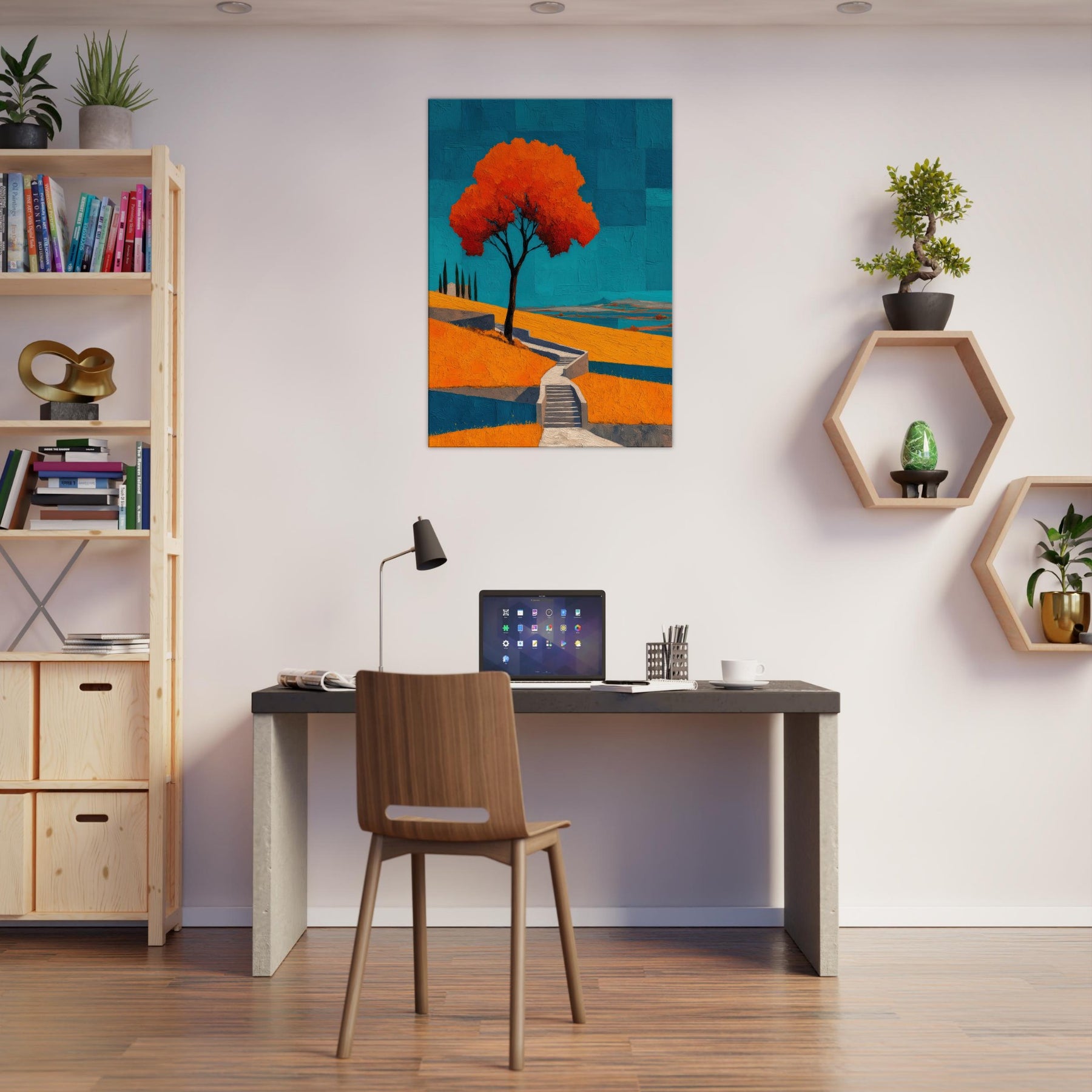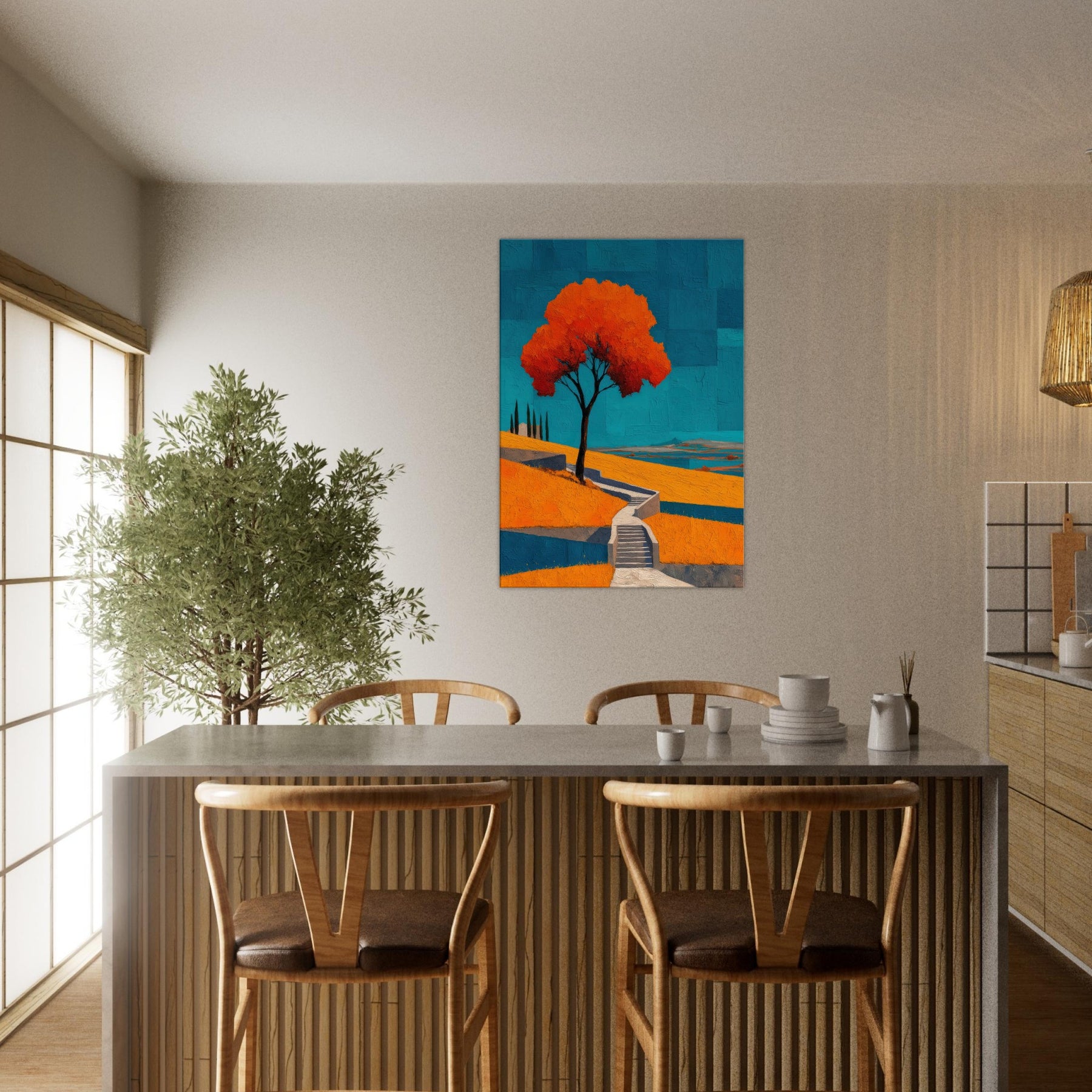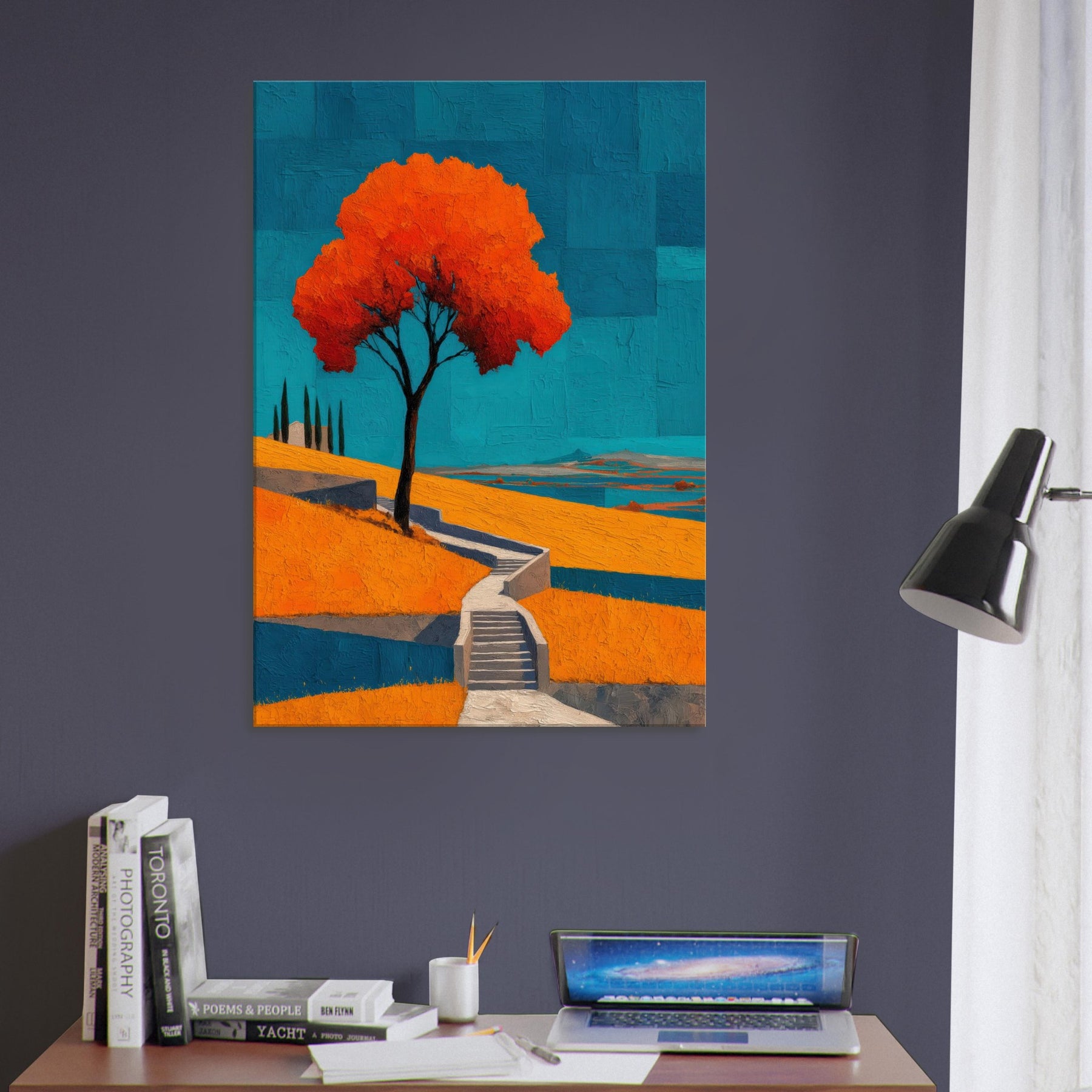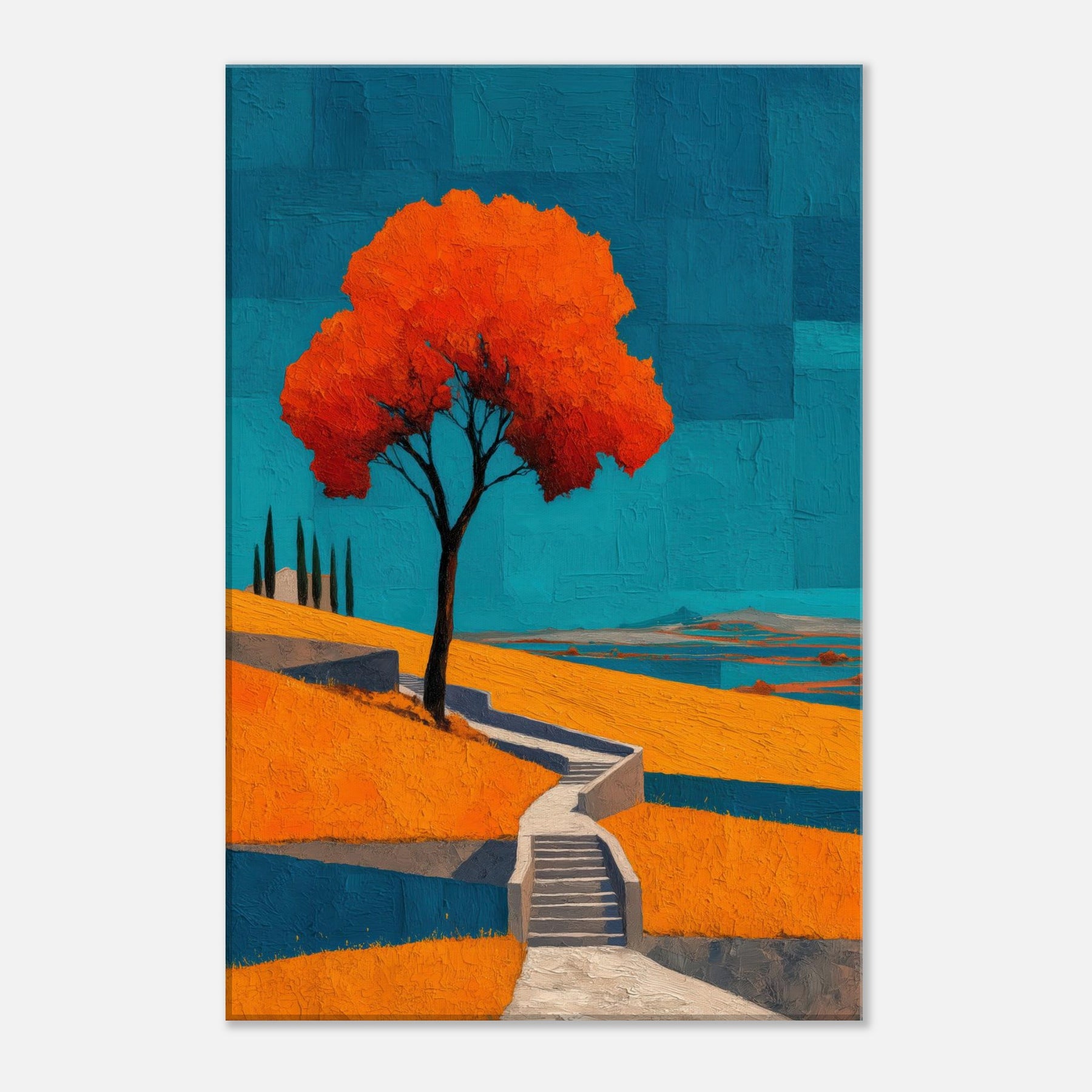 An abstract vineyard scene unfurls in bold, sun warmed color. A solitary tree glows orange against a cobalt sky, while terraced hills cascade with warm yellows and cool blues. The painting hums with energy and quiet, like a late afternoon walk among vines, the air tasting of sun baked earth. Hung in a living room, it becomes a luminous anchor, inviting conversation and calm, and turning walls into a horizon where nature's rhythm travels from the outdoors into your everyday space.