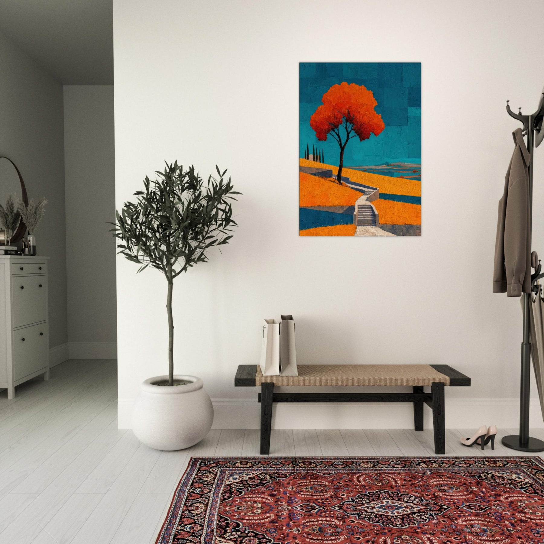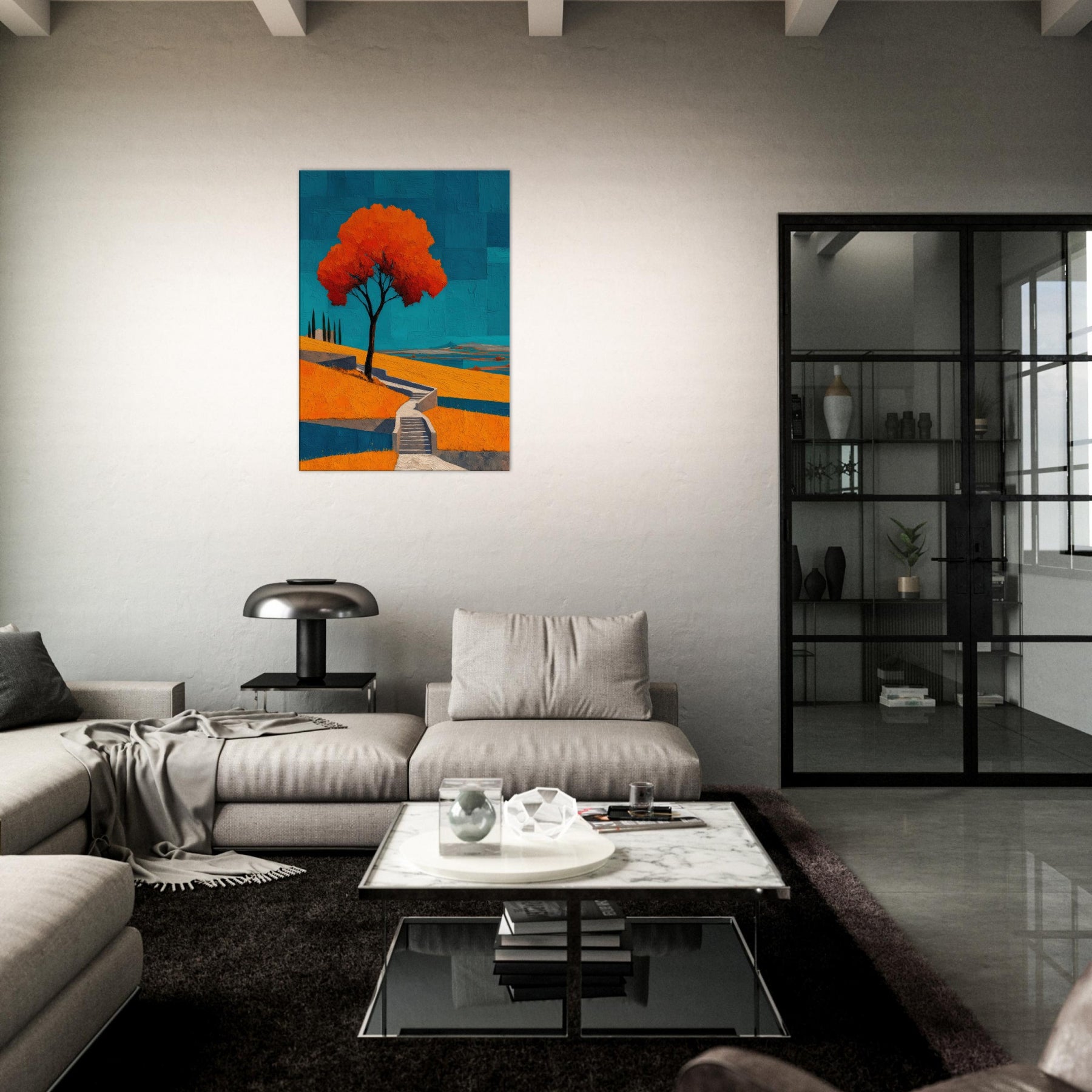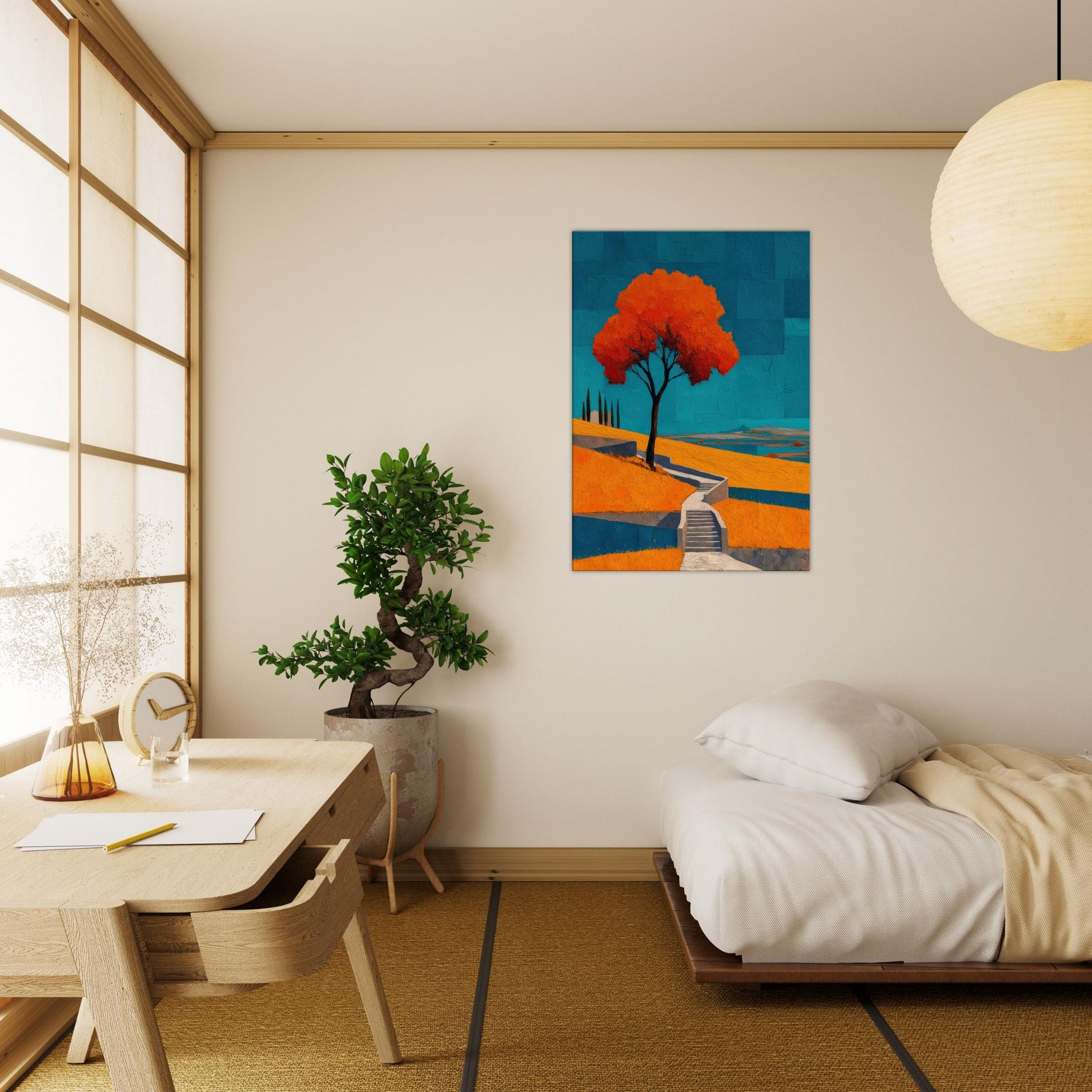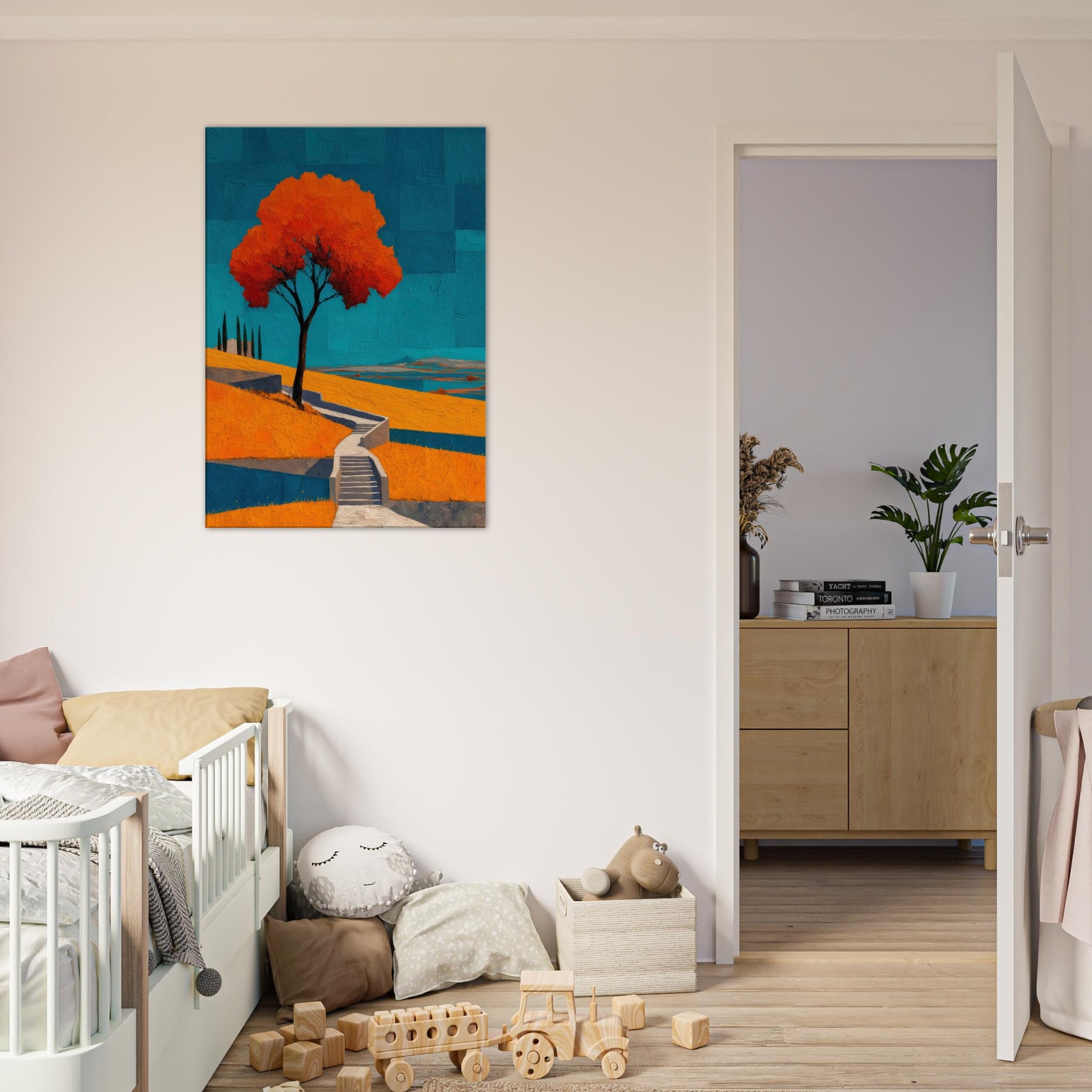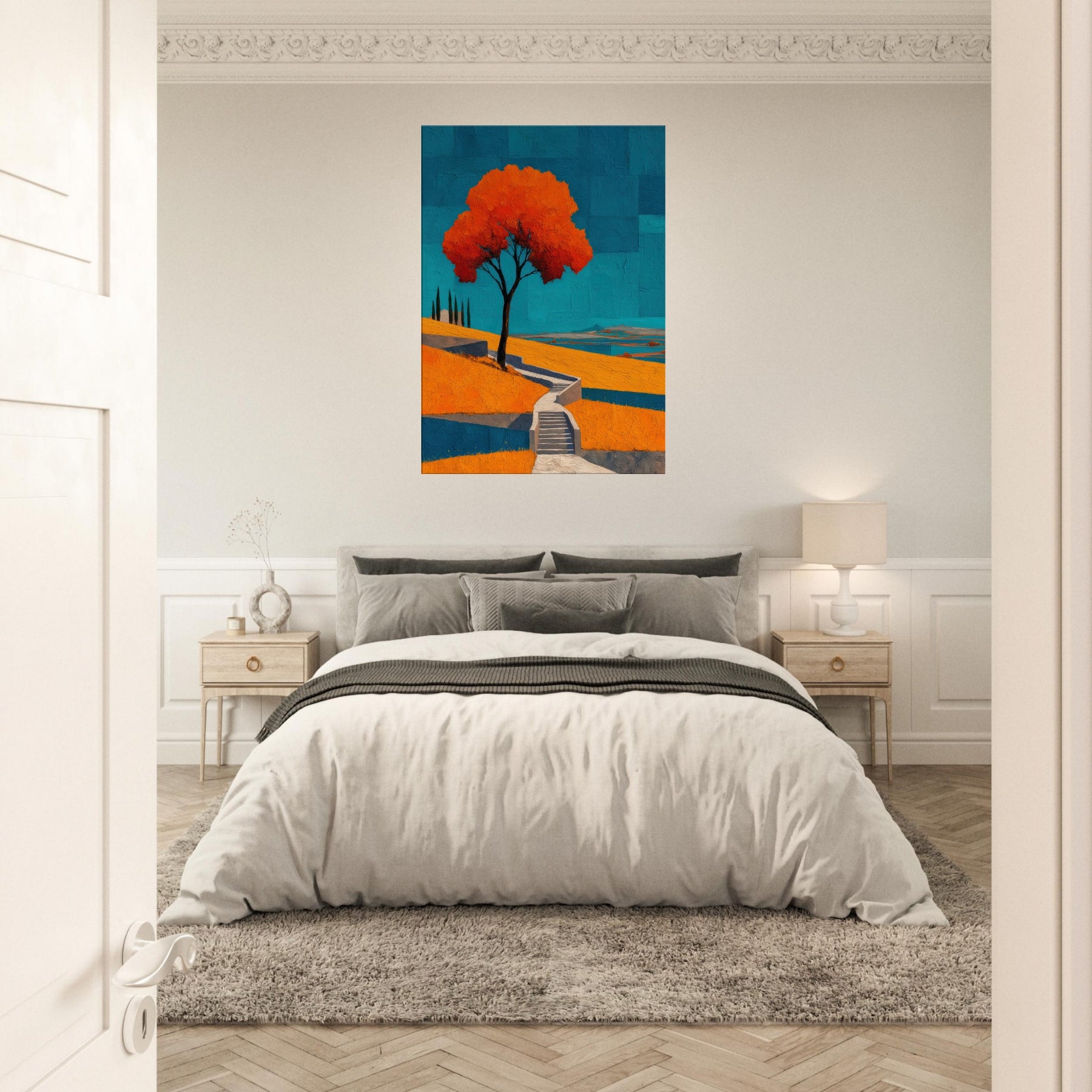 An abstract vineyard scene unfurls in bold, sun warmed color. A solitary tree glows orange against a cobalt sky, while terraced hills cascade with warm yellows and cool blues. The painting hums with energy and quiet, like a late afternoon walk among vines, the air tasting of sun baked earth. Hung in a living room, it becomes a luminous anchor, inviting conversation and calm, and turning walls into a horizon where nature's rhythm travels from the outdoors into your everyday space.