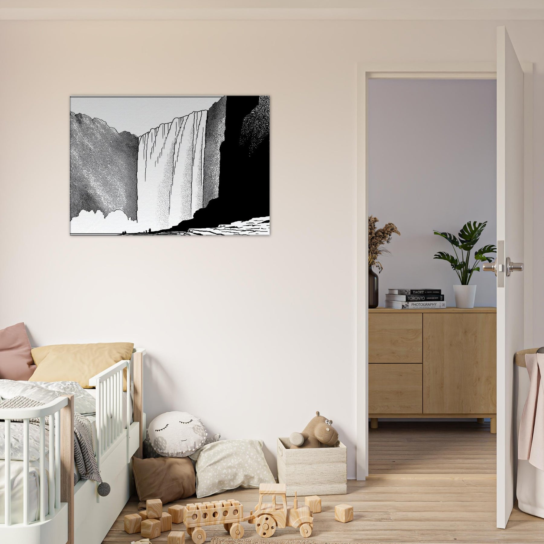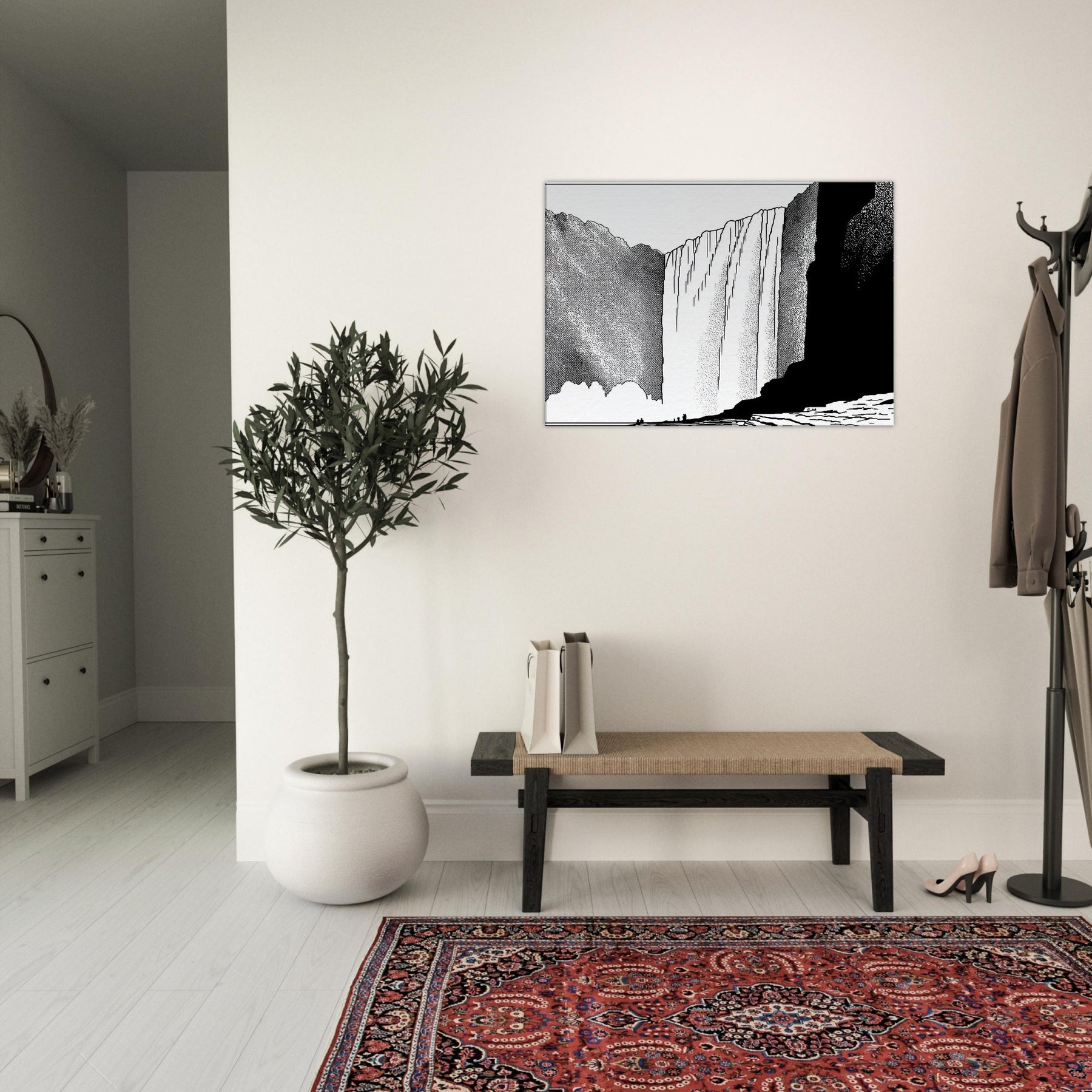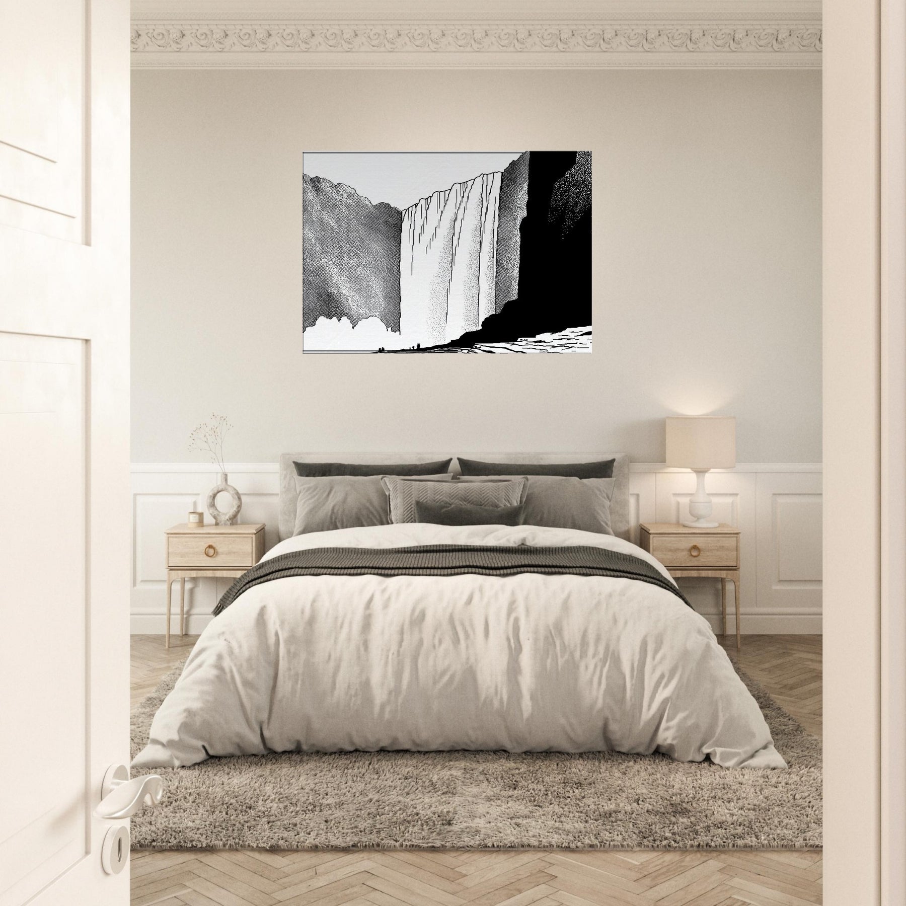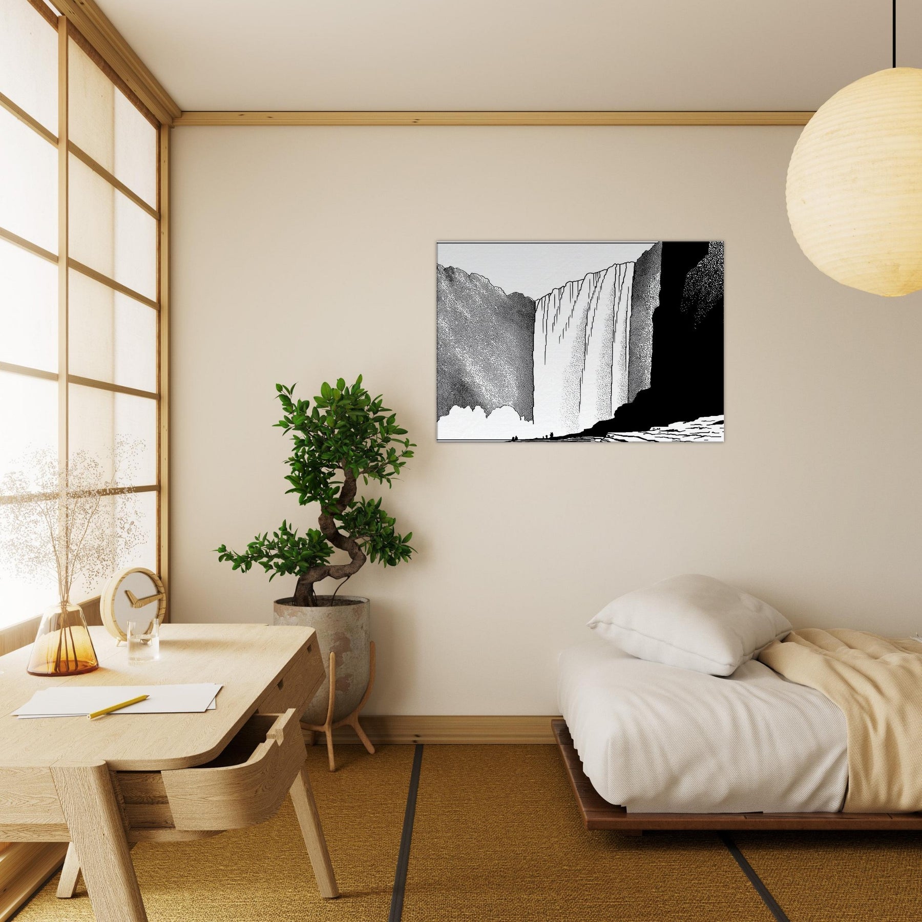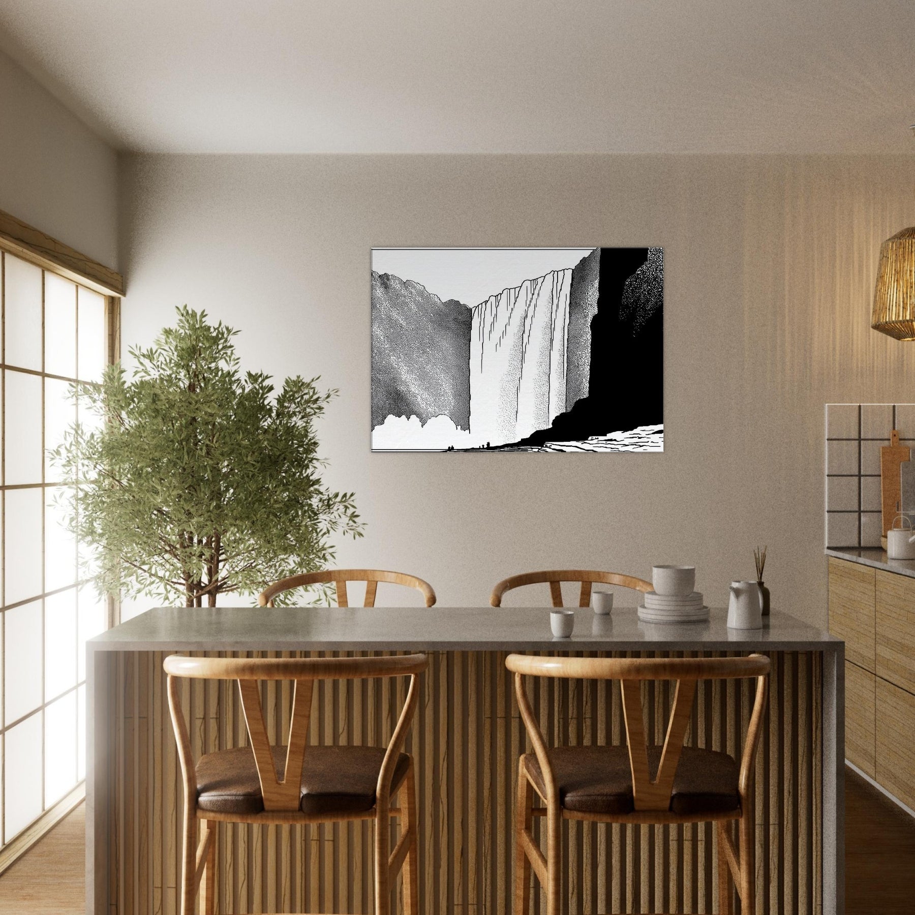 In this minimalist line drawing, a Waterfall becomes a quiet dialogue between motion and stillness. The bold contours carve memory into the air, while delicate stipples suggest mist and distance. The scene invites a breathing pause: cool, damp air imagined on the skin, the sound of water imagined in your room, a subtle hush that amplifies daylight or twilight. Placed in a living room or hallway, this monochrome Waterfall transforms walls into a serene graphic, refined yet alive, perfect for modern, contemplative spaces.