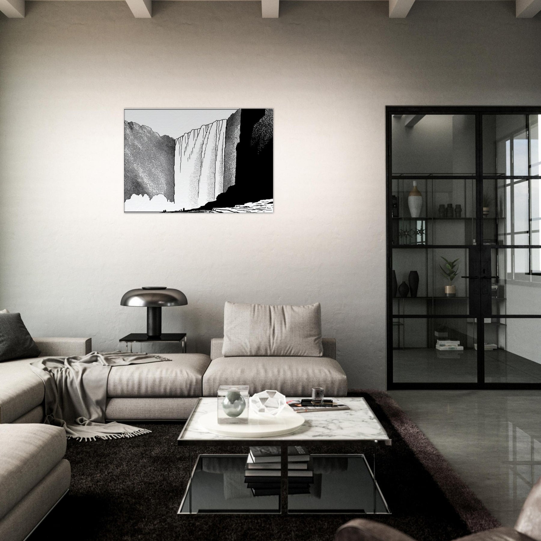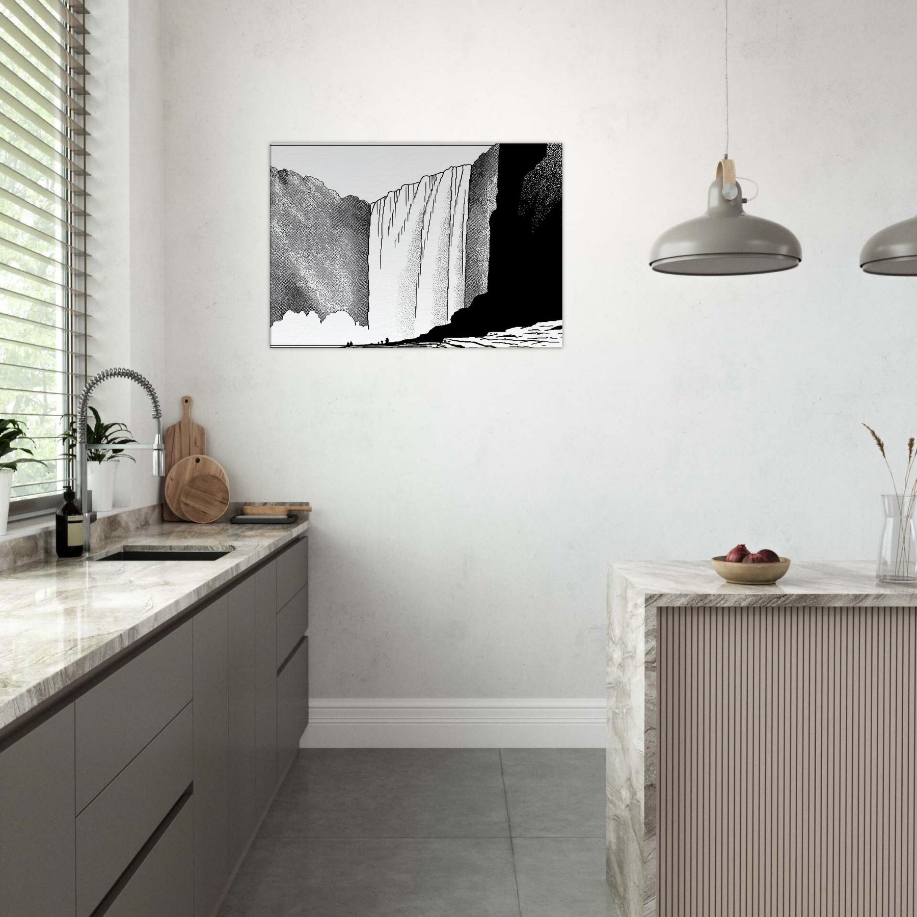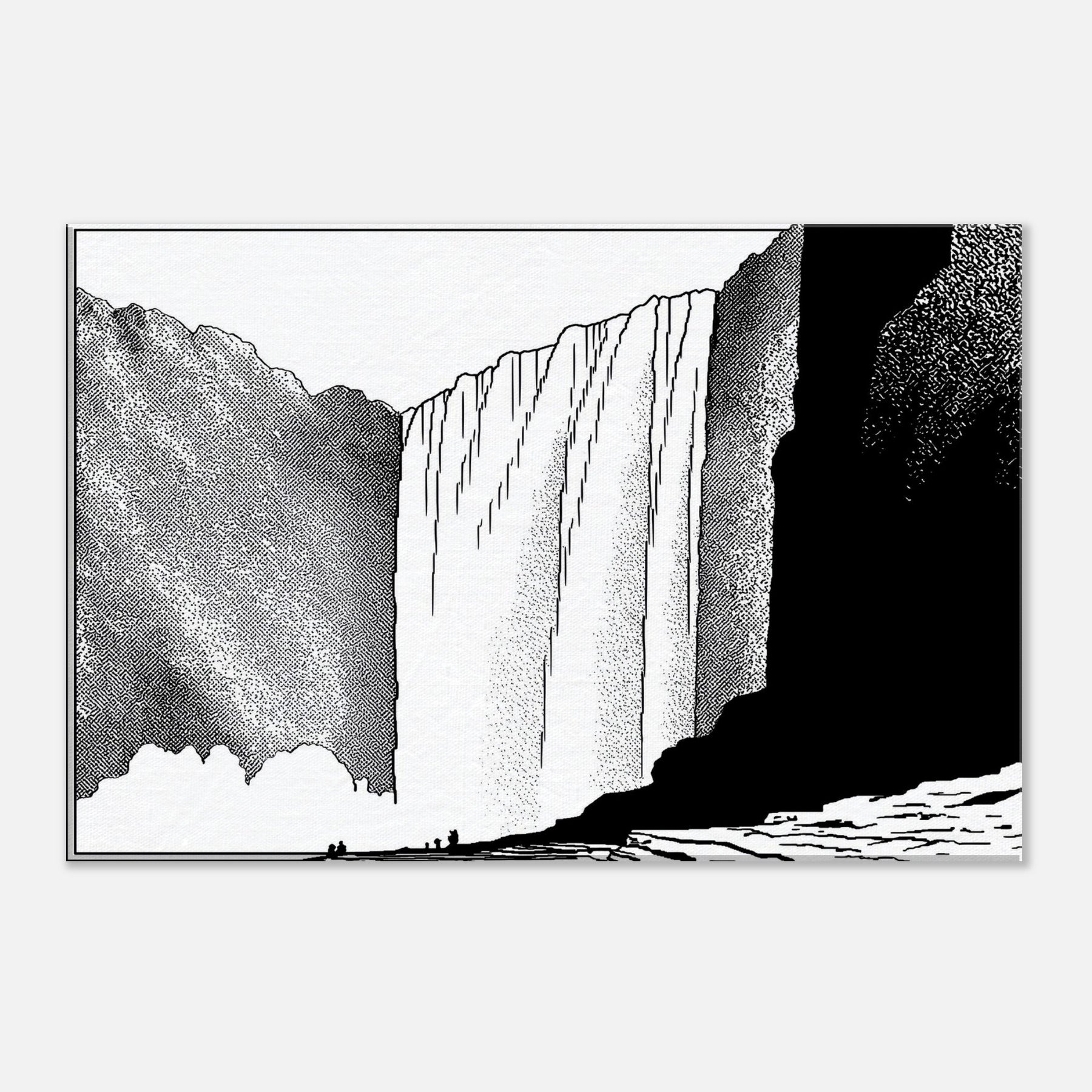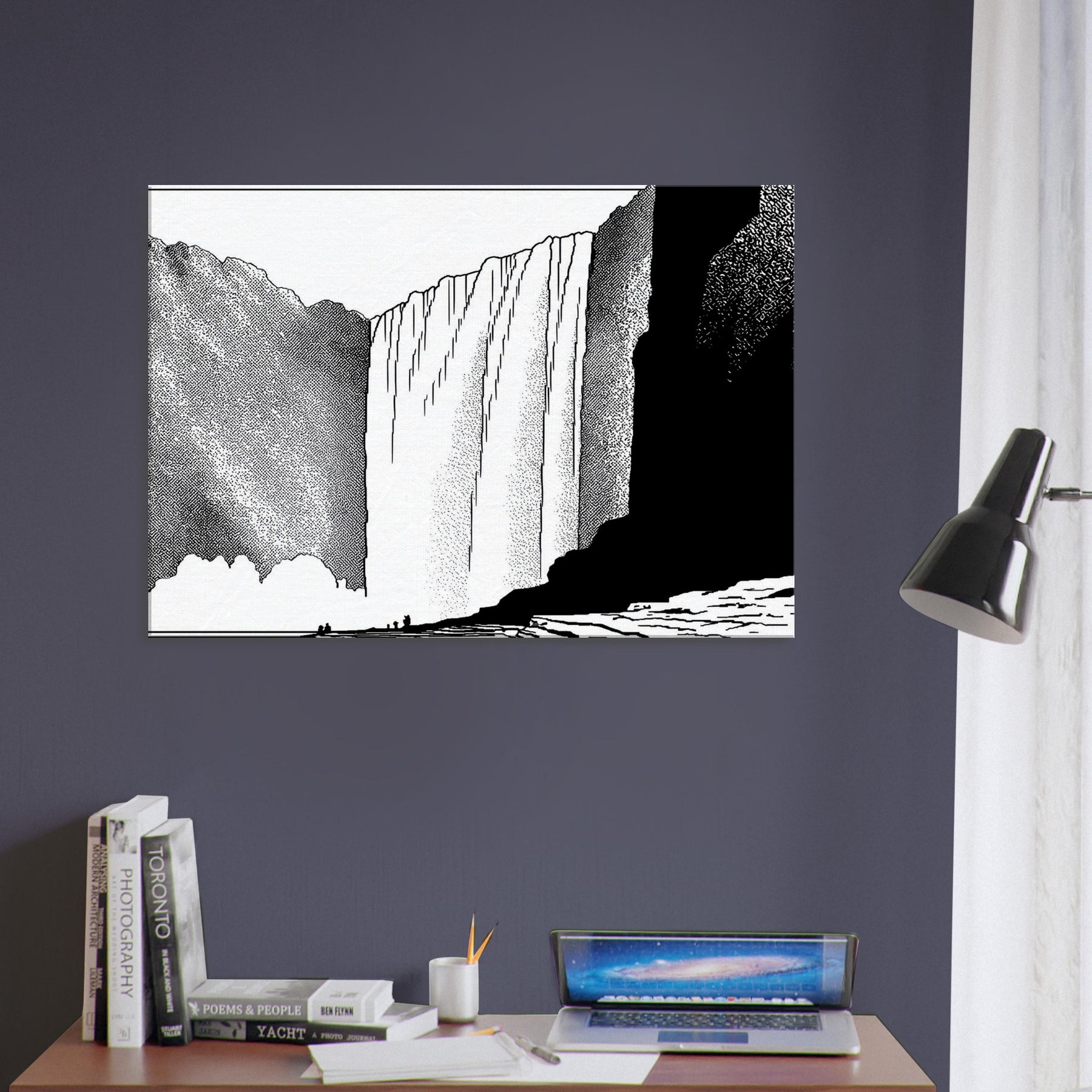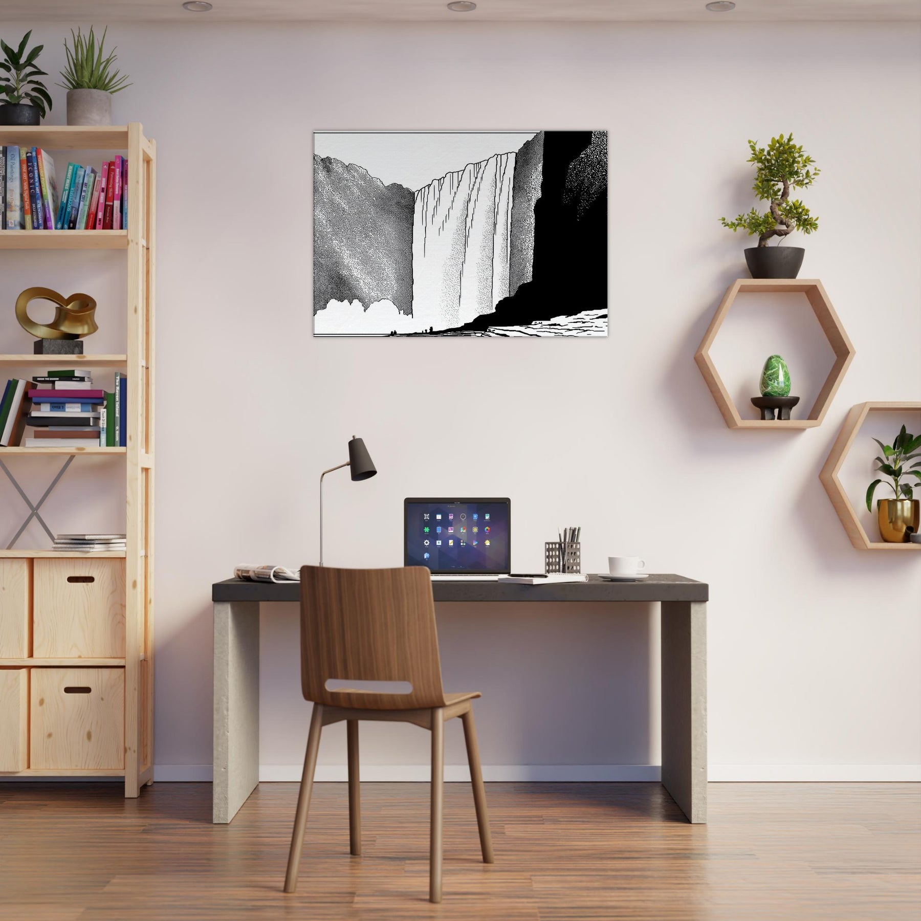 In this minimalist line drawing, a Waterfall becomes a quiet dialogue between motion and stillness. The bold contours carve memory into the air, while delicate stipples suggest mist and distance. The scene invites a breathing pause: cool, damp air imagined on the skin, the sound of water imagined in your room, a subtle hush that amplifies daylight or twilight. Placed in a living room or hallway, this monochrome Waterfall transforms walls into a serene graphic, refined yet alive, perfect for modern, contemplative spaces.