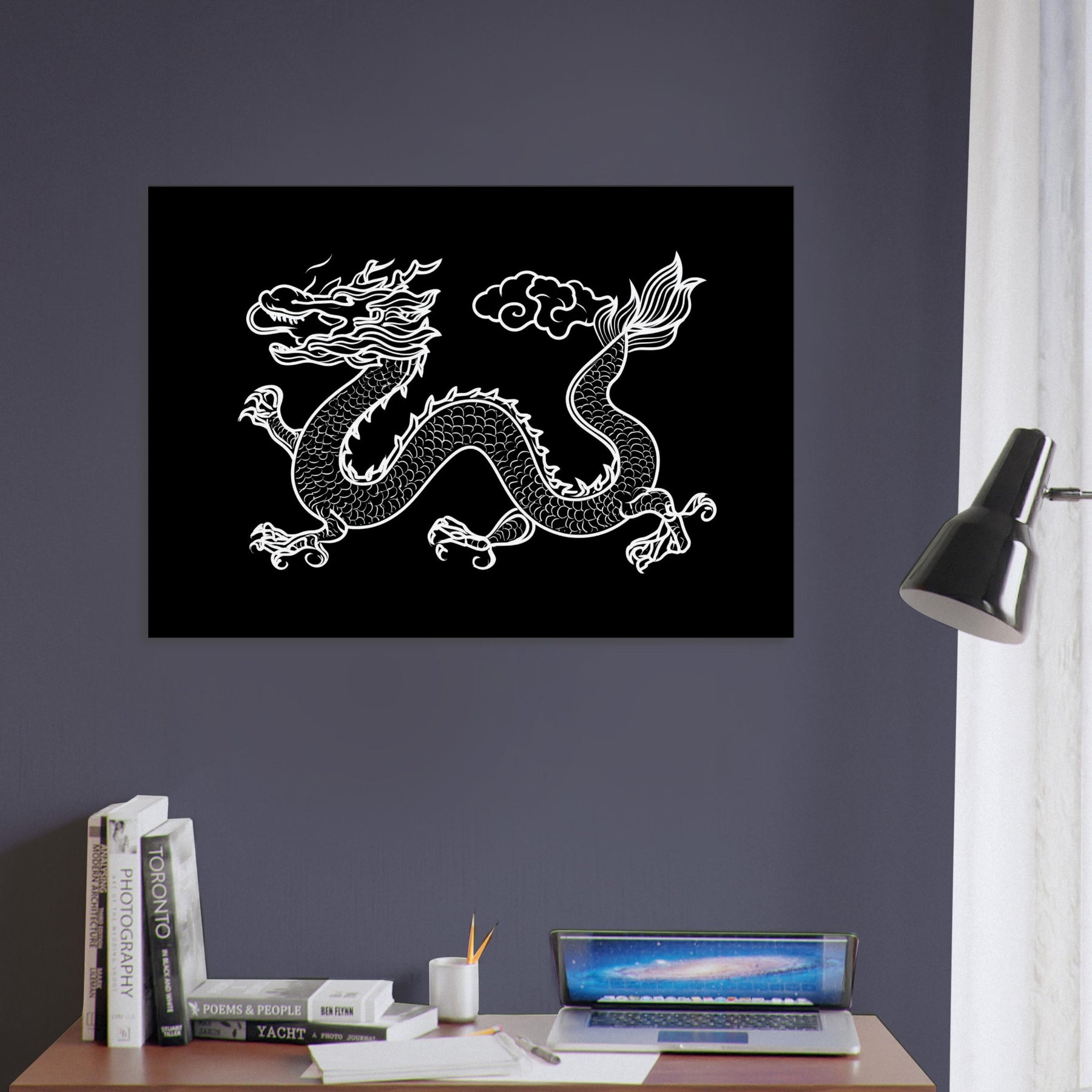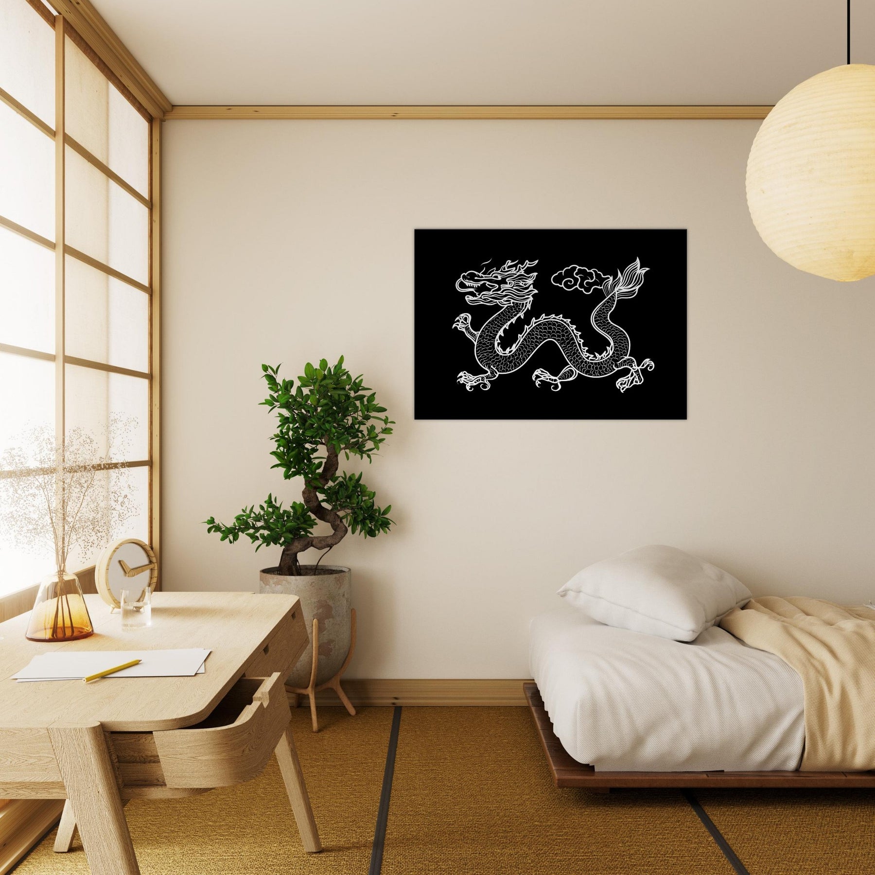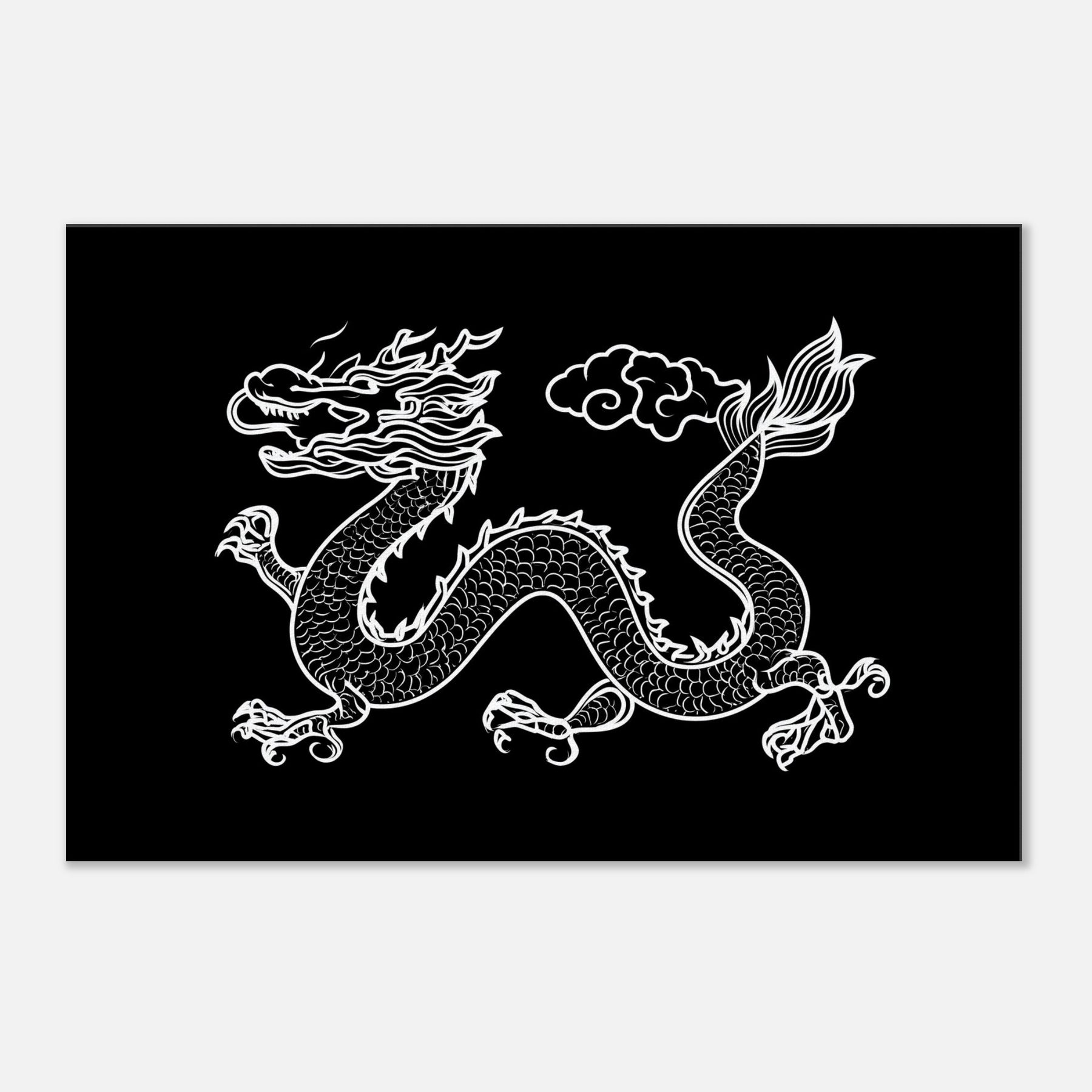 Ancient Chinese Dragon coils across the page in a sinuous, inked line that feels both ancient and alive. The dragon's scales ripple in a white on black rhythm, its head crowned with wind tossed flames and a gaze that seems to sweep a quiet room with wonder. This mythical creature evokes ritual calm and fierce majesty, turning your living space into a gallery of legend. Place it where light can trace every curve, and let the Ancient Chinese Dragon invite reflection, courage, and timeless magic.