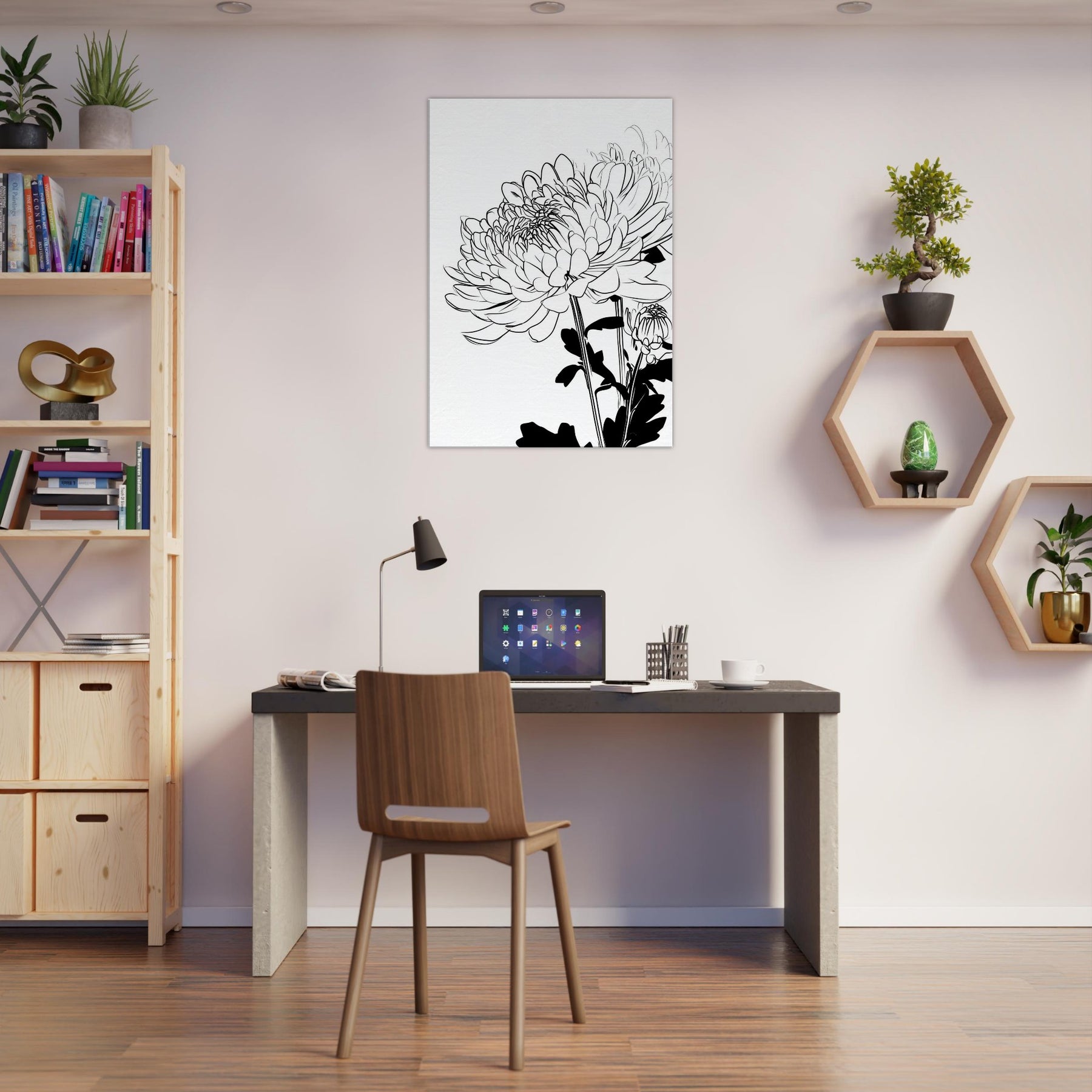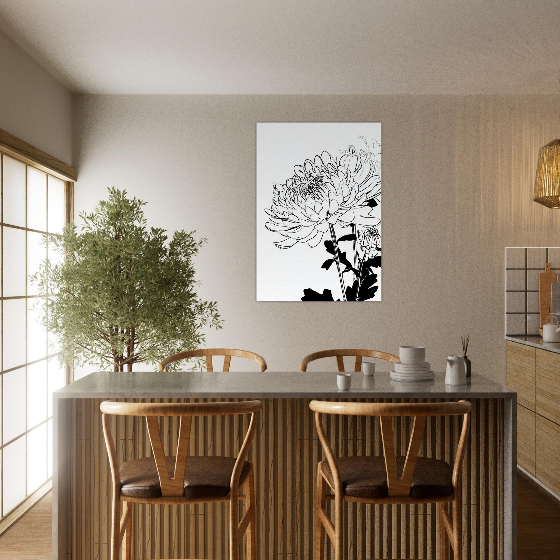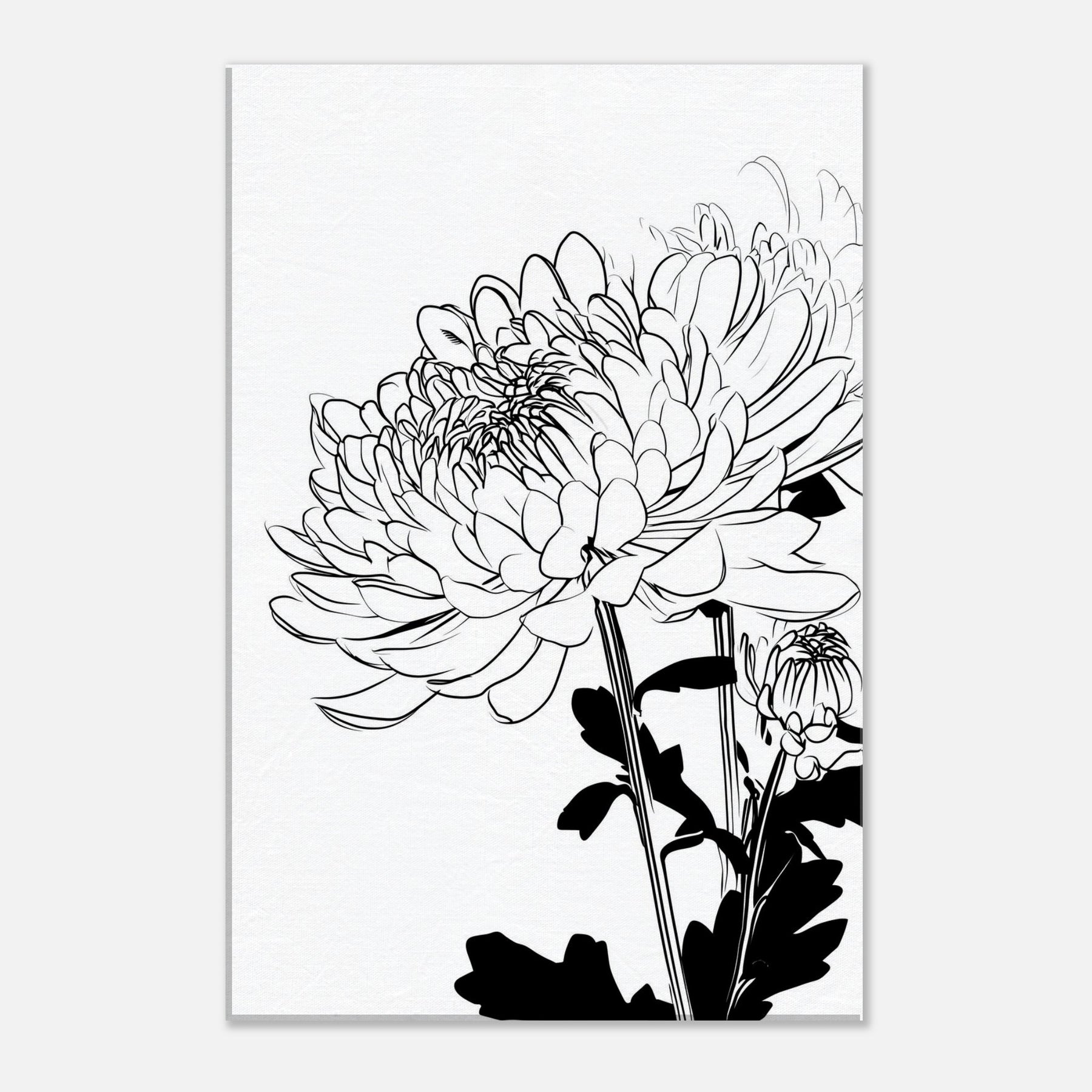 Chrysanthemum flourishes in clean, continuous lines that feel both delicate and confident. This line art captures the flower's rhythm in stark black and white, inviting the eye to linger on the lacework of petals and the sculptural stems. Hung in a sunlit hallway or above a sofa, it creates a serene focal point, airiness, and a touch of botanical poetry. The piece pairs effortlessly with neutral palettes, adding quiet texture and a modern, nature inspired mood to your living space.