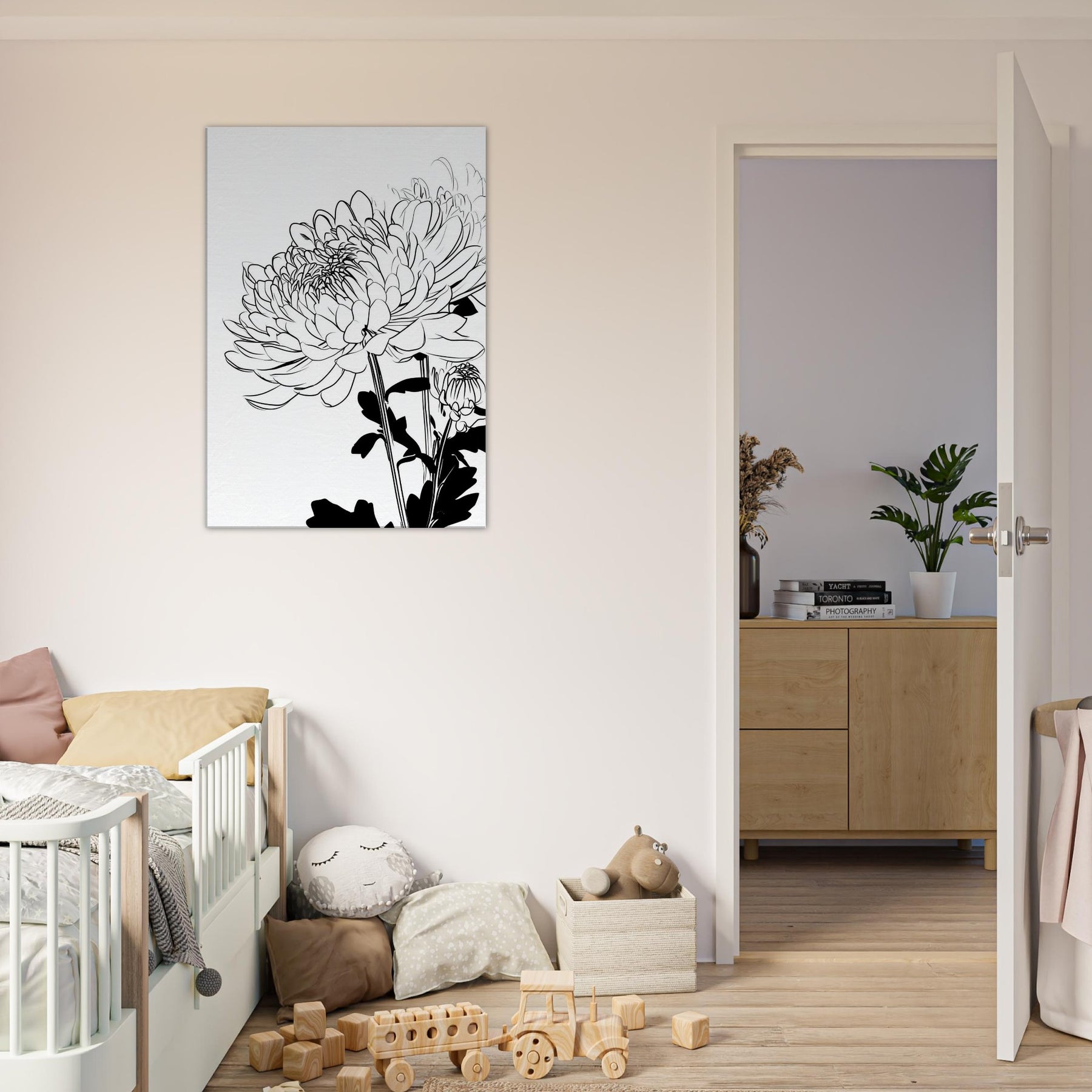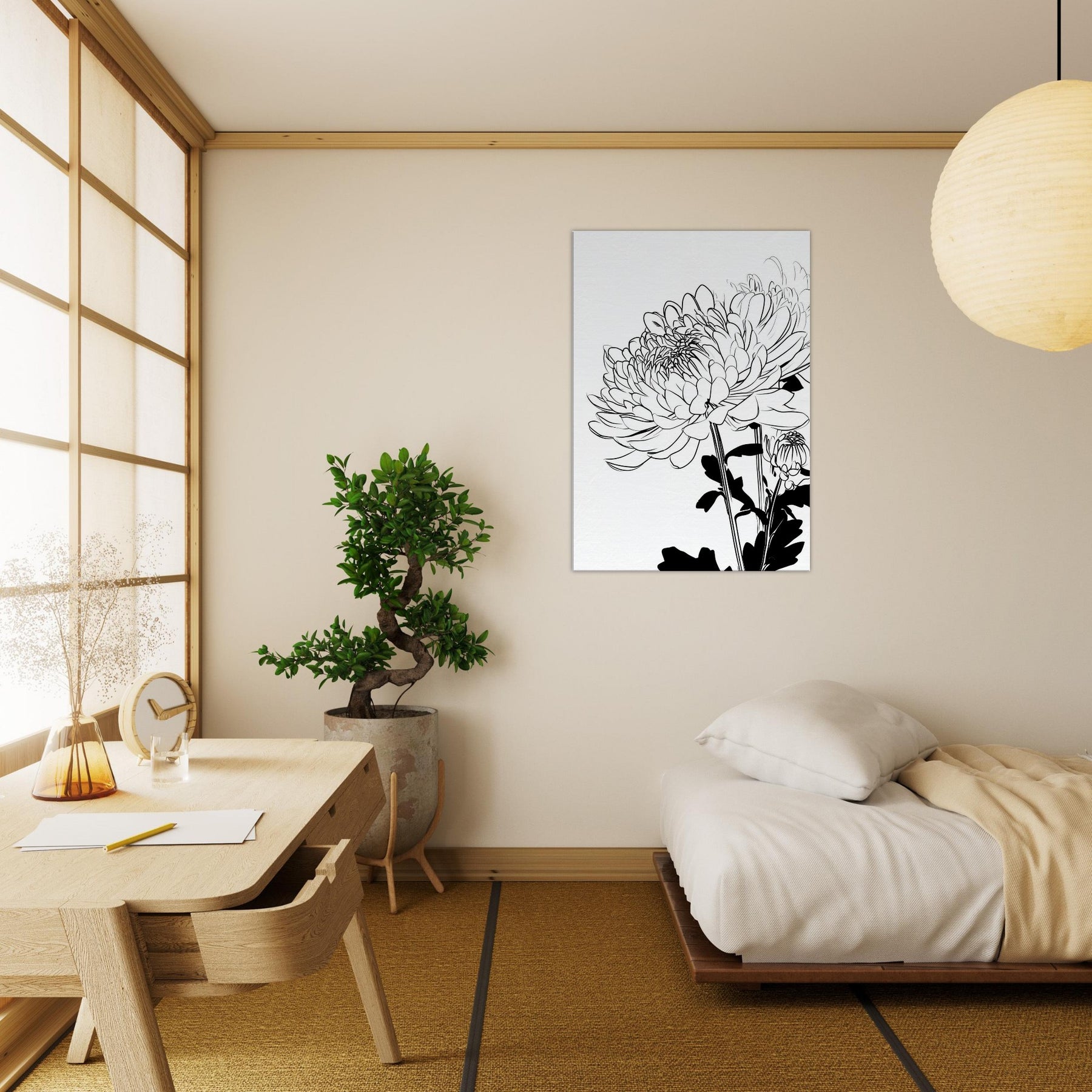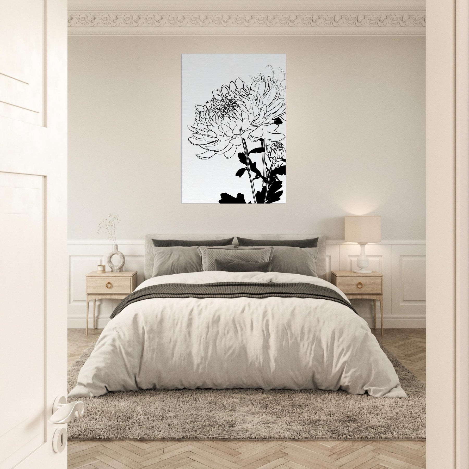 Chrysanthemum flourishes in clean, continuous lines that feel both delicate and confident. This line art captures the flower's rhythm in stark black and white, inviting the eye to linger on the lacework of petals and the sculptural stems. Hung in a sunlit hallway or above a sofa, it creates a serene focal point, airiness, and a touch of botanical poetry. The piece pairs effortlessly with neutral palettes, adding quiet texture and a modern, nature inspired mood to your living space.