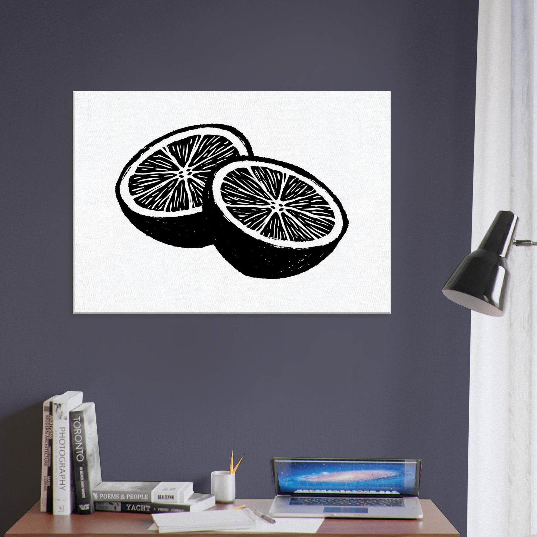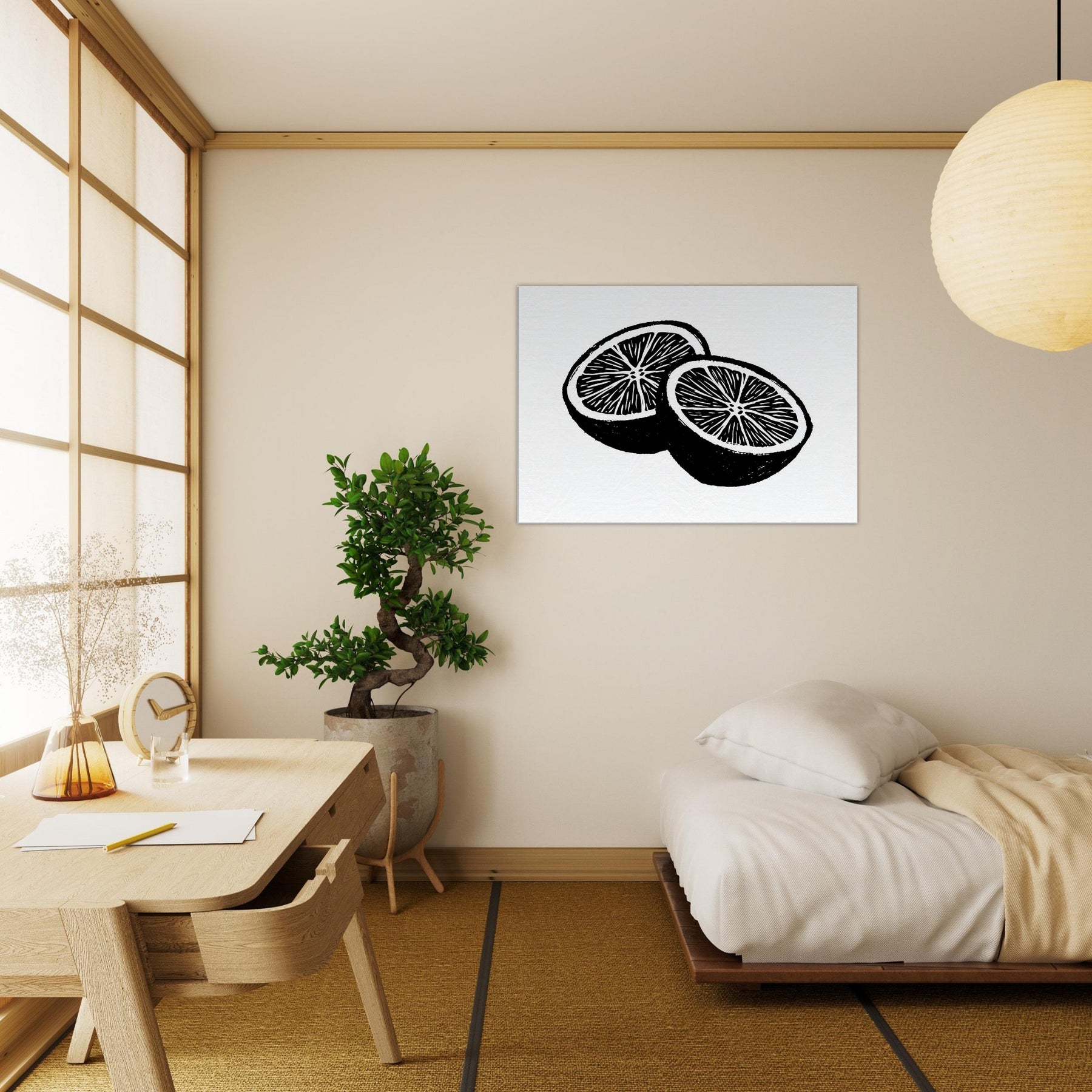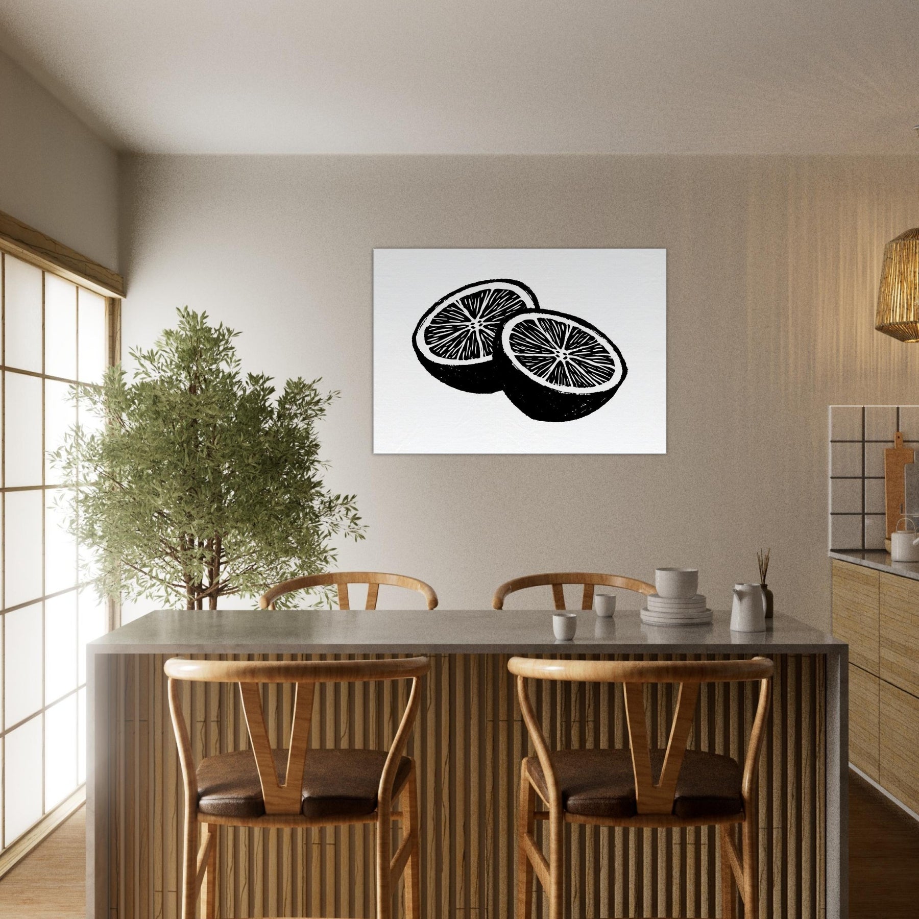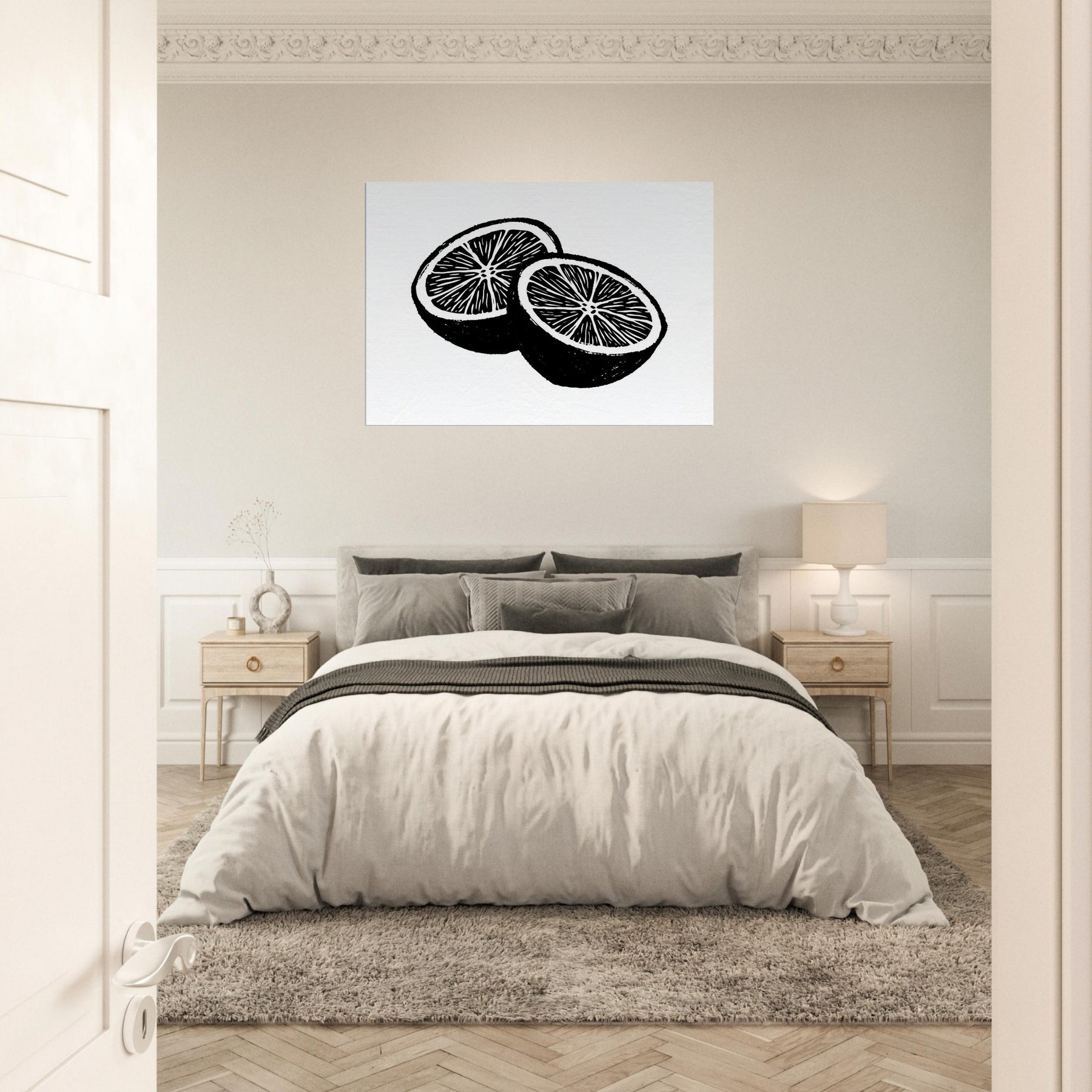 Citrus Halves invites a breath of crisp clarity into any space. This bold line art composition traces the inner radii of citrus in monochrome, turning ordinary kitchen and living areas into a sunlit still life. The graphic contrast and clean curves evoke morning light and a gentle zest, encouraging calm focus in a hallway nook or above a sofa. With its uncluttered presence, Citrus Halves elevates textures and color accents while preserving a serene, contemporary atmosphere.