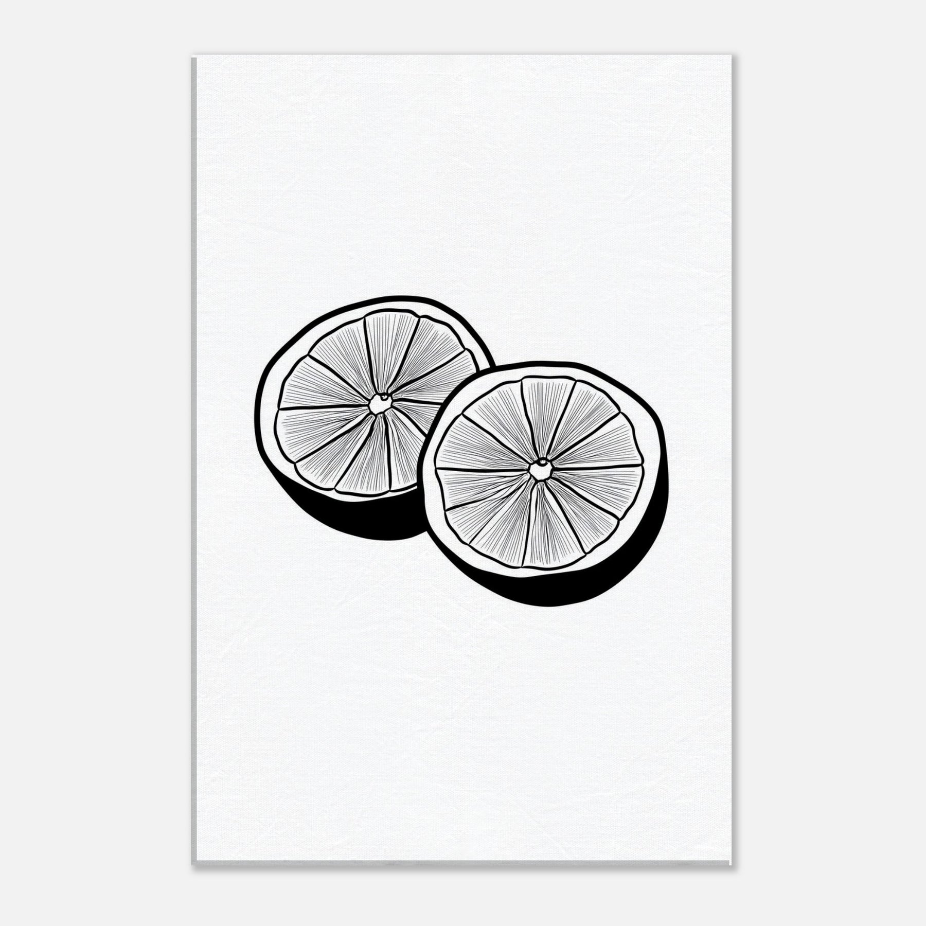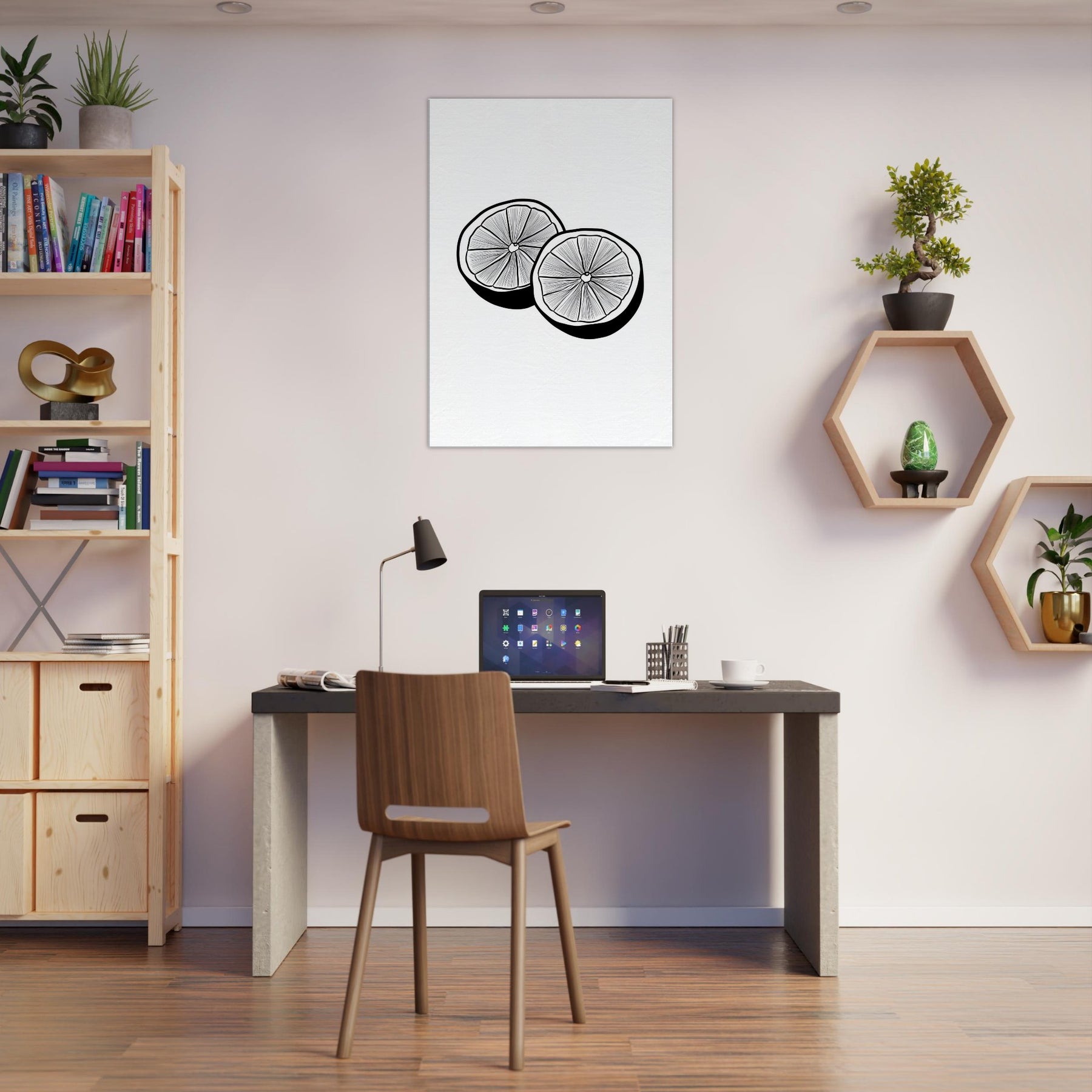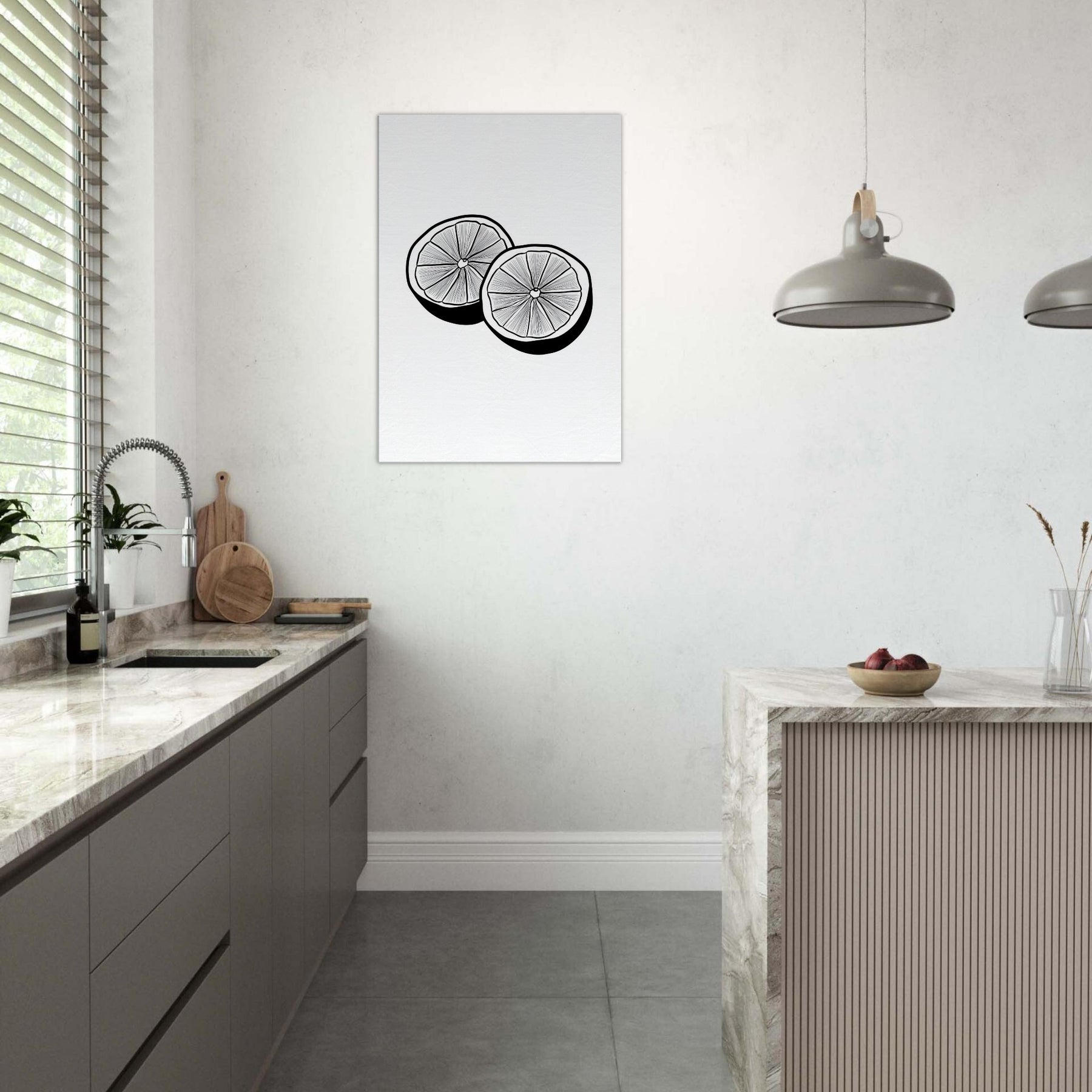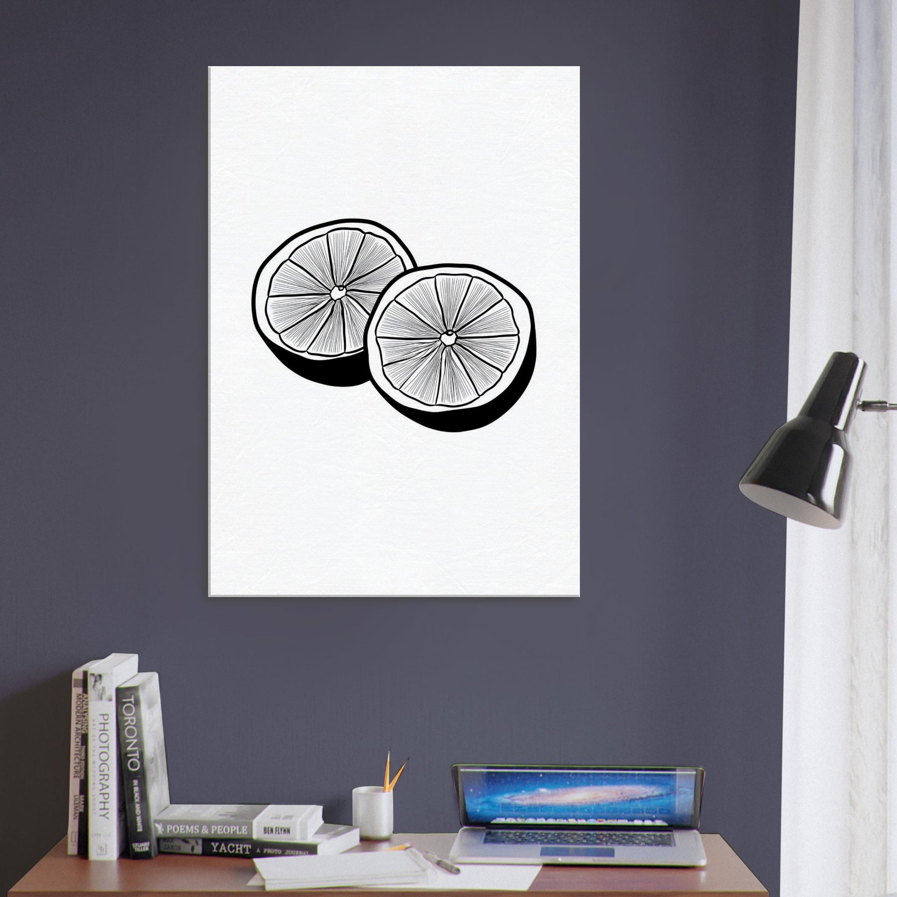 Mature in its simplicity, these citrus halves are drawn with confident line work that feels both playful and serene. The bold outlines ground a light, luminous interior, giving the room a sense of sun drenched clarity. Hang this piece where mornings begin or evenings unwind, and watch the space soften into a fresh, citrus bright atmosphere. It pairs effortlessly with neutral palettes and natural textures, elevating a kitchen, dining nook, or living area with a subtle, graphic energy that invites breath and balance.