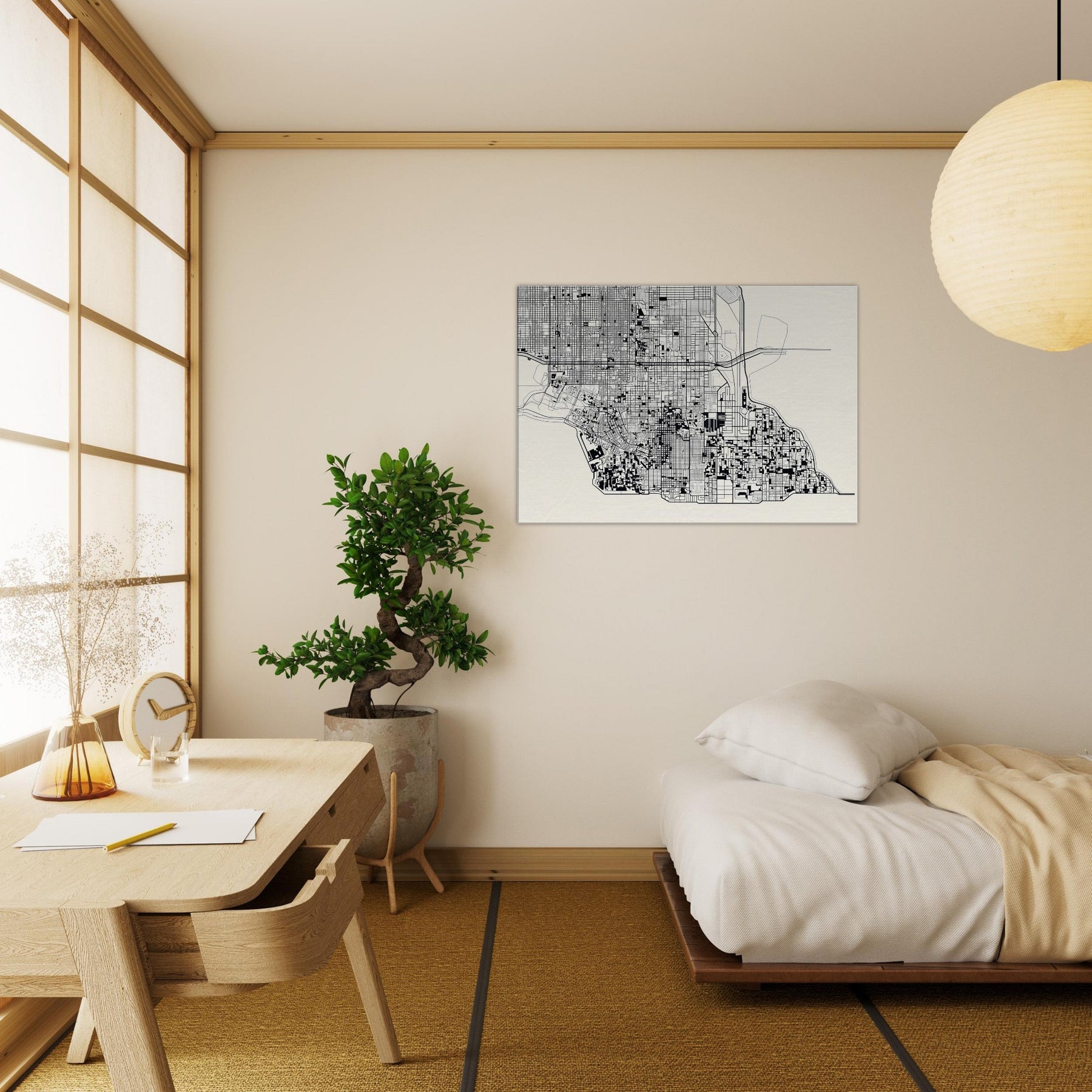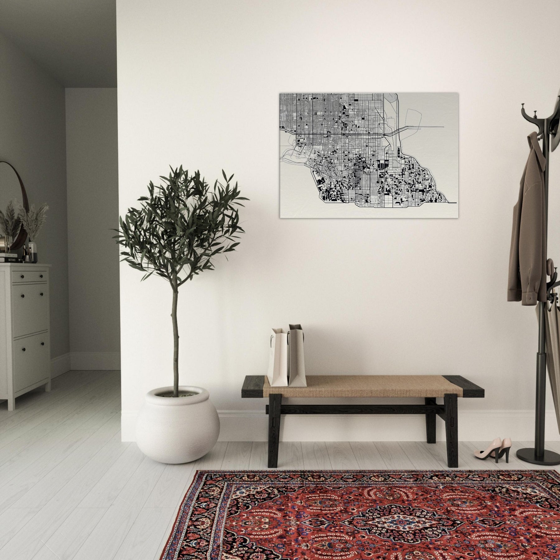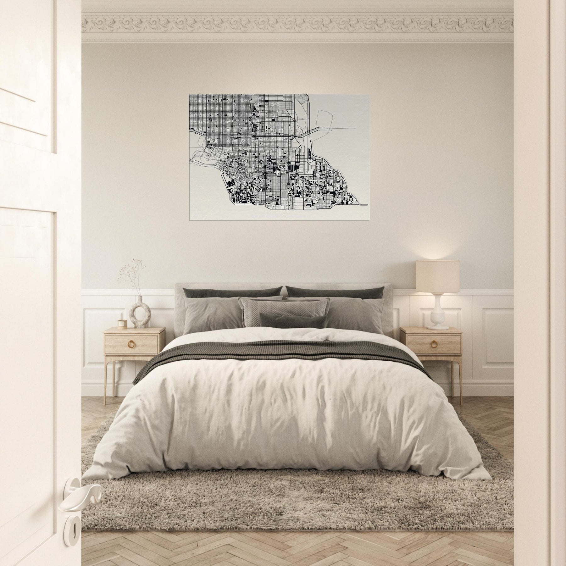Immerse your space in the precision and poetry of a Minimal City Map rendered in delicate line art. The map's clean network of streets and blocks invites quiet contemplation, turning a wall into a memory of place. Its black on cream simplicity enhances daylight or lamplight, adding a refined anchor to living rooms, bedrooms, or hallways. A subtle urban heartbeat for modern interiors, this piece blends nostalgia with contemporary restraint, making every glance feel like a guided stroll through familiar avenues.