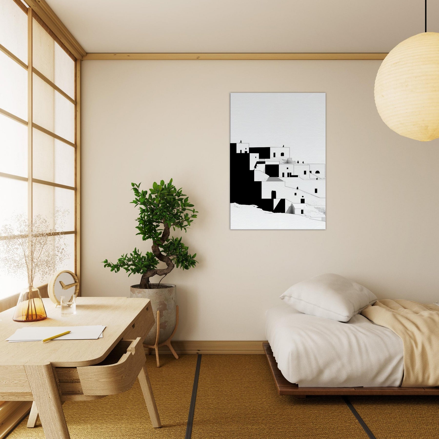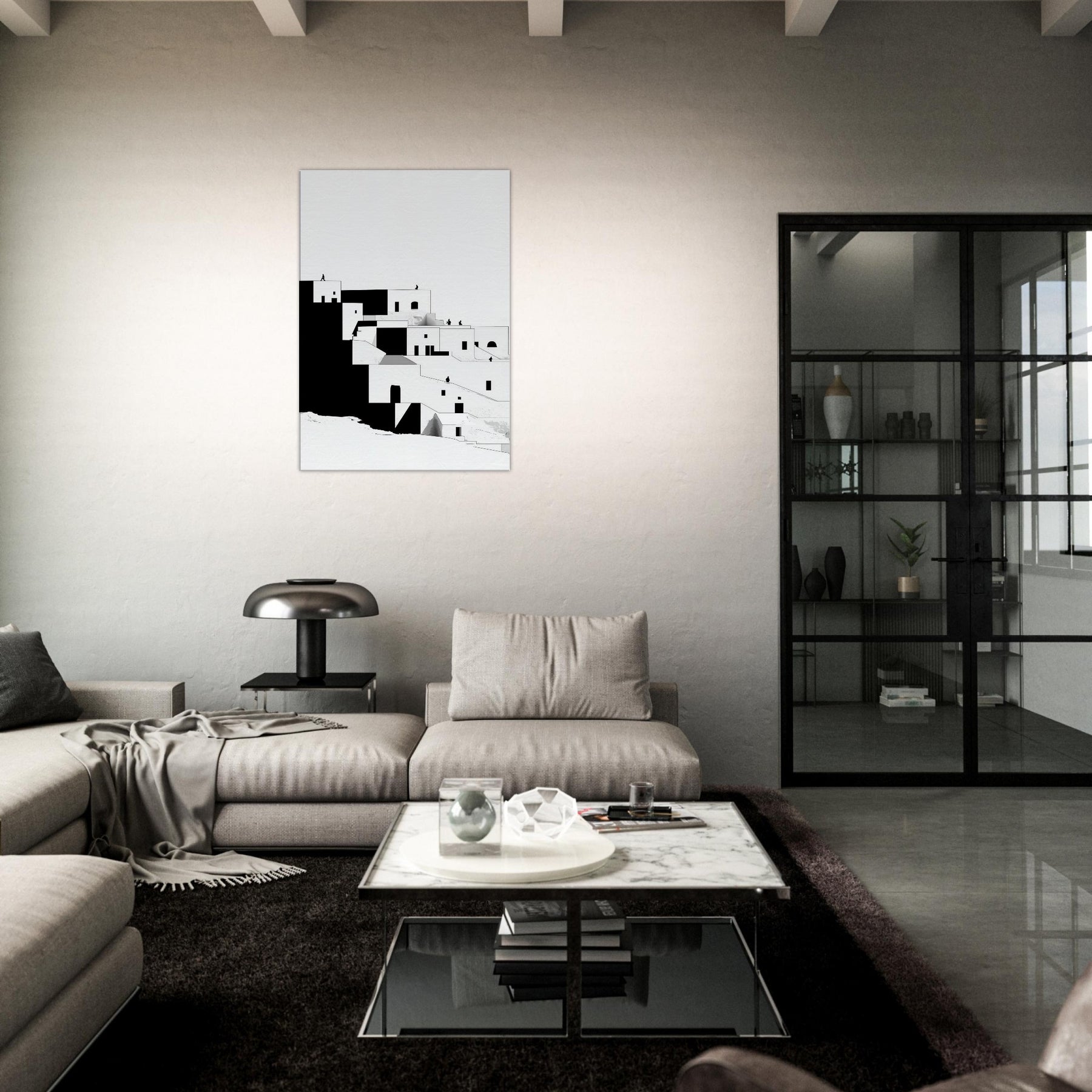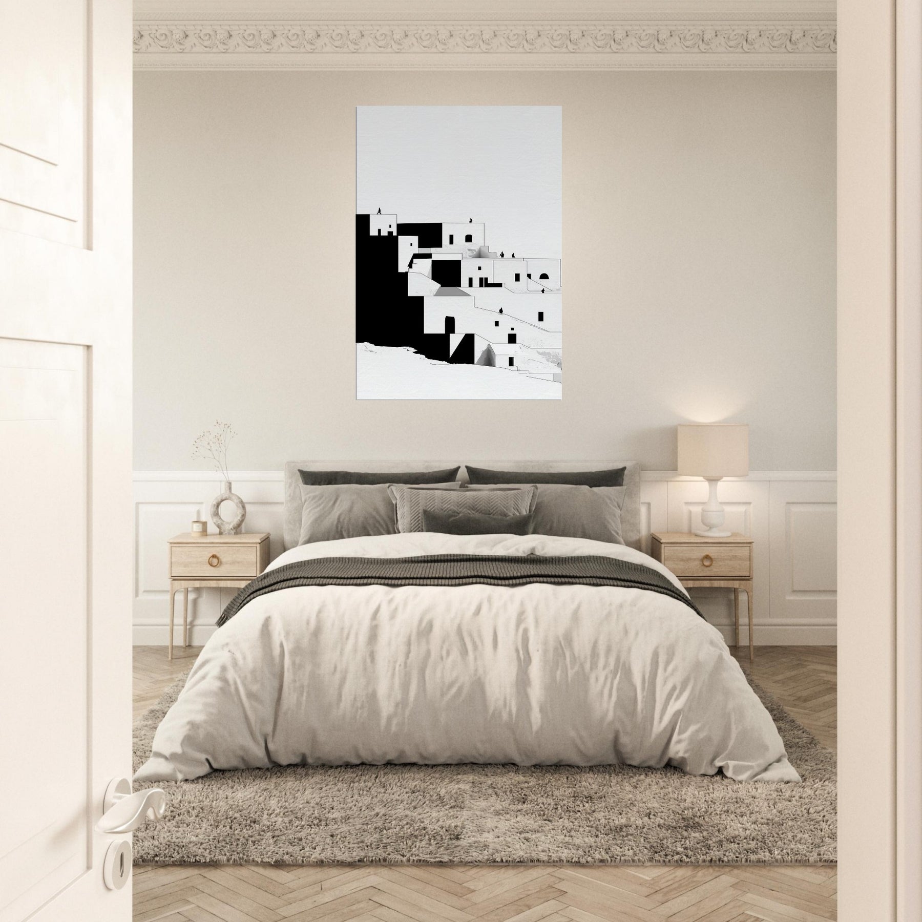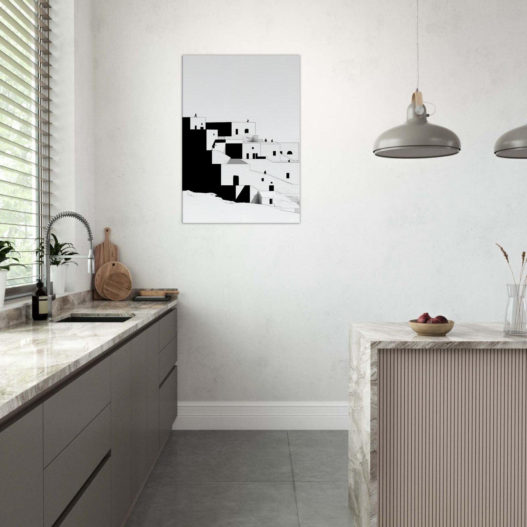 Immerse your space in the quiet majesty of Santorini translated into a lucid, architectural line. This line art rendering strips color to reveal clean planes, gentle terraces, and the cliffside rhythm that defines hillside villages. The result is a calm, magnetic mood that invites daylight to hover along white walls and deep shadows, making a room feel expansive and serene. Perfect over a sofa or entryway, it flows with modern furnishings while whispering travel and memory.