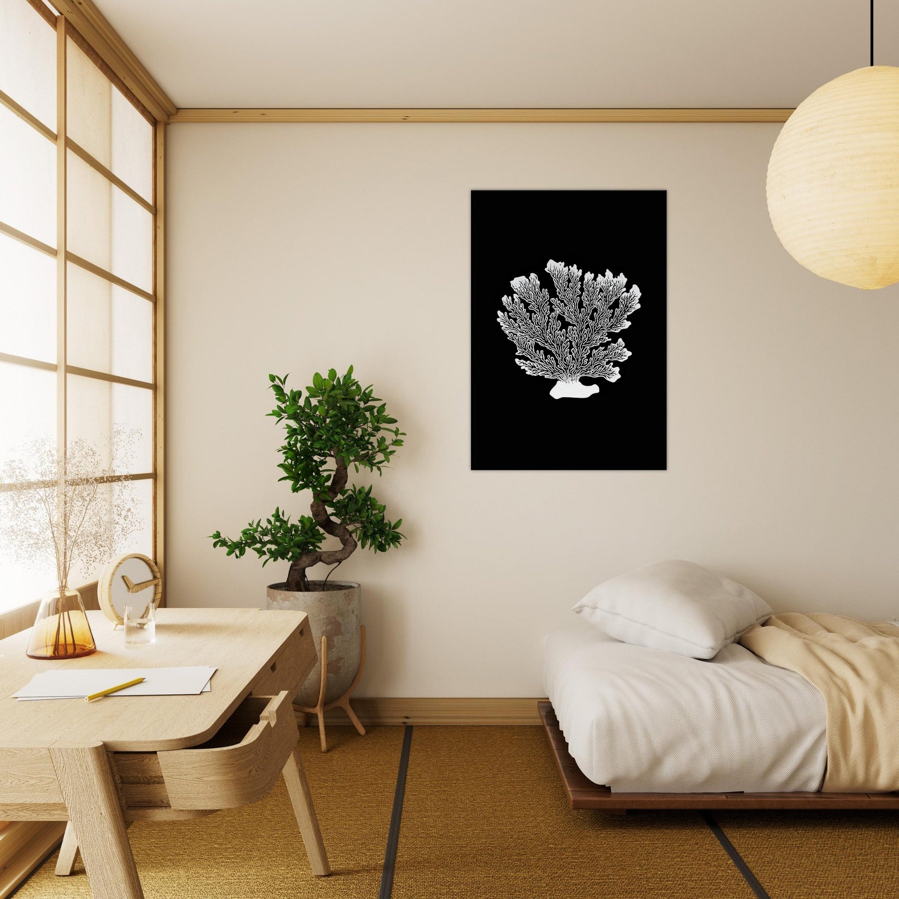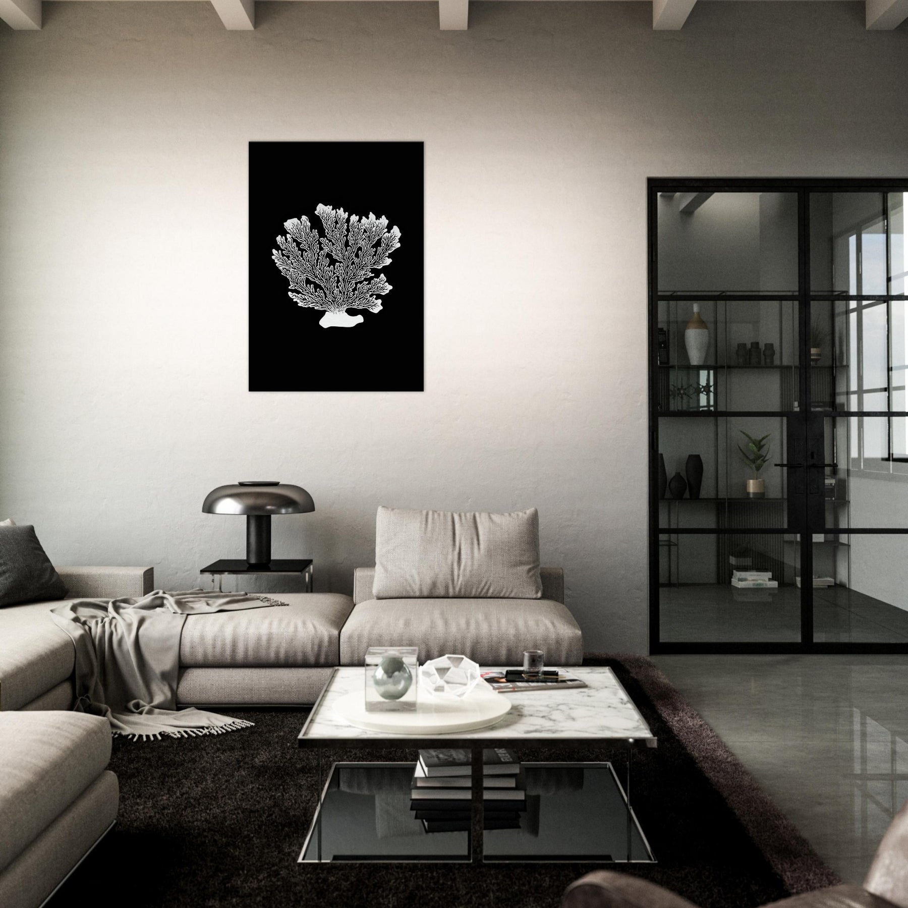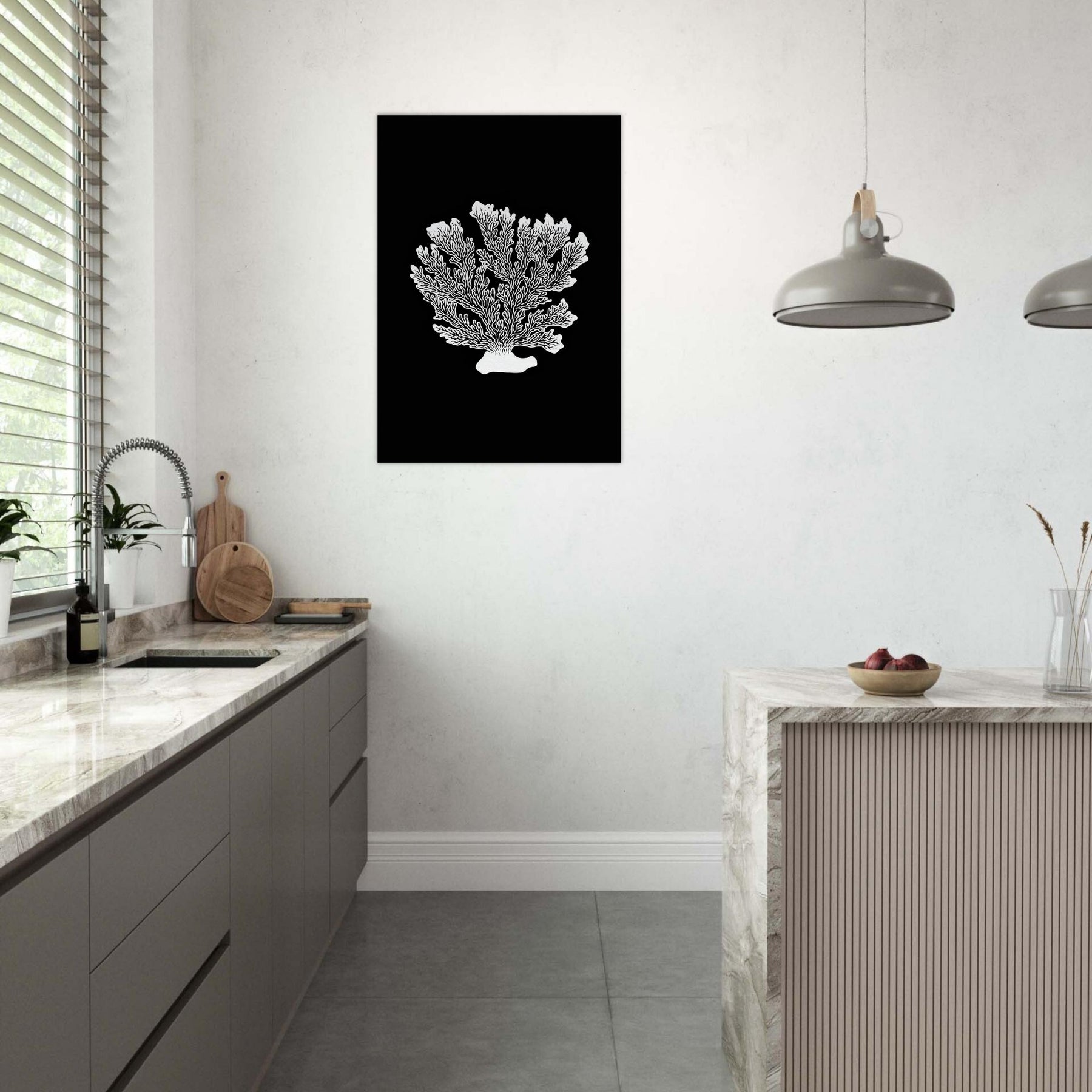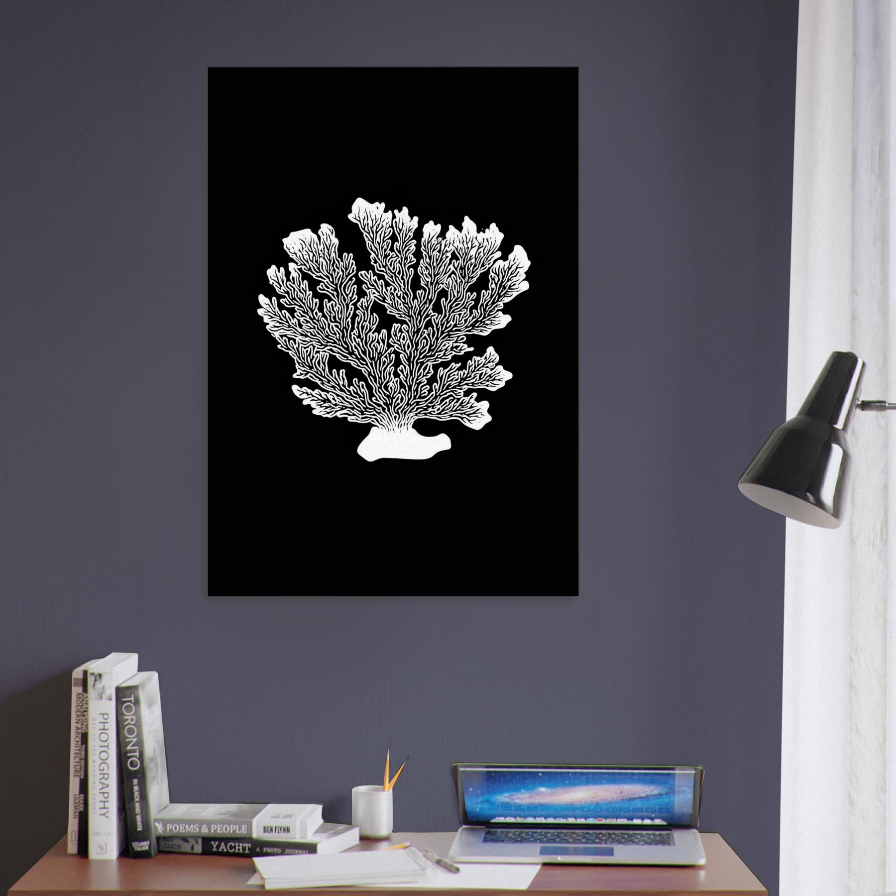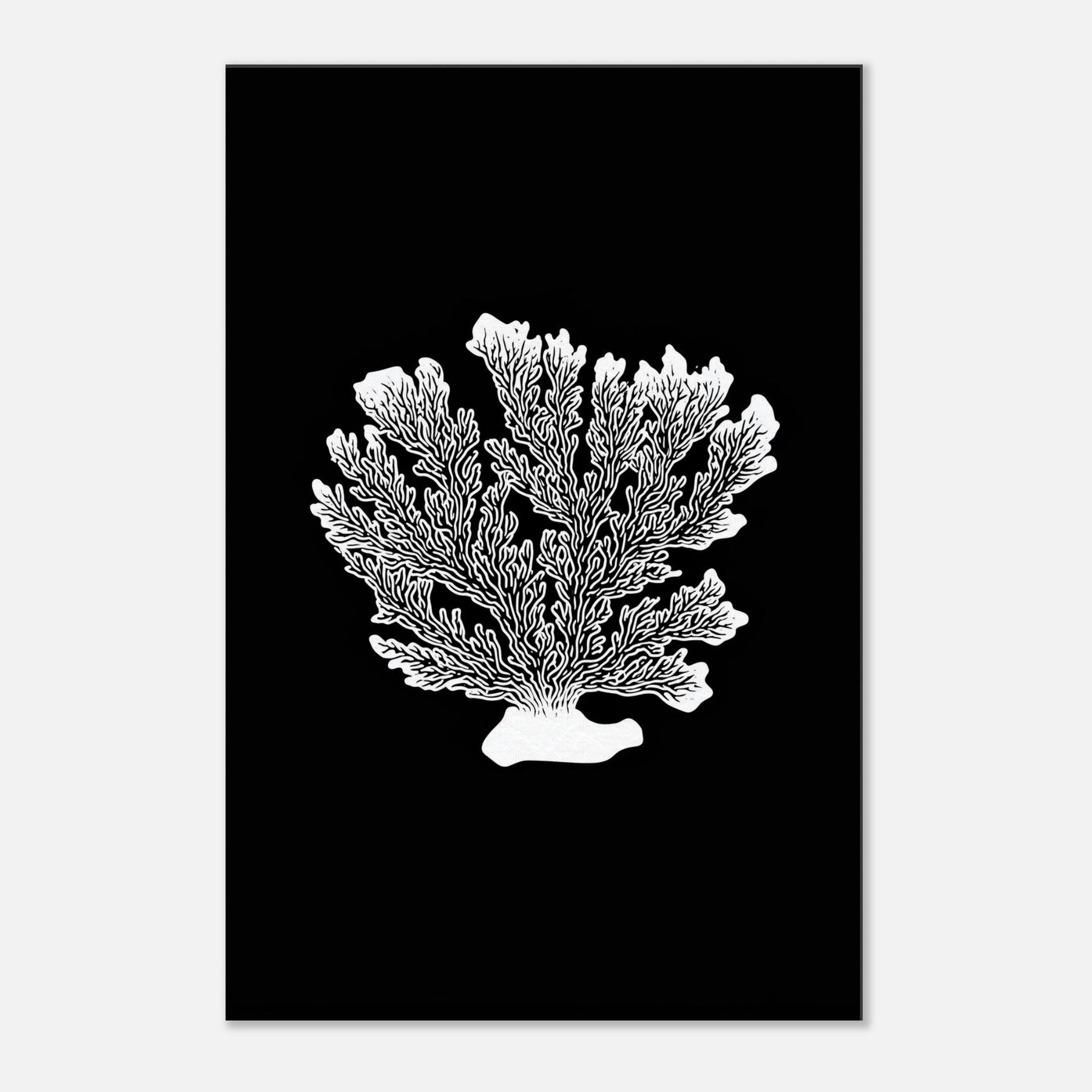 Let Coral take center stage in a room where sea breeze meets quiet design. This line art interpretation renders a delicate coral silhouette in crisp white against obsidian black, creating a sculptural focal point that feels both ancient and contemporary. Its airy branches suggest movement, while the stark contrast adds graphic drama to any wall. Perfect hung above a sofa or bedside, it lends calm, clarity, and a touch of organic elegance to modern living spaces.