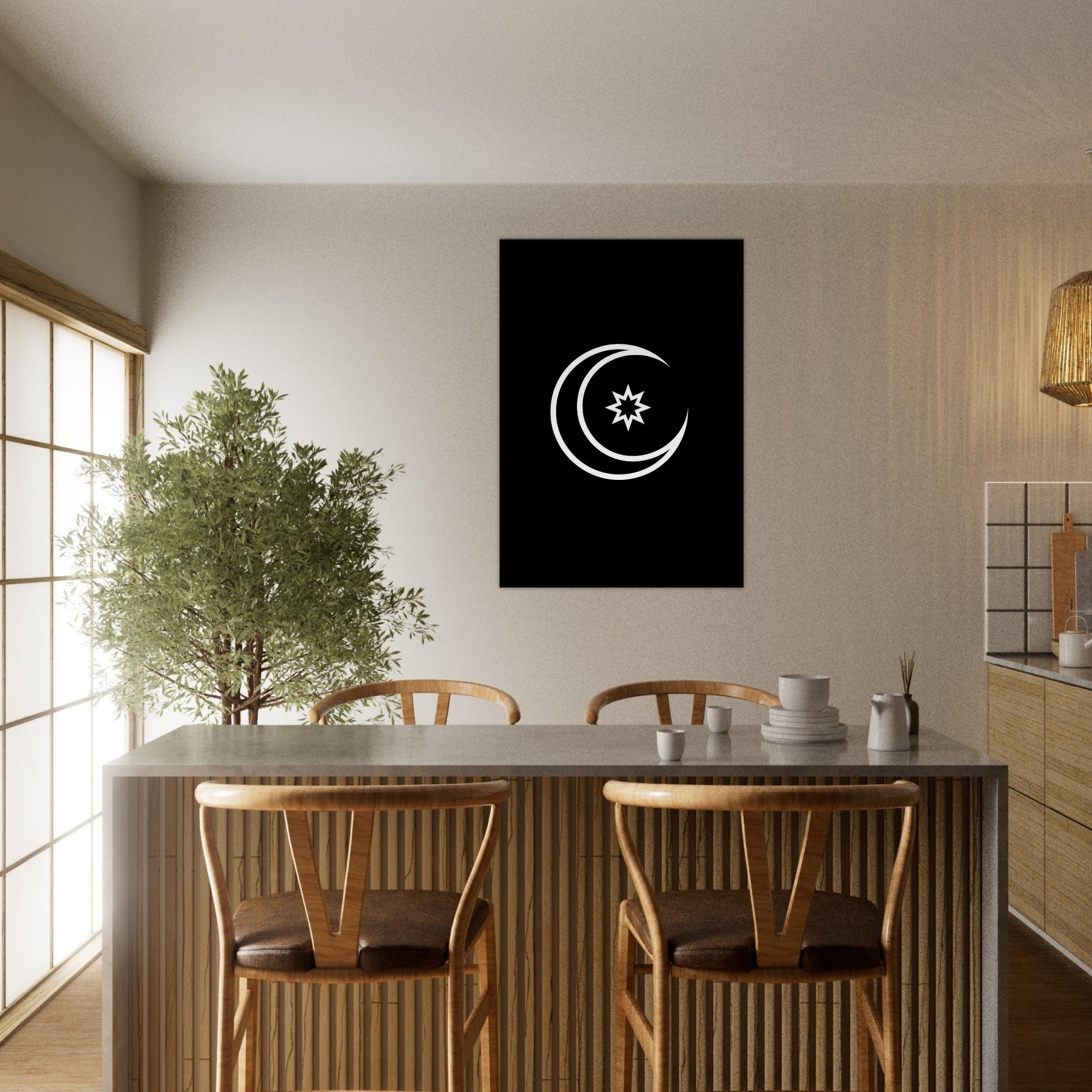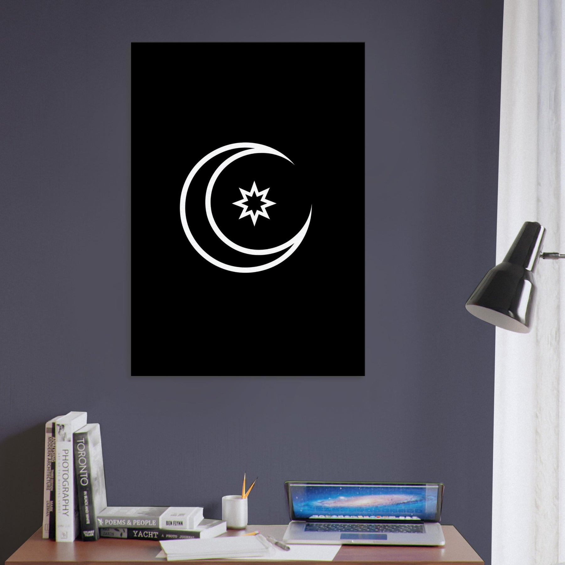 Crescent & Star unfolds in a single, breathlike line, inviting stillness into the room. This minimalist, mystical composition skims the surface of night with clean curves and a glint of ancient symbolism, letting light travel along its contour. Hang it where morning sun, lamp glow, or candlelight can coax its whispers into focus; you're met with calm, subtle motion that expands space and mood. A quiet centerpiece for living rooms, bedrooms, or hallways, it pairs timeless meaning with modern restraint. The central subject is Crescent & Star (Minimal).