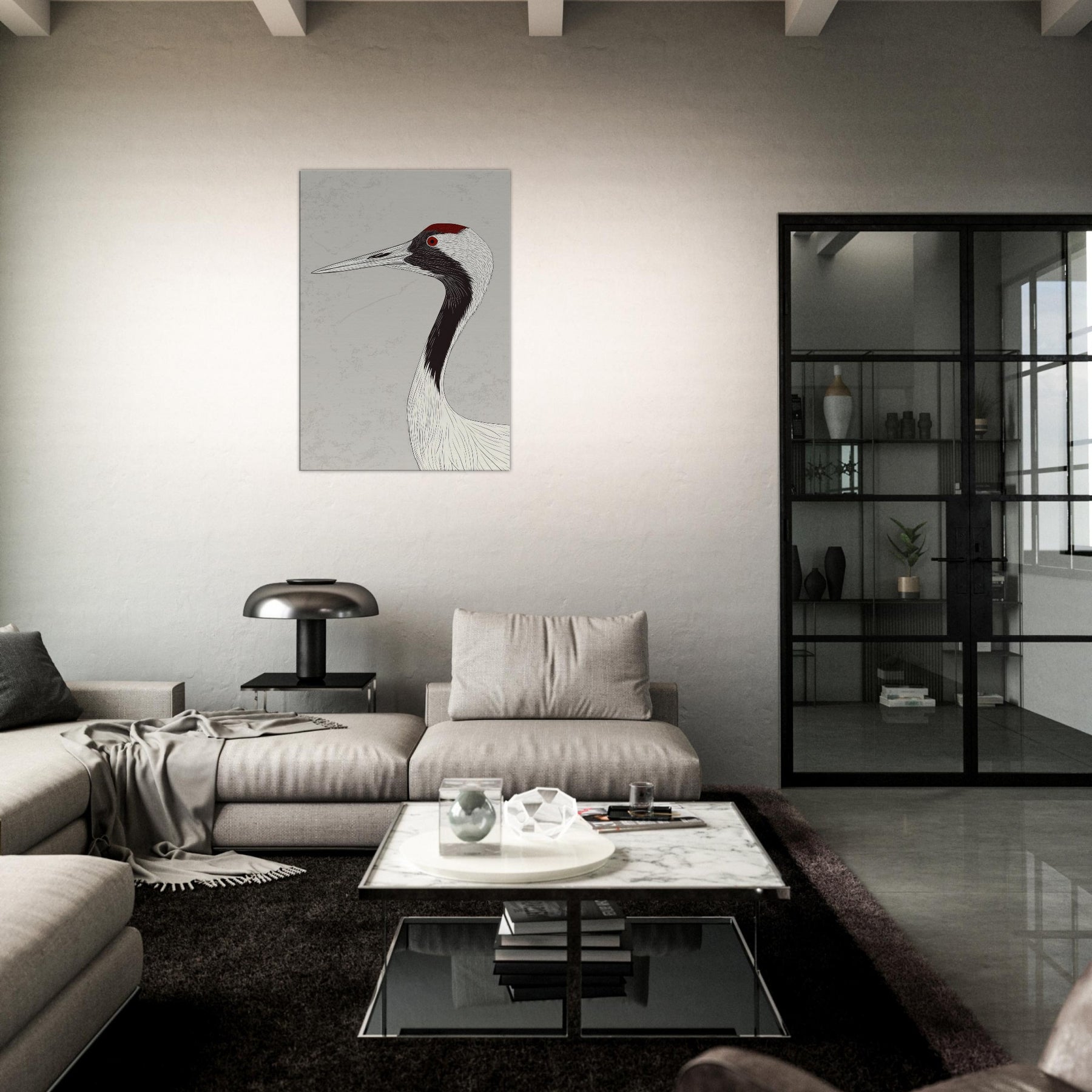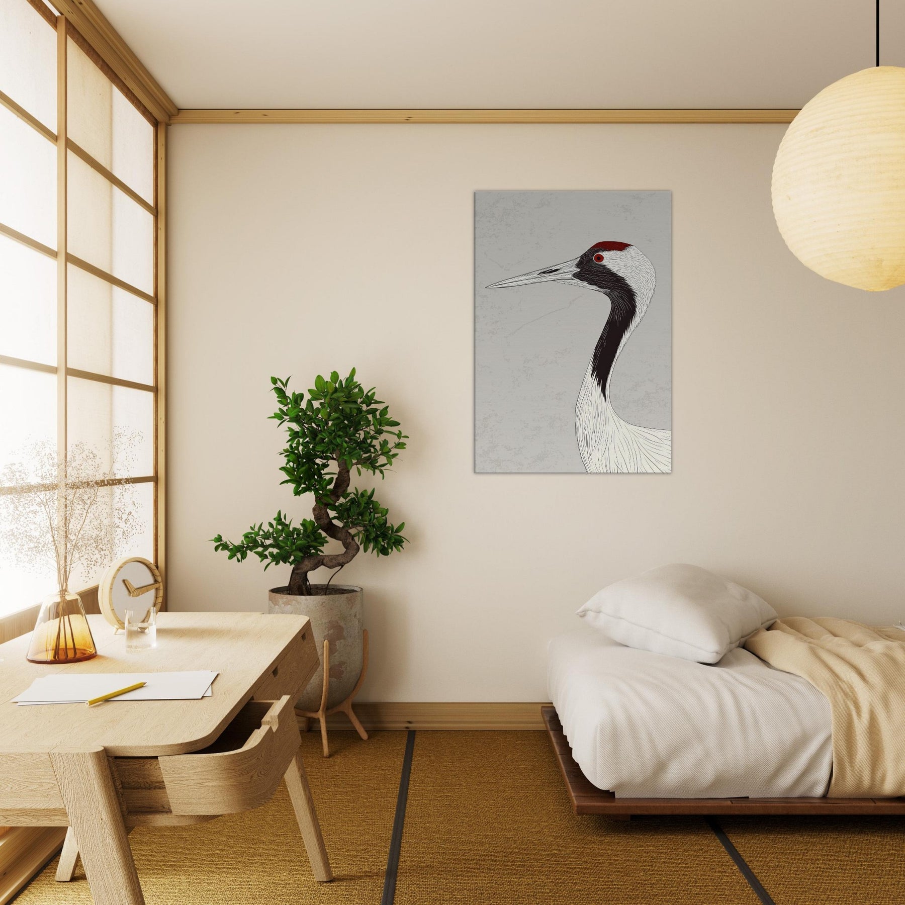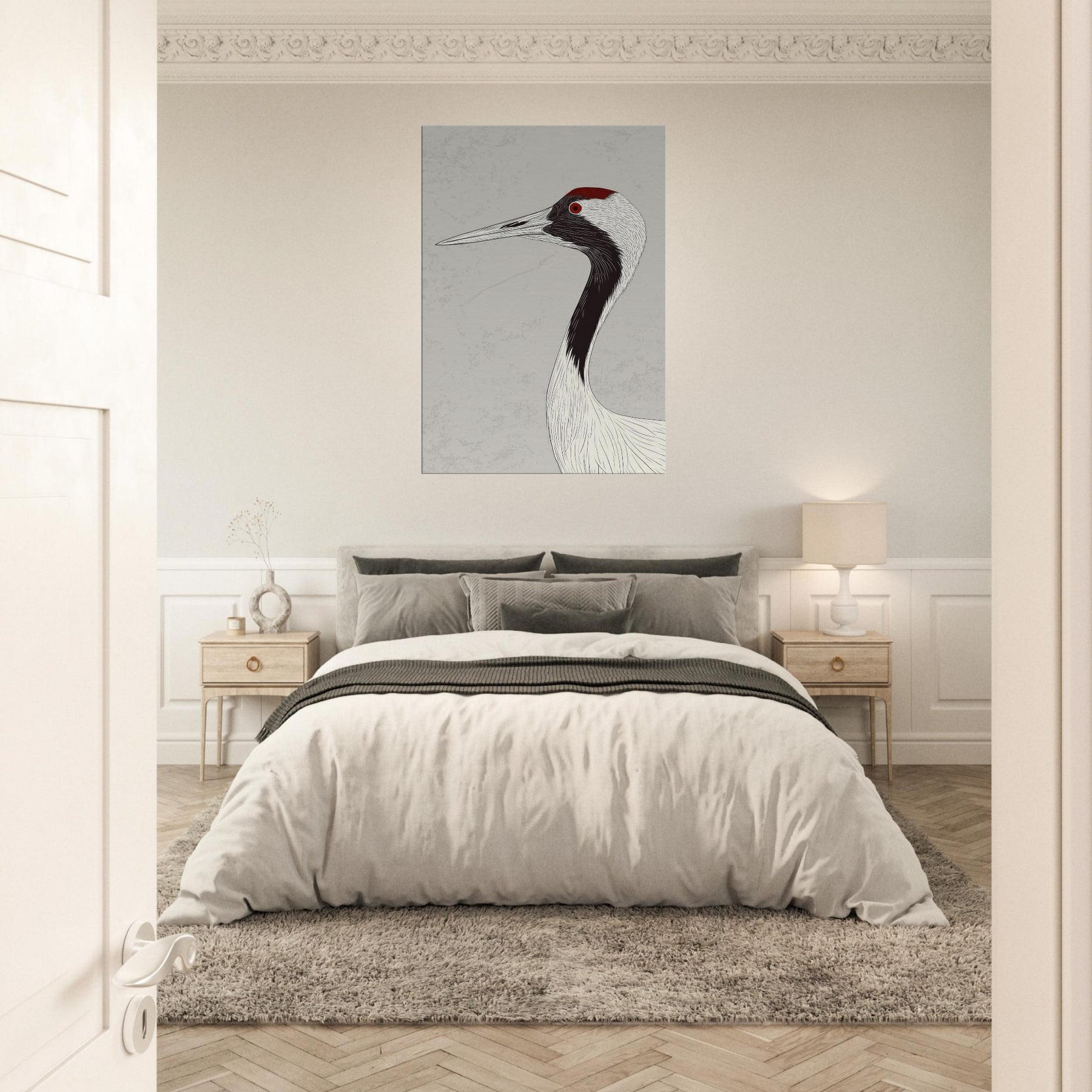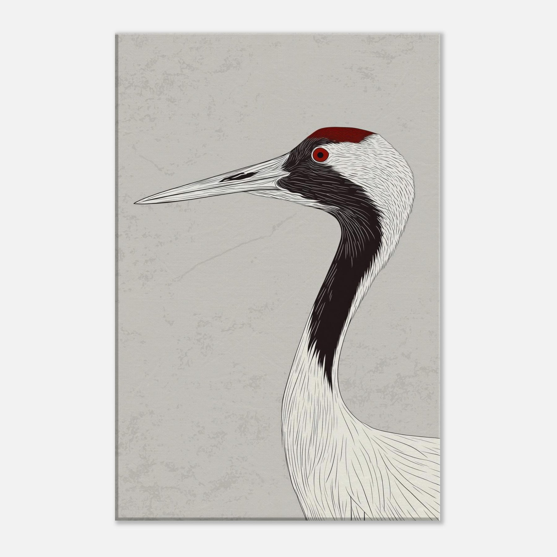 Gracefully poised, the Red Crowned Crane is rendered with sweeping, ink like lines that flow across a pale backdrop, capturing quiet dignity and movement in a single silhouette. The restrained palette and delicate texture invite calm, open space and contemplative mood, infusing a living room, hallway, or bedroom with serenity. The red crown acts as a subtle focal point, a warm ember against cool neutrals, turning walls into a gallery of restraint, grace, and timeless elegance.