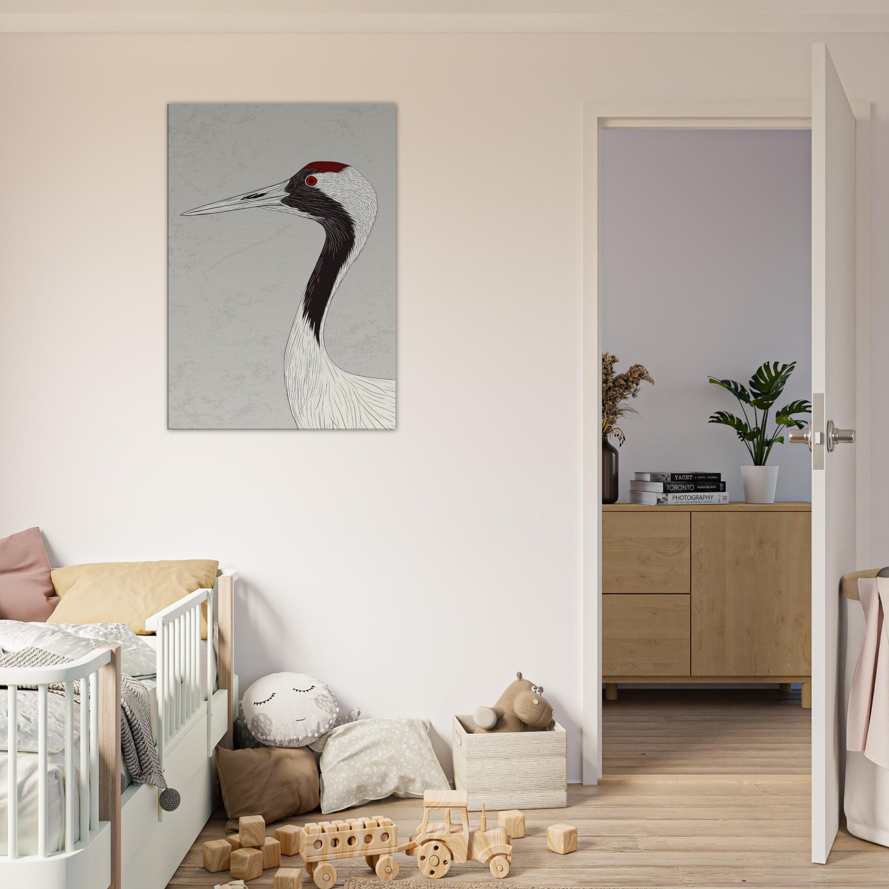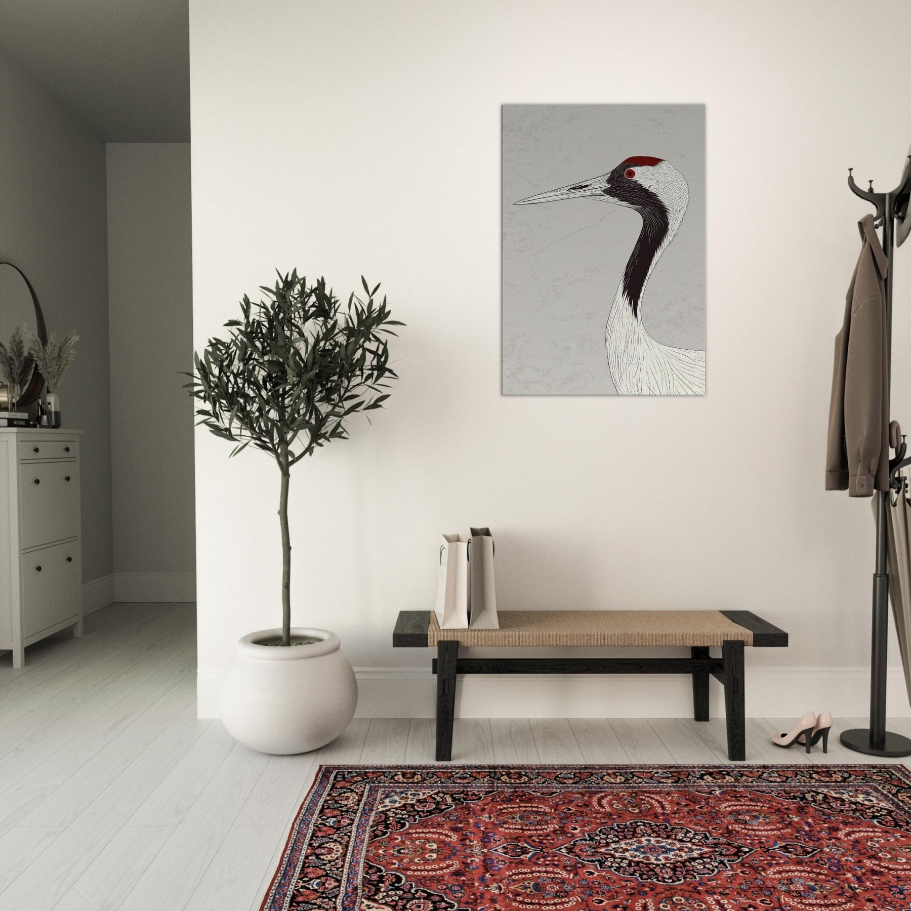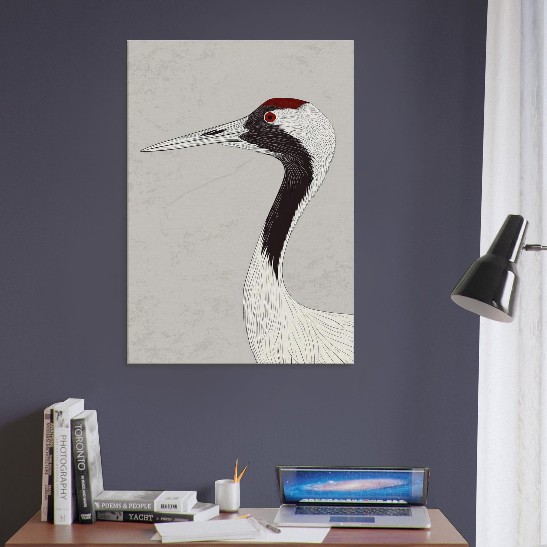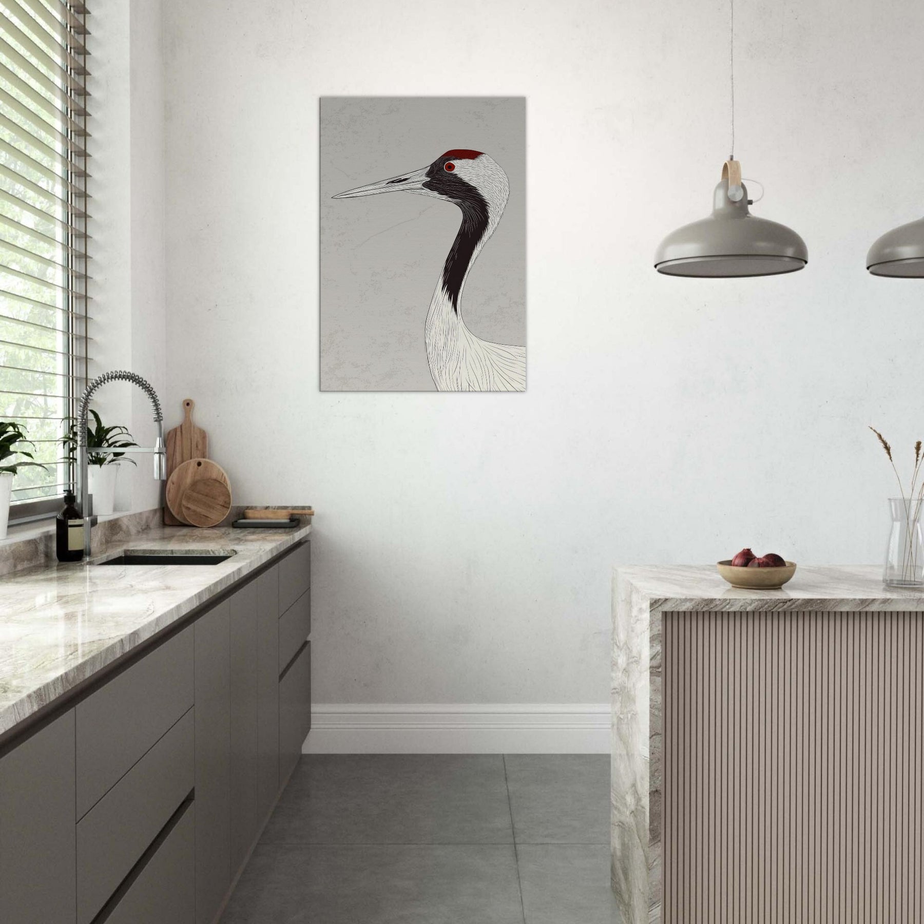 Gracefully poised, the Red Crowned Crane is rendered with sweeping, ink like lines that flow across a pale backdrop, capturing quiet dignity and movement in a single silhouette. The restrained palette and delicate texture invite calm, open space and contemplative mood, infusing a living room, hallway, or bedroom with serenity. The red crown acts as a subtle focal point, a warm ember against cool neutrals, turning walls into a gallery of restraint, grace, and timeless elegance.