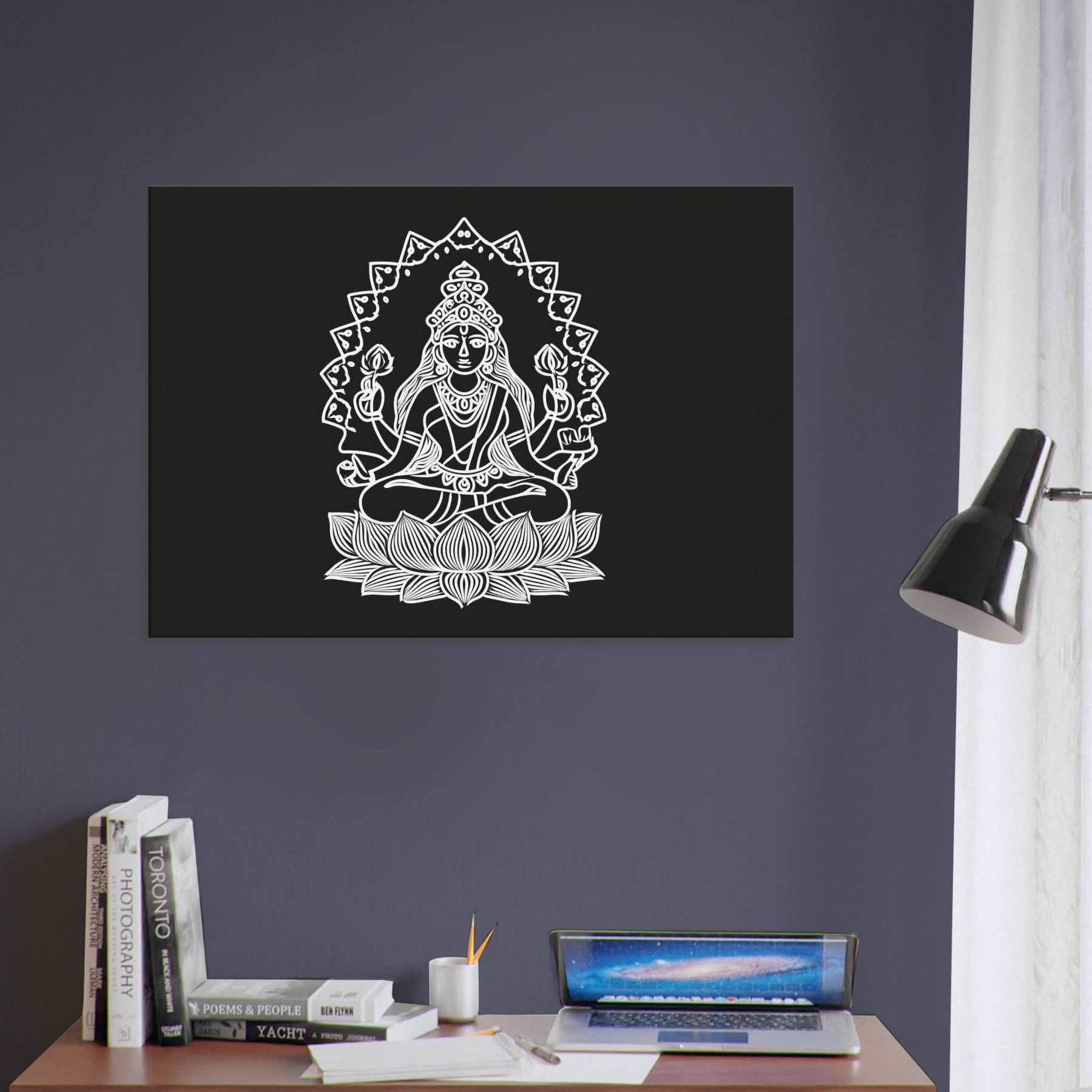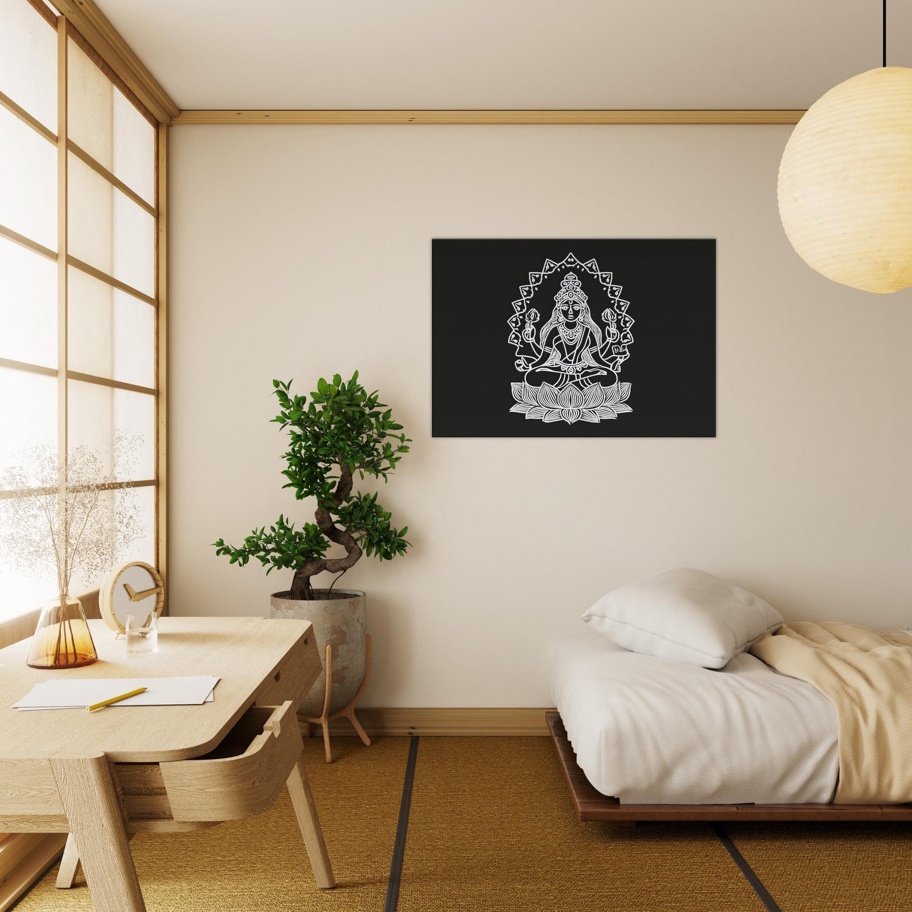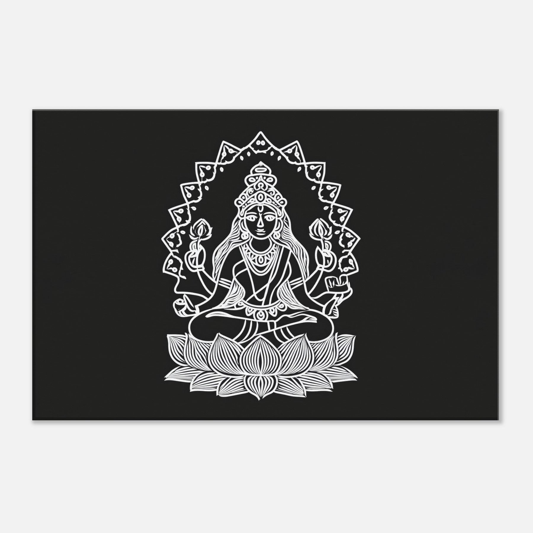 A tranquil line drawn Lakshmi sits cross legged on a blooming lotus, framed by a radiant halo of geometric petals. The minimalist ink lines create a quiet, meditative rhythm graceful, precise, and endlessly serene. This mystical invites abundance and calm into any living space, turning a room into a sanctuary of balance. In person, the contrast of white against deep charcoal feels sculptural, catching light and shadows as the day shifts. Pair it with soft textures and warm woods to elevate a modern, mindful home.