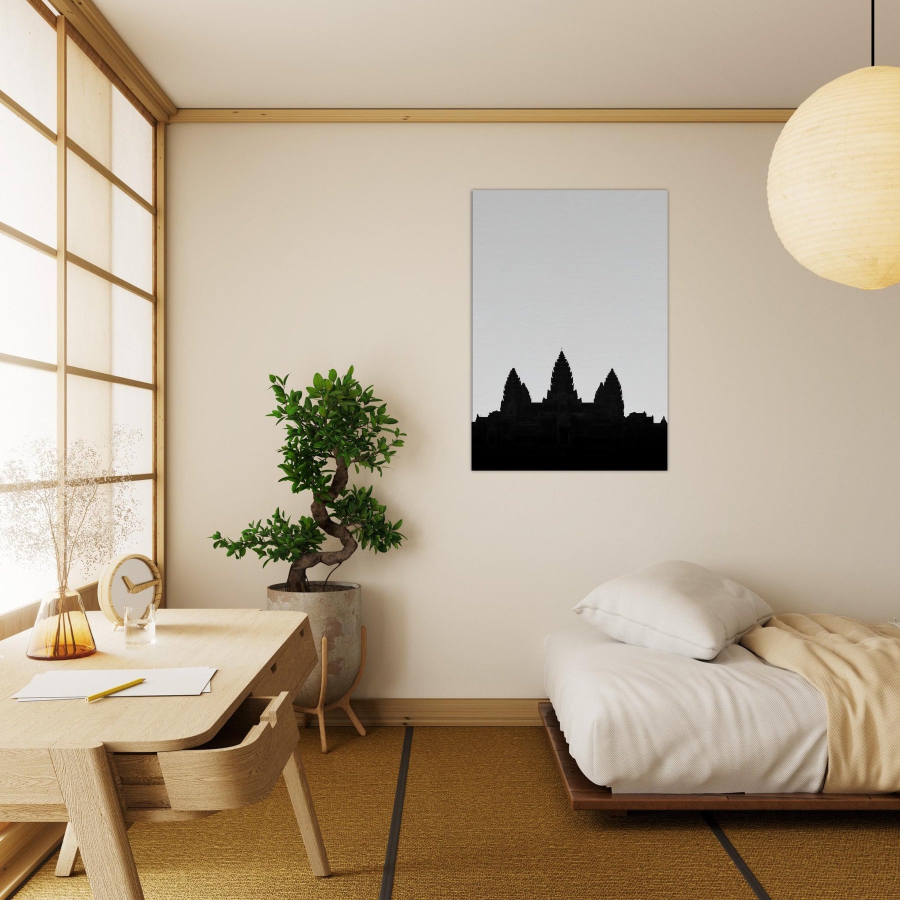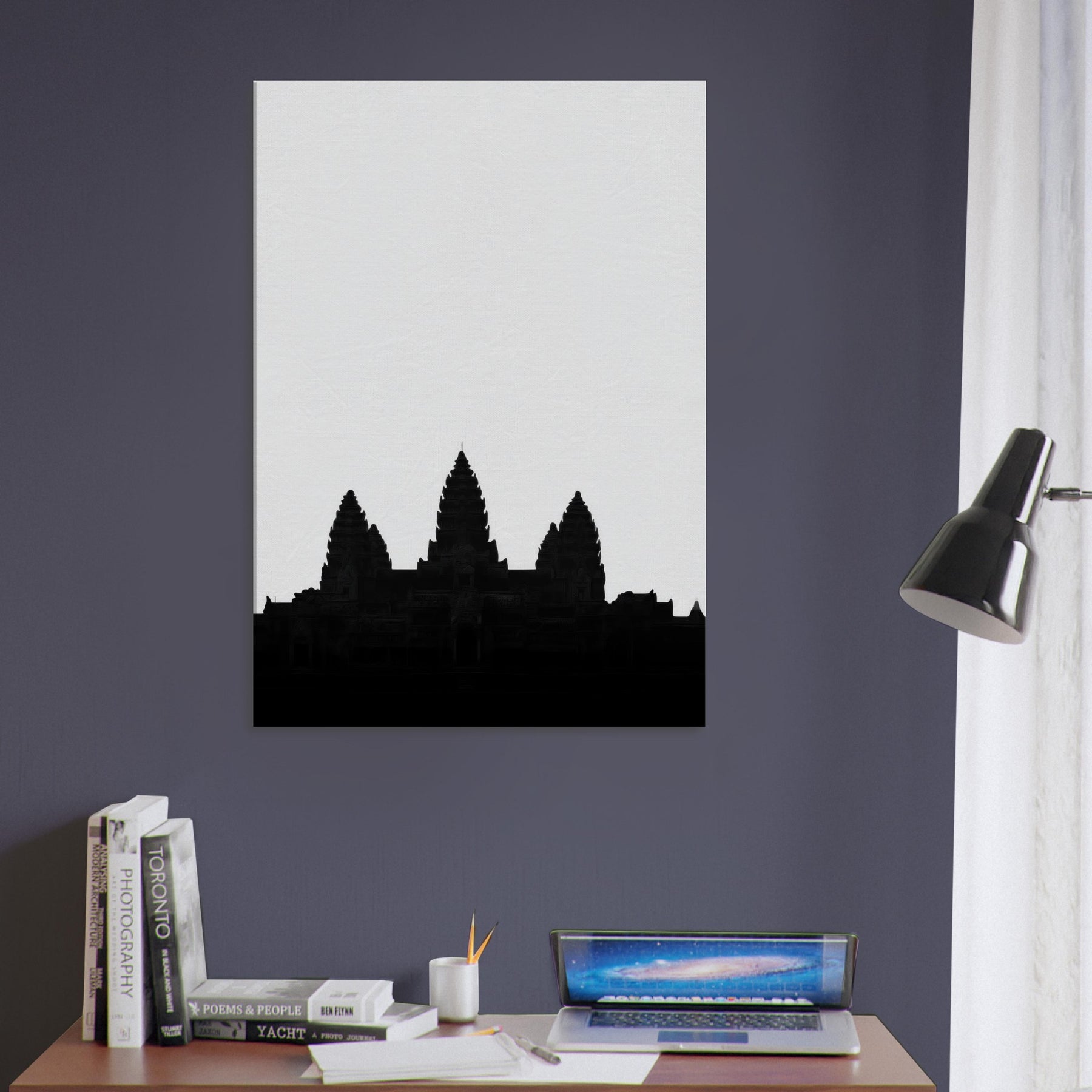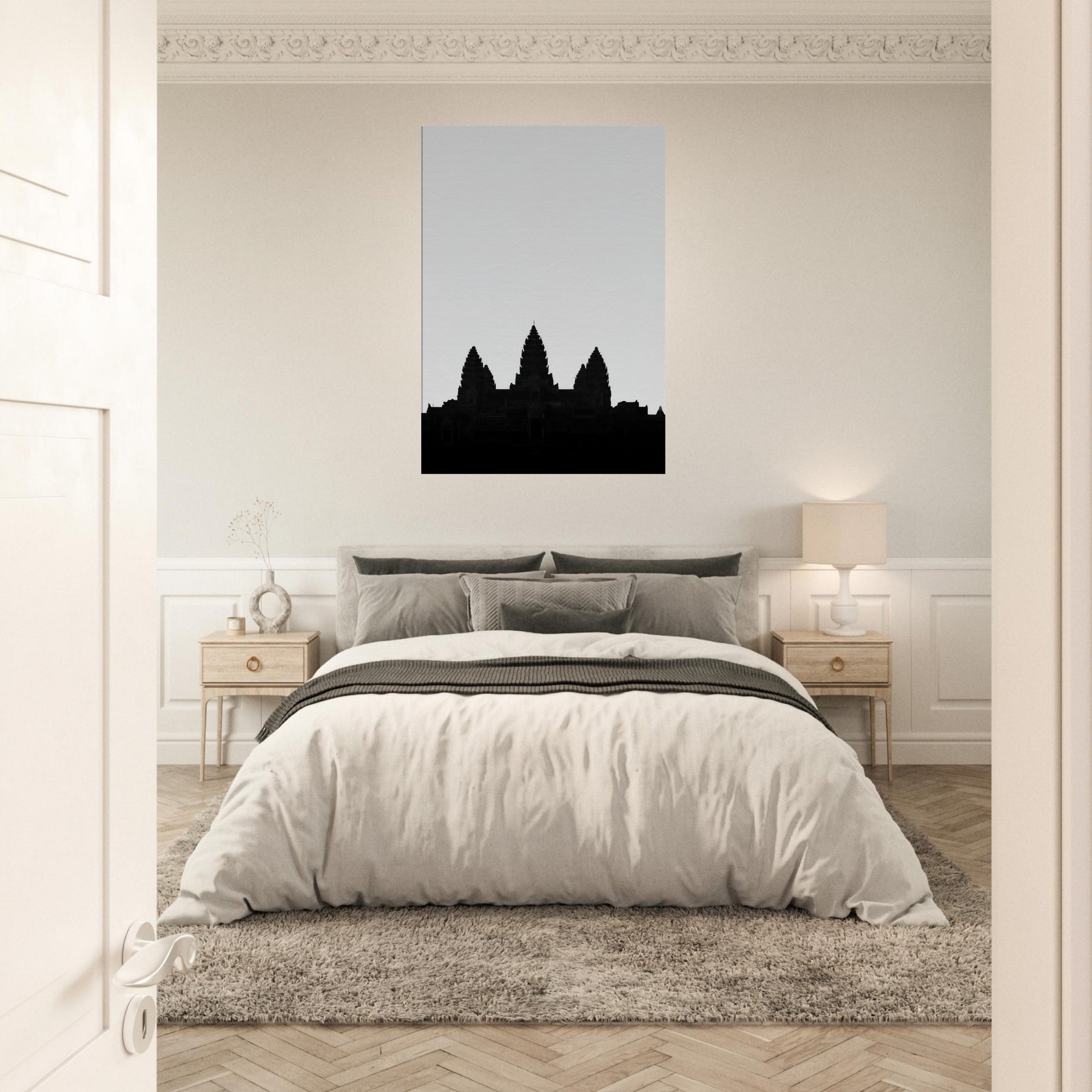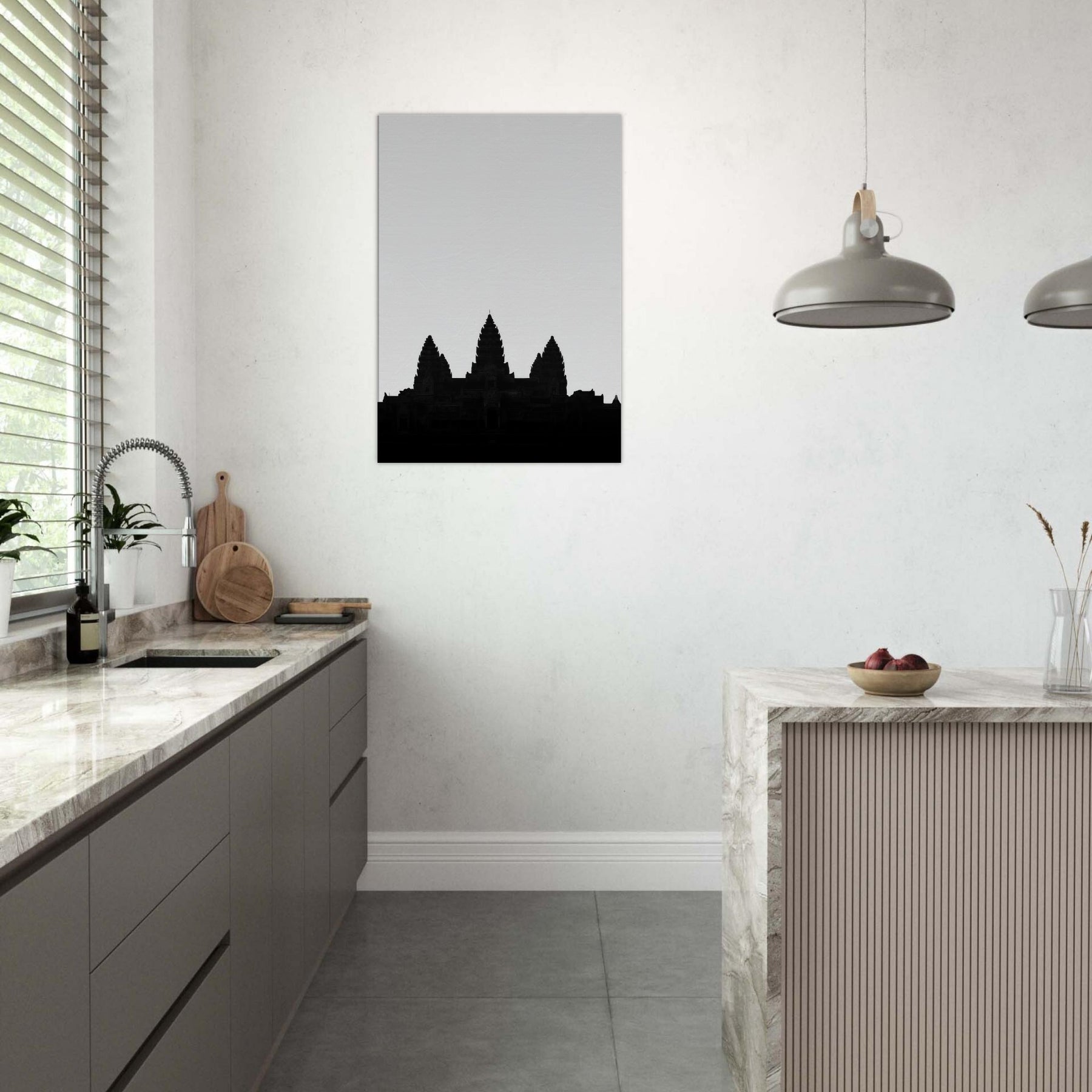 An elegant silhouette of Angkor Wat rises from a quiet horizon, drawn in a single line that suggests both memory and map. This refined line art captures the temple’s rhythm the spires like whispered prayers, the broad shoulders of stone, the hush between towers. Hang it to infuse your living space with ancient authority and modern calm: a focal point that invites quiet reflection, pairs with monochrome palettes, and softly grounds a room with timeless, architectural grace.