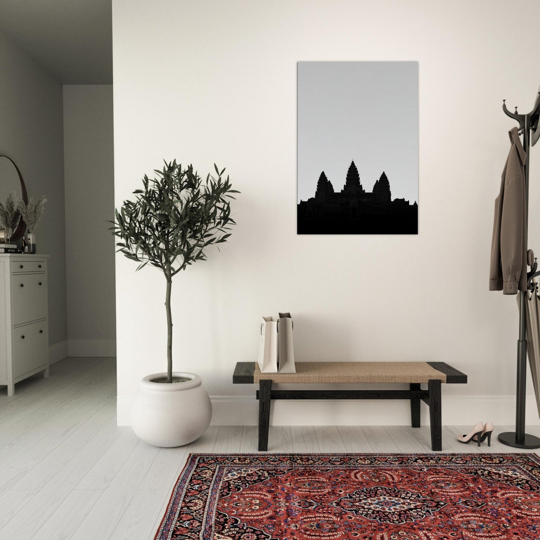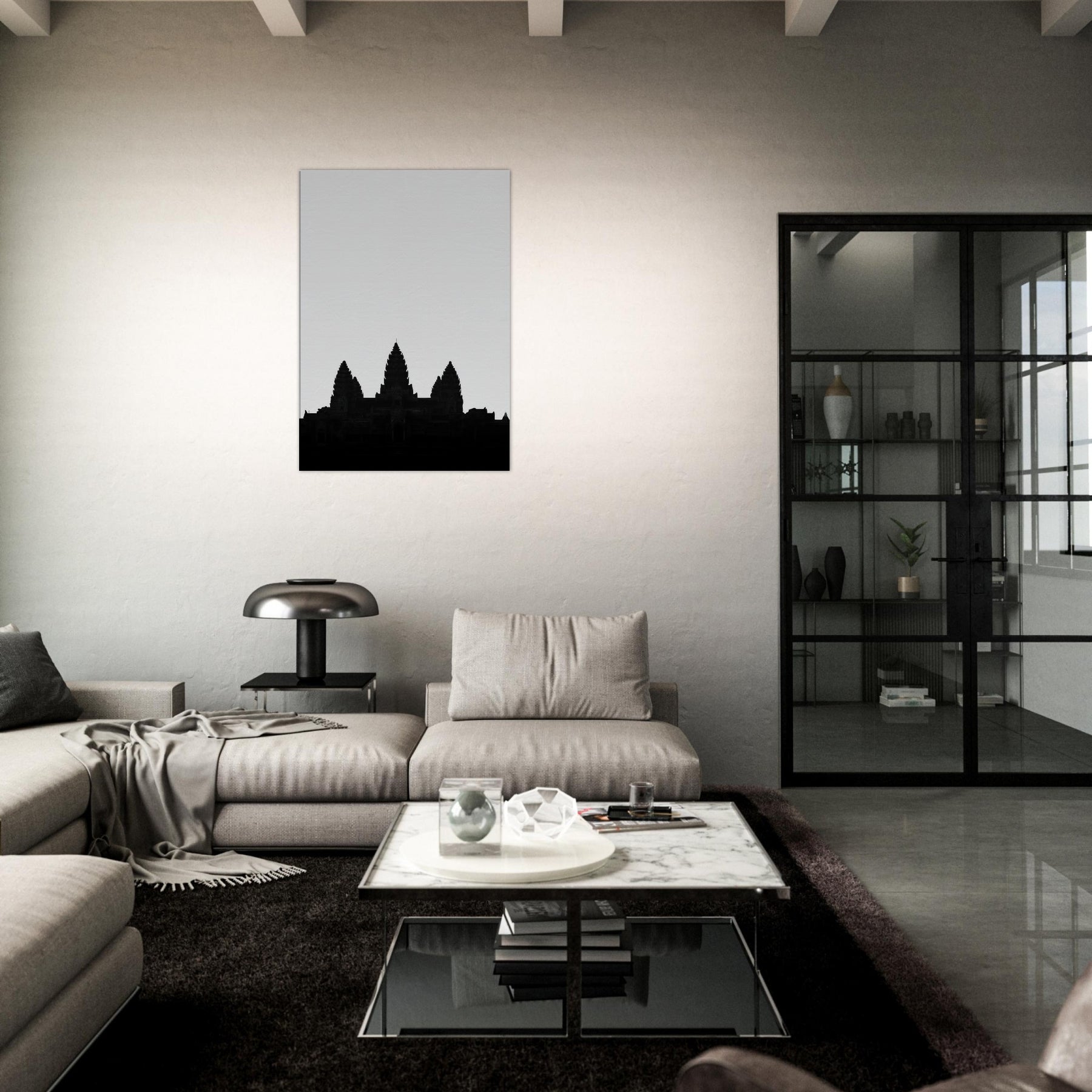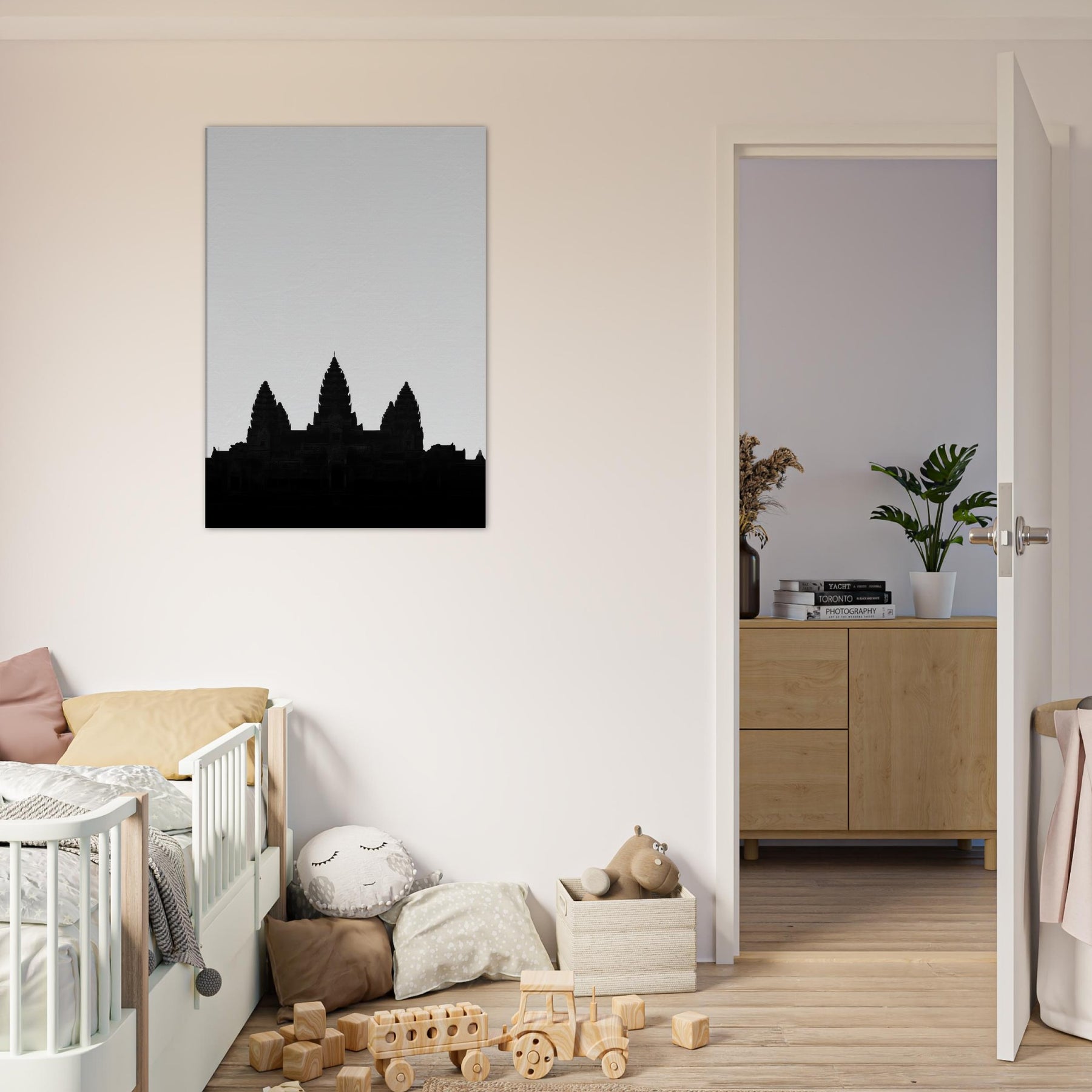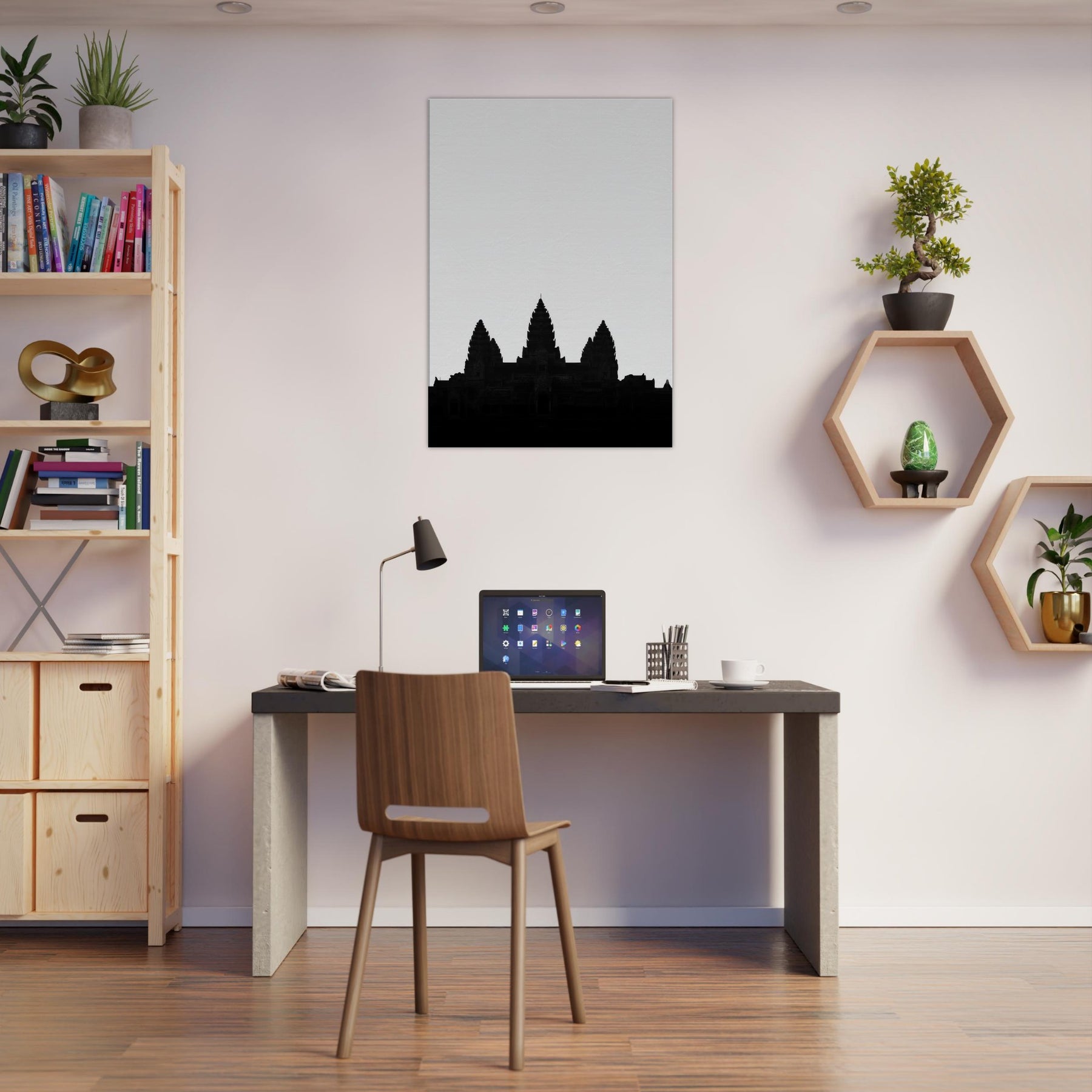 An elegant silhouette of Angkor Wat rises from a quiet horizon, drawn in a single line that suggests both memory and map. This refined line art captures the temple’s rhythm the spires like whispered prayers, the broad shoulders of stone, the hush between towers. Hang it to infuse your living space with ancient authority and modern calm: a focal point that invites quiet reflection, pairs with monochrome palettes, and softly grounds a room with timeless, architectural grace.