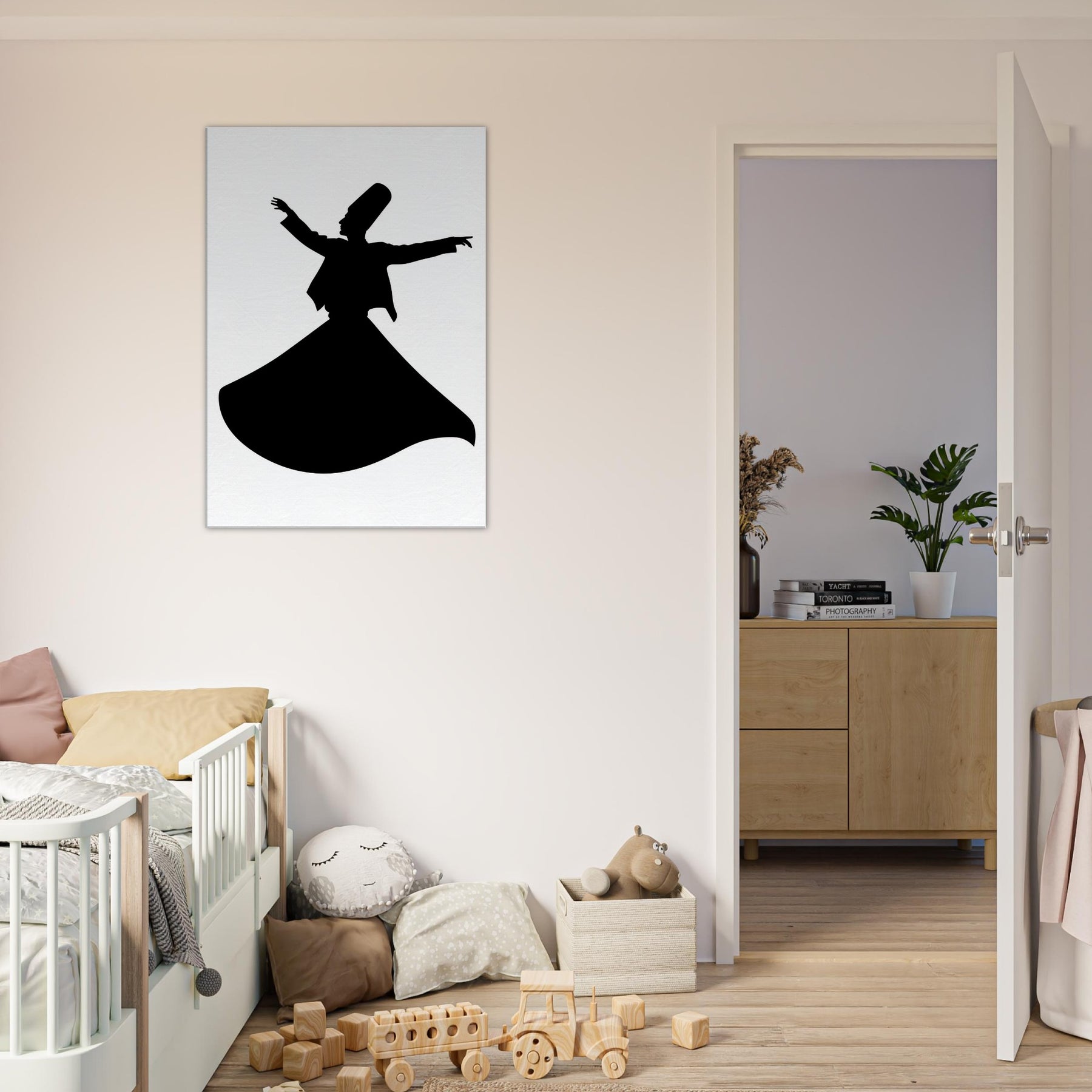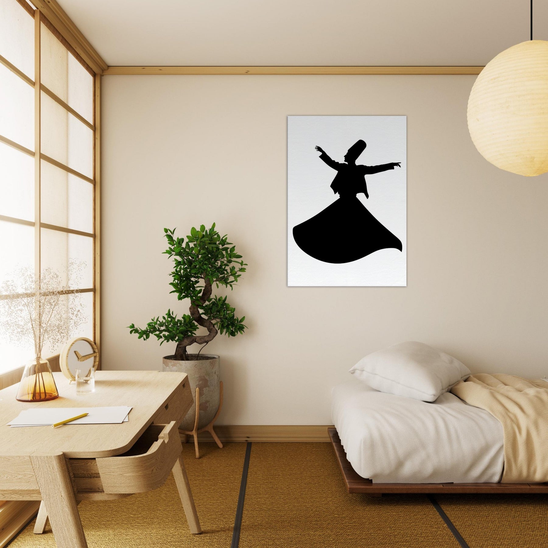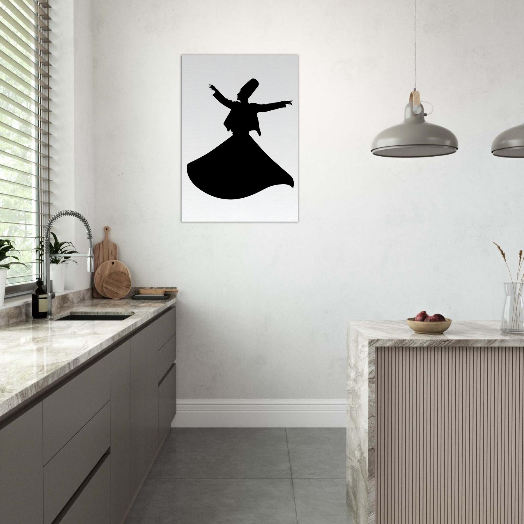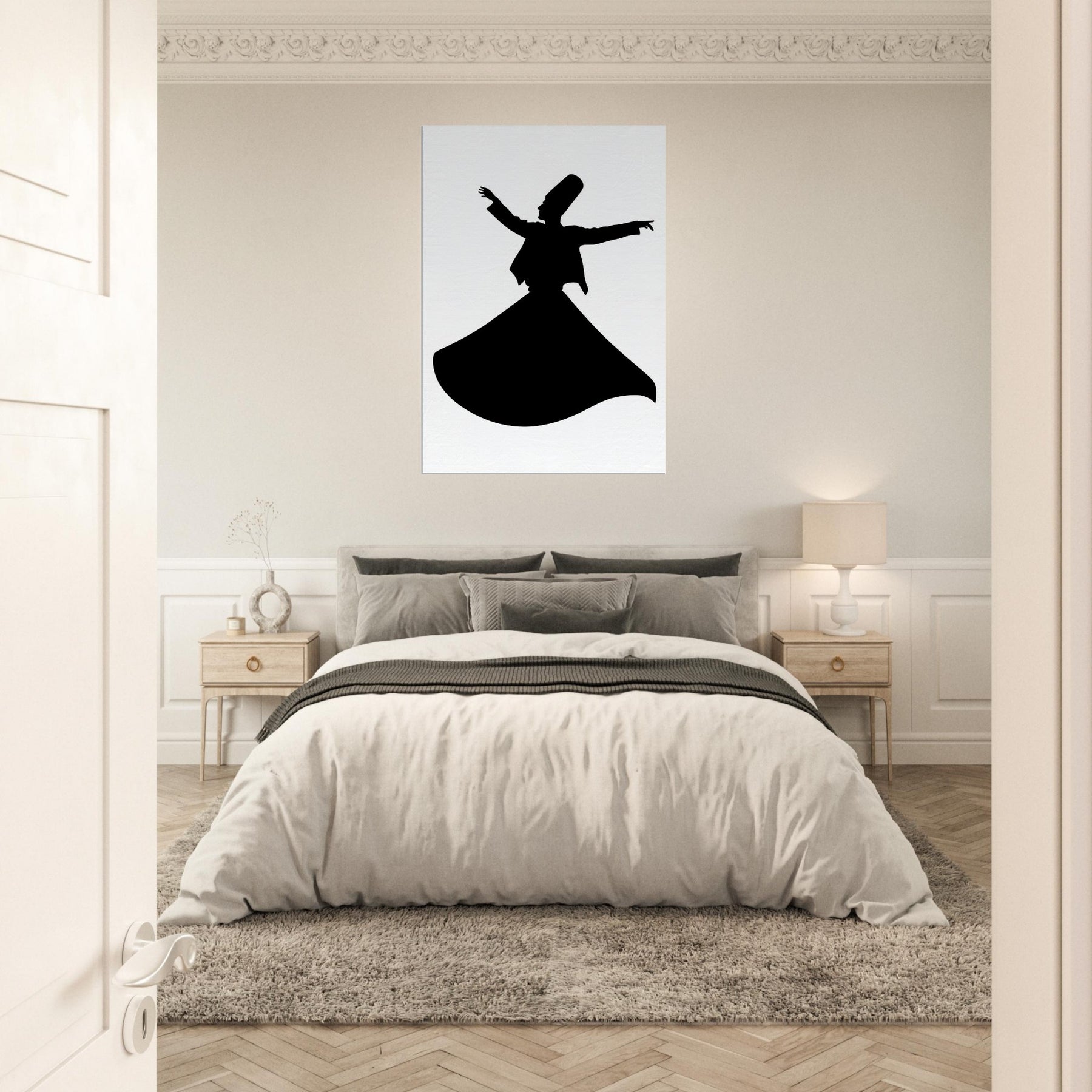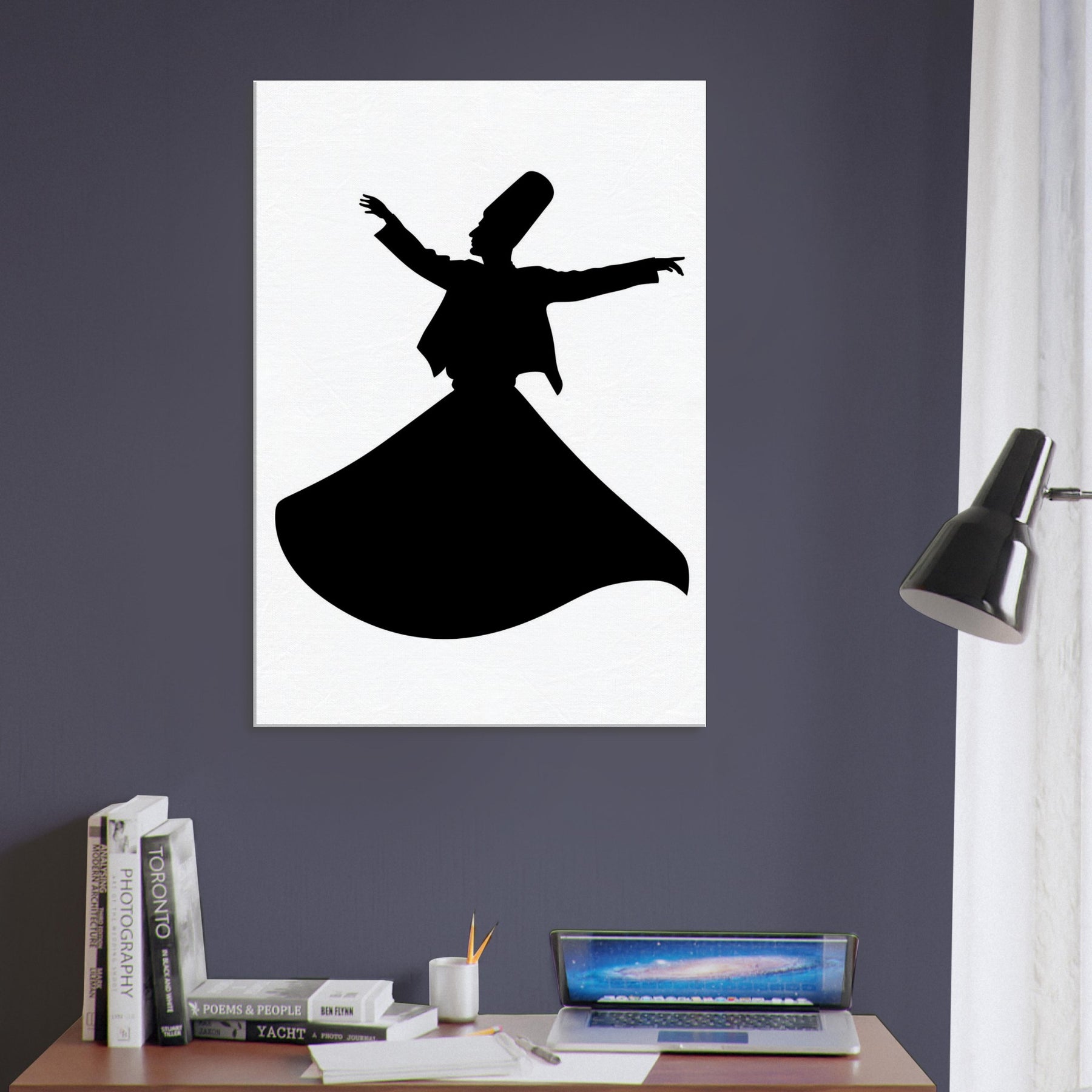 Immerse your space in moving stillness with the Whirling Dervish Silhouette, rendered in clean line art that feels both ancient and contemporary. This graceful figure is a study in balance the outstretched arms, the deep arc of the gown, the suggestion of motion that invites reflection rather than busy detail. Hang it in a living room or hallway to cast a contemplative mood, softening walls with midnight contrast and a whisper of mysticism. It transforms corners into a quiet sanctuary and sparks conversations about rhythm, devotion, and wonder.