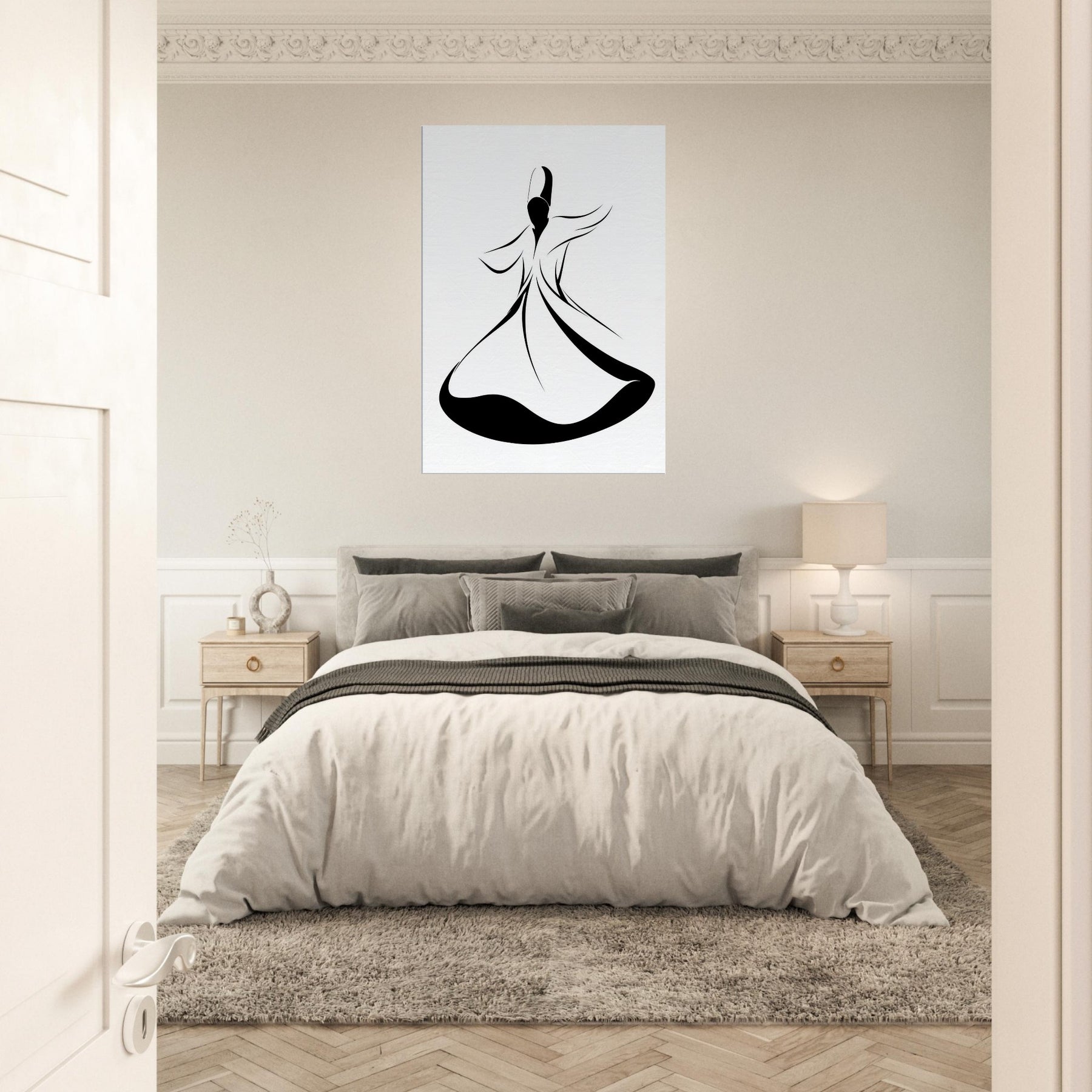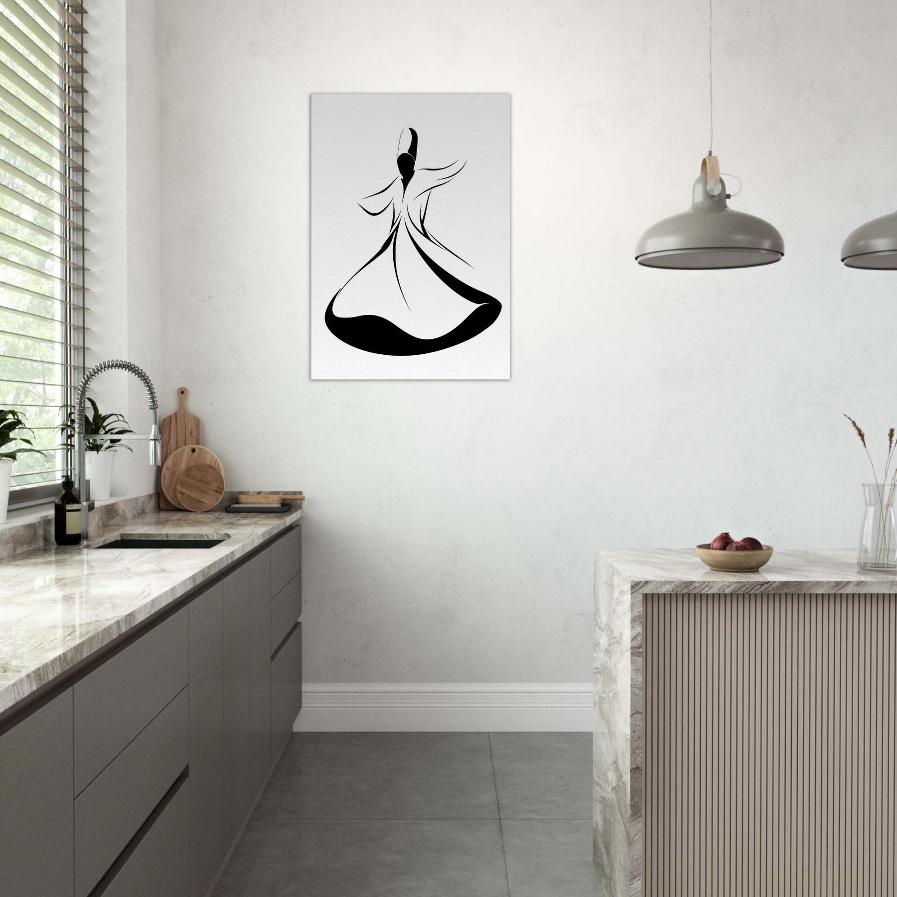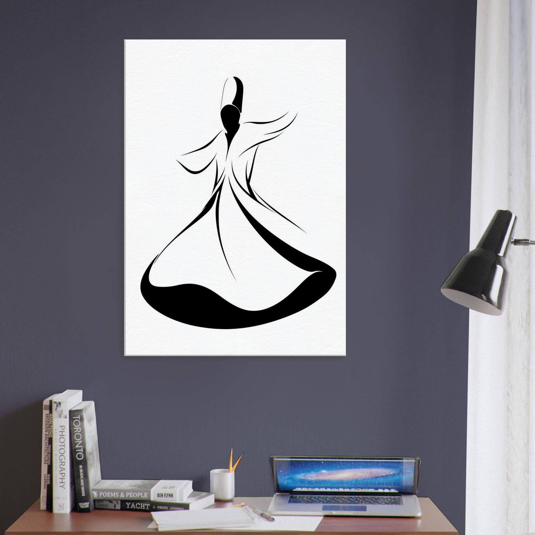 Let the Whirling Dervish Silhouette sweep through your space with quiet grace. This elegant line art captures motion in a single flowing arc, inviting ritual calm and mindful energy. The stark black and white contrast grounds a modern room, while sinuous curves suggest a dance between stillness and breath. Hang it above a sofa or entryway to welcome serenity, guiding conversations and daily rituals with subtle, magnetic poetry.