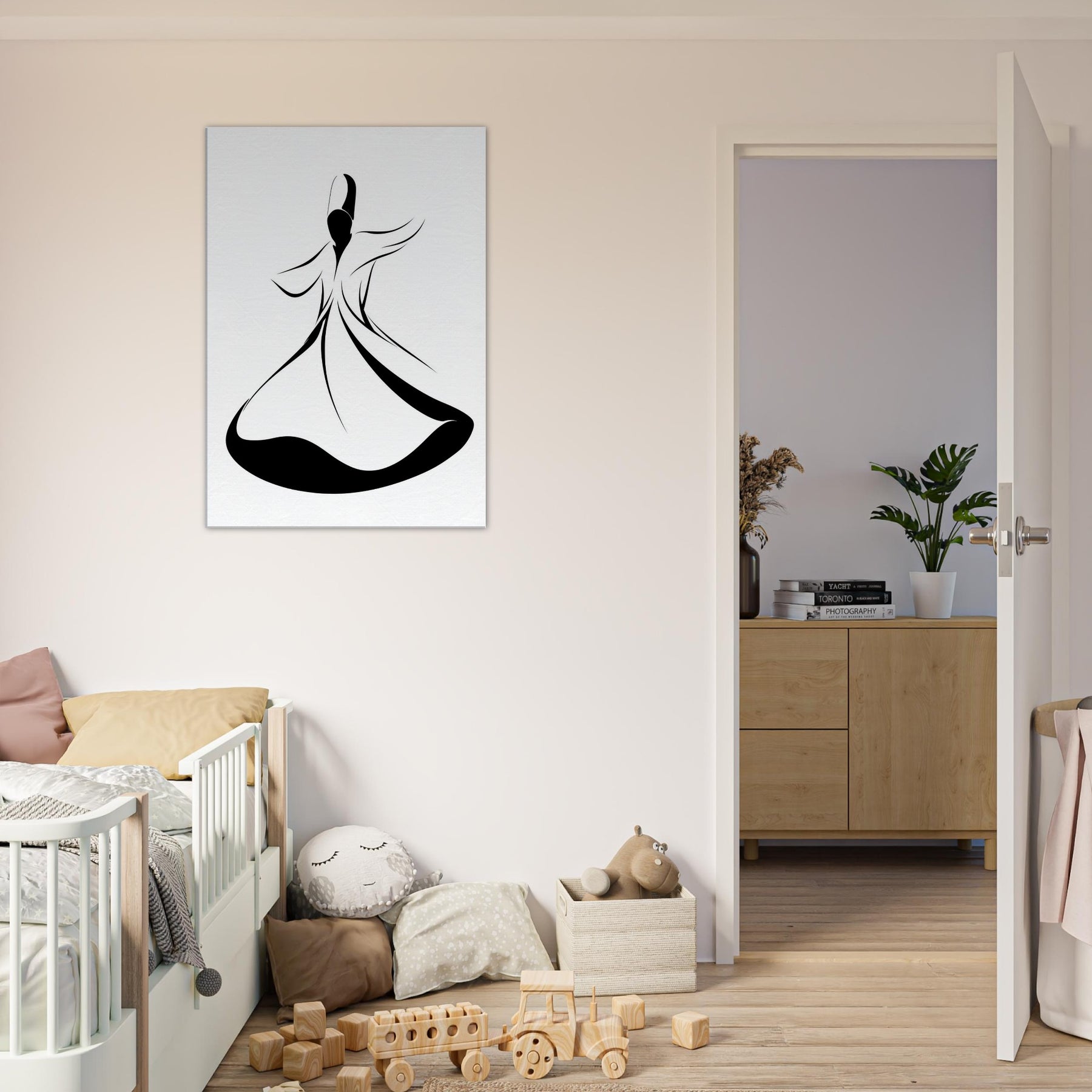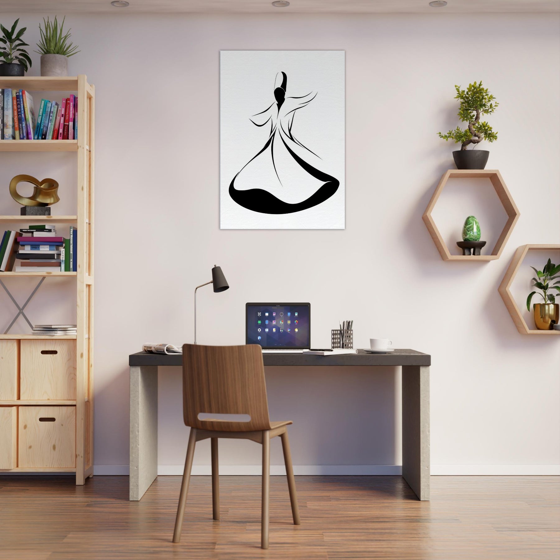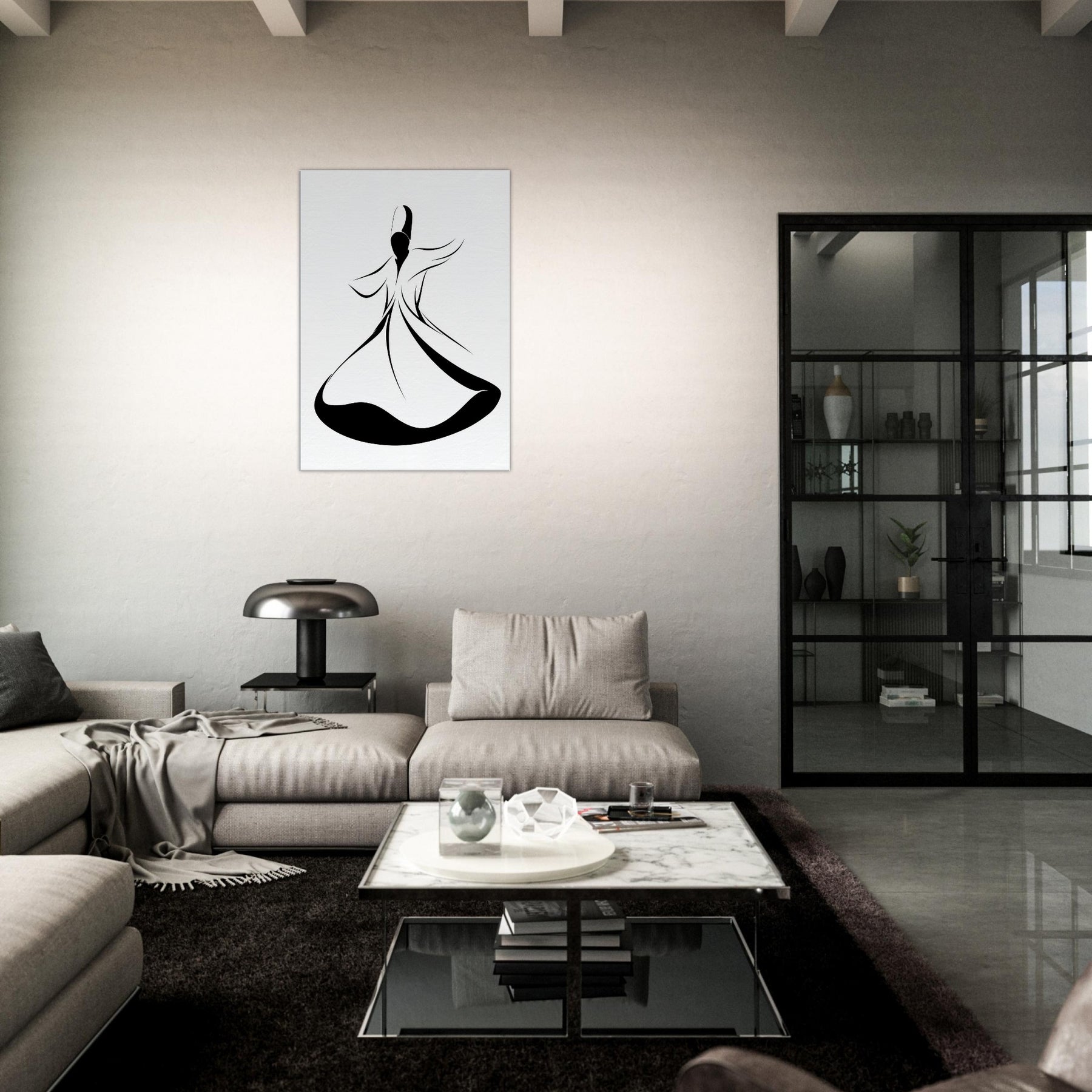 Let the Whirling Dervish Silhouette sweep through your space with quiet grace. This elegant line art captures motion in a single flowing arc, inviting ritual calm and mindful energy. The stark black and white contrast grounds a modern room, while sinuous curves suggest a dance between stillness and breath. Hang it above a sofa or entryway to welcome serenity, guiding conversations and daily rituals with subtle, magnetic poetry.