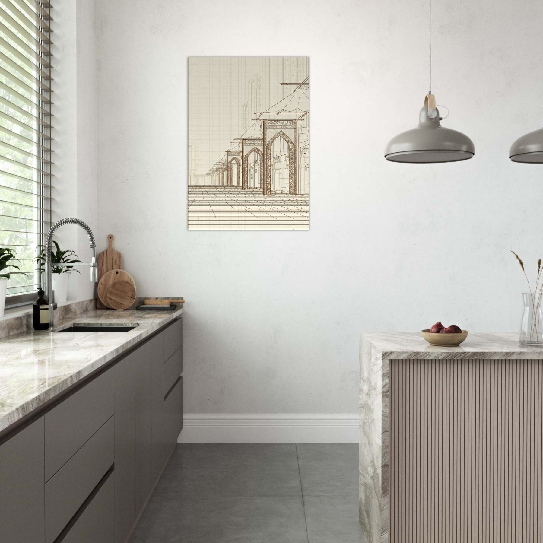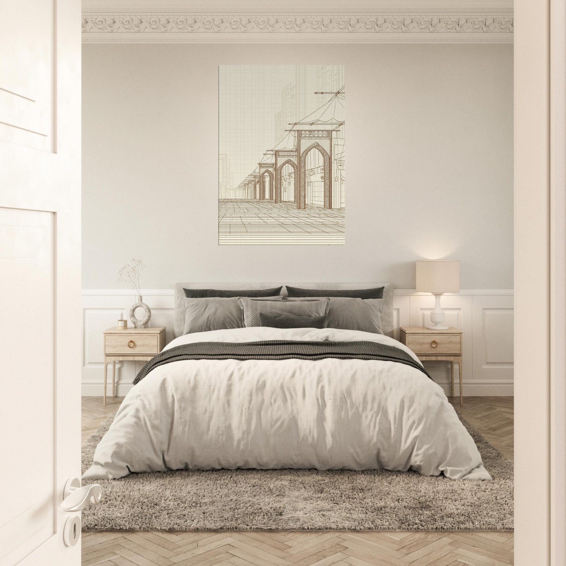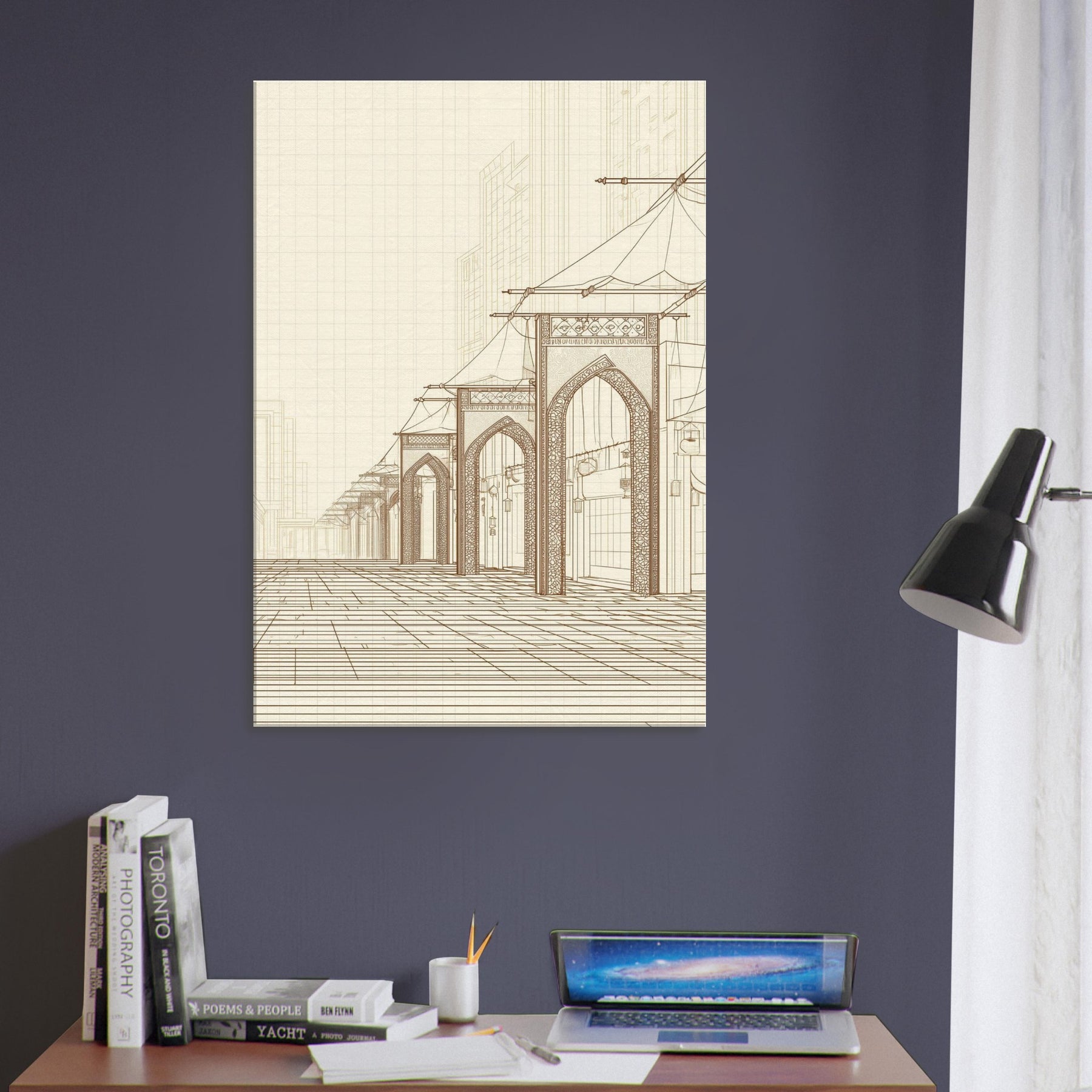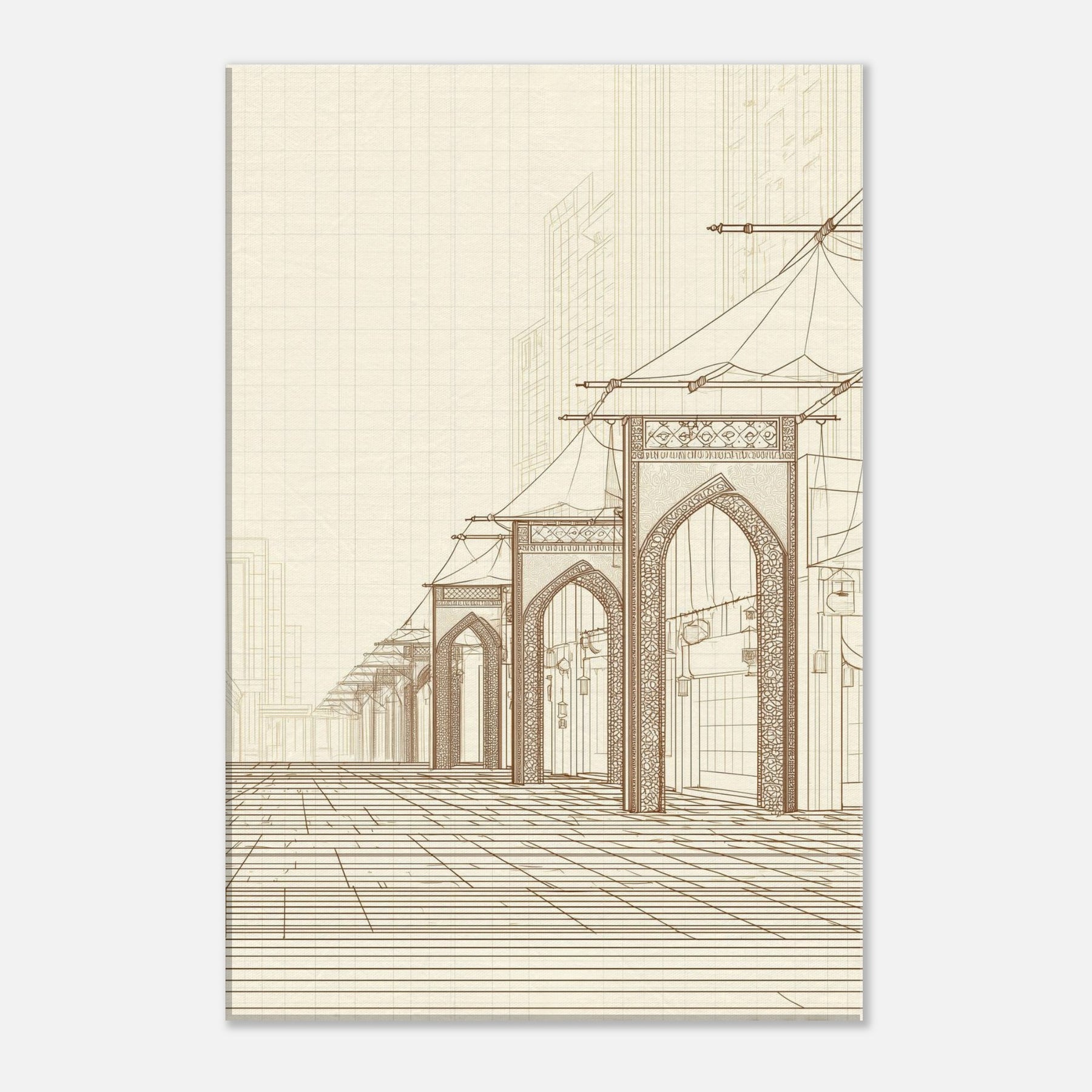 Step into the quiet hum of a long ago market with our Arabian Bazaar in pristine line work. This masterful piece captures the rhythm of arches, canopies, and lanterns, where the eye travels along delicate contours and timeless layouts. The minimalist palette and airy space invite contemplation, turning a living room into a stroll through a sunlit souk. Perfect for modern interiors seeking warmth, texture, and a whisper of travel, it grounds the room with elegance and hush.