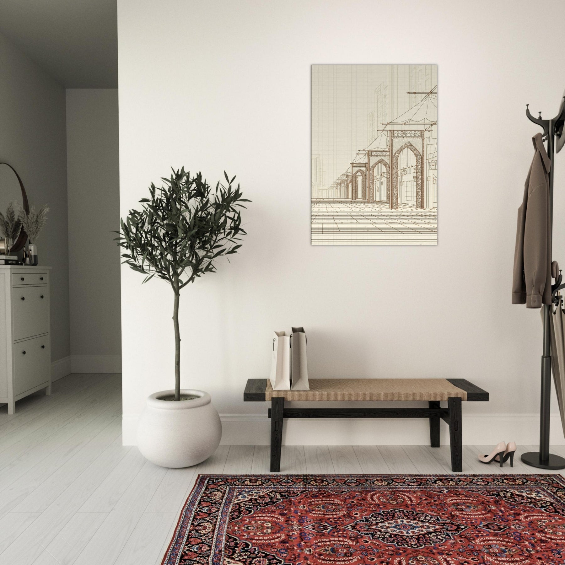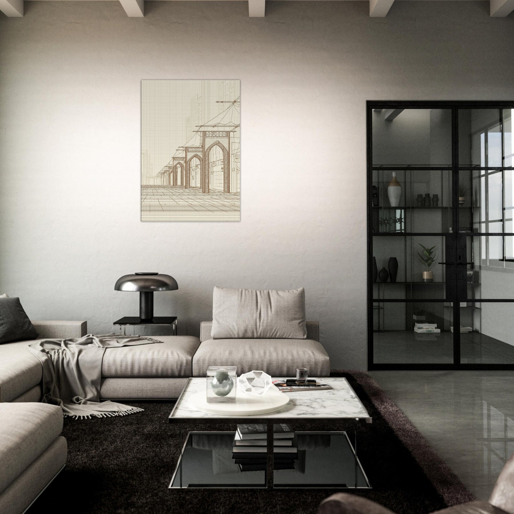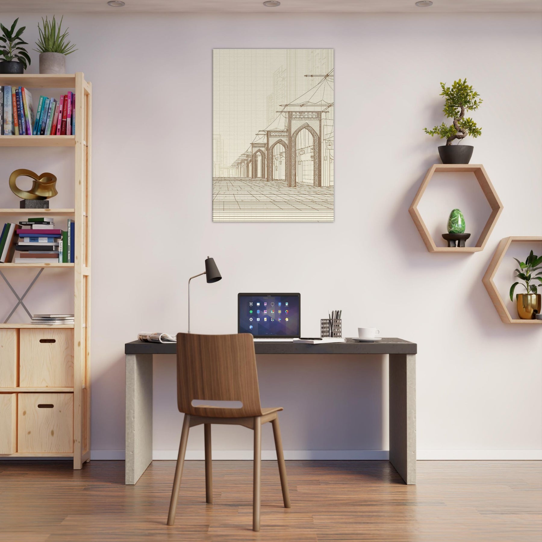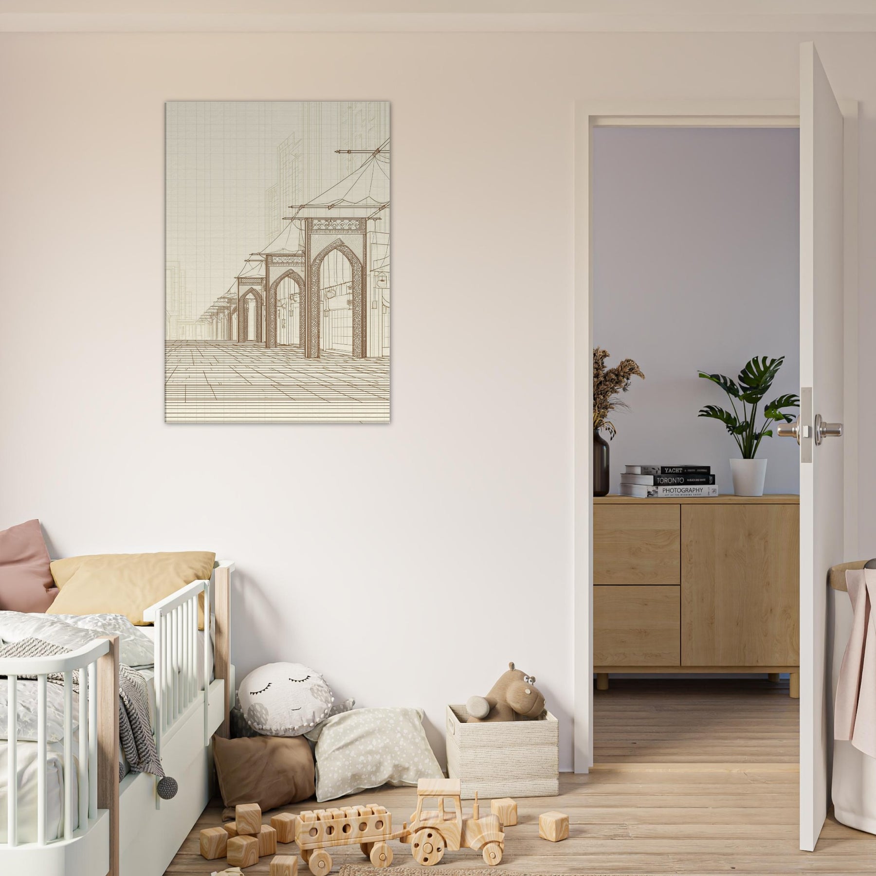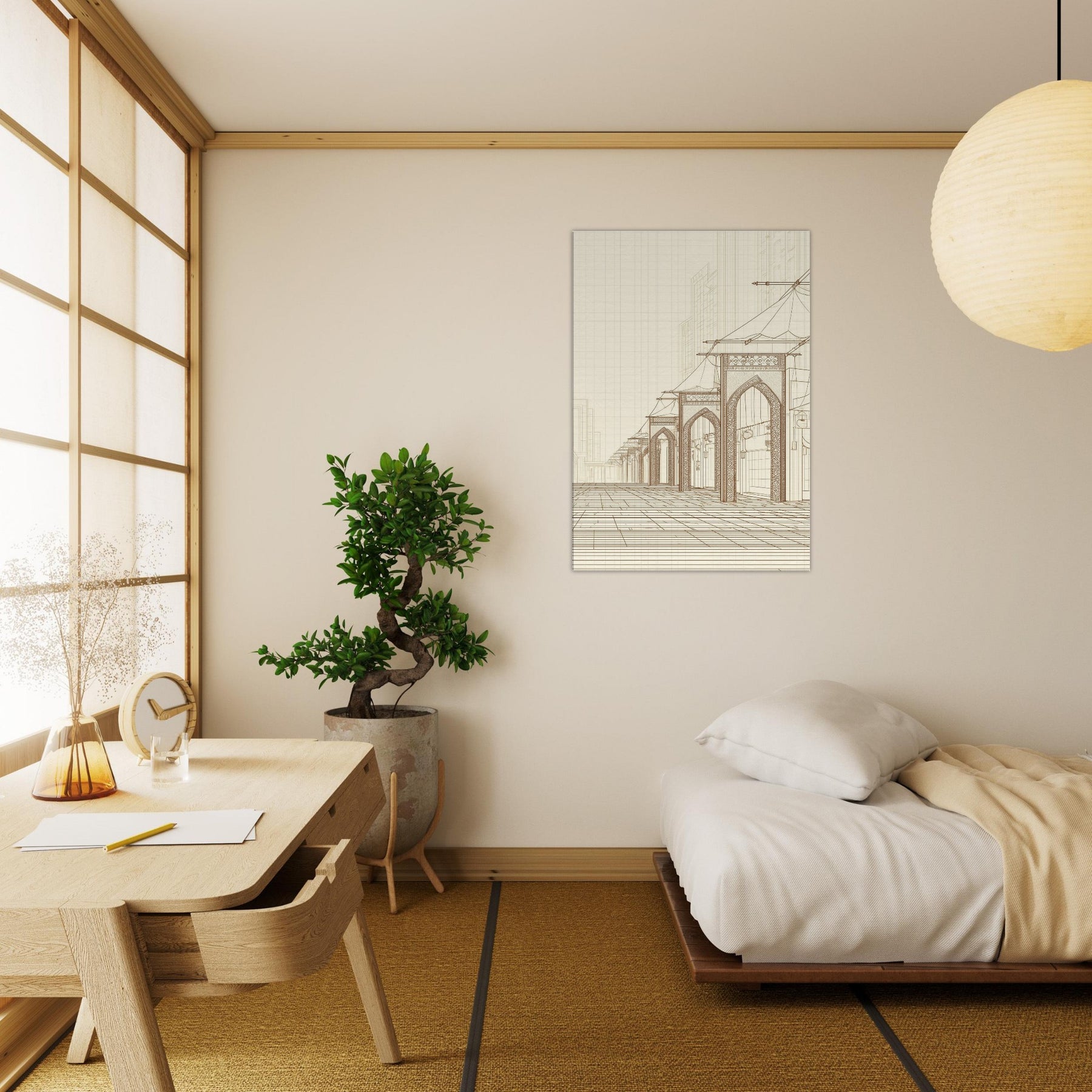 Step into the quiet hum of a long ago market with our Arabian Bazaar in pristine line work. This masterful piece captures the rhythm of arches, canopies, and lanterns, where the eye travels along delicate contours and timeless layouts. The minimalist palette and airy space invite contemplation, turning a living room into a stroll through a sunlit souk. Perfect for modern interiors seeking warmth, texture, and a whisper of travel, it grounds the room with elegance and hush.
