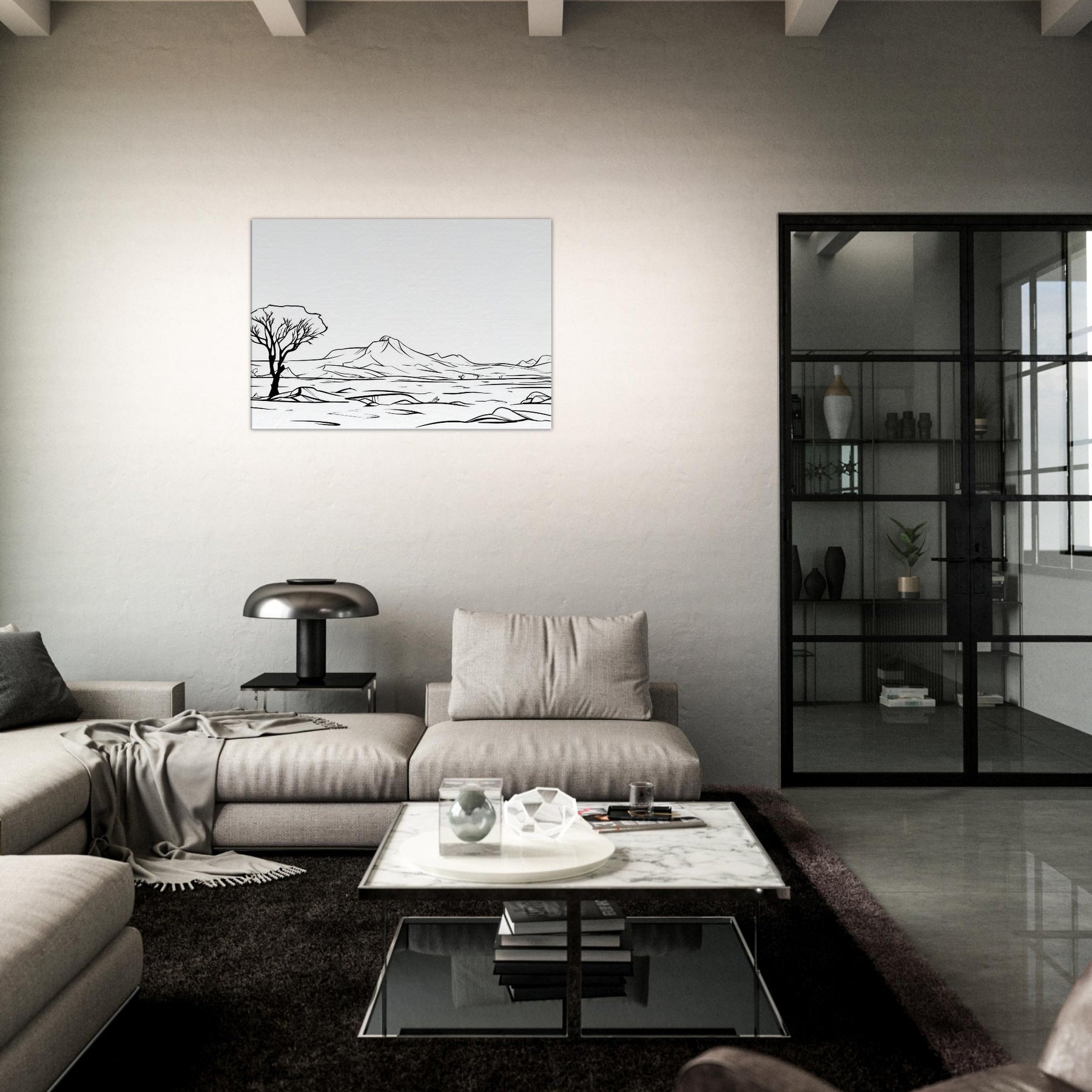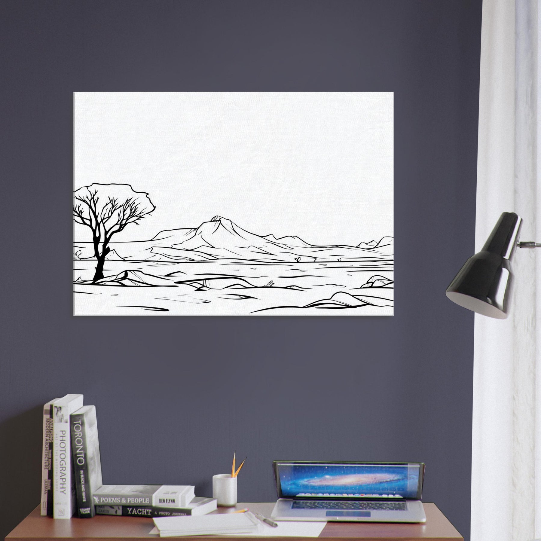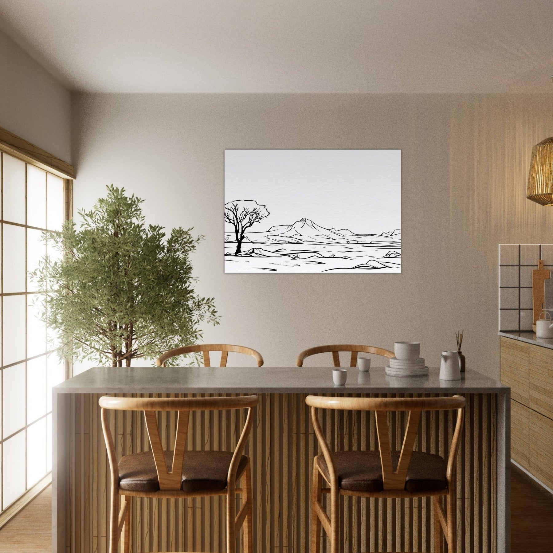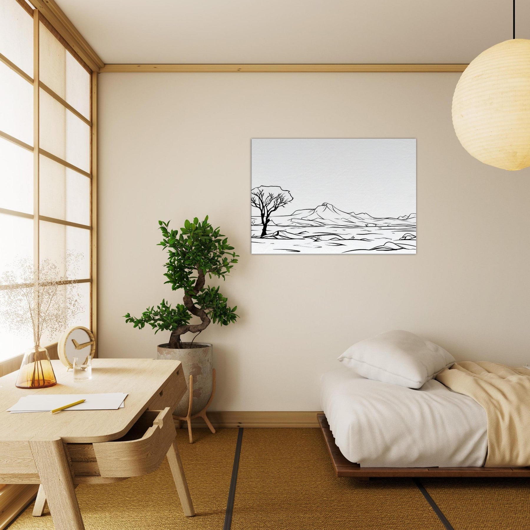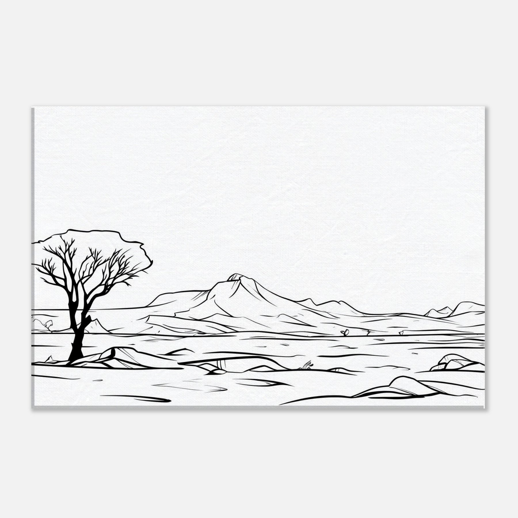 Like a whispered map, this line drawn Desert traces a horizon of dunes, a lone tree, and distant mountains in clean black strokes. The Desert's stark quiet is rendered with poetry rather than color, inviting contemplation and a slower tempo in your living space. Printed on premium paper, it offers gallery grade presence that pairs with neutral palettes or textured accents. A quiet centerpiece for any room, it heightens atmosphere, invites reflection, and gives your home a timeless, breathable elegance.