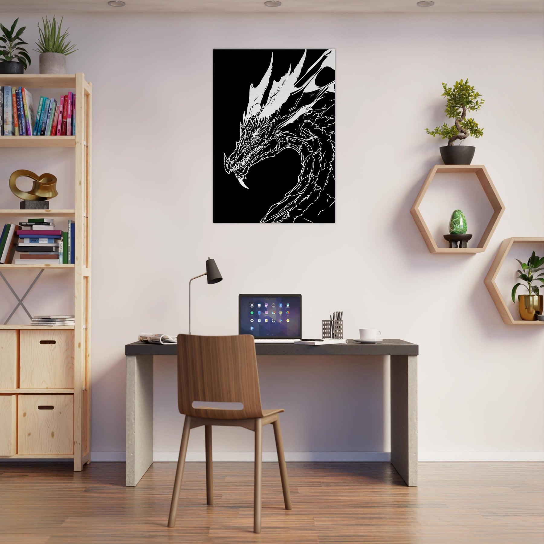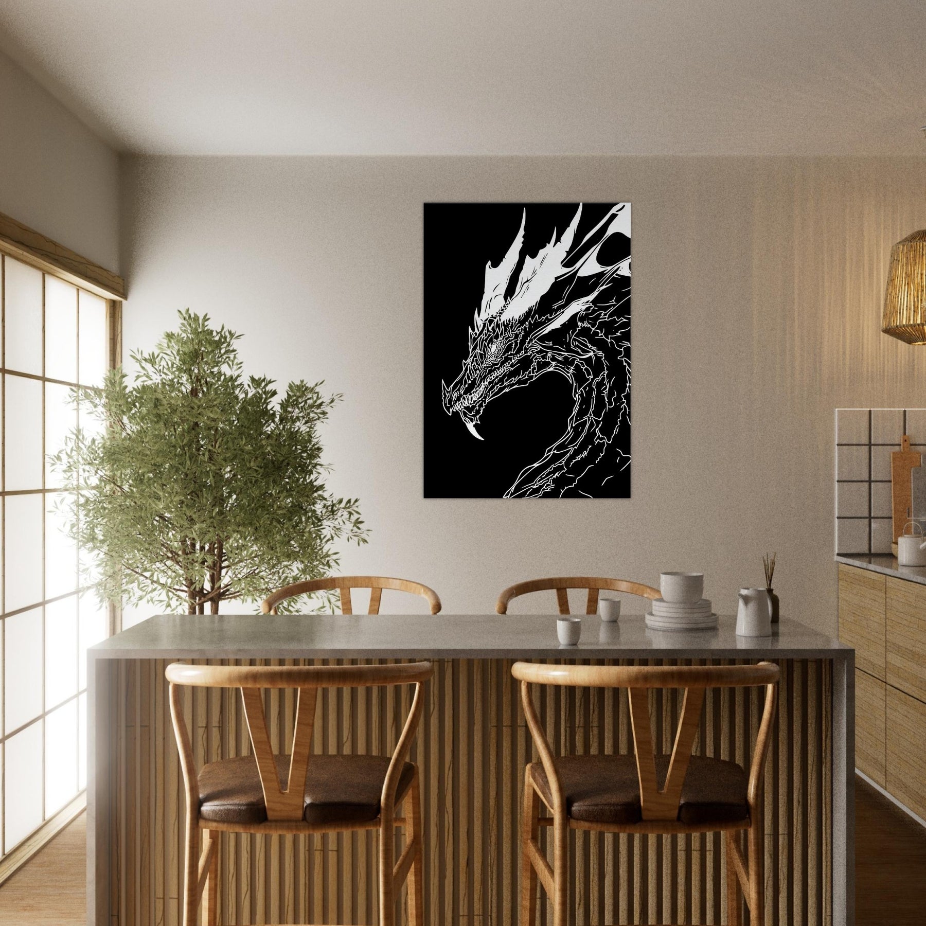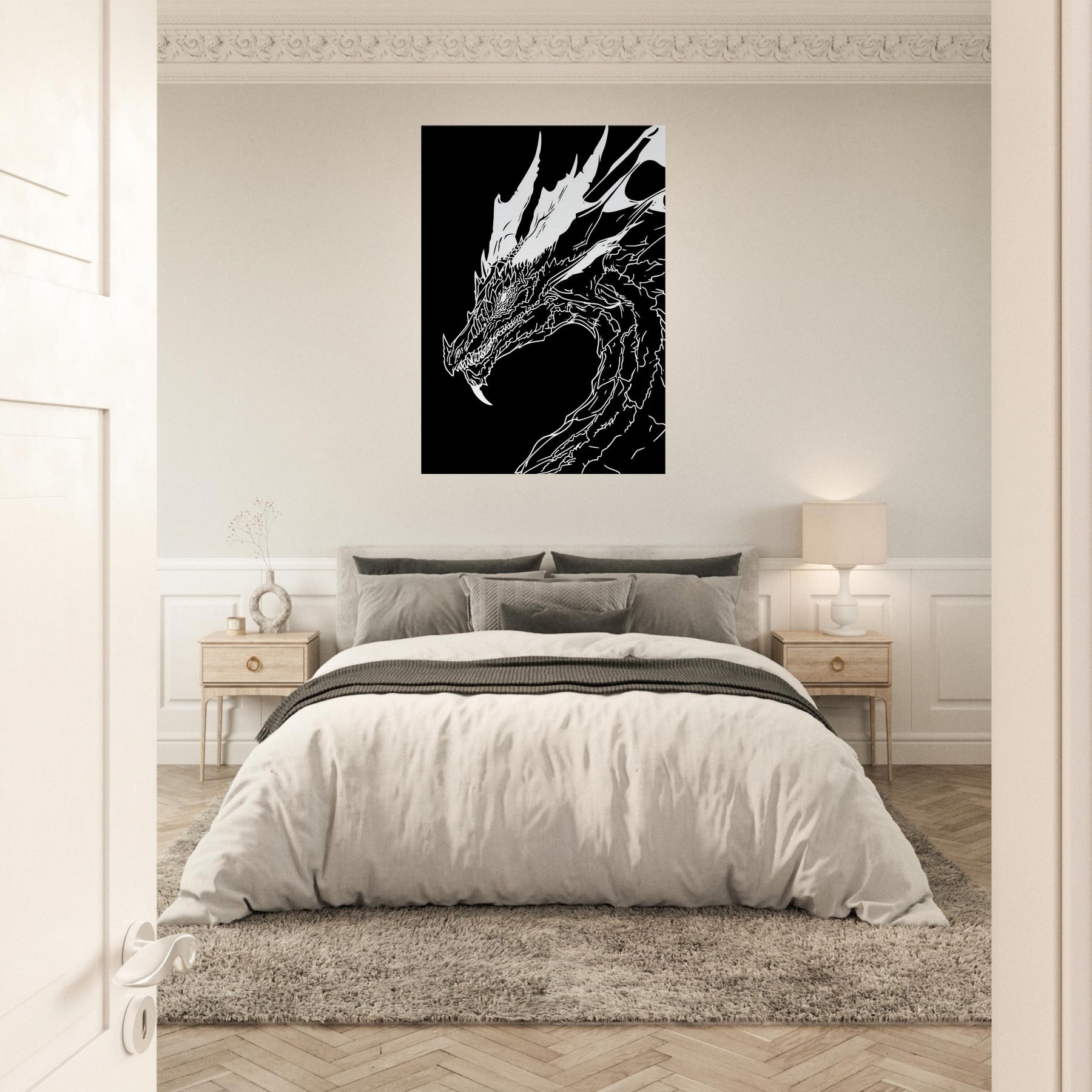 Across a field of jet black, the Majestic Dragon unfolds in pristine white line, a study in motion and hush. This line art captures the creature’s ancient, wind slicked form with delicate precision, inviting the gaze to linger on every tapering spine and sinew. It brings a sense of mythic scale to any room, lending drama without distraction perfect above a sofa, in a quiet corridor, or above a desk where inspiration takes flight.