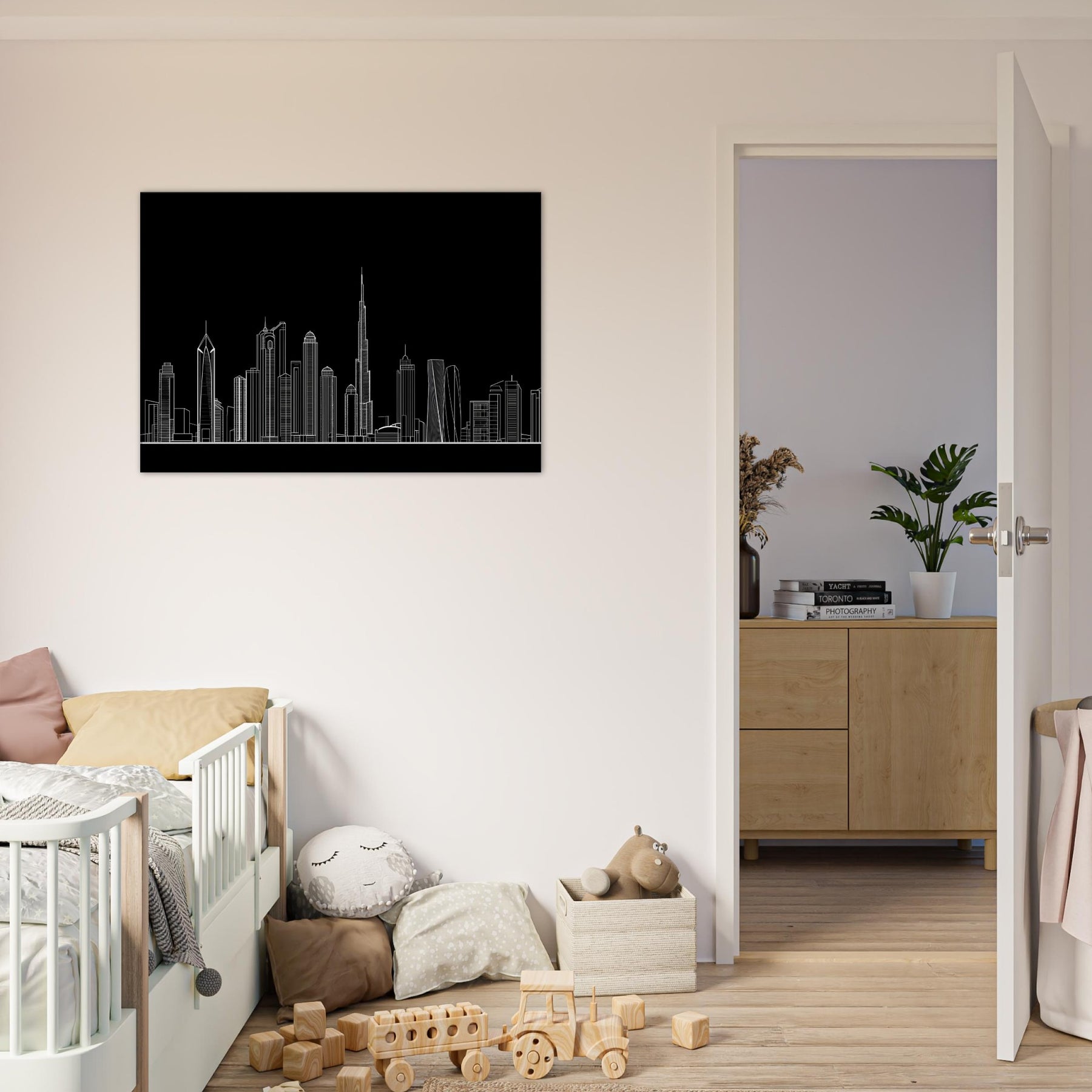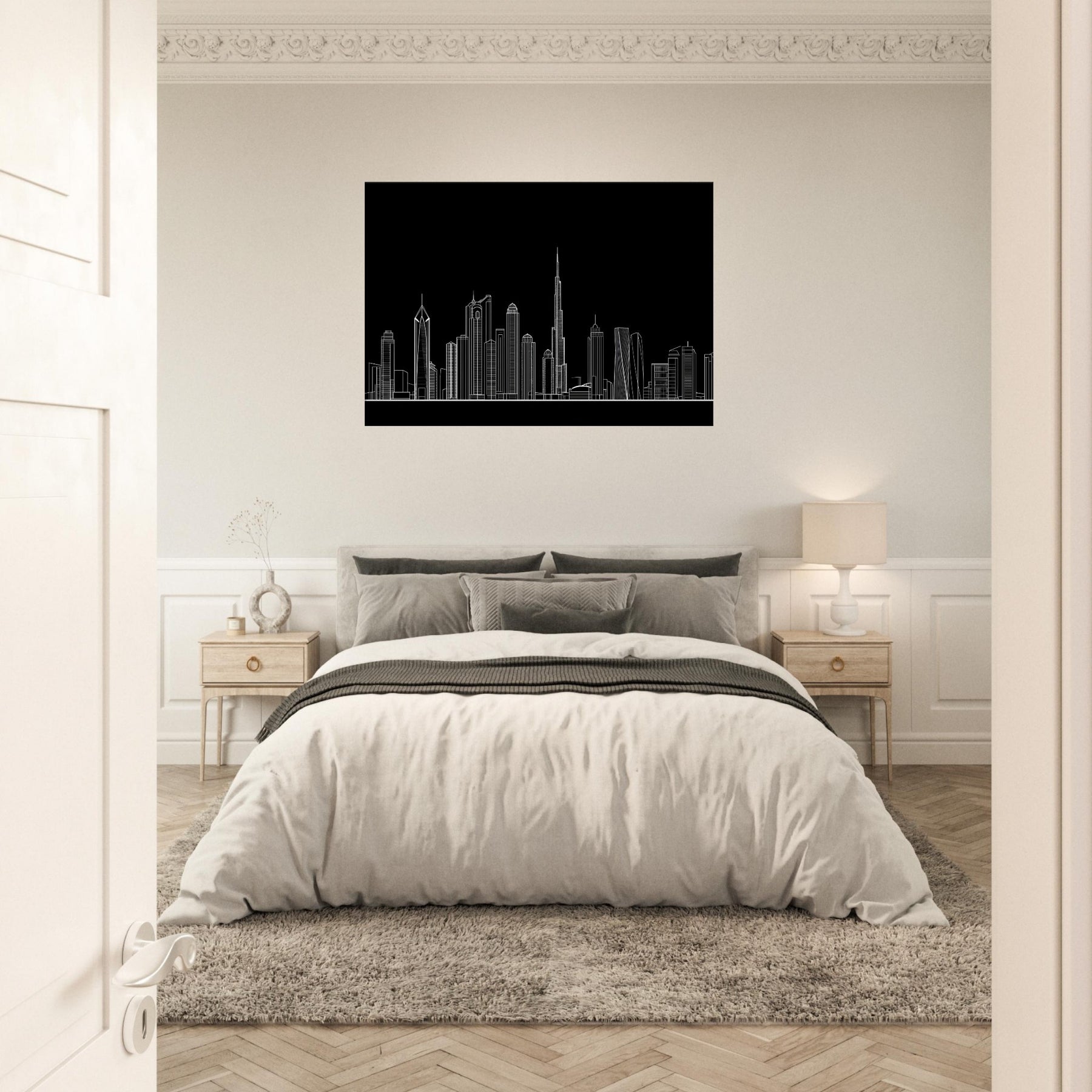 Dubai skyline rendered in clean white lines against a deep black field, this line art invites quiet wonder into any room. Each tower is reduced to a graceful gesture, preserving the city’s energy while offering breathing room for the eye. The composition distances itself from clutter, letting space breathe and light play along the walls. Perfect above a sofa or in a hallway, it enhances living spaces with a modern, architectural poetry calm, cinematic, and endlessly inspiring.