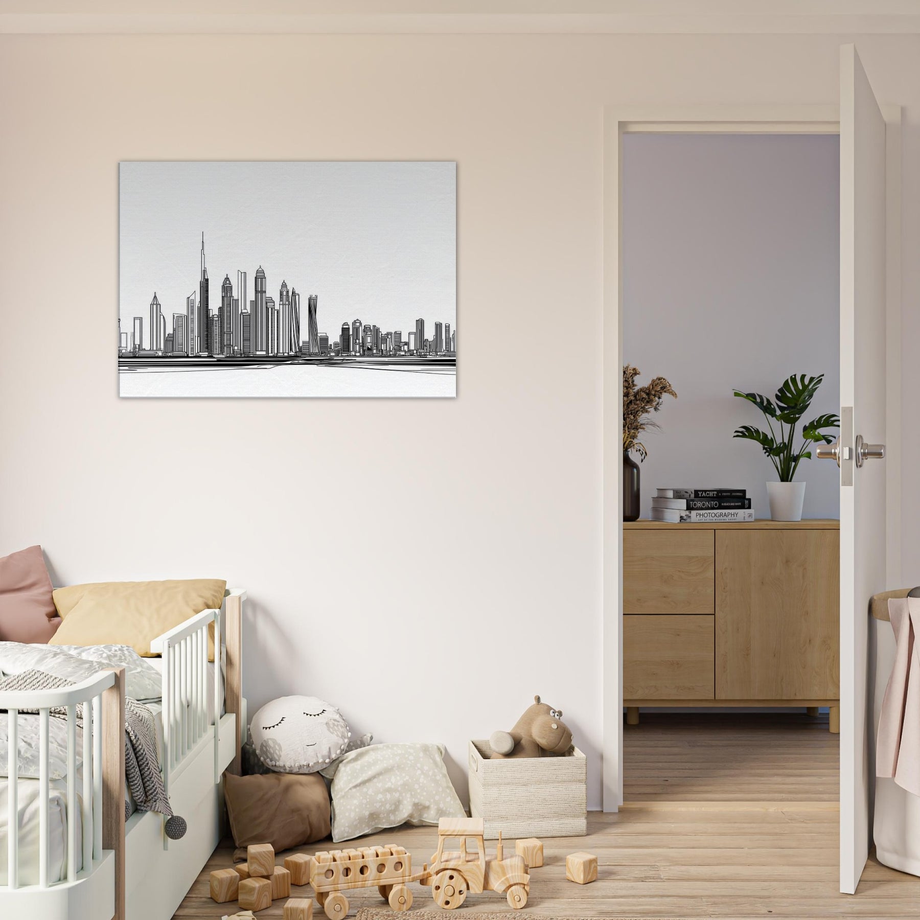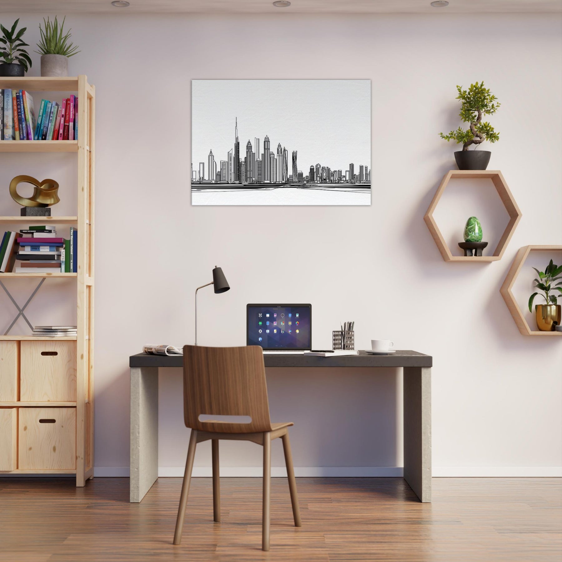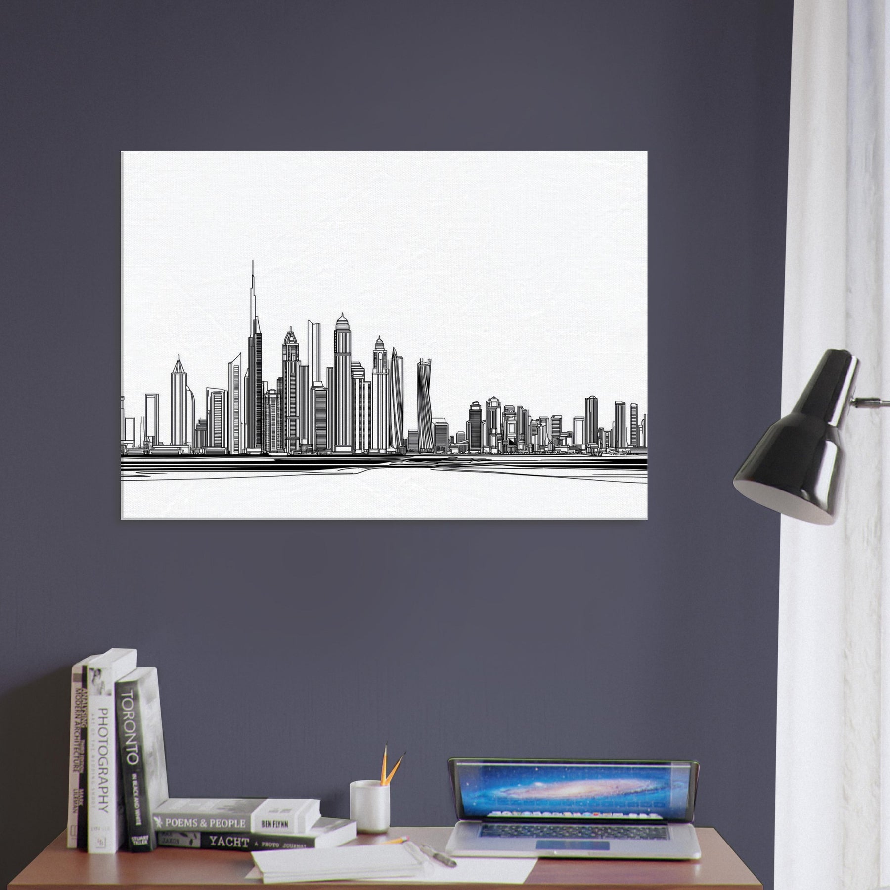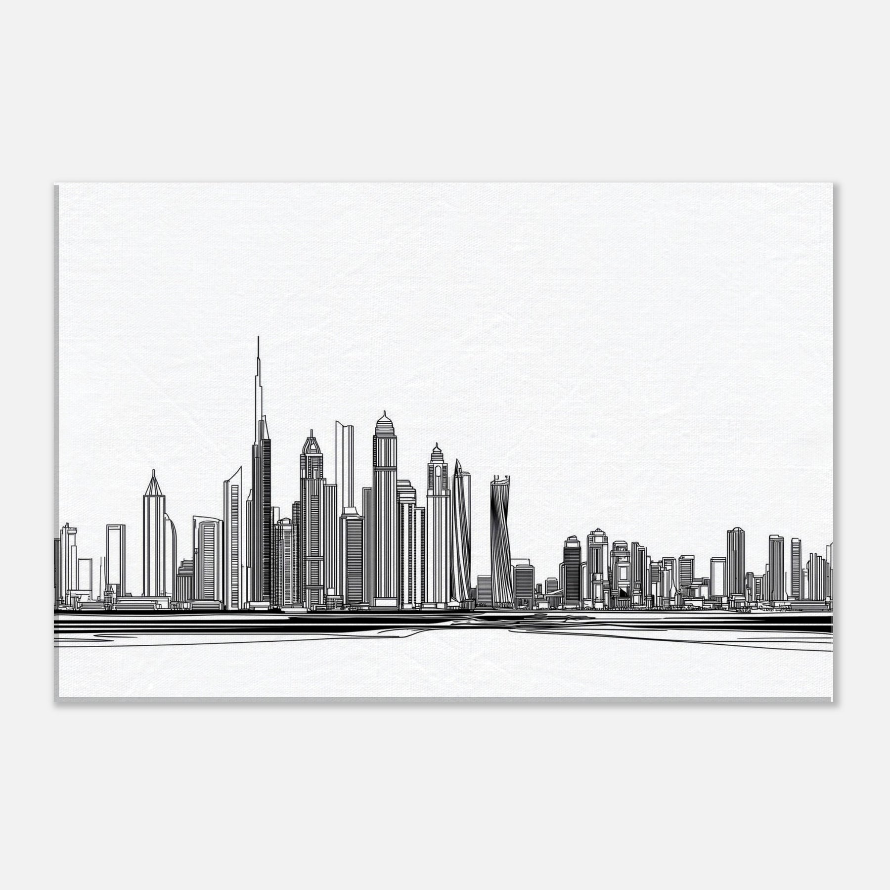 Dubai rises in a delicate procession of lines, a cityscape boiled down to a whisper of ink. This line art skyline invites light to travel across walls, casting slender shadows that shift with the day. Its monochrome simplicity pairs with warm woods and soft textiles, turning a living room into a calm horizon where every glance uncovers new geometry. The piece feels both timeless and contemporary an elegant reminder of ambition, dunes turned to architecture, and the serene pulse of a city by the sea.