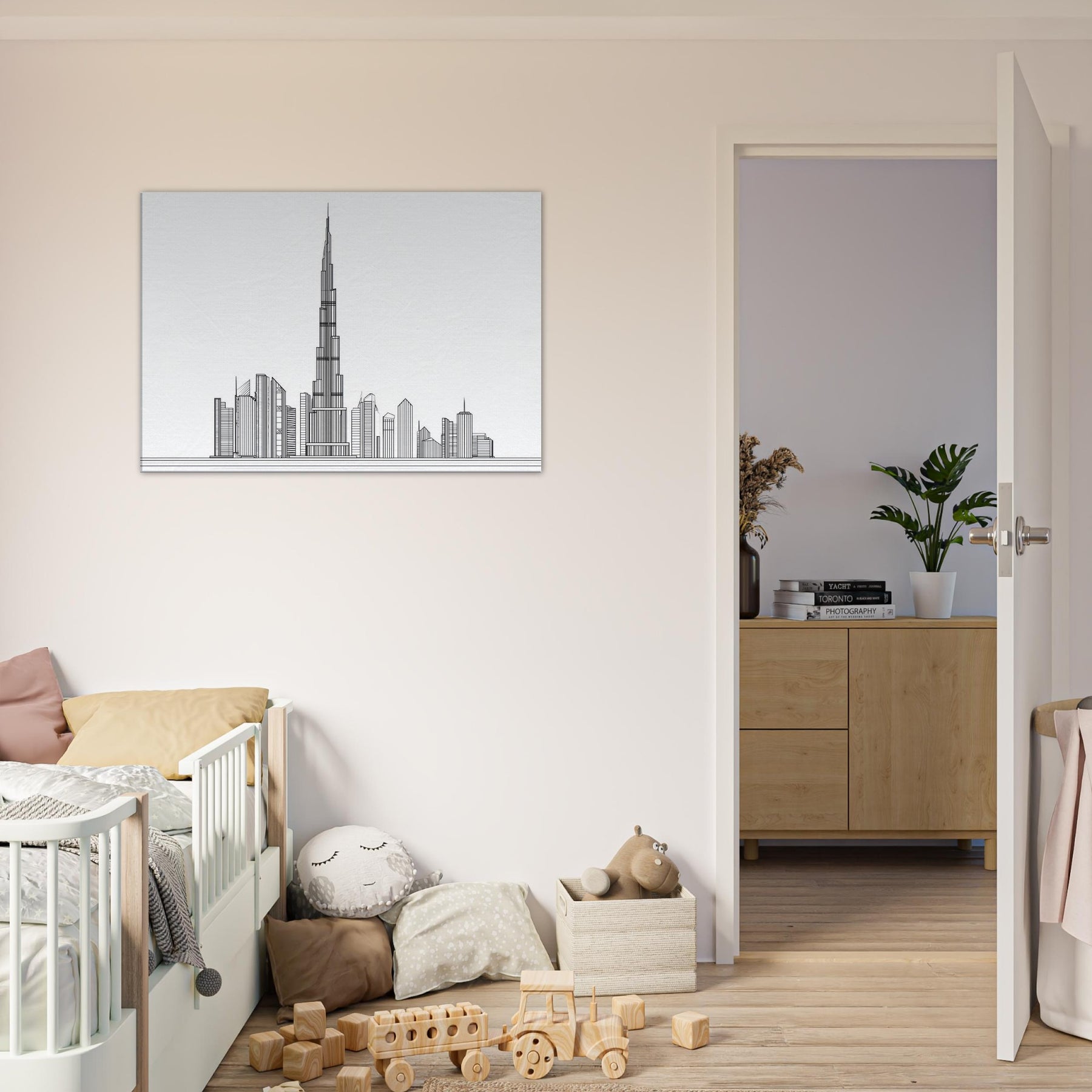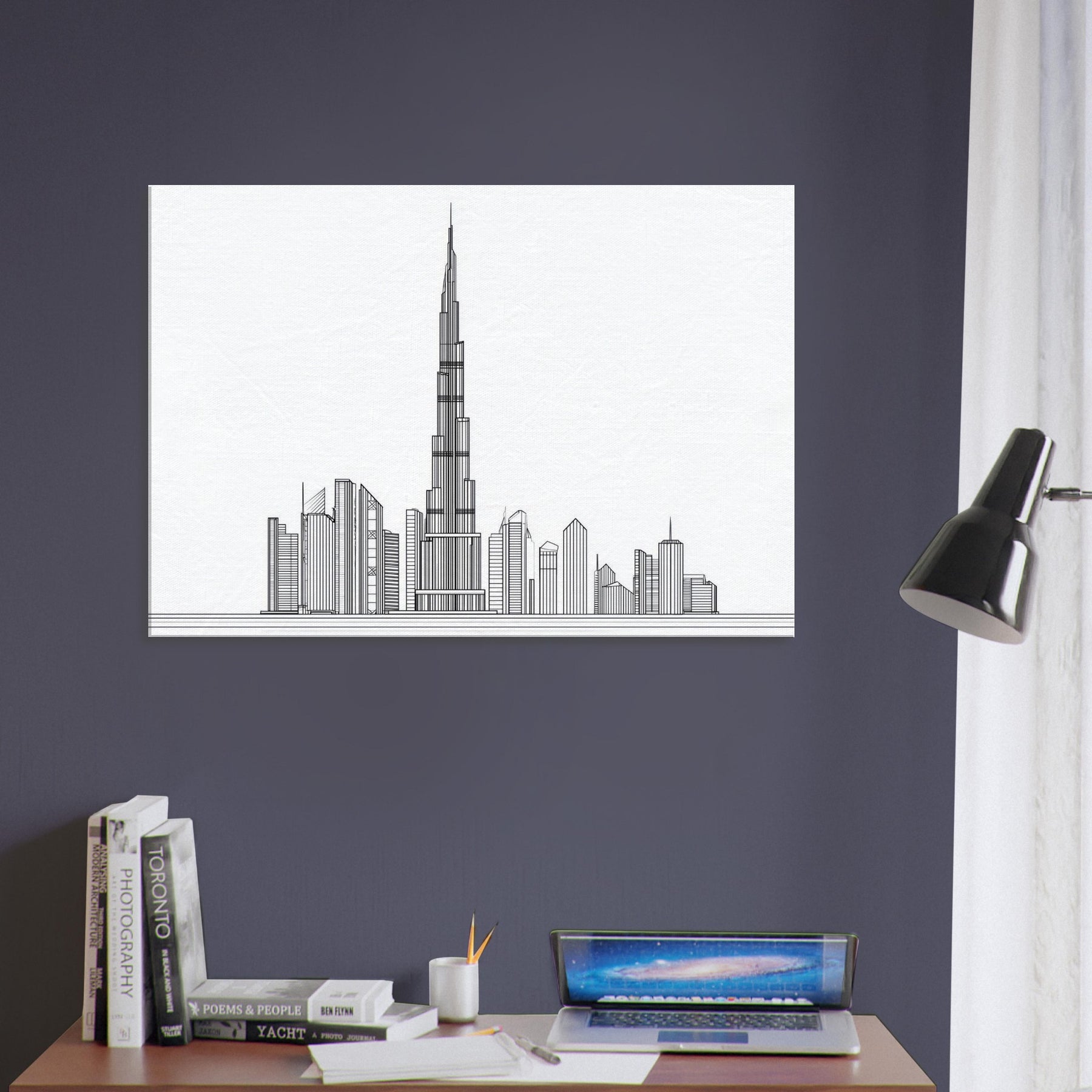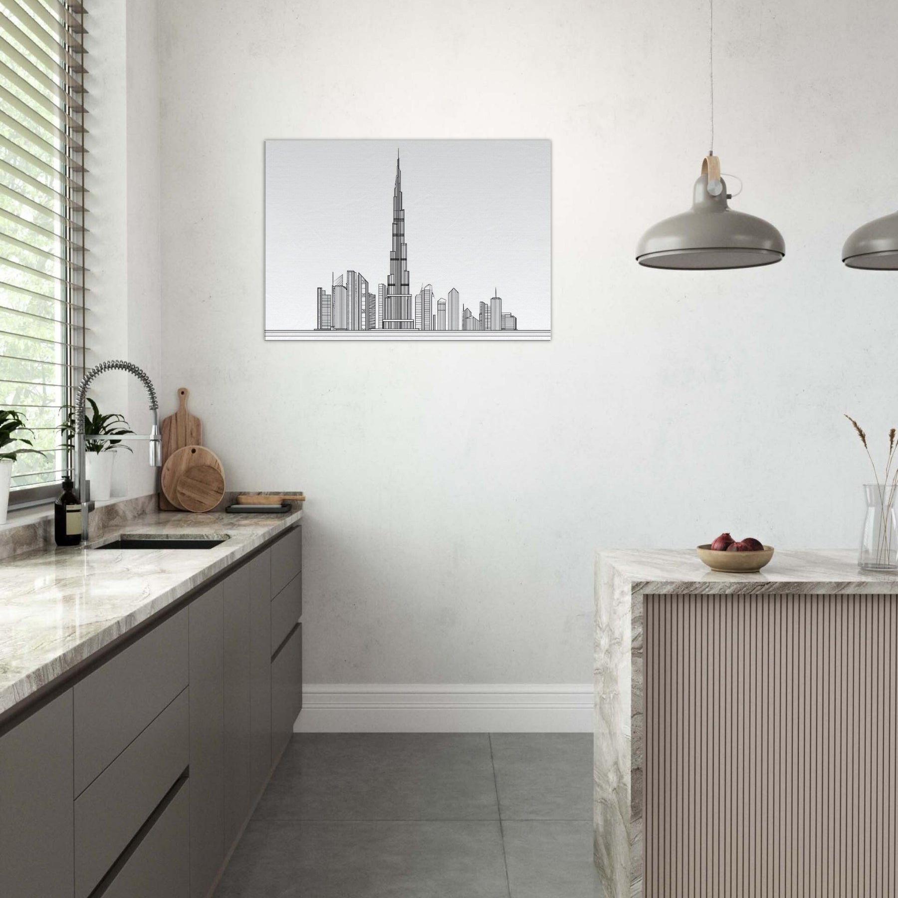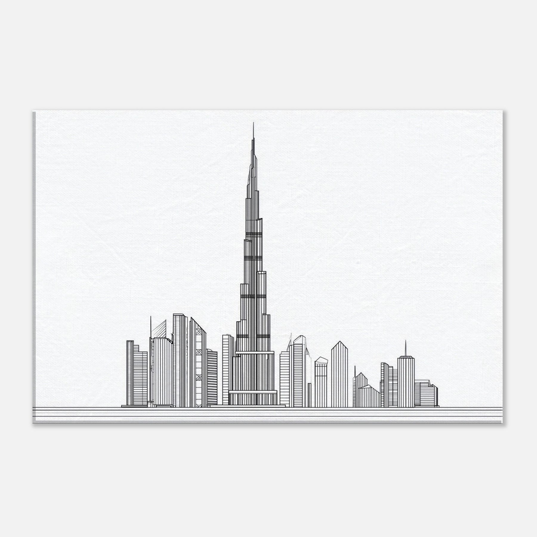 An elegant whisper of steel and sky, this line art rendering centers the Burj Khalifa against a serene, blank panorama. The precise, continuous strokes trace the tower's ascent, while the surrounding silhouettes dissolve into a minimal rhythm a city's heartbeat distilled to a single breath. In living spaces, it invites quiet reflection, offering a calm, gallery like focus amid everyday bustle. The monochrome palette and generous negative space amplify light and texture, turning walls into a contemporary stage for architecture's timeless poetry.