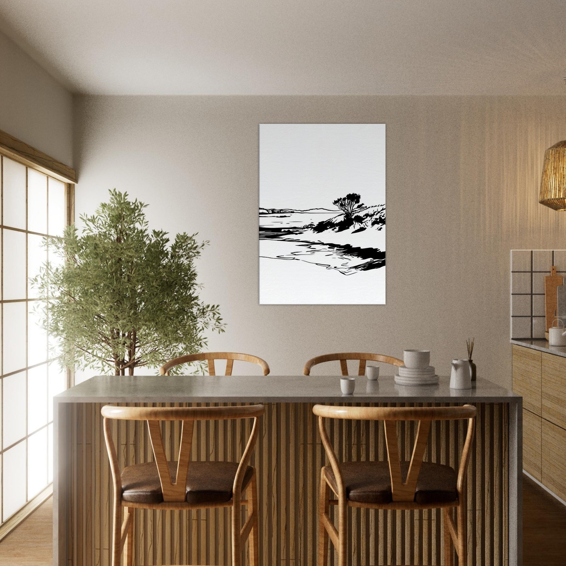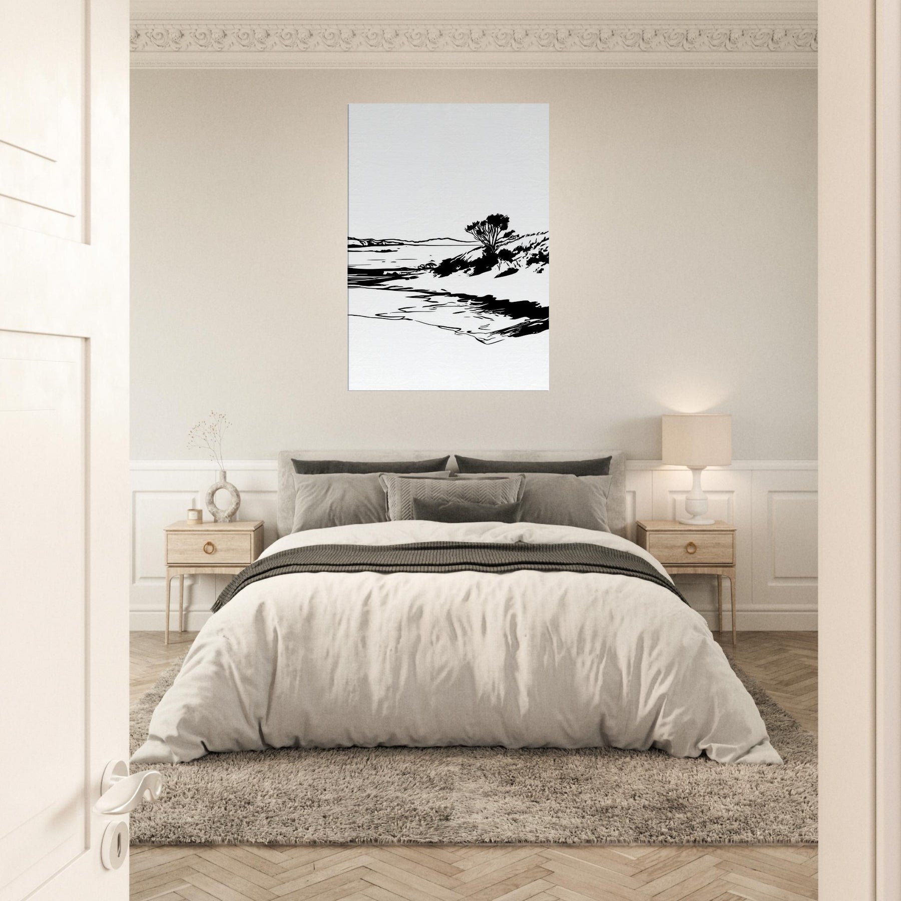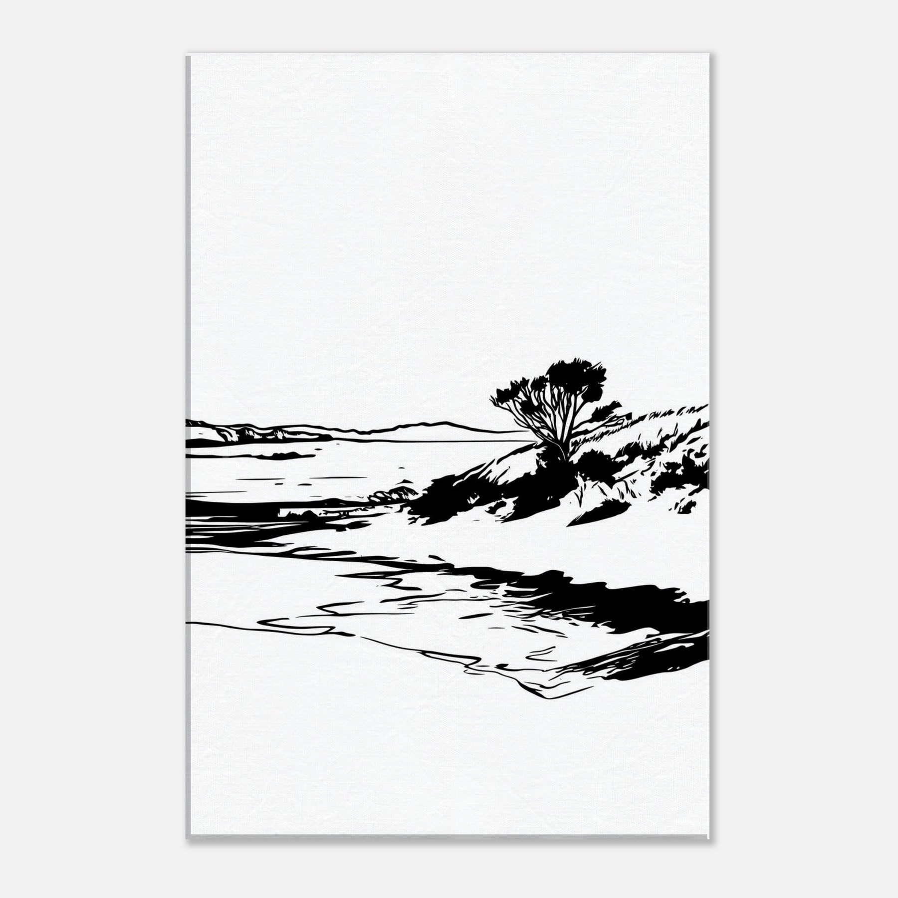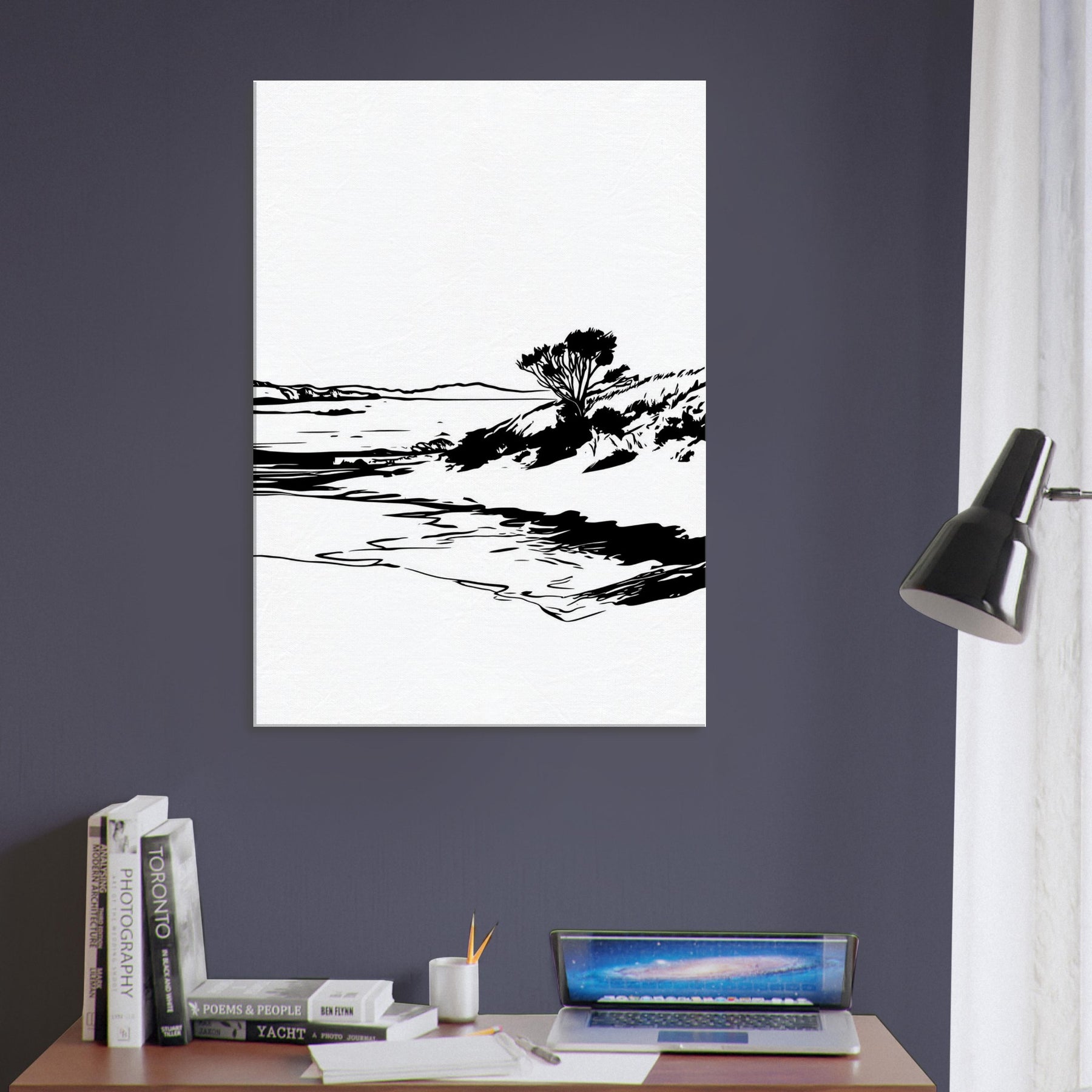 Coastal Dunes unfolds as a restrained line drawing that carries the hush of sea wind and the patience of salt swept sand. The stark contrast of black ink against white evokes tidal rhythms, wind worn grasses, and a lone tree standing sentinel by the shore. This elegant piece brings a breath of shoreline calm into your living space, pairing modern simplicity with nature's poetry. Ideal above a sofa or in a hallway, it invites quiet contemplation and a subtle, airy atmosphere.