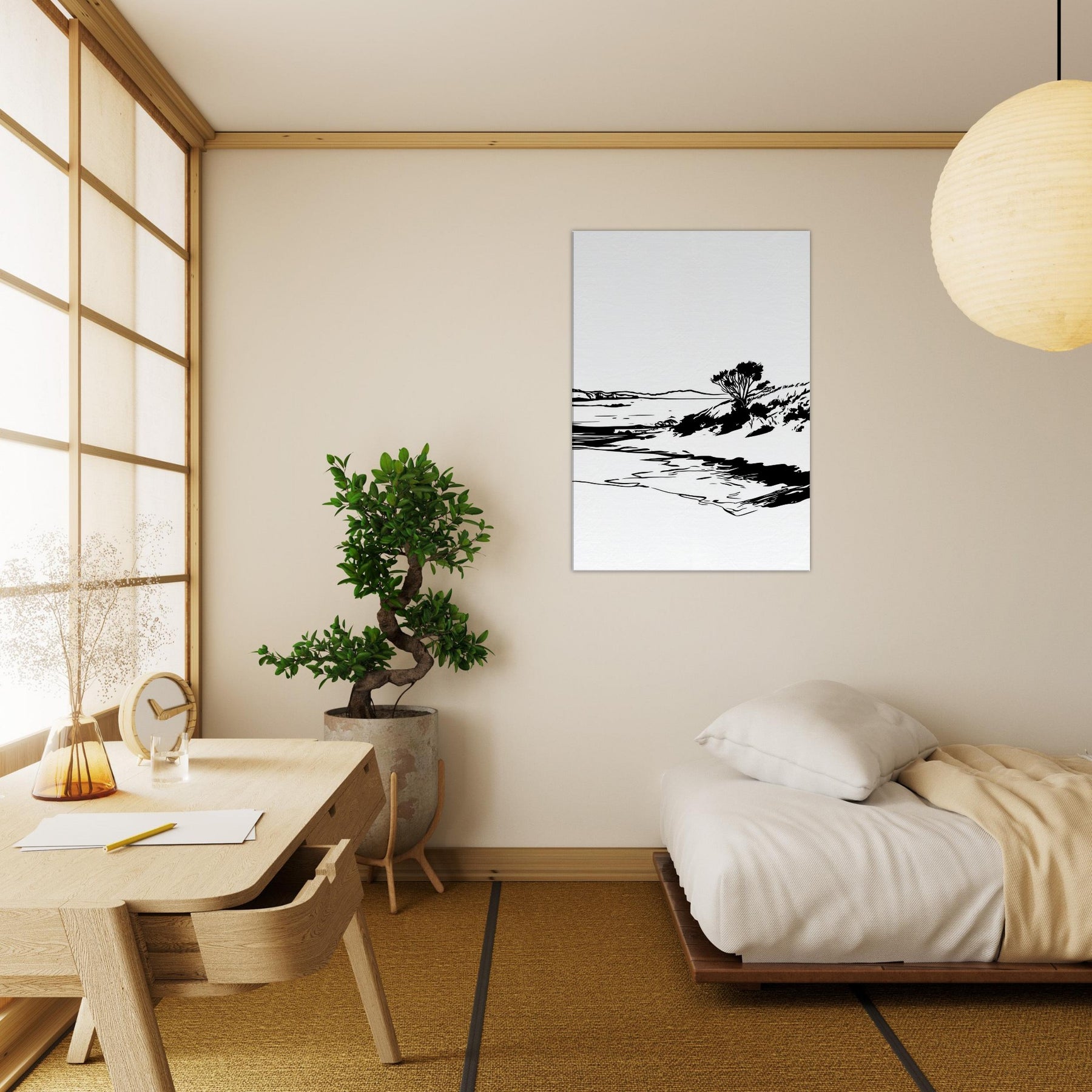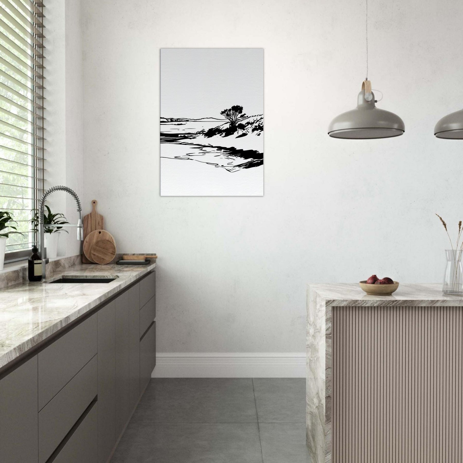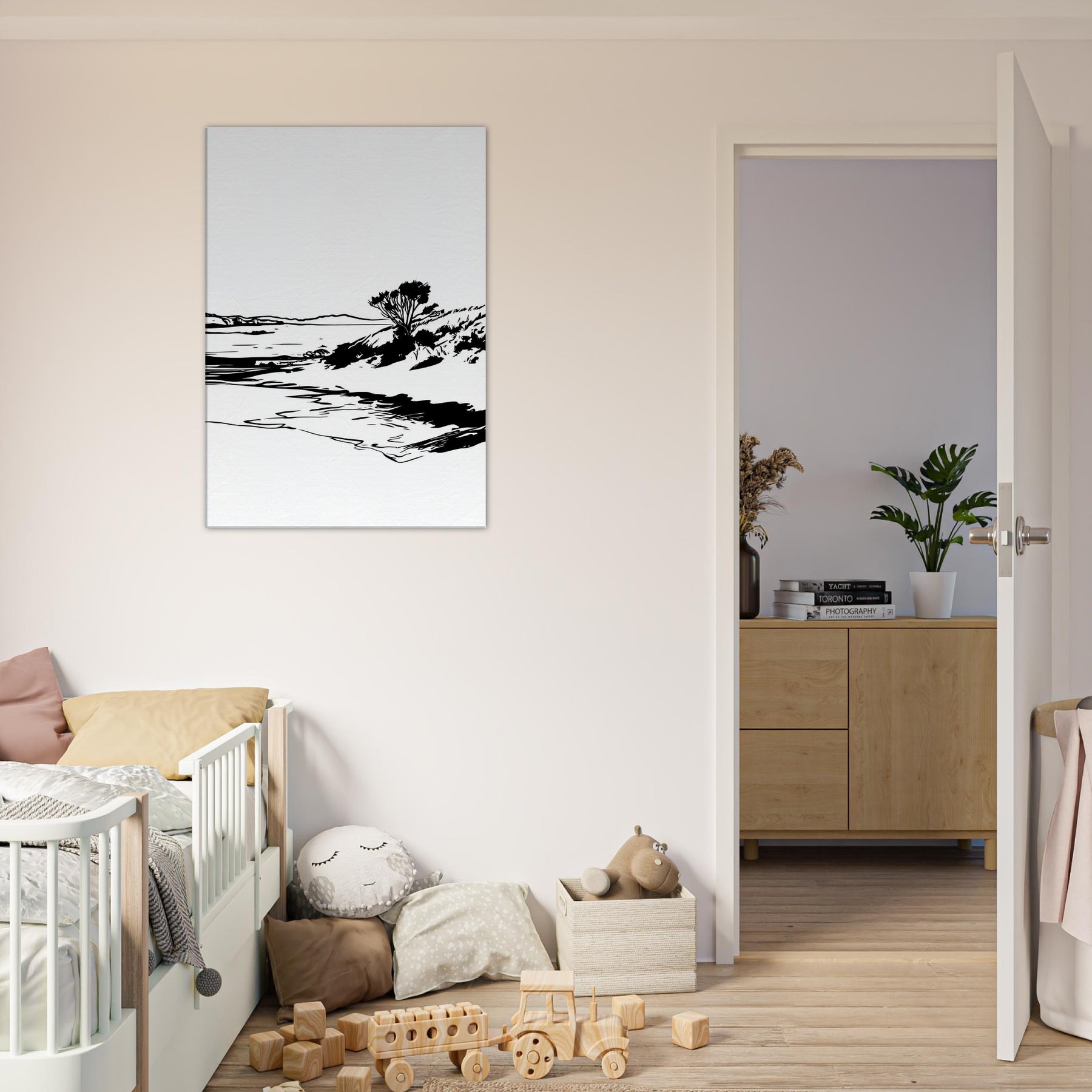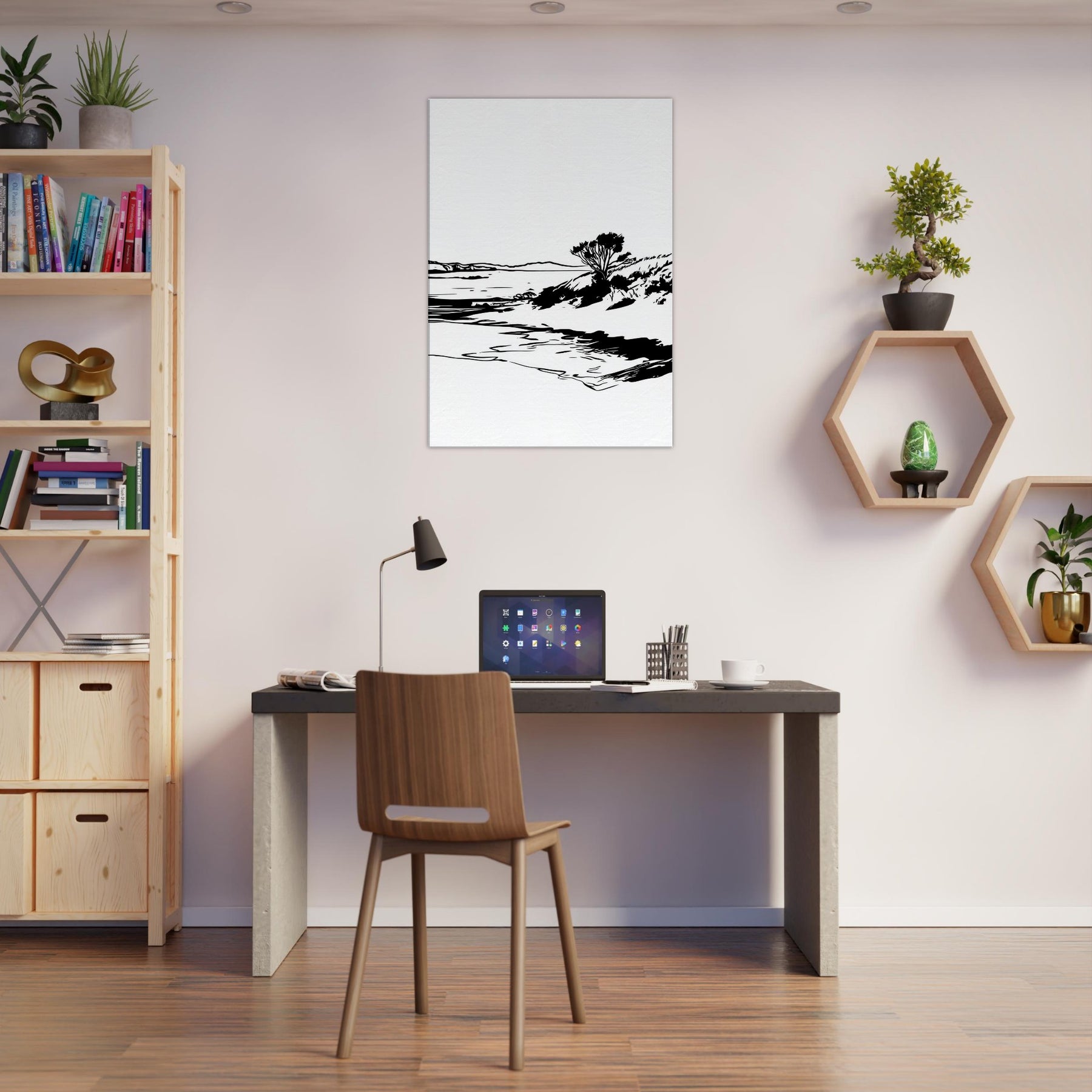 Coastal Dunes unfolds as a restrained line drawing that carries the hush of sea wind and the patience of salt swept sand. The stark contrast of black ink against white evokes tidal rhythms, wind worn grasses, and a lone tree standing sentinel by the shore. This elegant piece brings a breath of shoreline calm into your living space, pairing modern simplicity with nature's poetry. Ideal above a sofa or in a hallway, it invites quiet contemplation and a subtle, airy atmosphere.