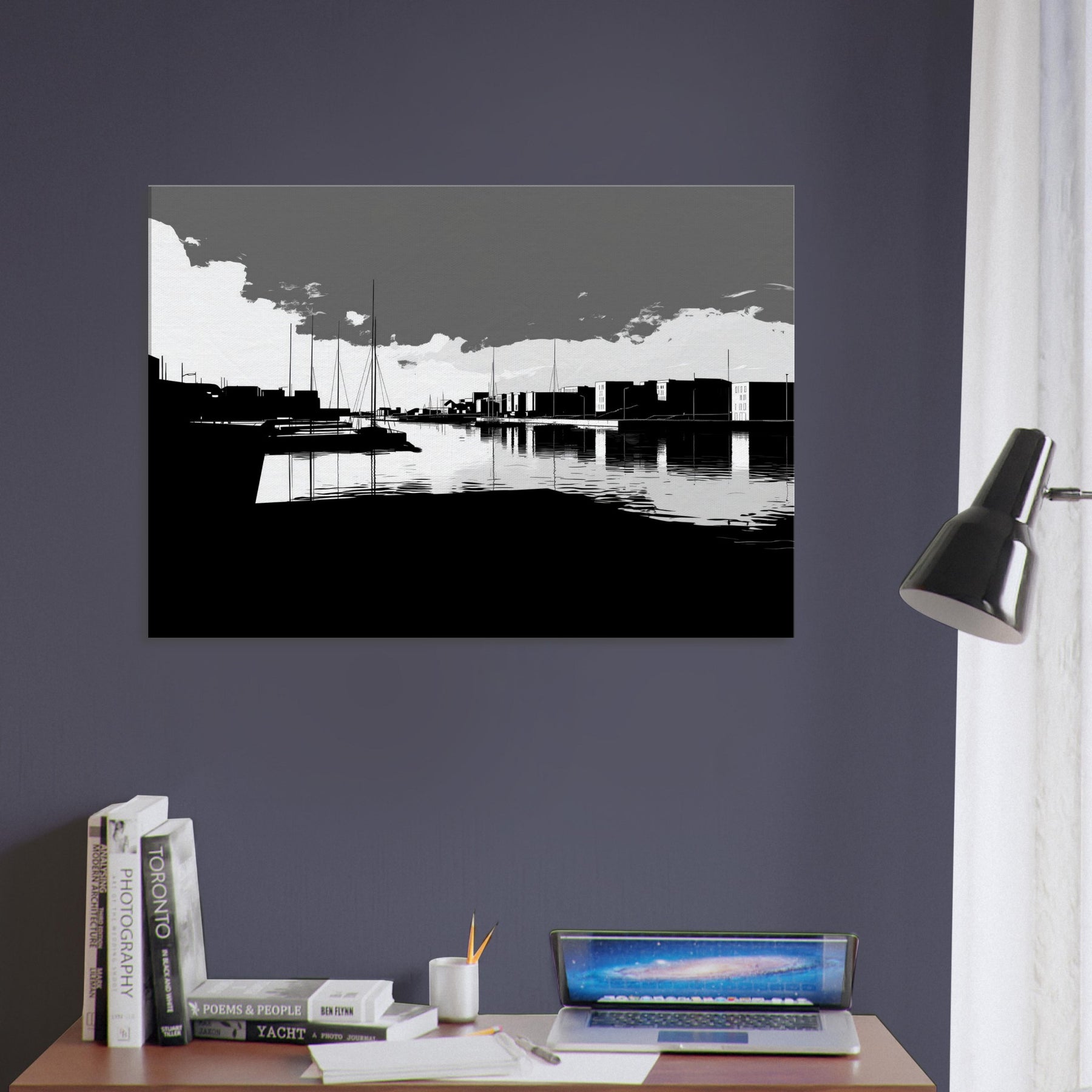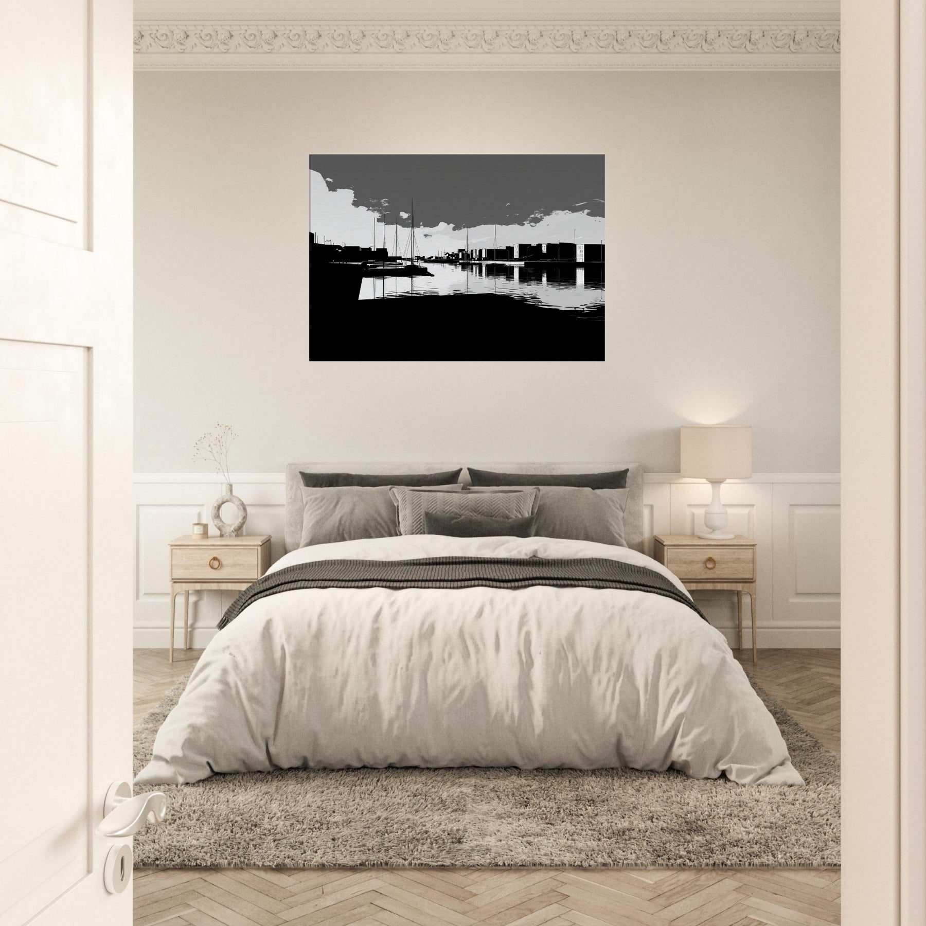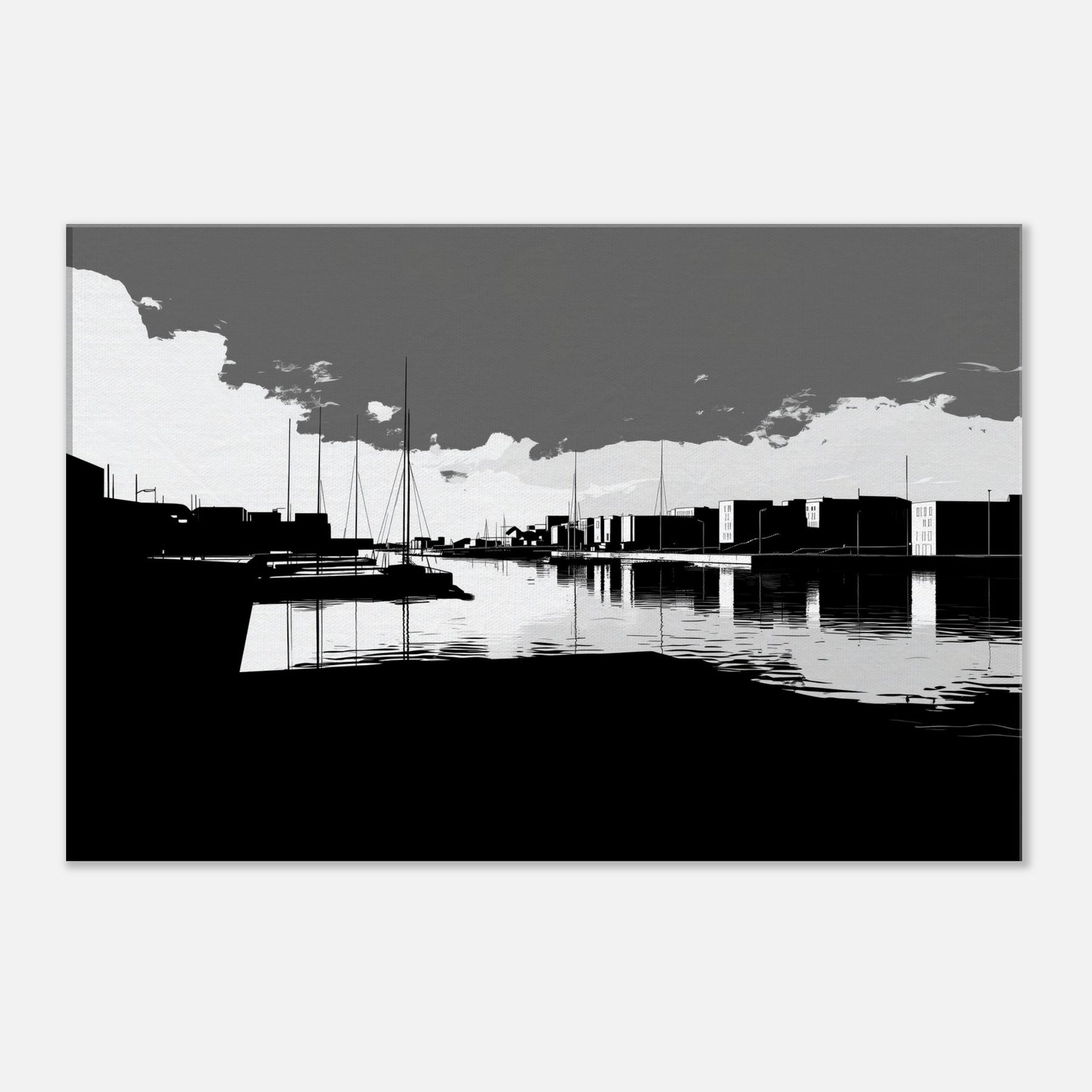Harbor unfolds in crisp, continuous lines, where sails rise like quiet punctuation against a spacious, monochrome sky. The water mirrors every stroke, a silver glaze that invites slow, contemplative breaths. This crisp line art captures the harbor’s urban poetry the docks, silhouettes, and distant towers without flourish, leaving space for imagination. In a living room, it brings refined contrast, quiet sophistication, and a serene tempo that pairs with modern furnishings, soft textures, and muted palettes, turning walls into a calm, architectural horizon.
