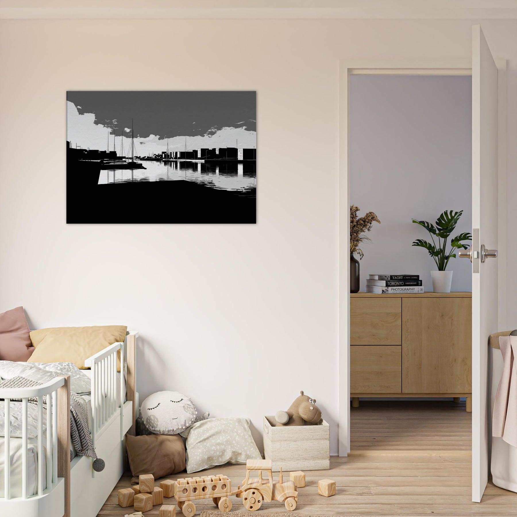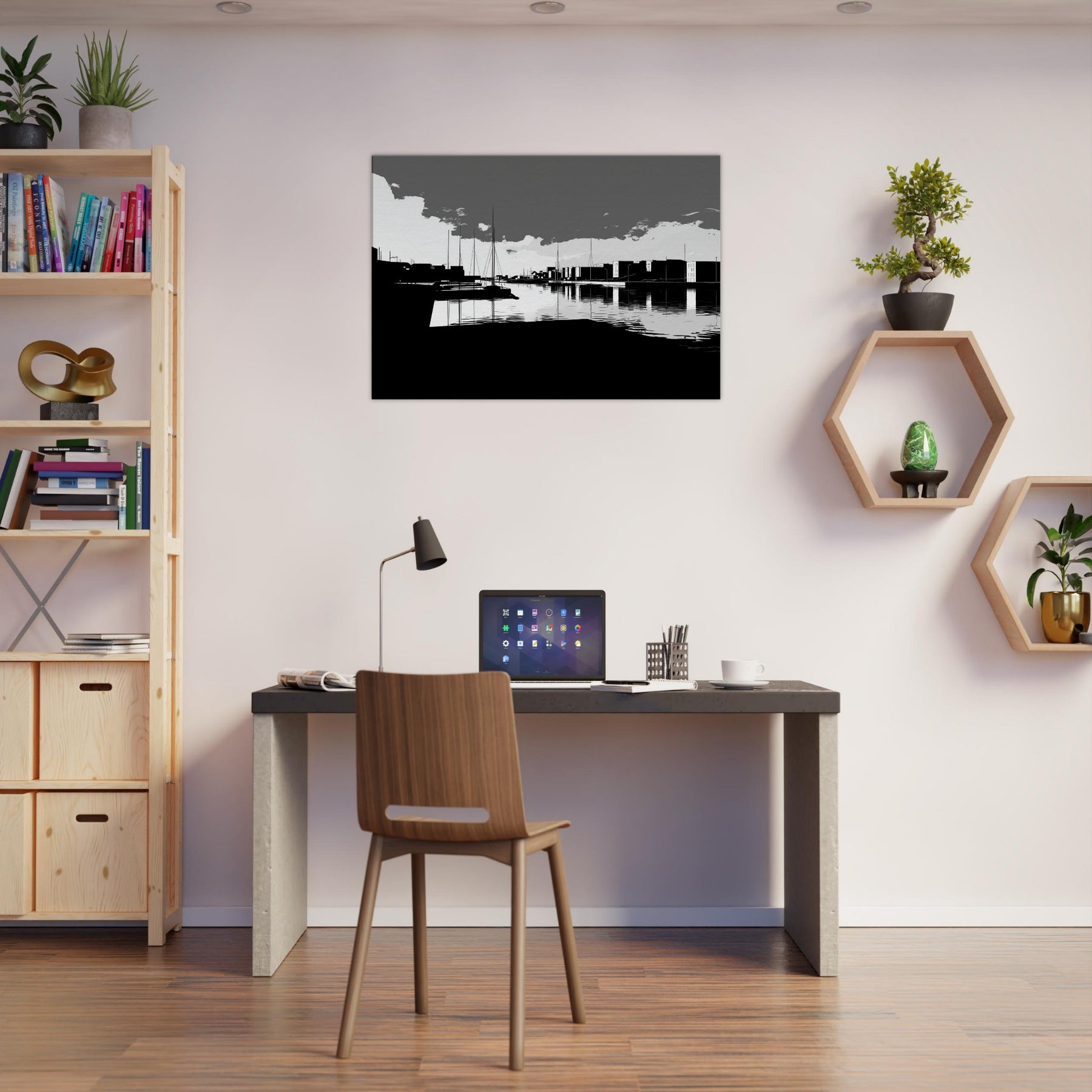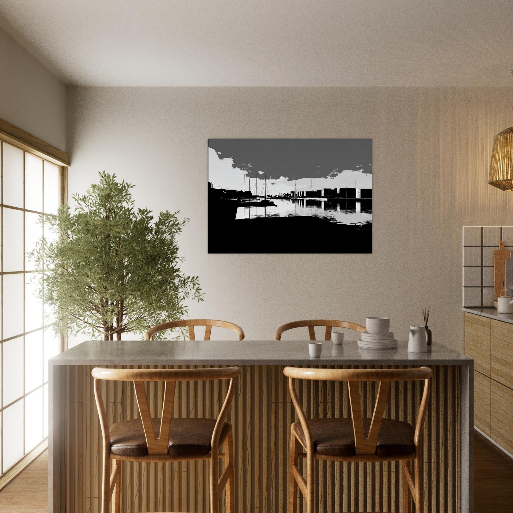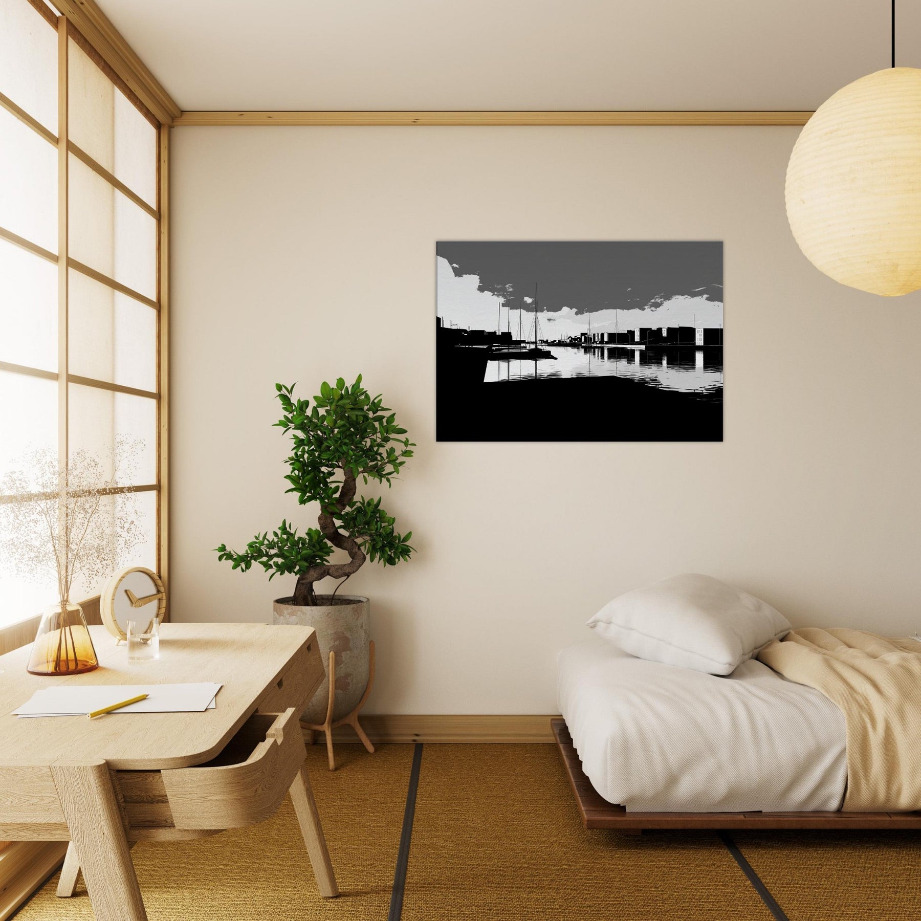 Harbor unfolds in crisp, continuous lines, where sails rise like quiet punctuation against a spacious, monochrome sky. The water mirrors every stroke, a silver glaze that invites slow, contemplative breaths. This crisp line art captures the harbor’s urban poetry the docks, silhouettes, and distant towers without flourish, leaving space for imagination. In a living room, it brings refined contrast, quiet sophistication, and a serene tempo that pairs with modern furnishings, soft textures, and muted palettes, turning walls into a calm, architectural horizon.