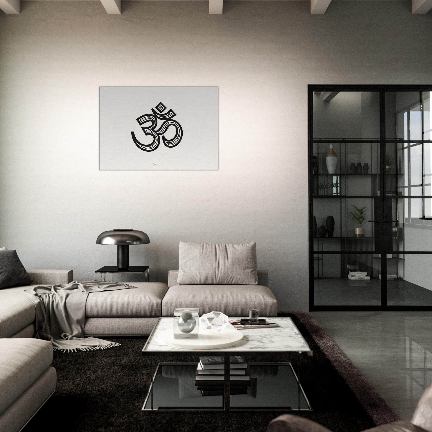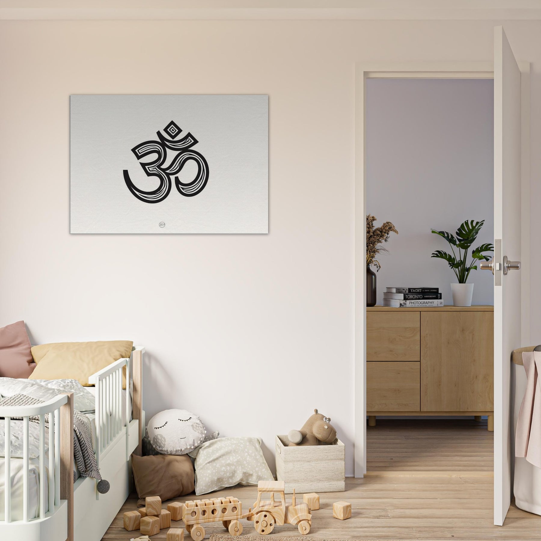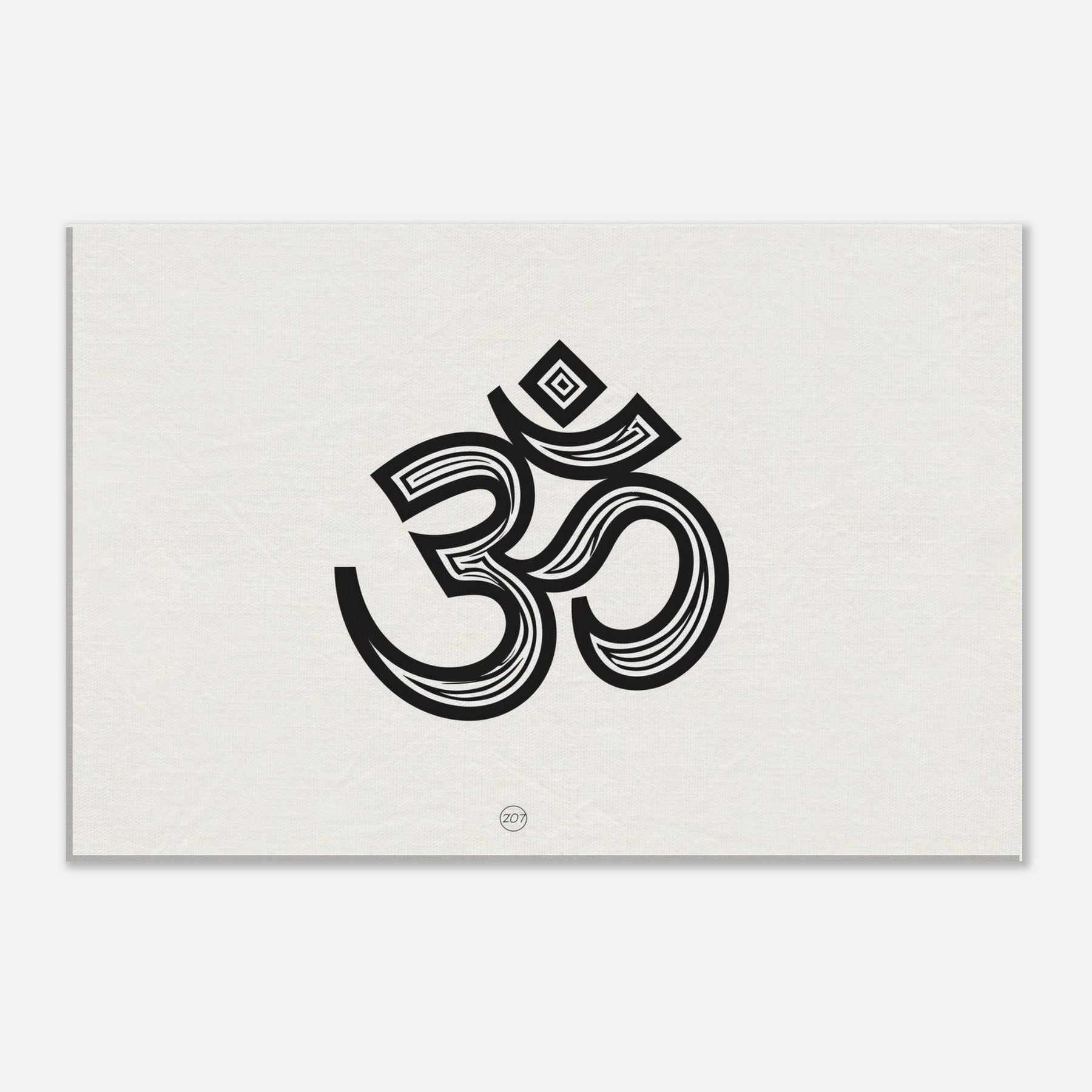 This piece centers on the Primary Subject: Om, rendered in bold, sinuous line work that rises and folds like a whispered mantra. The stark black forms against a warm cream field create a meditative stillness, inviting quiet contemplation in a living room or study. The generous negative space breathes with you, while the intricate curves suggest a rhythm you can feel in your chest. Hang it where morning light lands softly to elevate rituals, breath, and ordinary moments into something sacred. The central subject is Om (Aum Symbol).