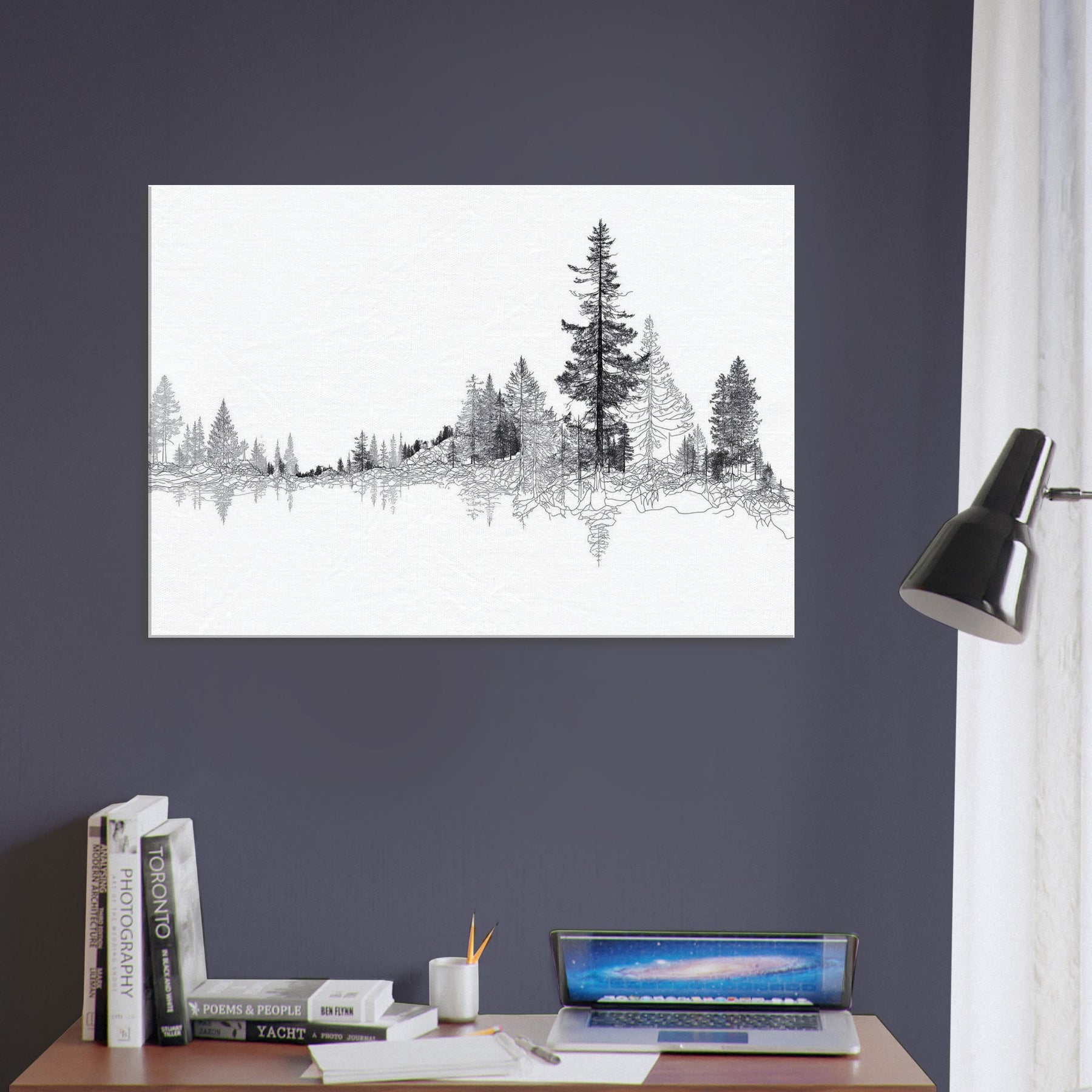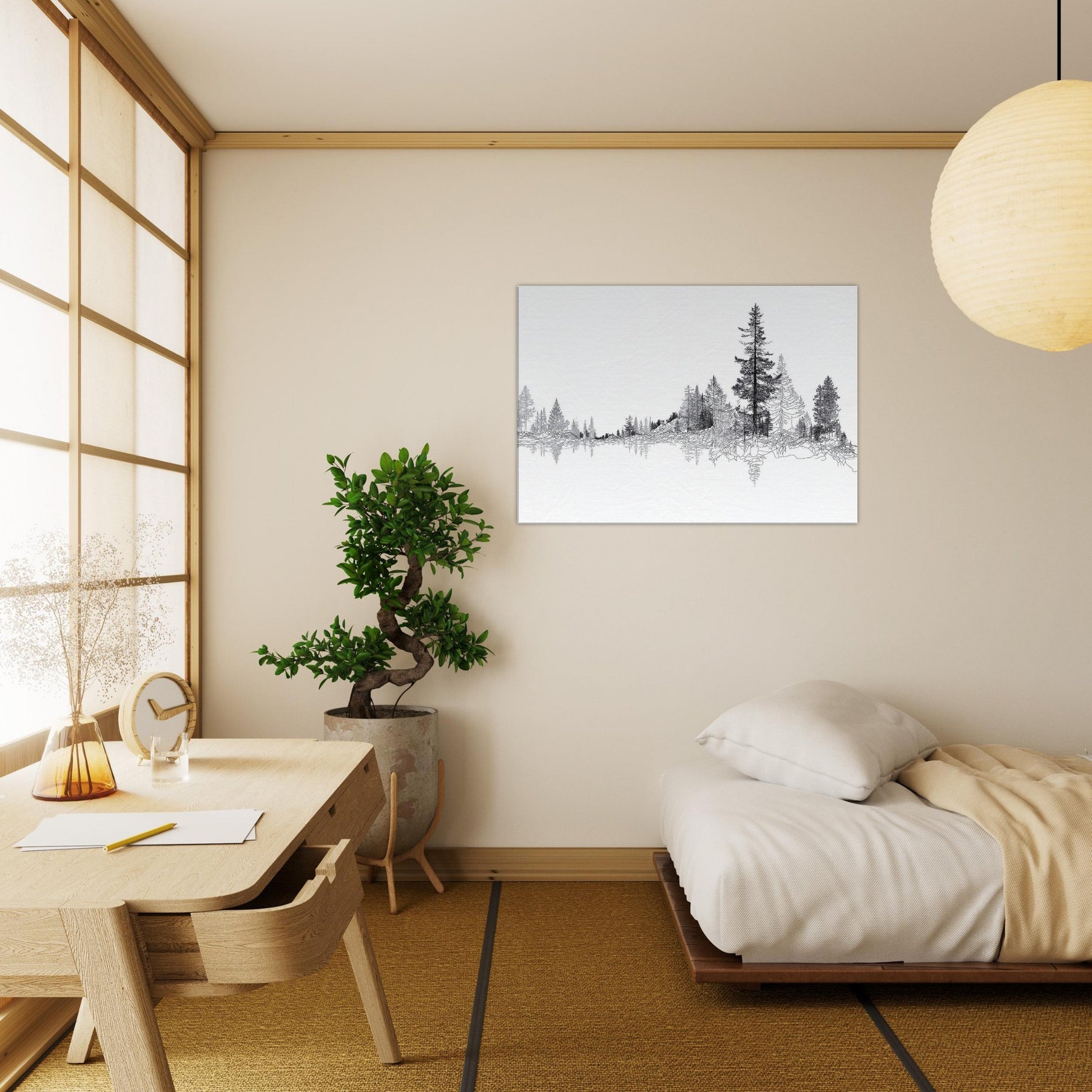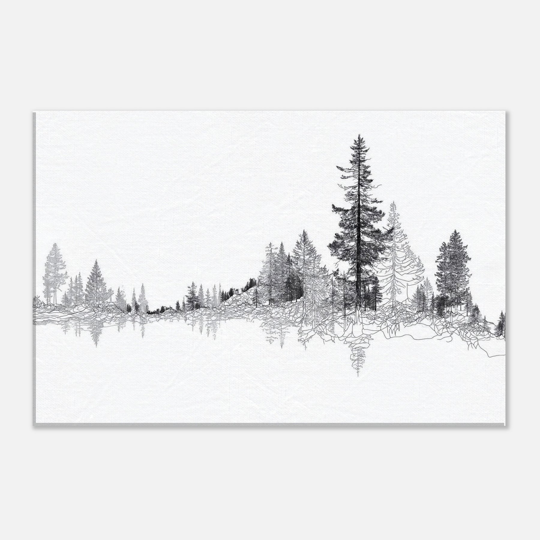 Immerse your space in the quiet majesty of the Boreal Forest. This line drawn panorama threads slender trees into a serene horizon, inviting the eye to wander and rest. The restrained black ink against pristine white evokes frost lit mornings and forest hush, turning walls into a living . Perfect for a tranquil living room or study, it adds a refined touch of nature’s architecture, pairing clean lines with a soft, contemplative mood that homes the soul.