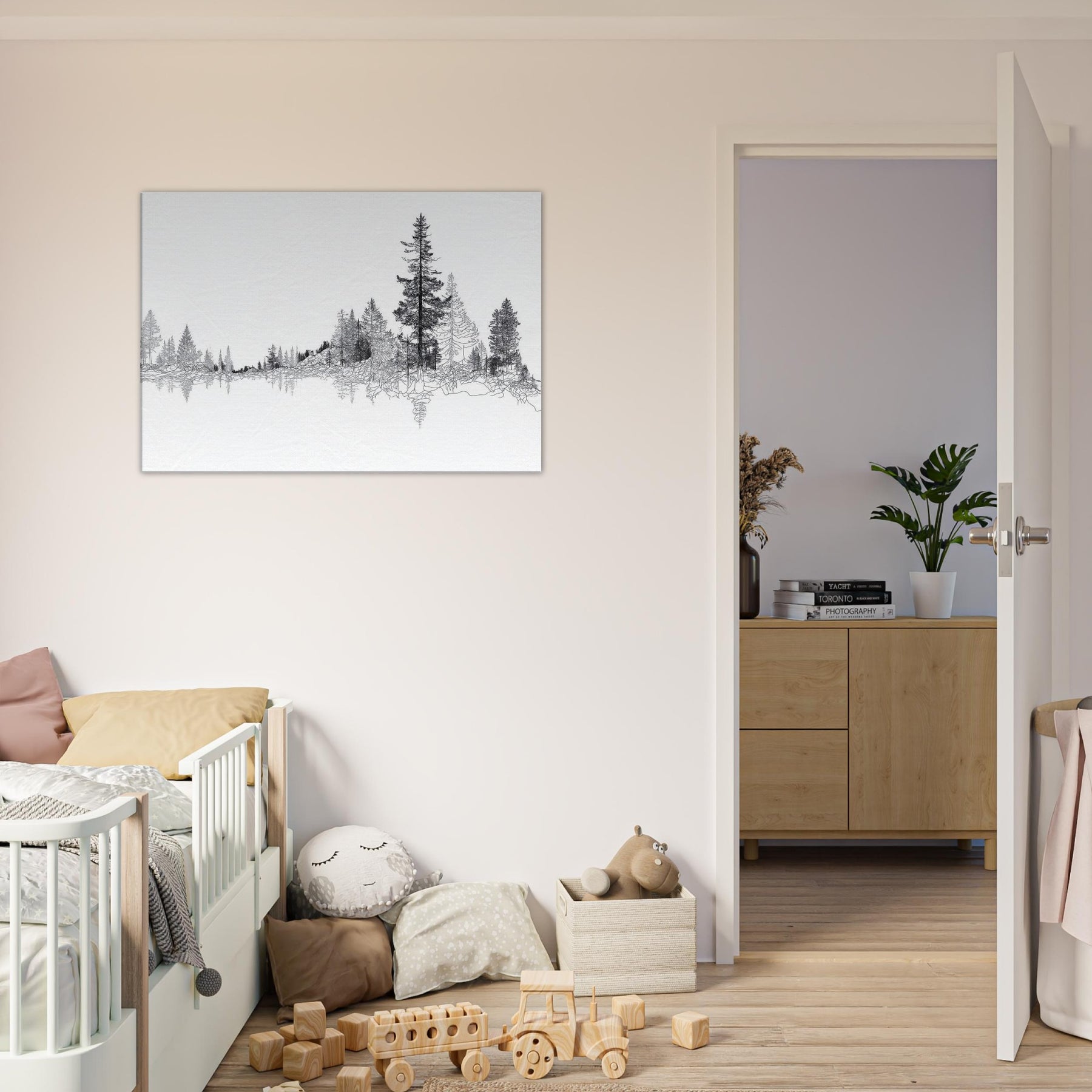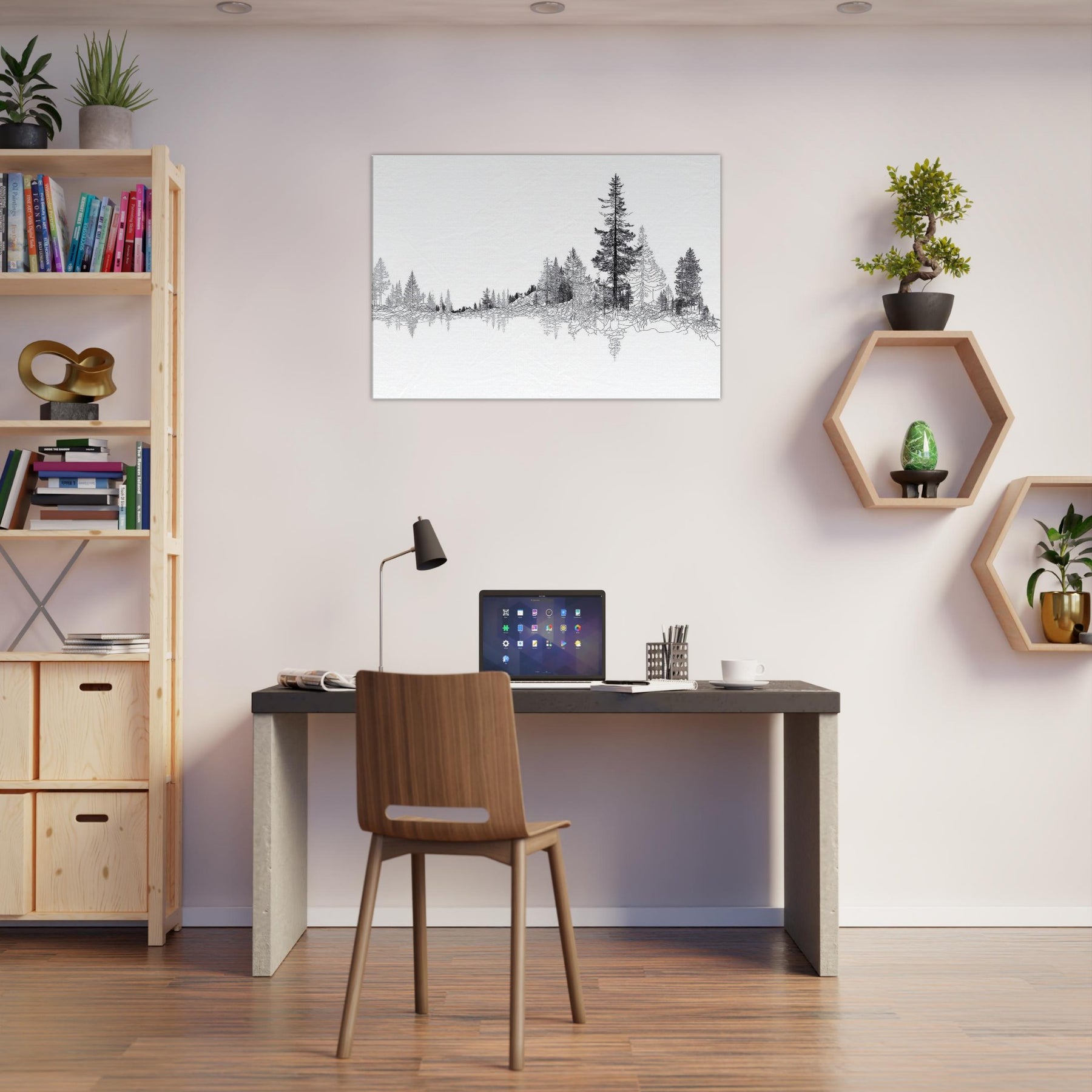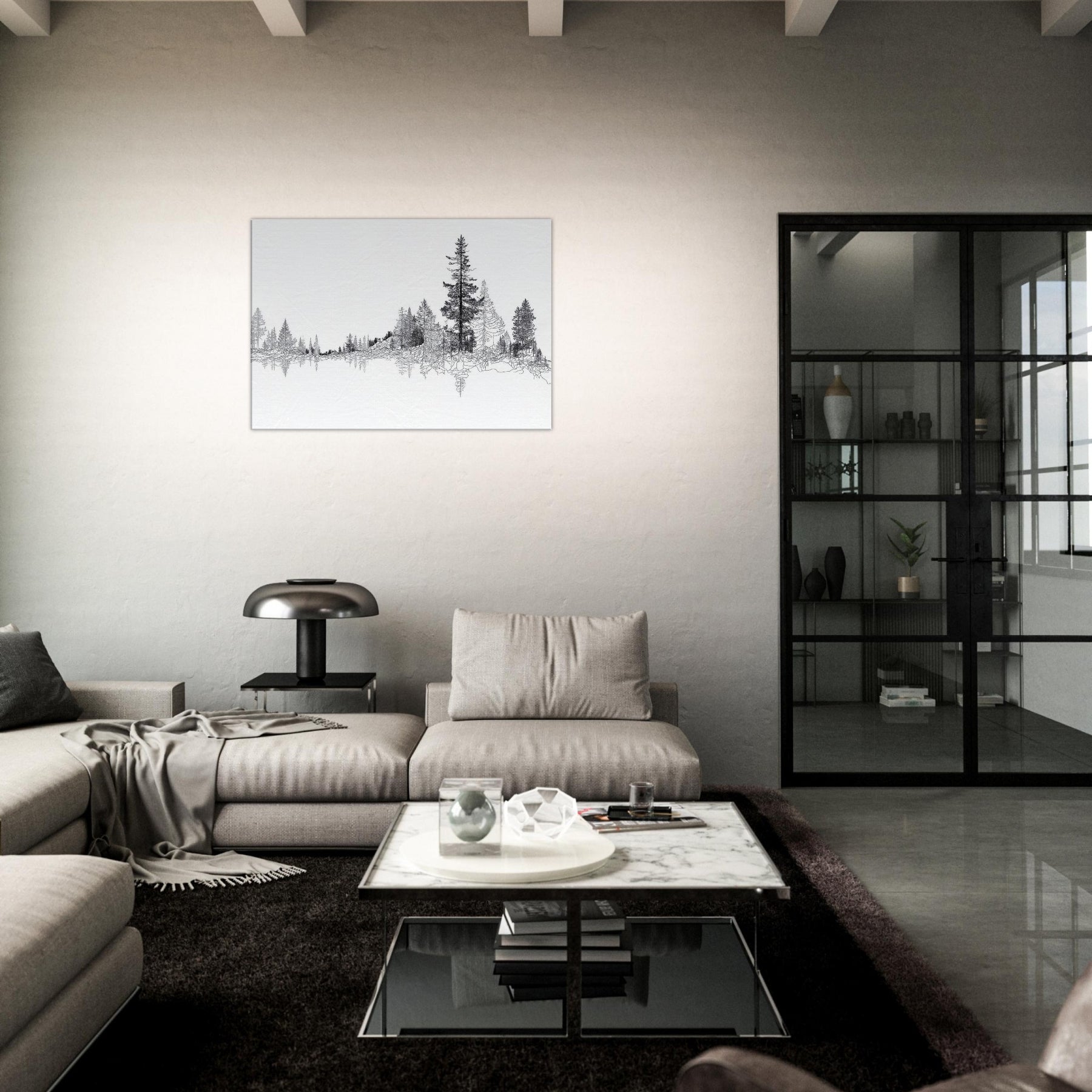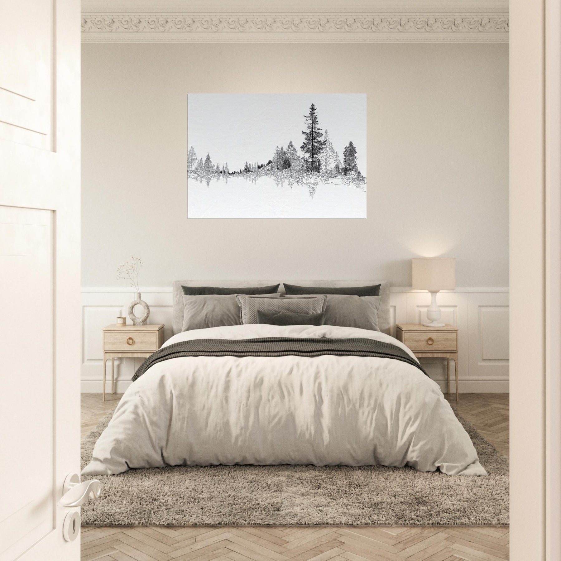 Immerse your space in the quiet majesty of the Boreal Forest. This line drawn panorama threads slender trees into a serene horizon, inviting the eye to wander and rest. The restrained black ink against pristine white evokes frost lit mornings and forest hush, turning walls into a living . Perfect for a tranquil living room or study, it adds a refined touch of nature’s architecture, pairing clean lines with a soft, contemplative mood that homes the soul.