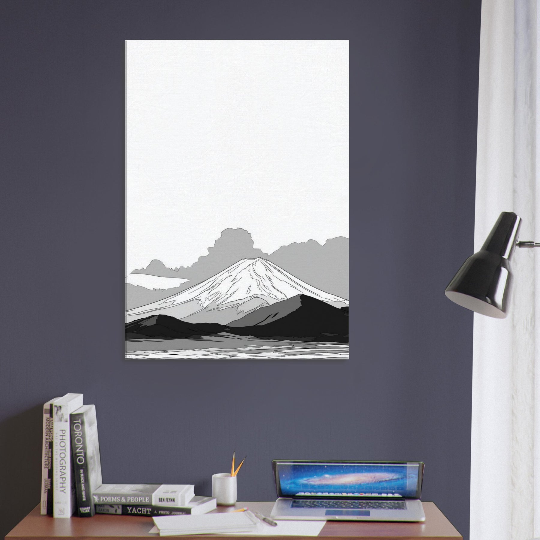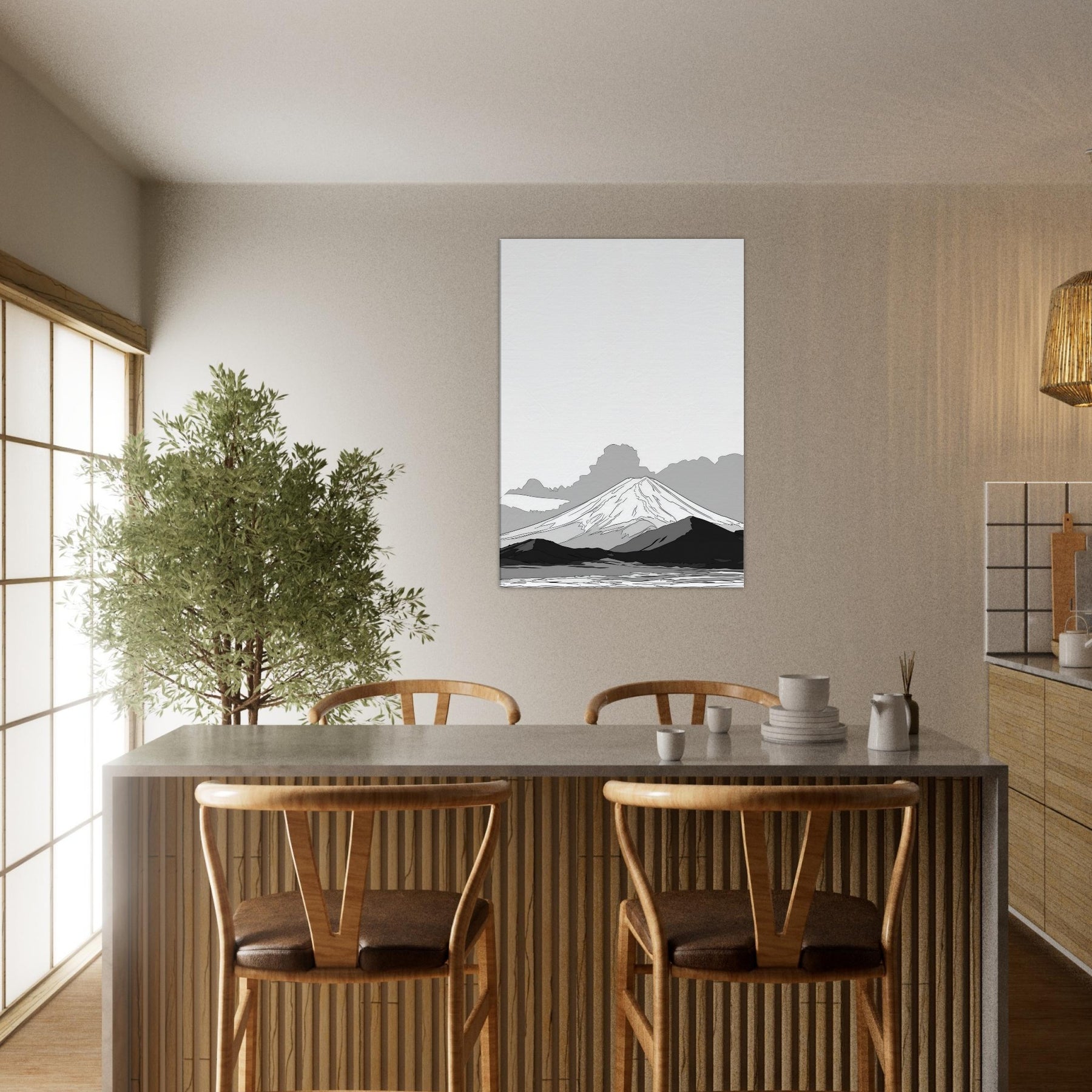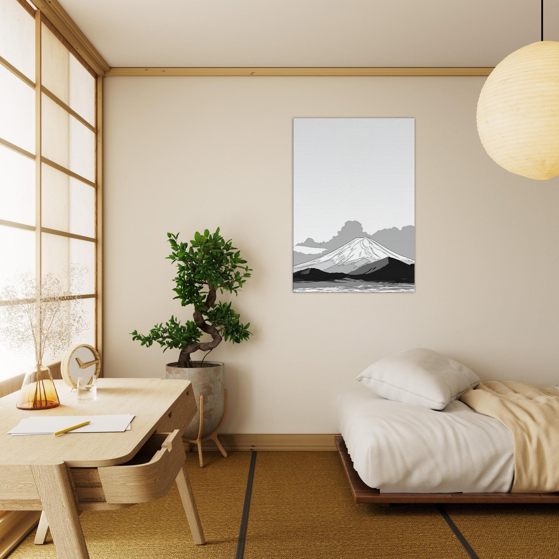 Let Mount Fuji unfold in quiet lines before your eyes, a restrained horizon that invites stillness into the room. This delicate line drawing evokes dawn mist and ancient silhouettes, where soft graphite echoes across a serene valley. The balance of negative space and subtle shading makes the space feel taller, lighter, more contemplative. Hang it in a living room or study to soften harsh corners, spark focus, and turn daily routines into a moment of calm reverie.