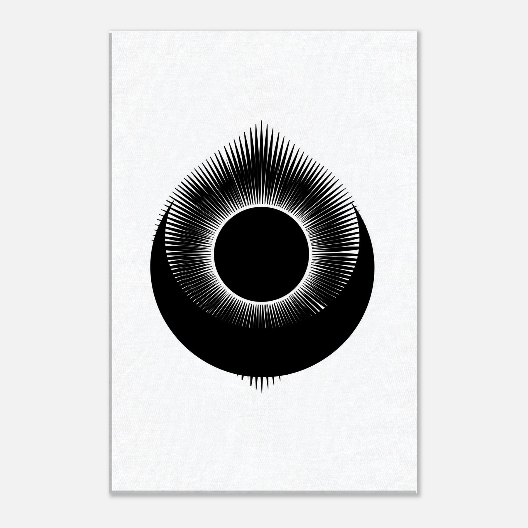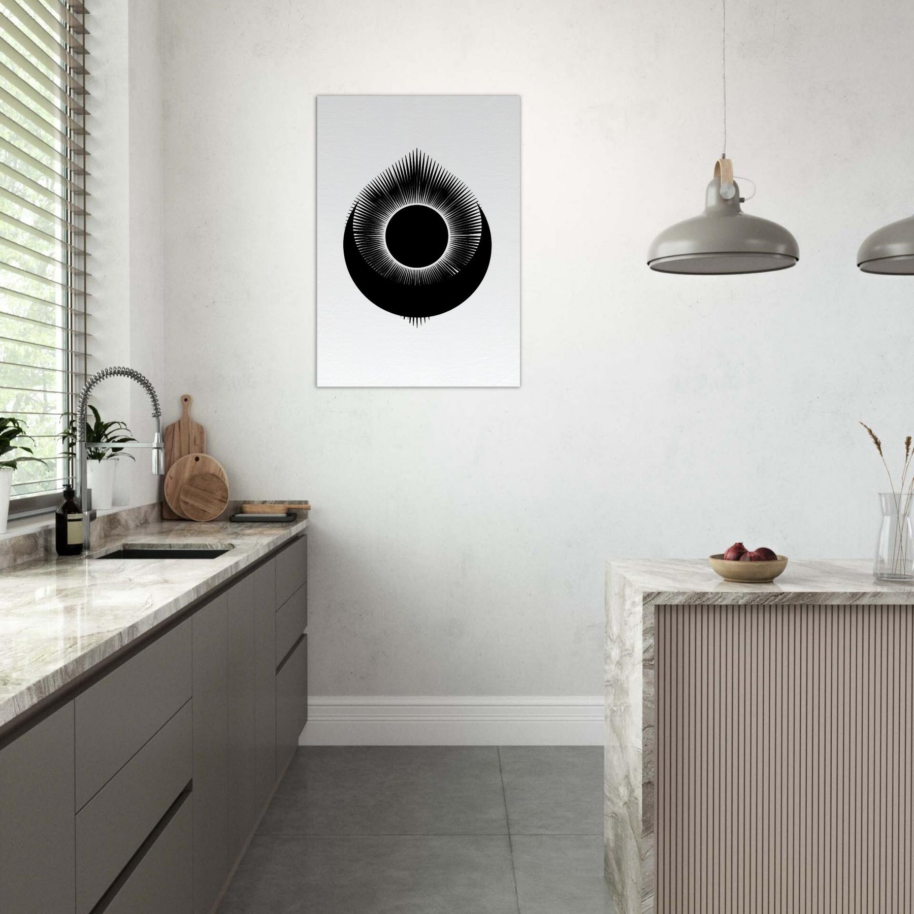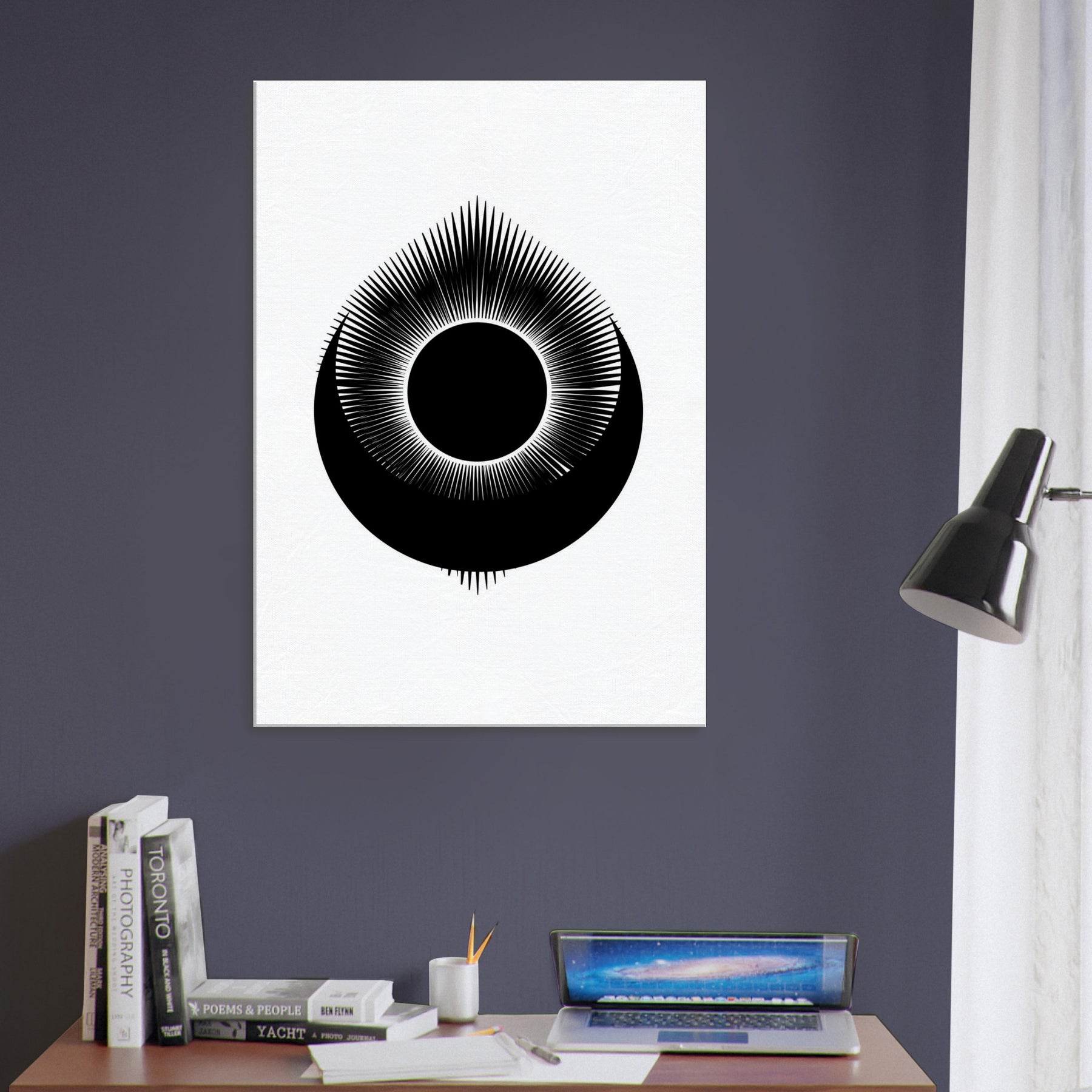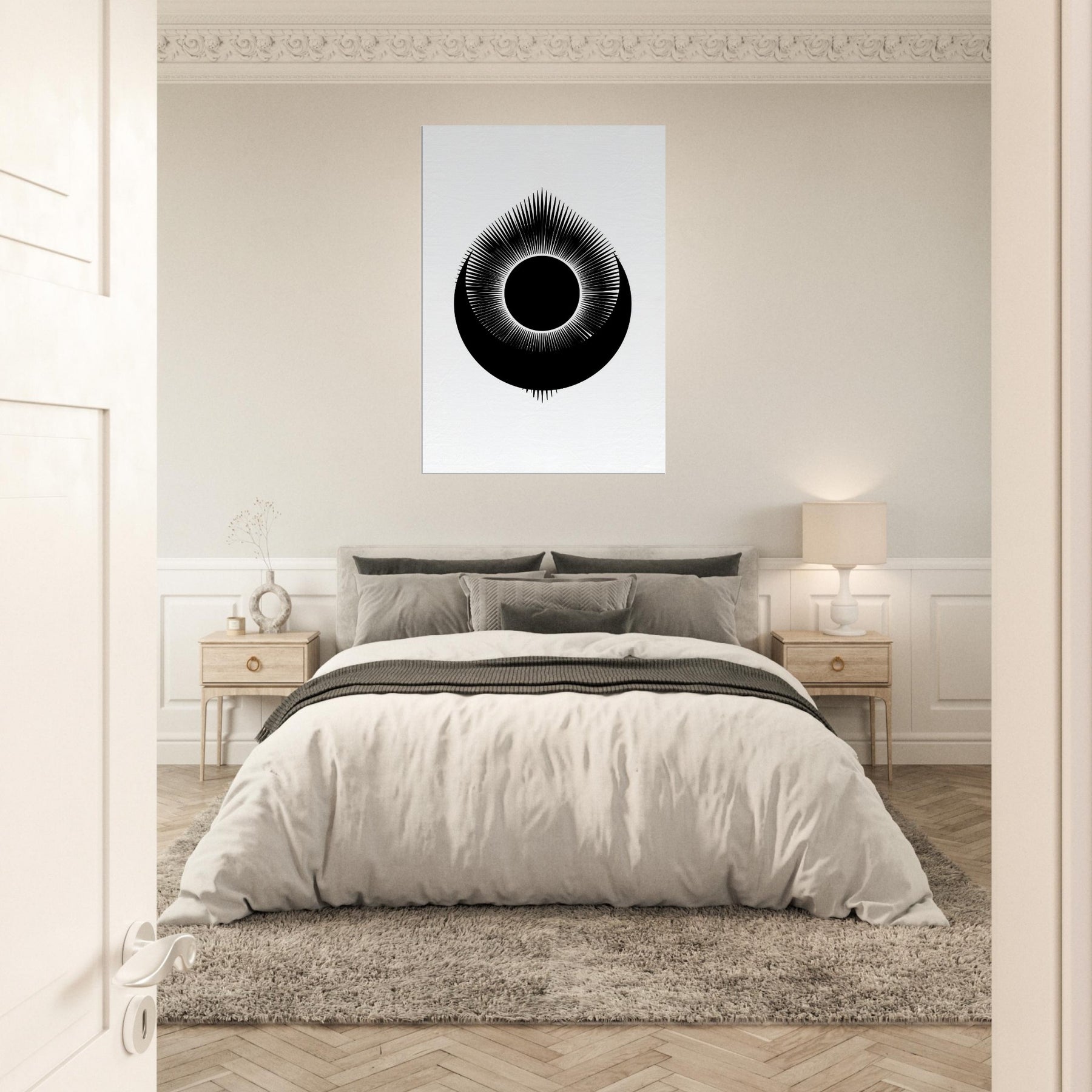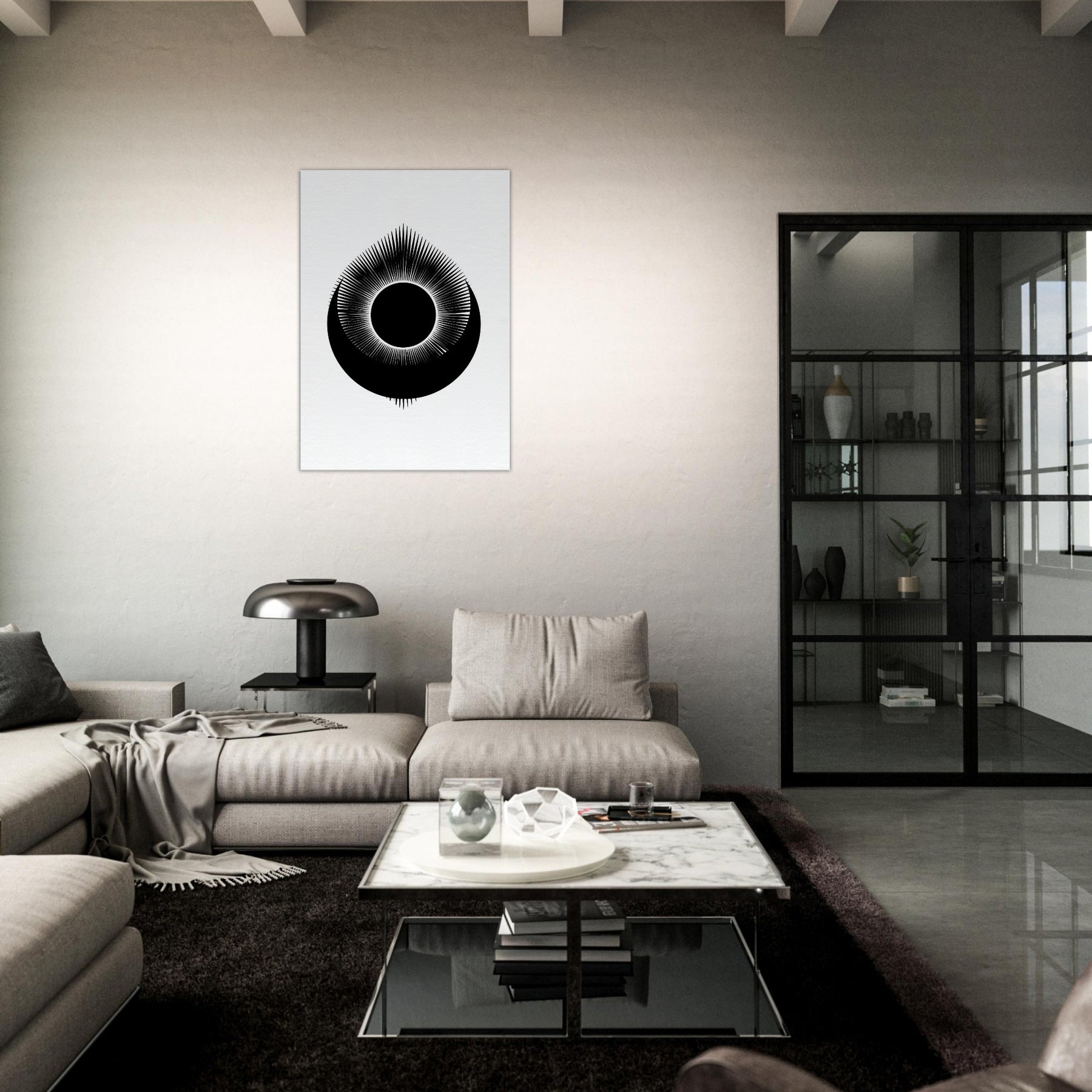 An arresting study of shadow and light, this piece centers an unbroken black circle cradled by radiant, star thin lines. The Eclipse emerges not as stillness, but a pulse mystical, almost breathing inviting quiet contemplation. The crisp line work glides across a field of white, creating a sense of depth and movement that elevates a living space with serene drama. Hang it where daylight can skim the edges or where candlelight can bend along the orbit of this luminous constellation.