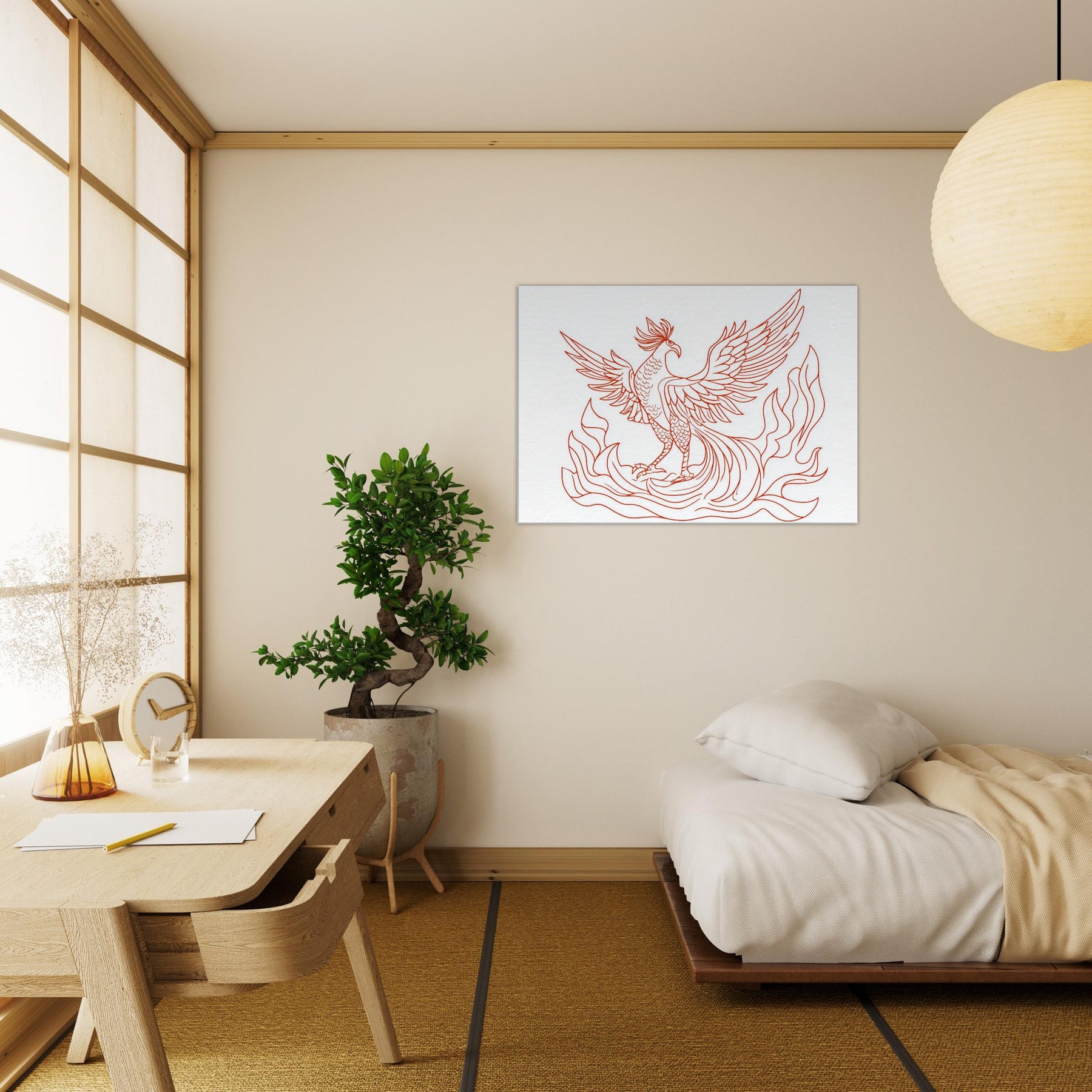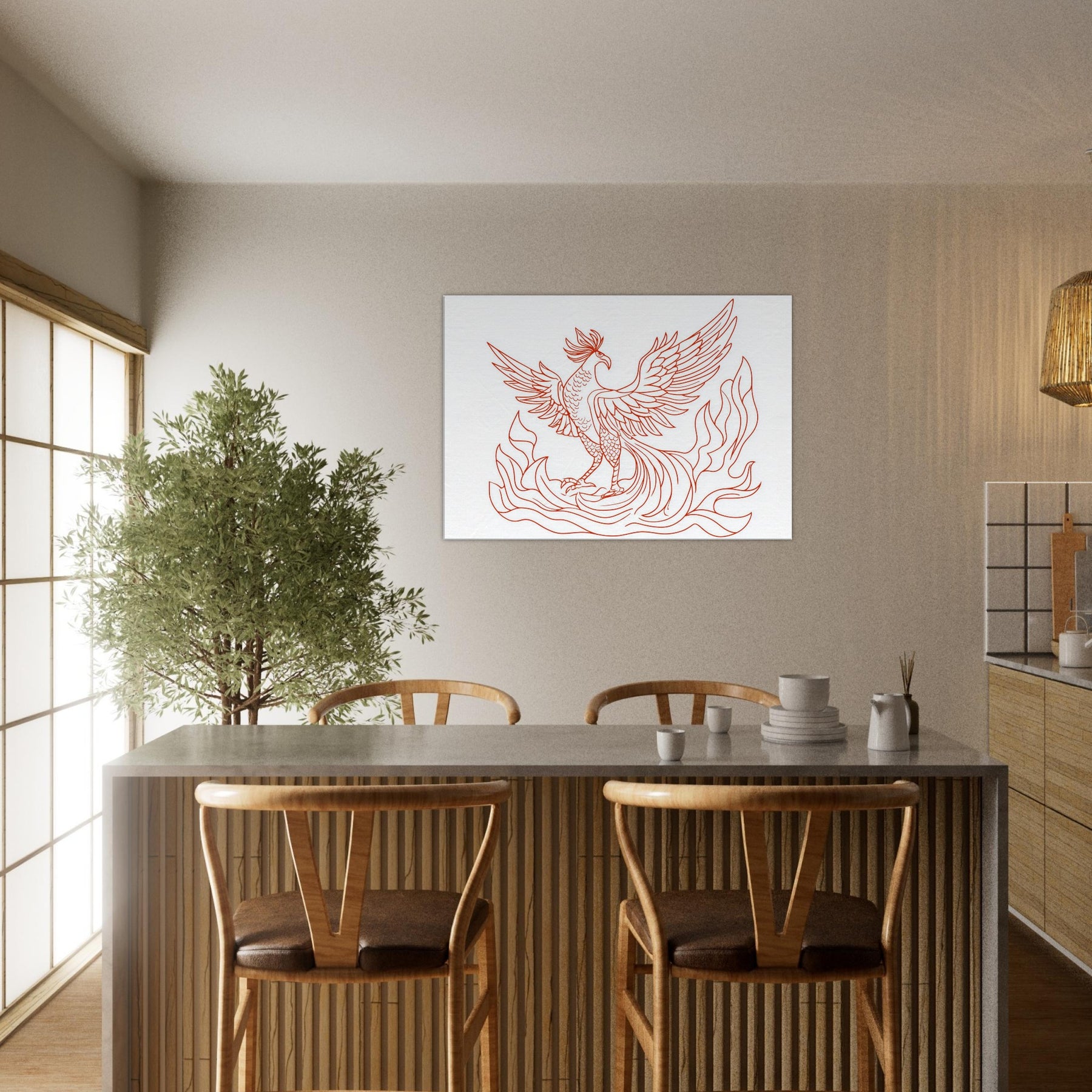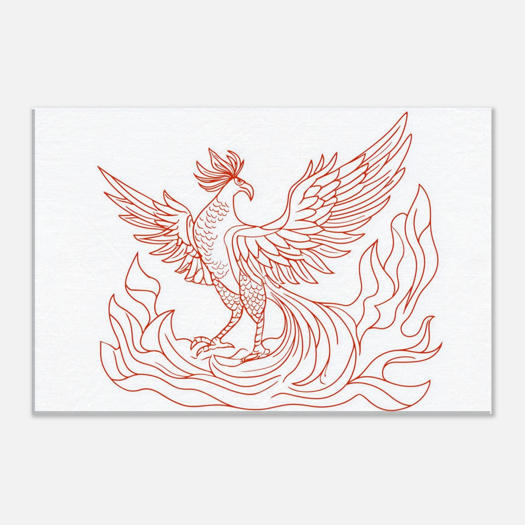 Vermilion Bird of the South Reborn from Sacred Fire unfurls in crisp red lines that glow with ancient energy. The line art silhouette dances above a calm space, its wings tracing the air with quiet drama, as if a fiery omen had settled into your living room. This artwork lends warmth without clutter, inviting contemplation and breath. Sense the heat of ritual flames softened by elegant contour, turning any wall into a portal for myth, memory, and renewal.
